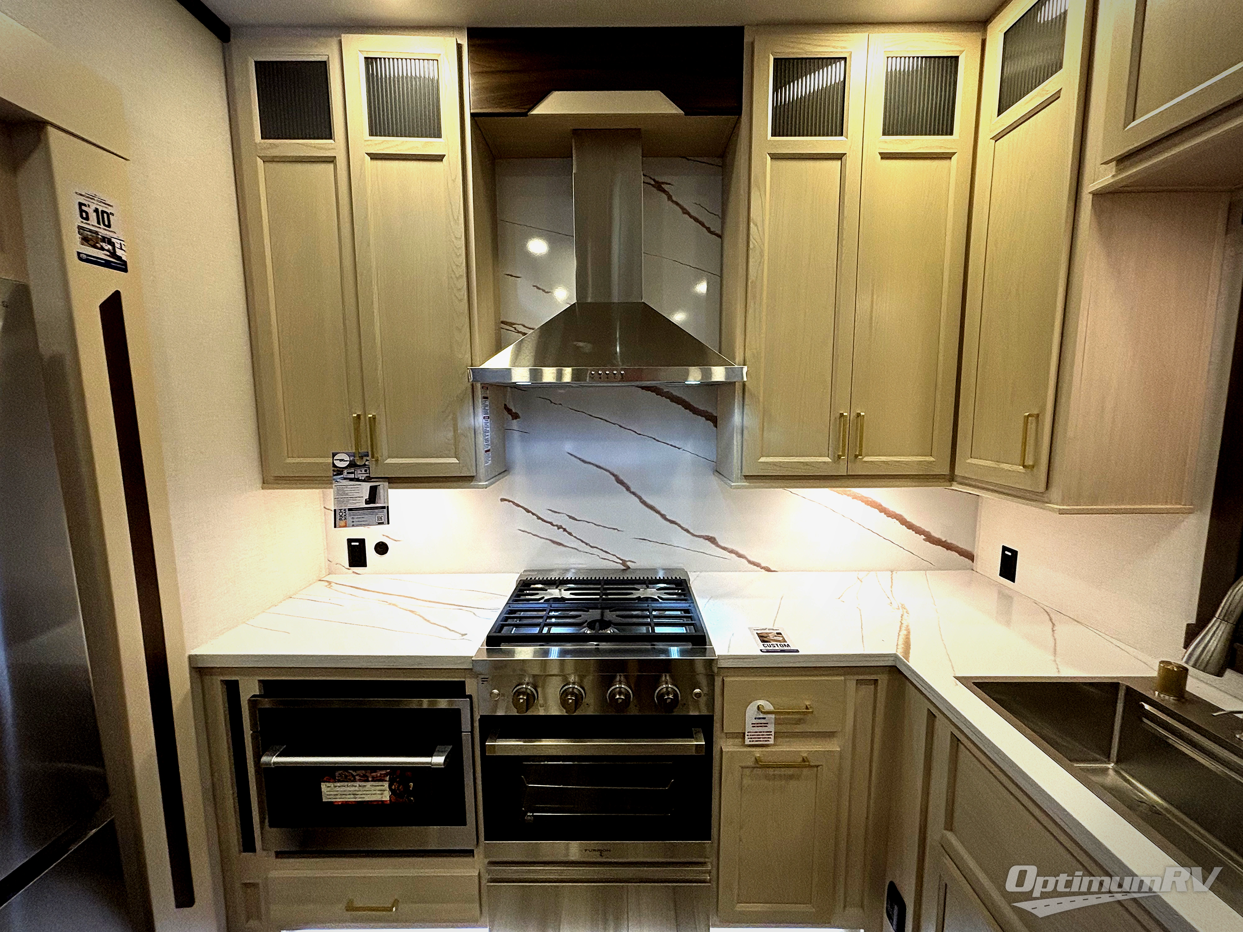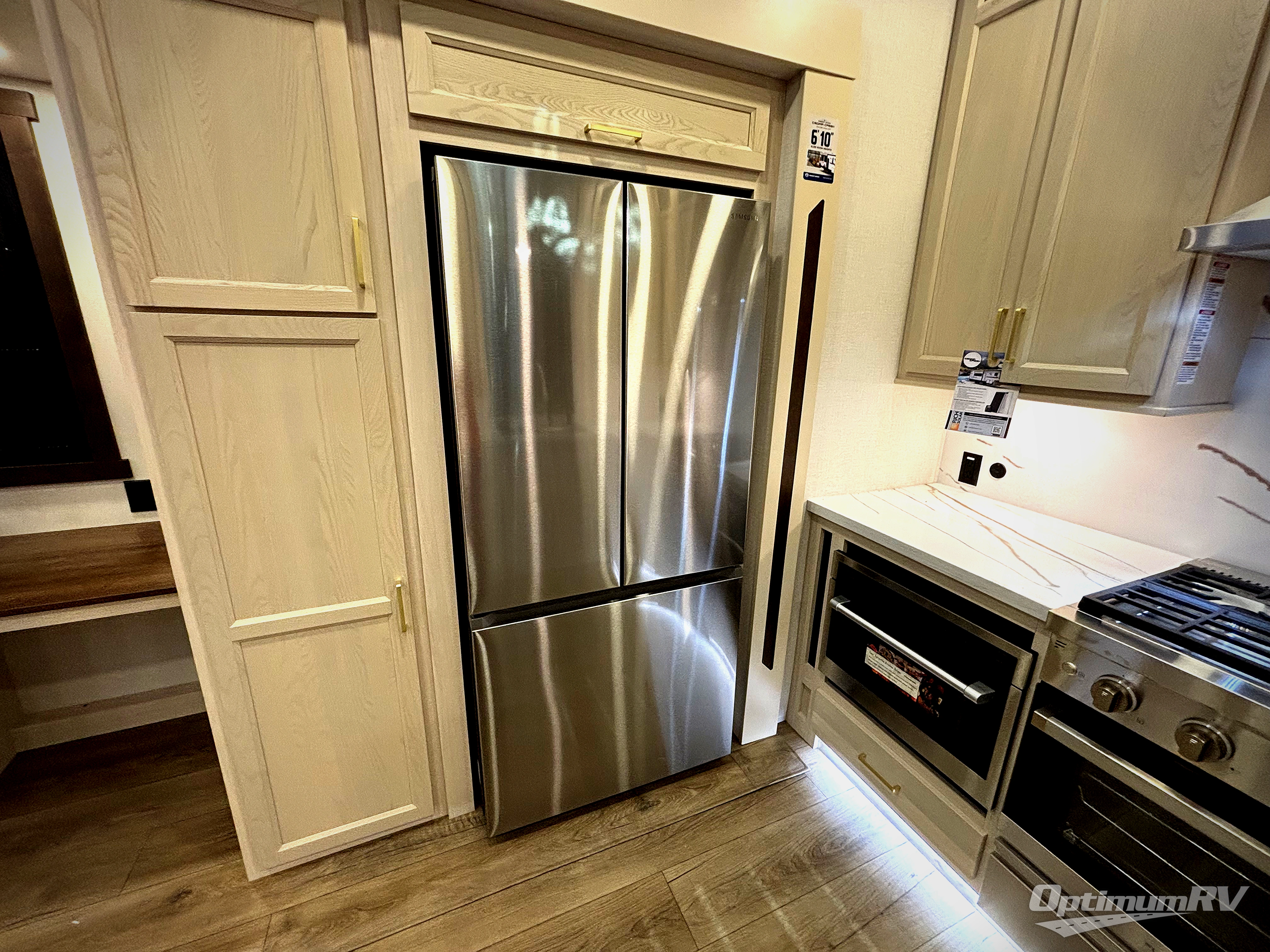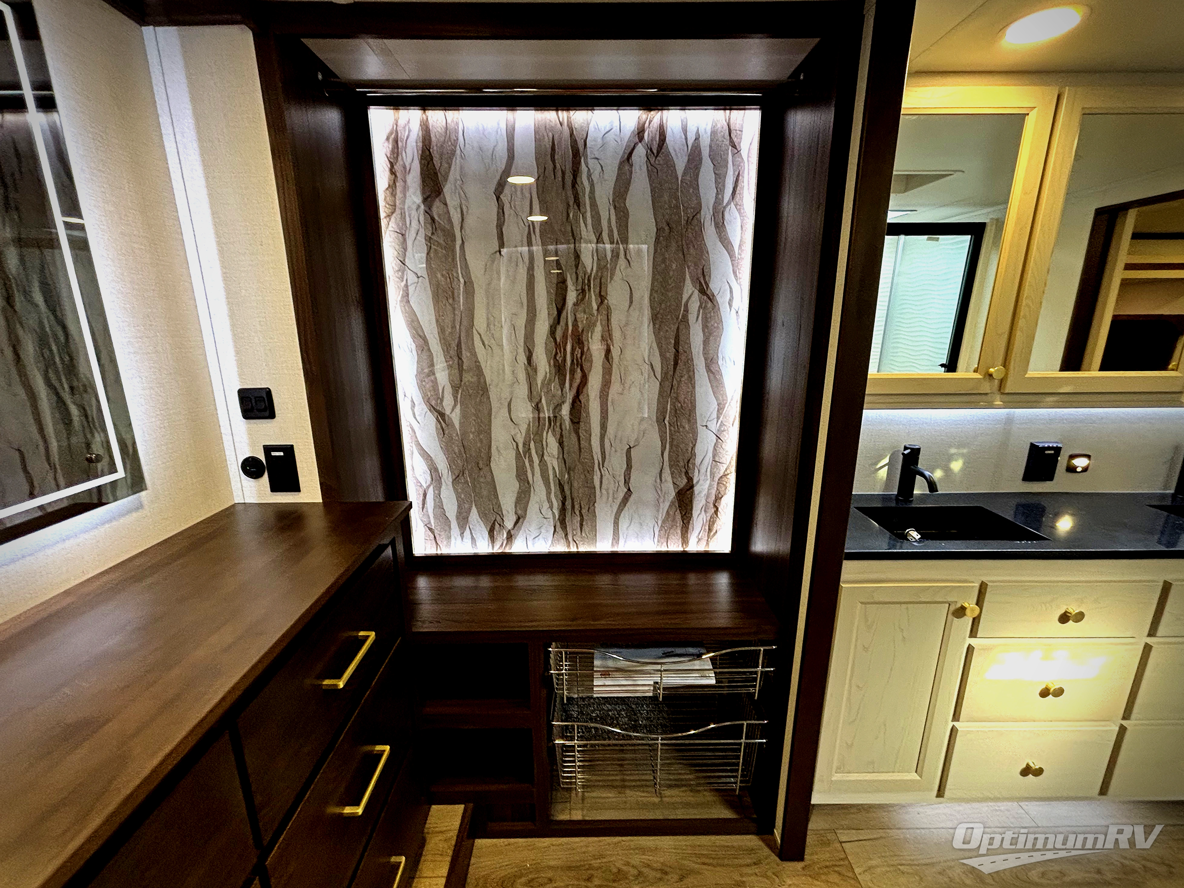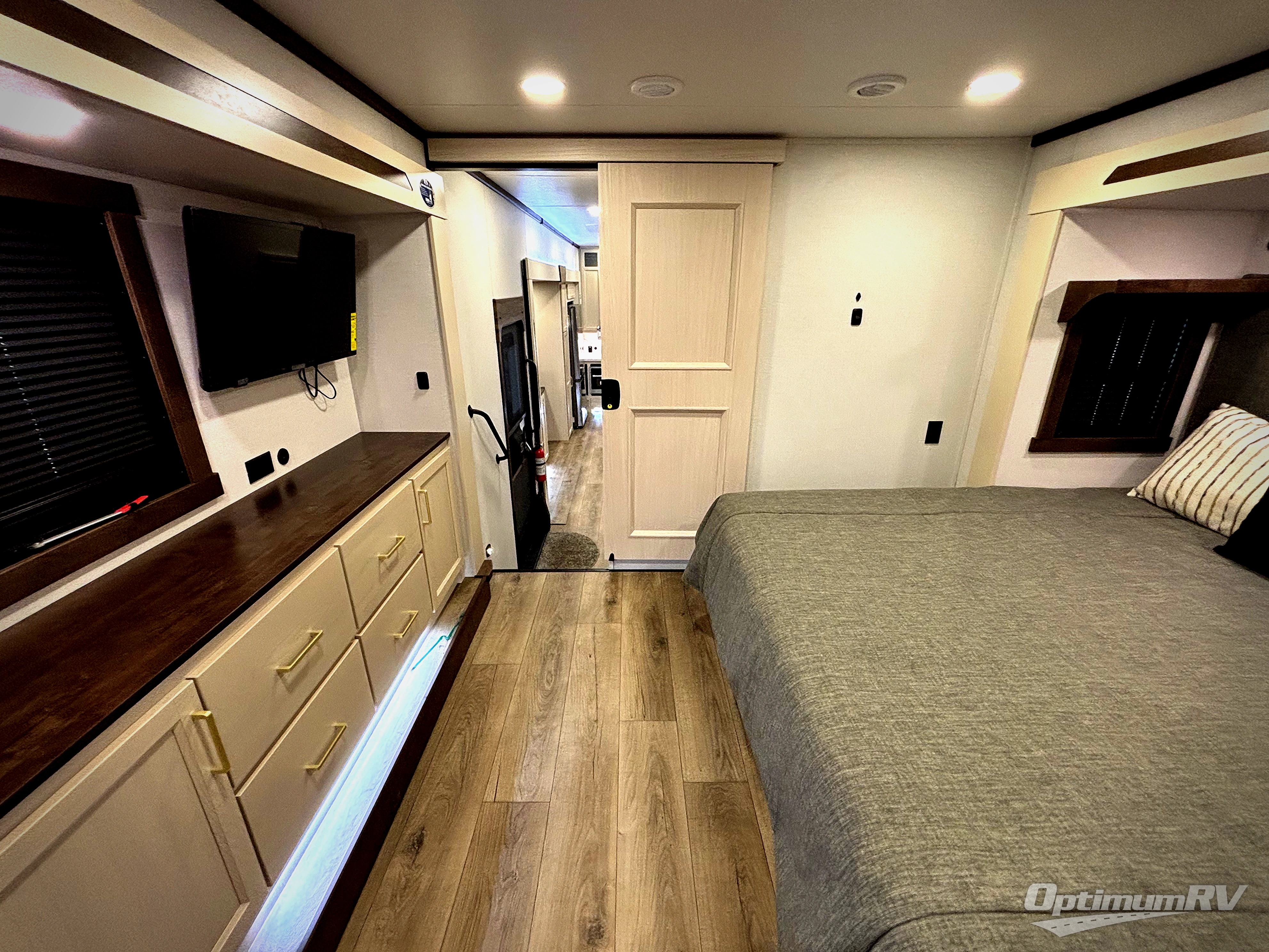 At the front of this 385RK fifth wheel, you’ll find a full bathroom featuring a spacious shower with a built-in seat and convenient LED motion night lighting under the vanity for added comfort. Adjacent to the bathroom is a walk-in closet complete with a dresser and hanging rods, offering ample storage for clothing and gear. Next to this area is the bedroom, which houses a 72" x 80" king bed set in a slide-out for a restful night’s sleep. Across from the bed sits another dresser with a TV, providing extra storage and entertainment. Moving toward the center, a half bath is conveniently located across from the entrance for easy access. The living area opens up with dual opposing slides, creating a roomy lounge space featuring a sectional sofa and an entertainment center with a TV and fireplace, perfect for cozy movie nights. At the rear, the U-shaped kitchen invites the chef of the trip to cook to their heart’s content, equipped with ample overhead cabinets, a 20-cu. ft. stainless steel refrigerator, a 30" stainless steel over-the-range microwave with an updated backsplash, and a 3-burner gas oven with a pull-out pan drawer. Meals can be enjoyed at the convenient bartop with stools to the side, making this fifth wheel both stylish and functional.
