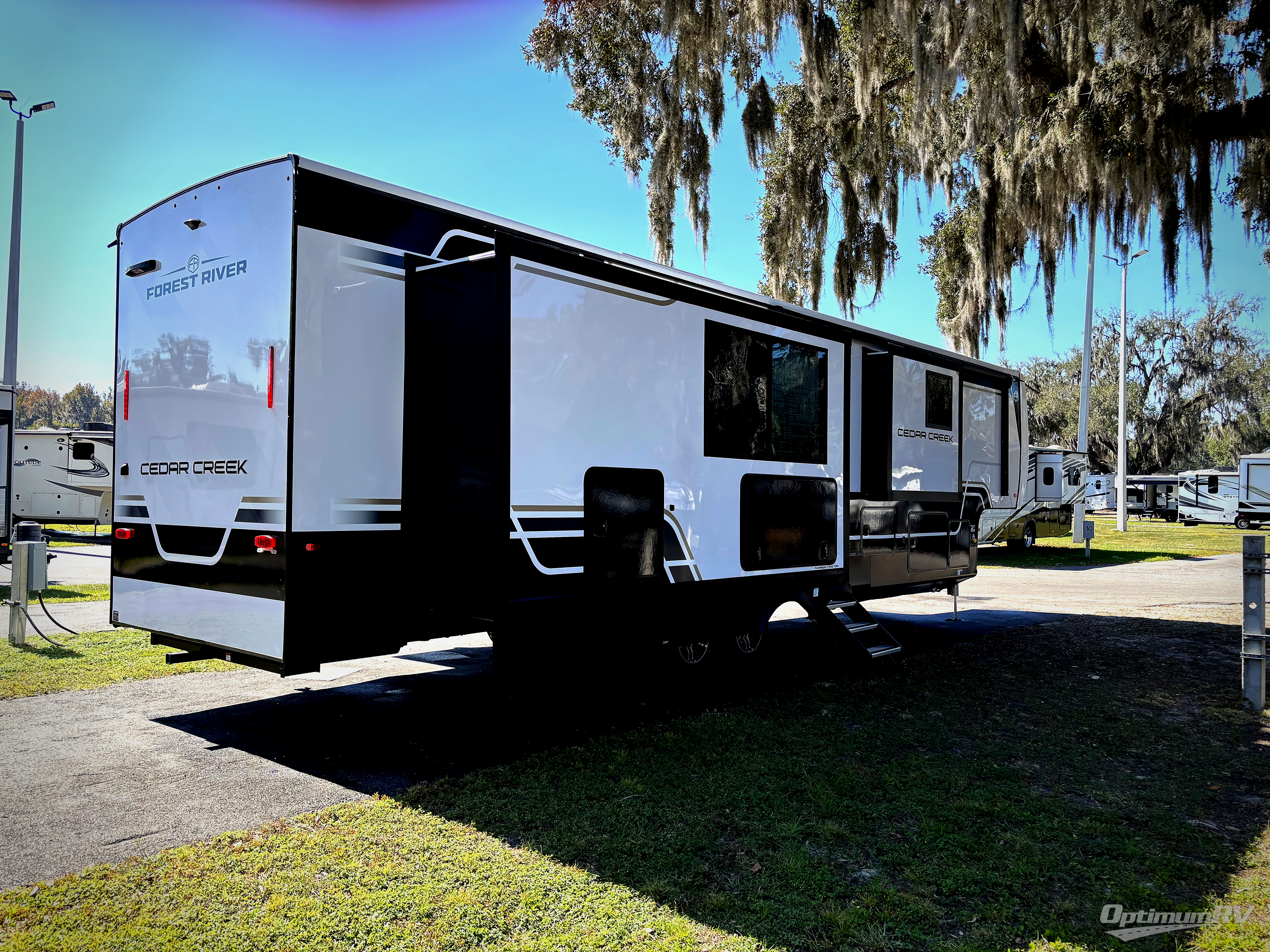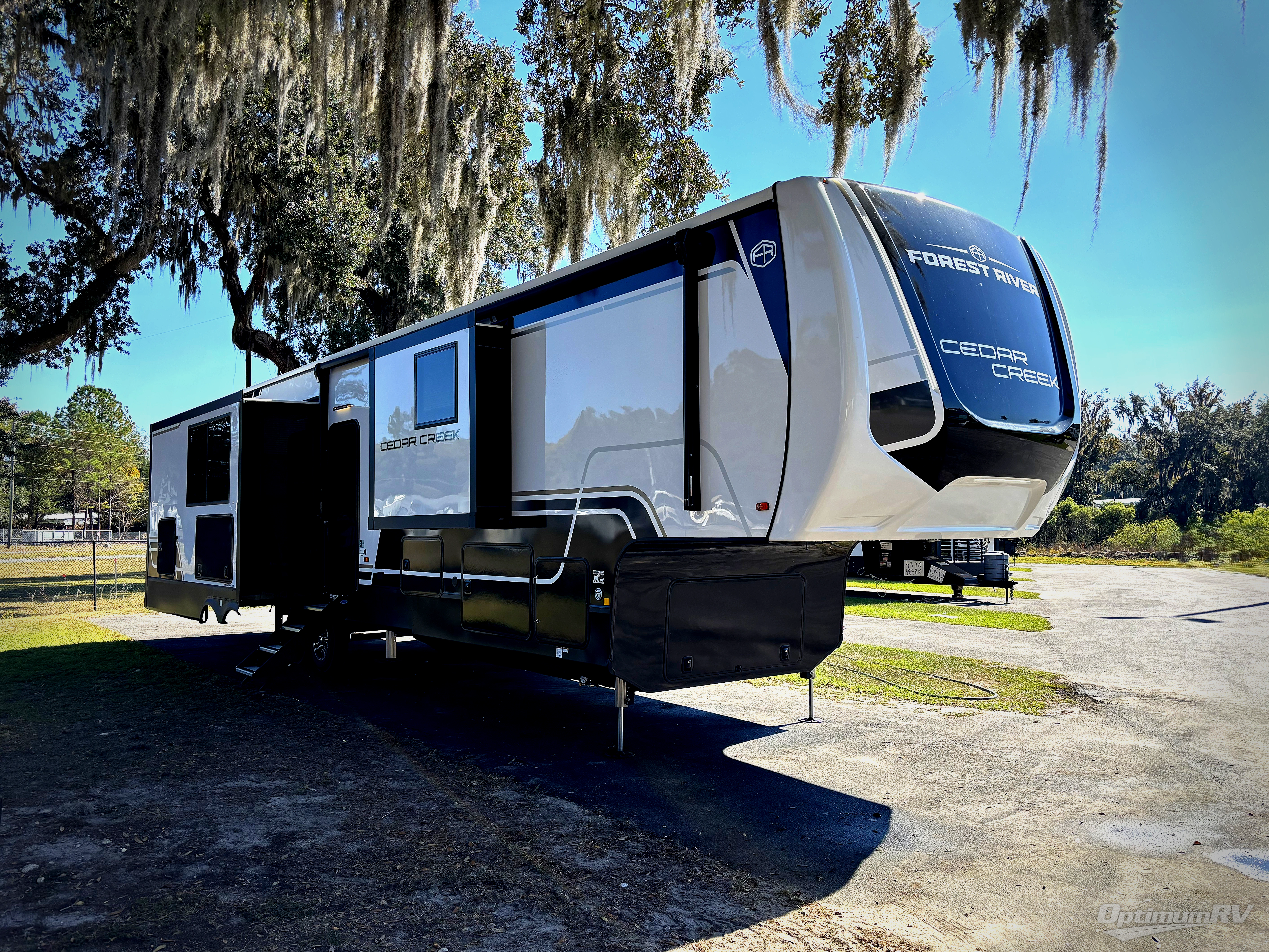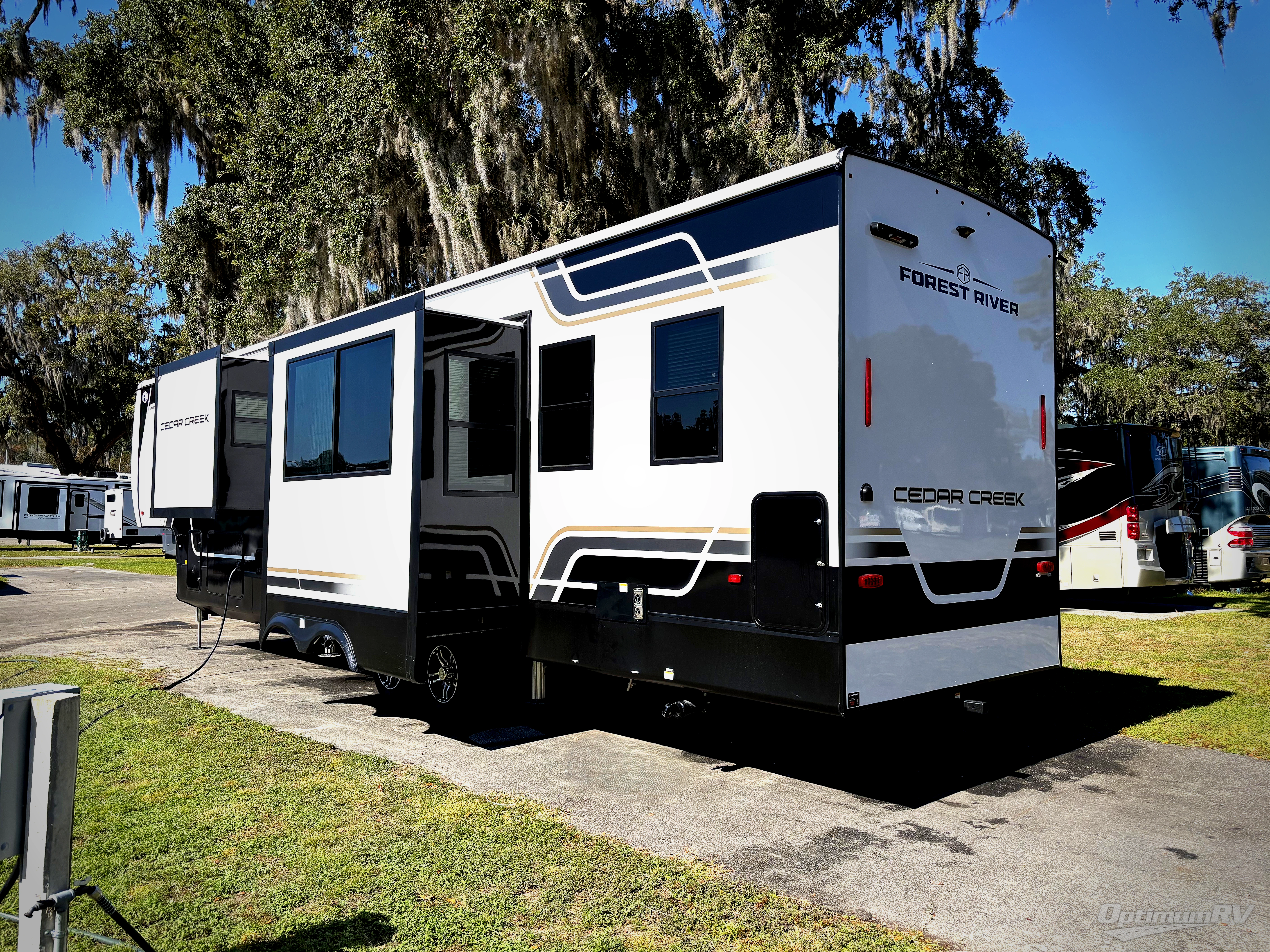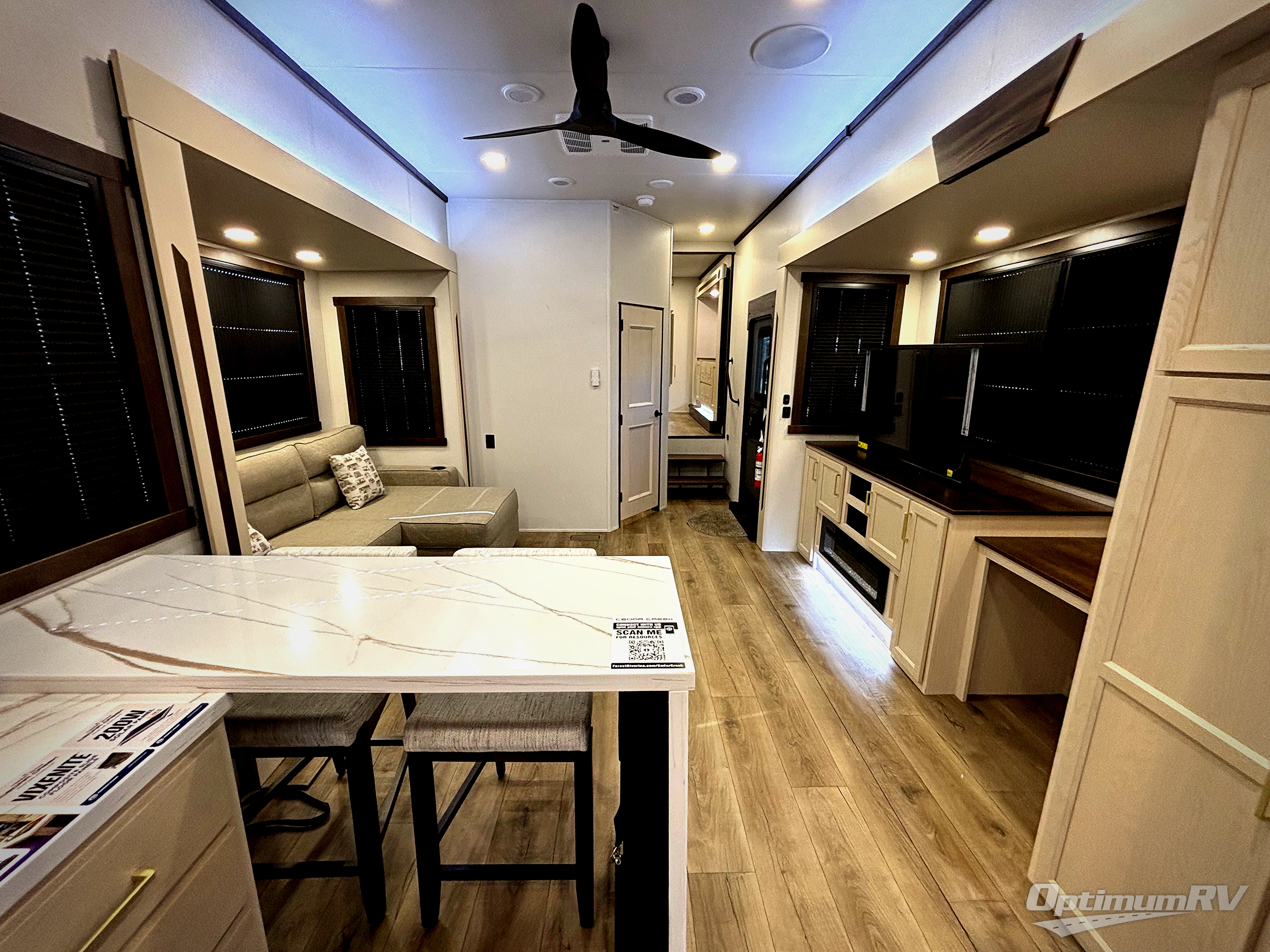With any Cedar Creek fifth wheel by Forest River, you will find a quality-built RV with your comfort in mind! The all-aluminum super structure on 16" centers or less will provide a solid foundation to your fifth wheel, and the 3M bonded sidewalls will hold up and provide resistance to UV, heat, cold moisture, and even highway chemicals. Each model also includes a Road Warrior suspension for smooth towing, a 6-Point Hydraulic, GEN 3 Leveling System, and a new 101" wide body frame. Inside, you'll enjoy walnut/two tone wooden cabinetry with hidden hinges, cutting board drawer with cut-out trash funnel, motion lighting in the bath and bedroom closet, plus many more comforts. The New Travelfi™ Pay-as-you go internet provides the ability to bring your own internet rather than relying solely on campground WiFi, and the "Rich Solar" 200W solar panel will give you off-grid capabilities!