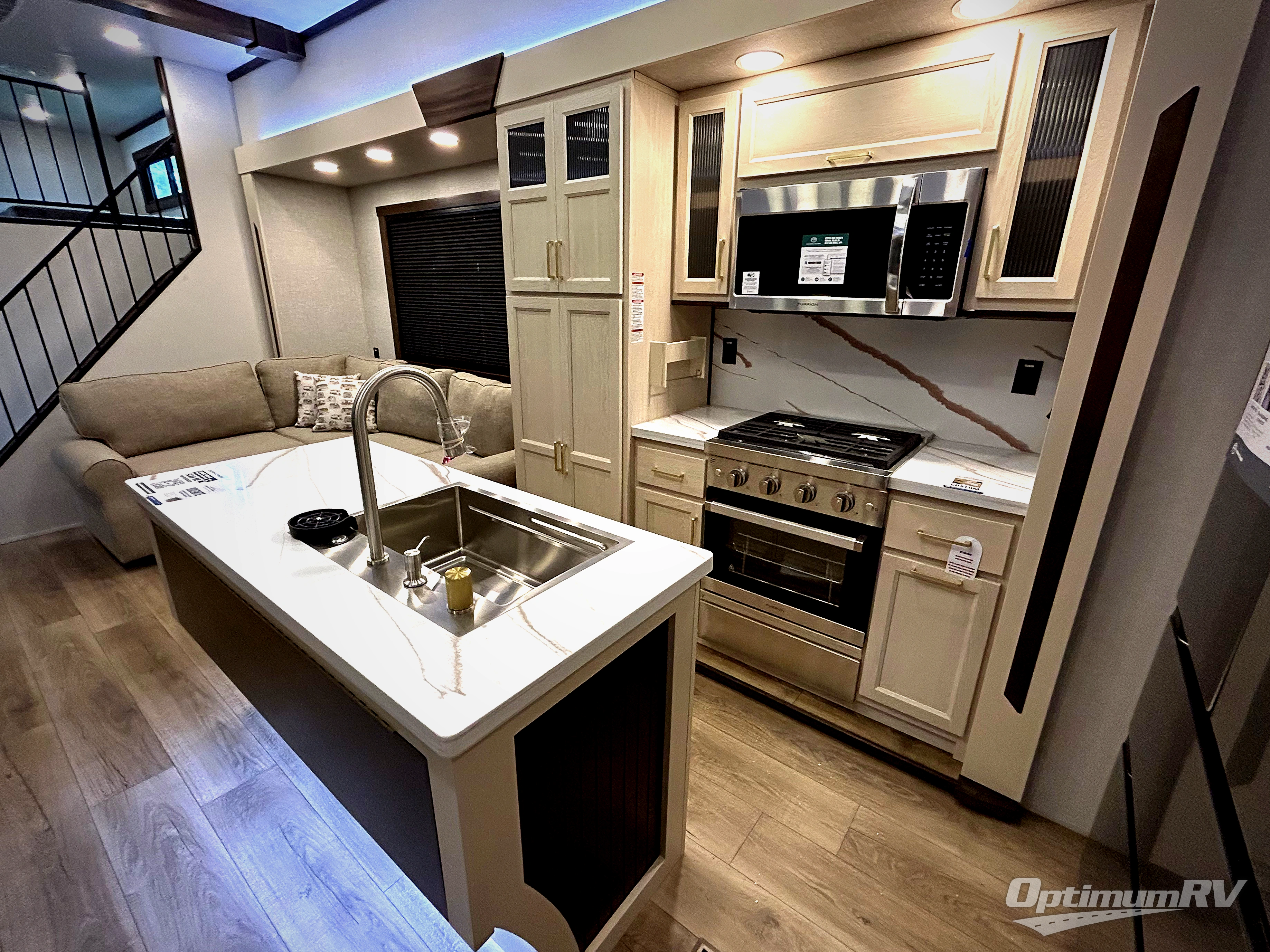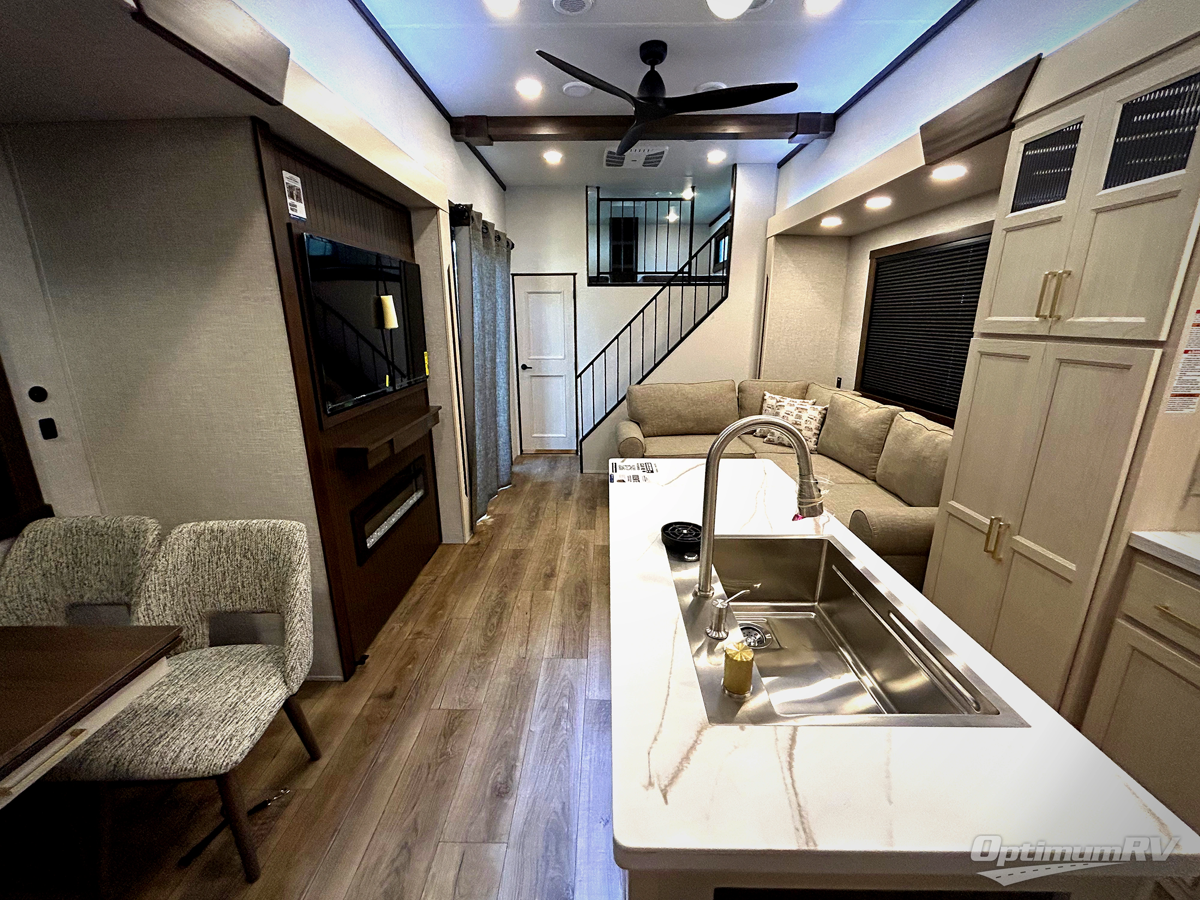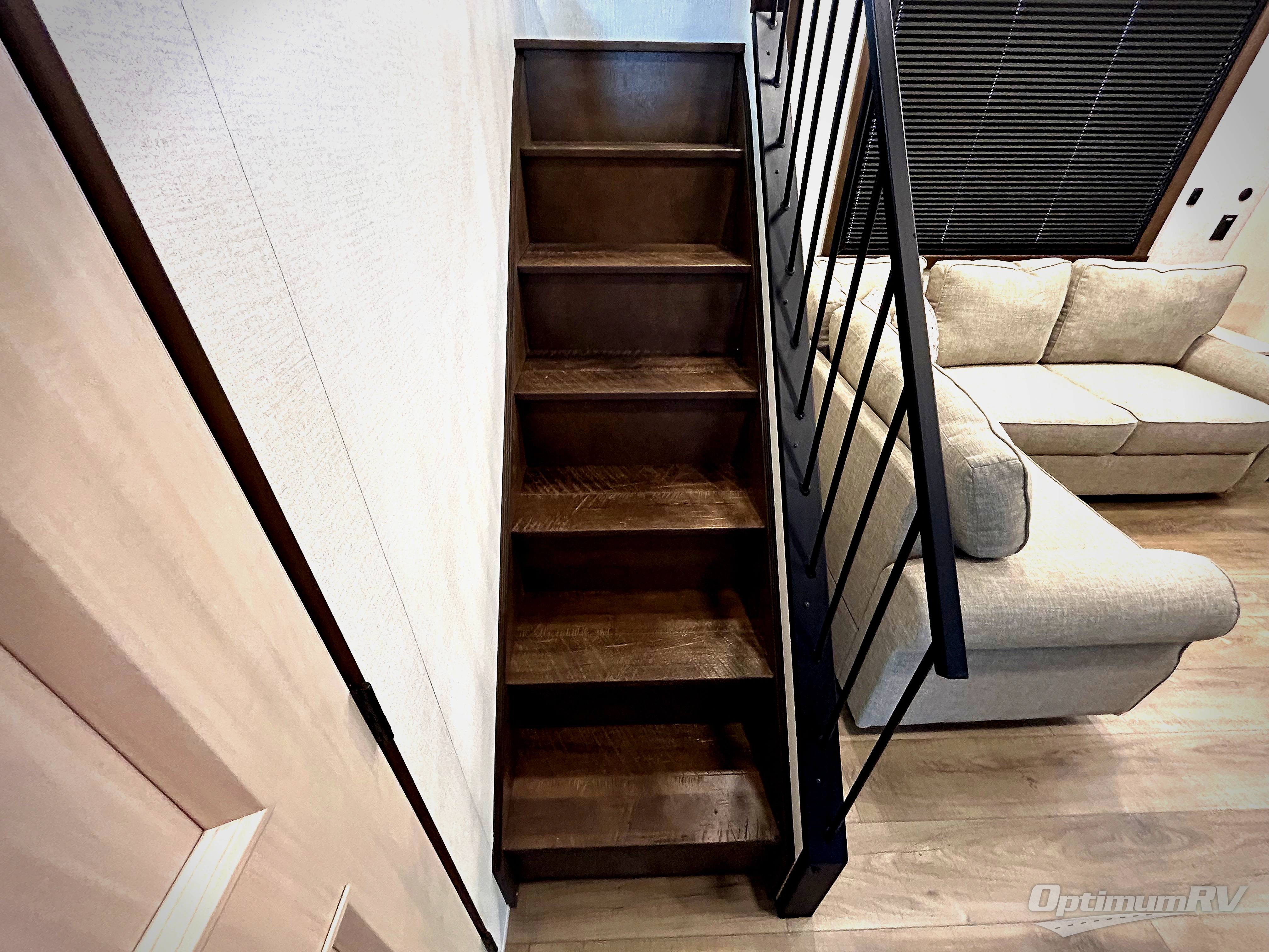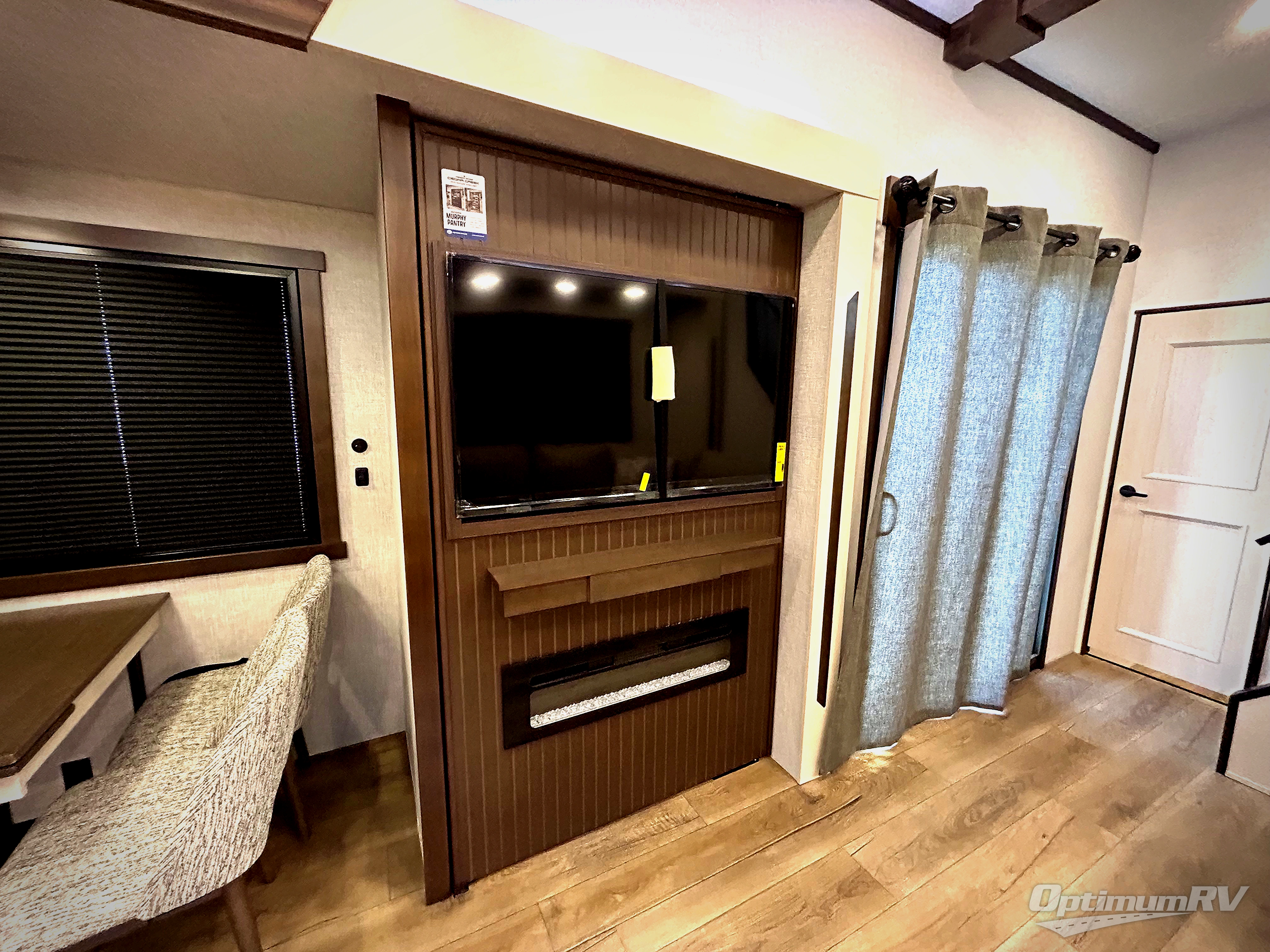 A front and rear loft plus master bedroom offer three different sleeping spaces that you and your family or guests will enjoy. The front master offers a king bed slide, plus two dressers and a wardrobe for clothing. There is also a 32" TV as well. The main combined living and kitchen area features a large L-shaped sectional sofa opposite a swivel mount Smart TV and fireplace mounted on the exterior door that hides a Murphy pantry. The kitchen is fully equipped for all of your cooking needs with a 30" stainless steel microwave, a 12V 18 cu. ft. refrigerator, and an island with fold-down breakfast counter. There is also a free standing dinette with an extension and an ottoman.