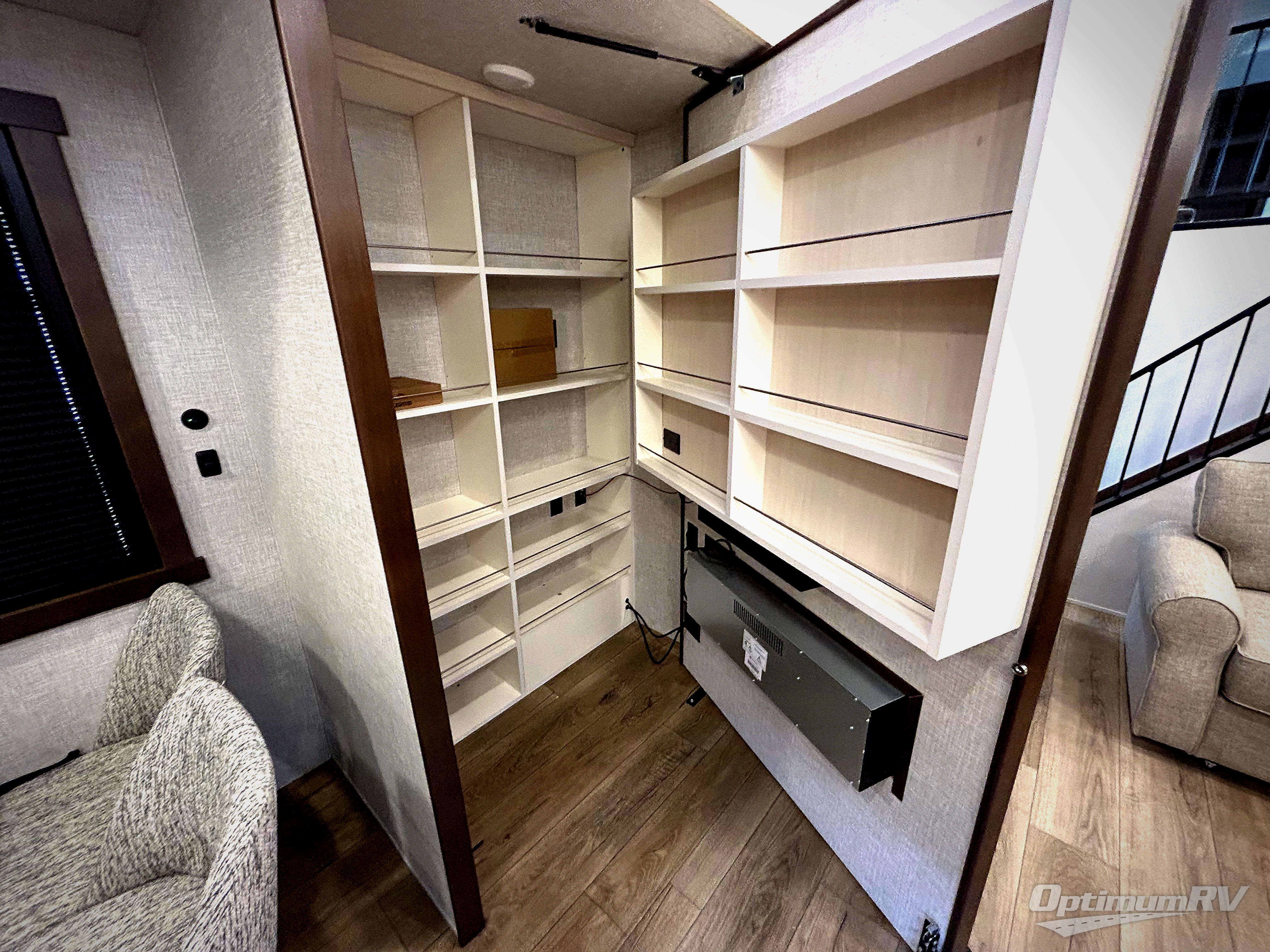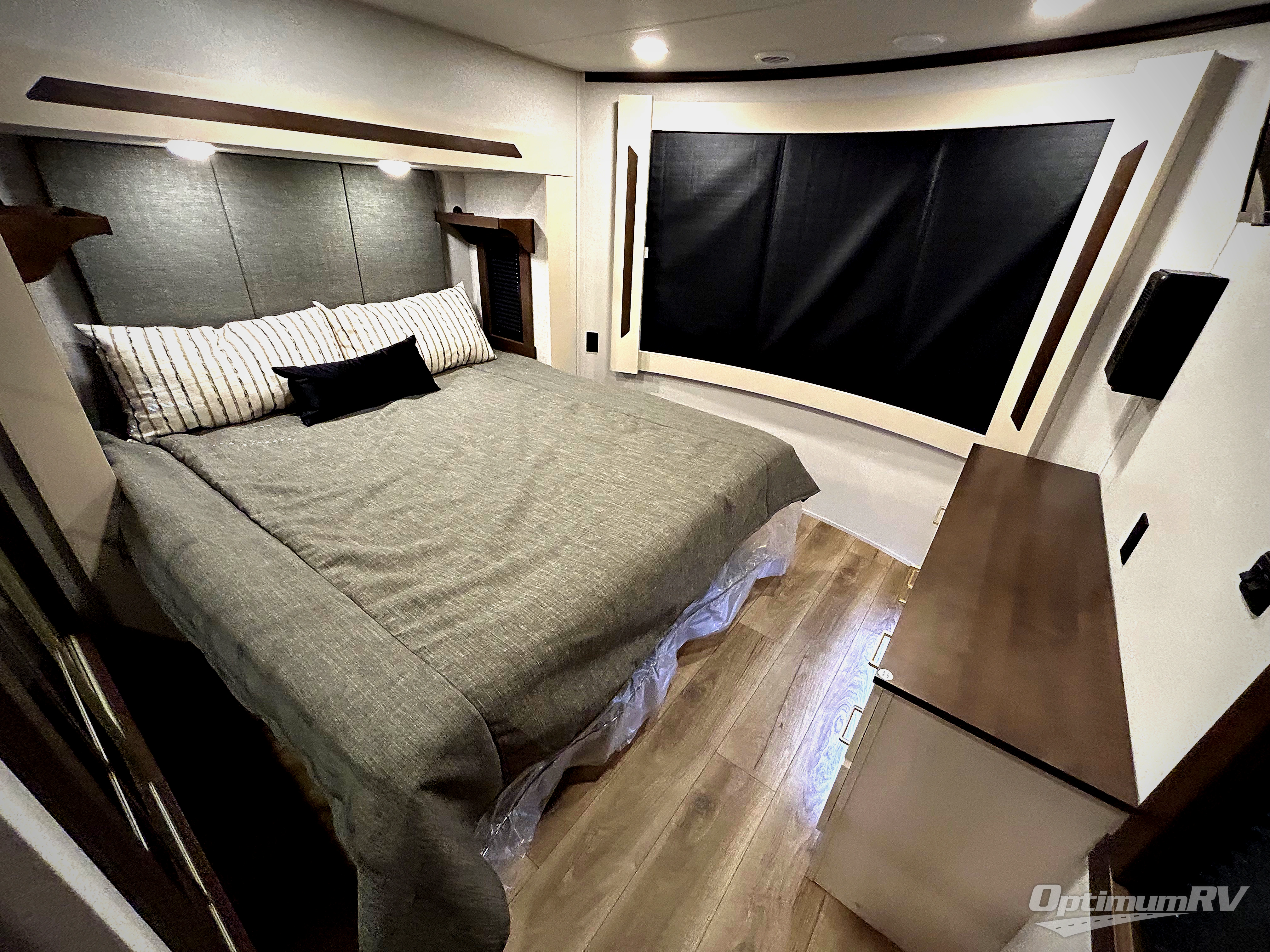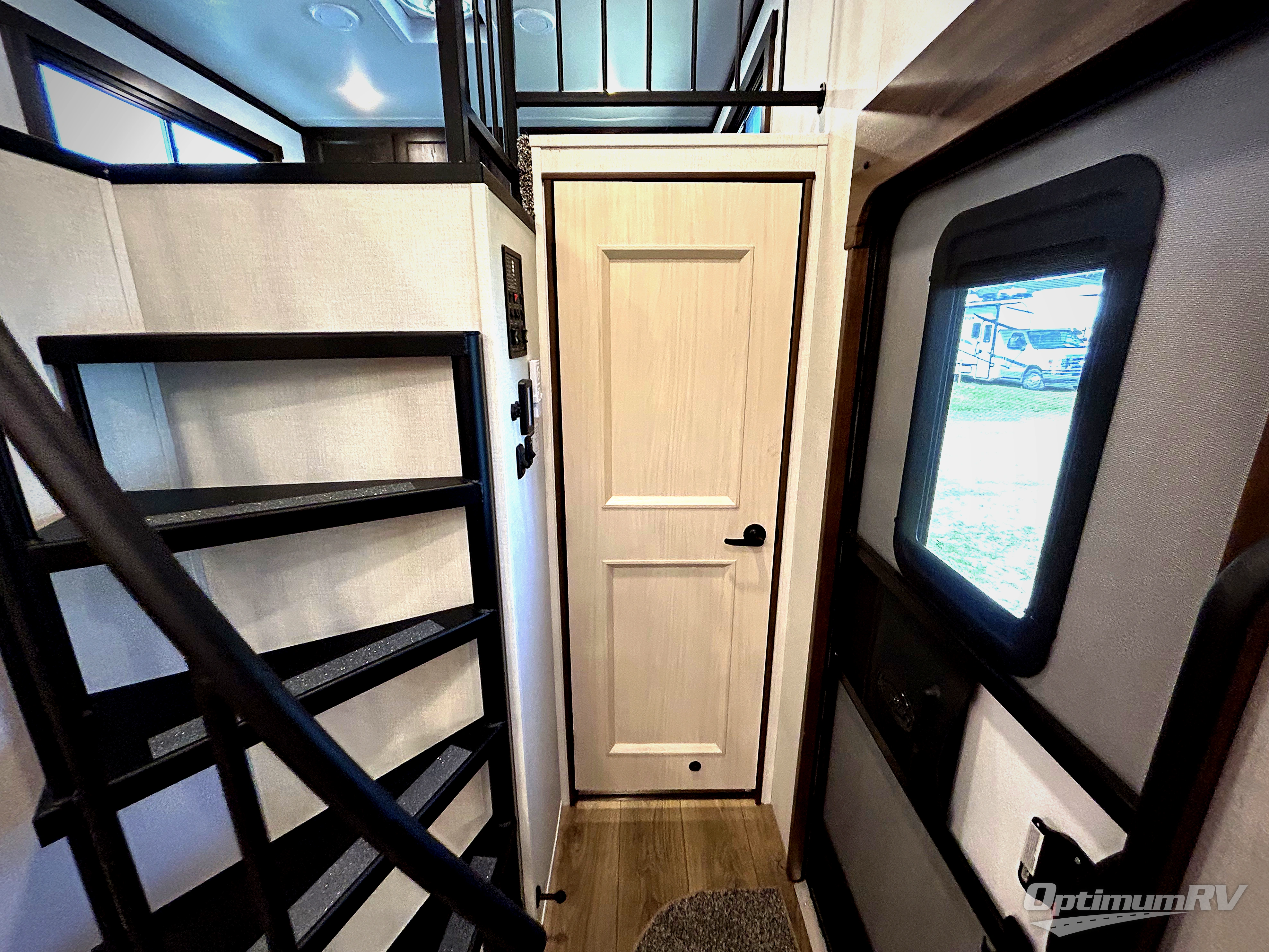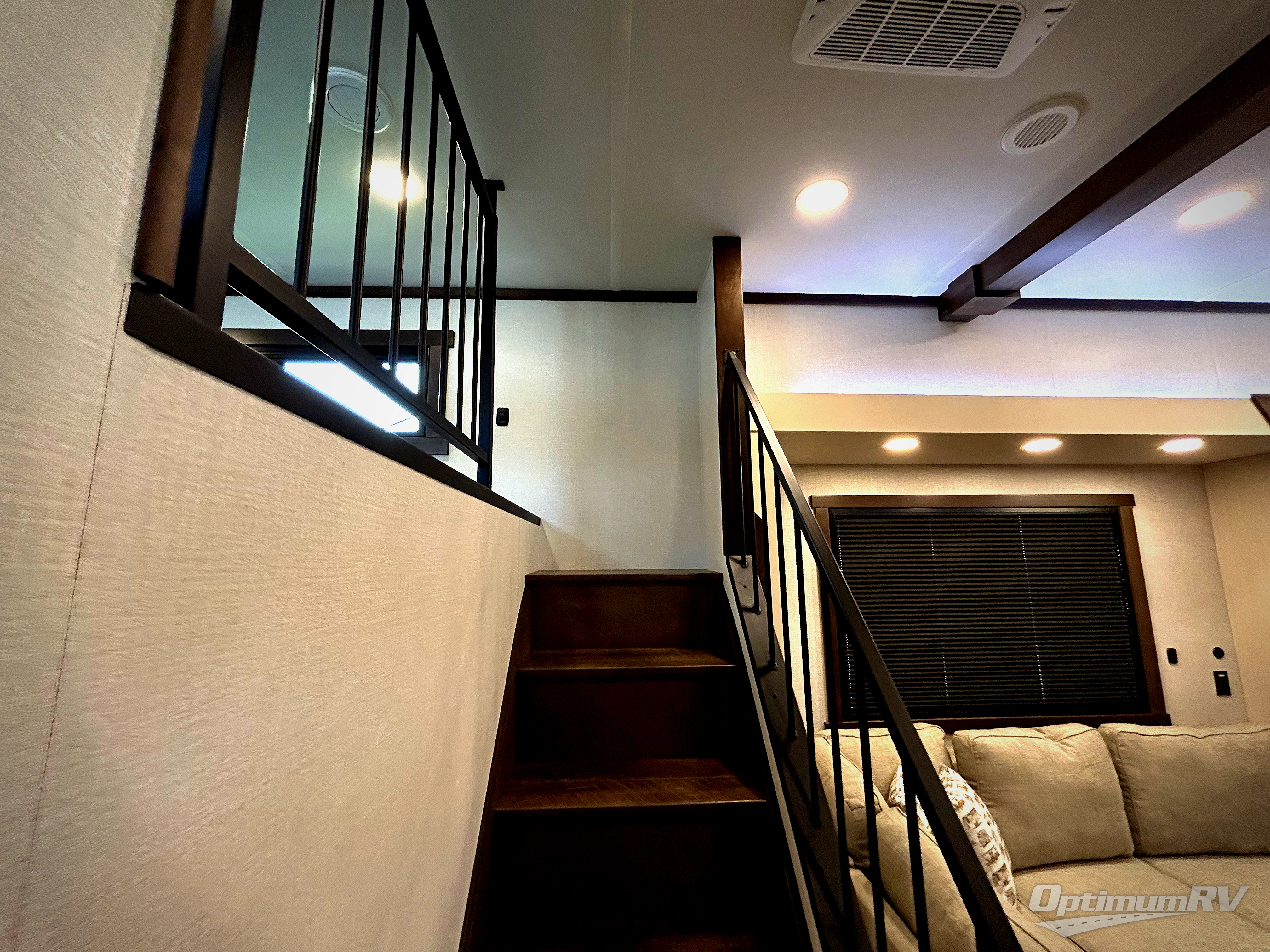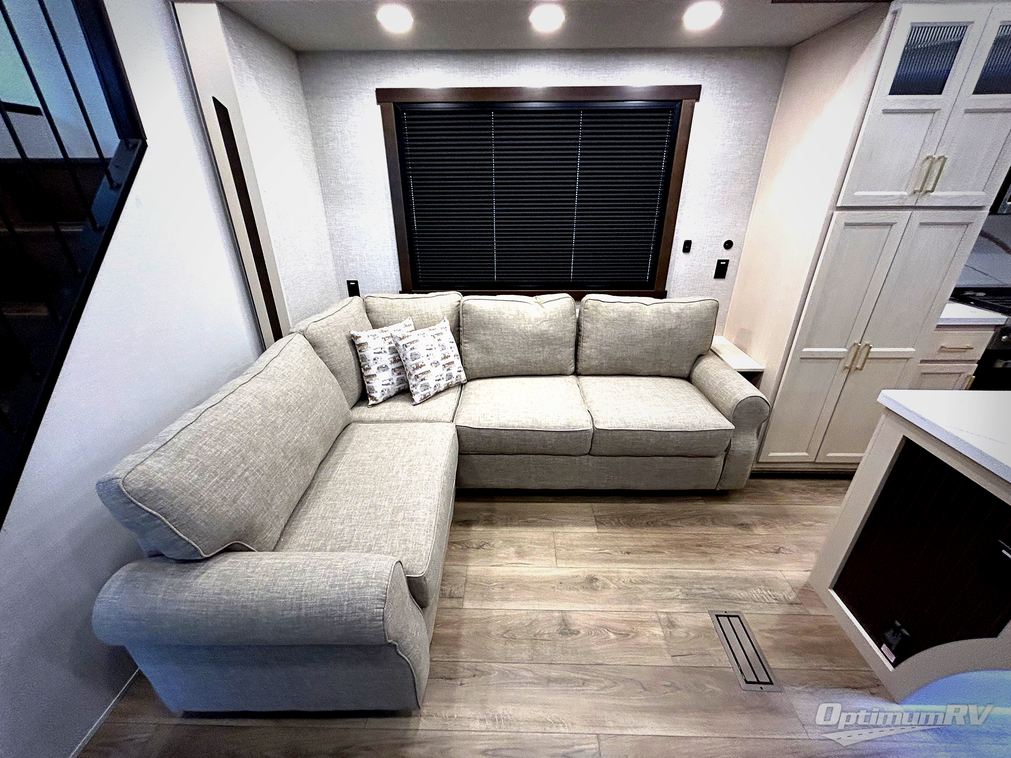 A front and rear loft plus master bedroom offer three different sleeping spaces that you and your family or guests will enjoy. The front master offers a king bed slide, plus two dressers and a wardrobe for clothing. There is also a 32" TV as well. The main combined living and kitchen area features a large L-shaped sectional sofa opposite a swivel mount Smart TV and fireplace mounted on the exterior door that hides a Murphy pantry. The kitchen is fully equipped for all of your cooking needs with a 30" stainless steel microwave, a 12V 18 cu. ft. refrigerator, and an island with fold-down breakfast counter. There is also a free standing dinette with an extension and an ottoman.