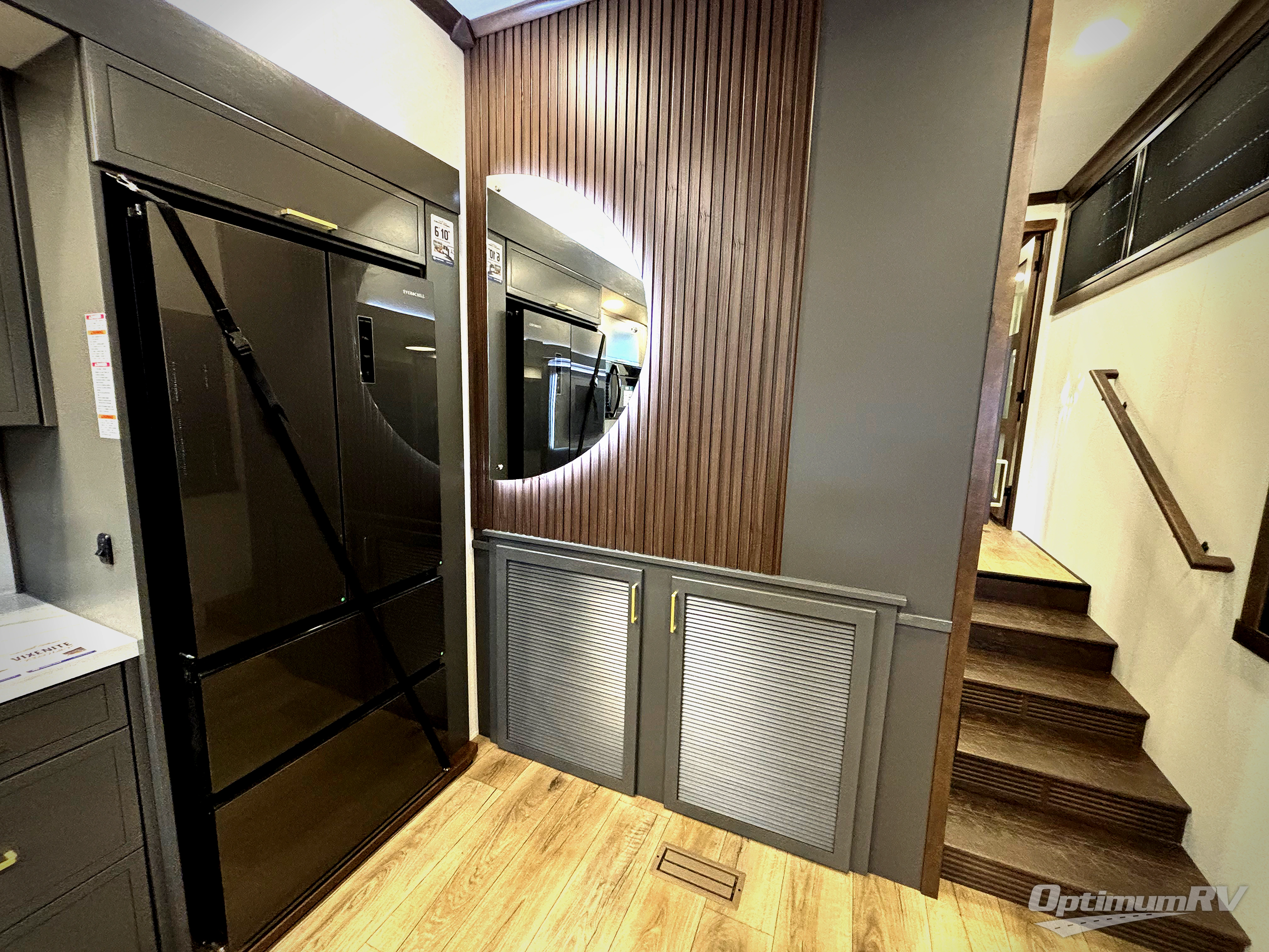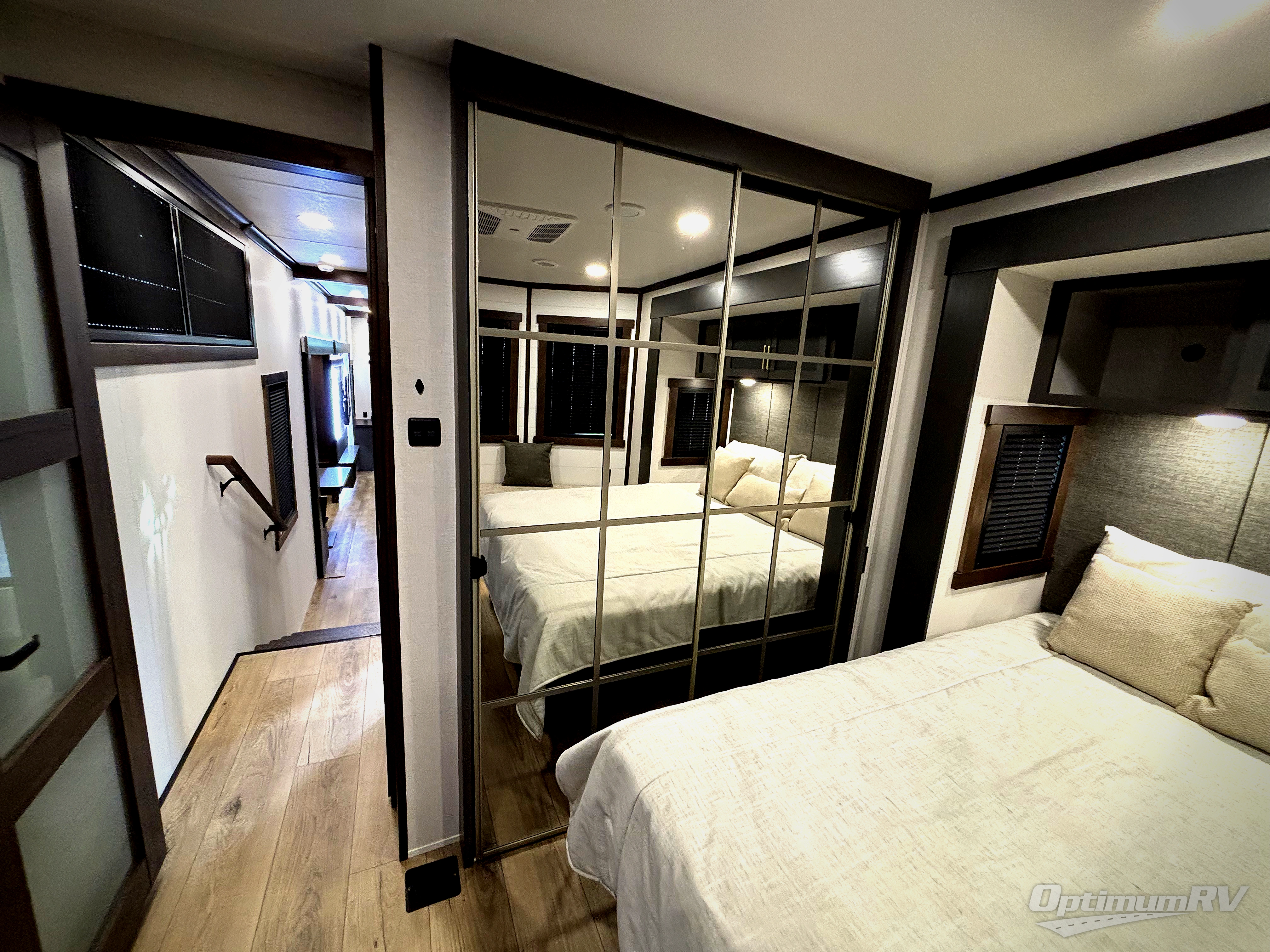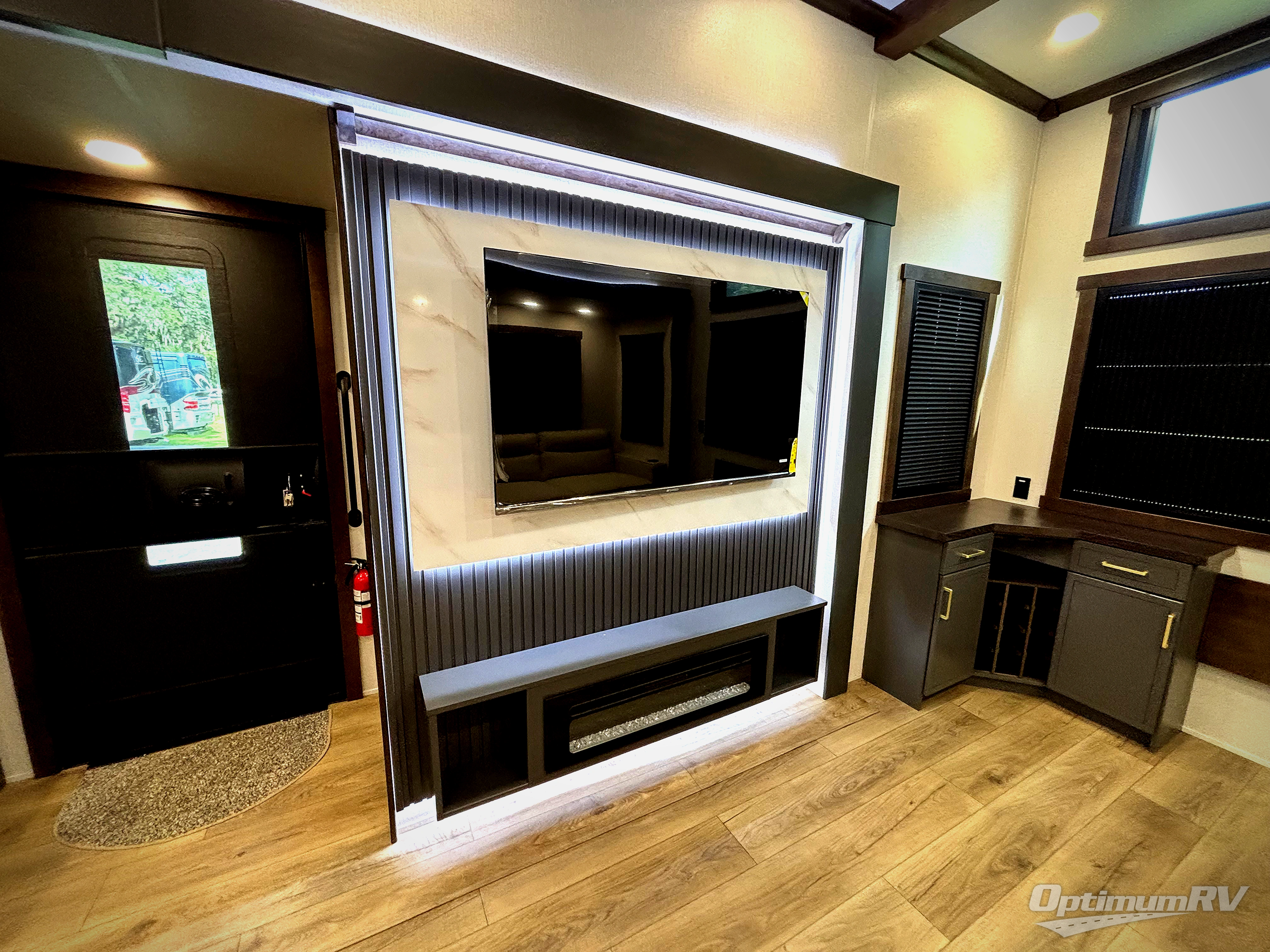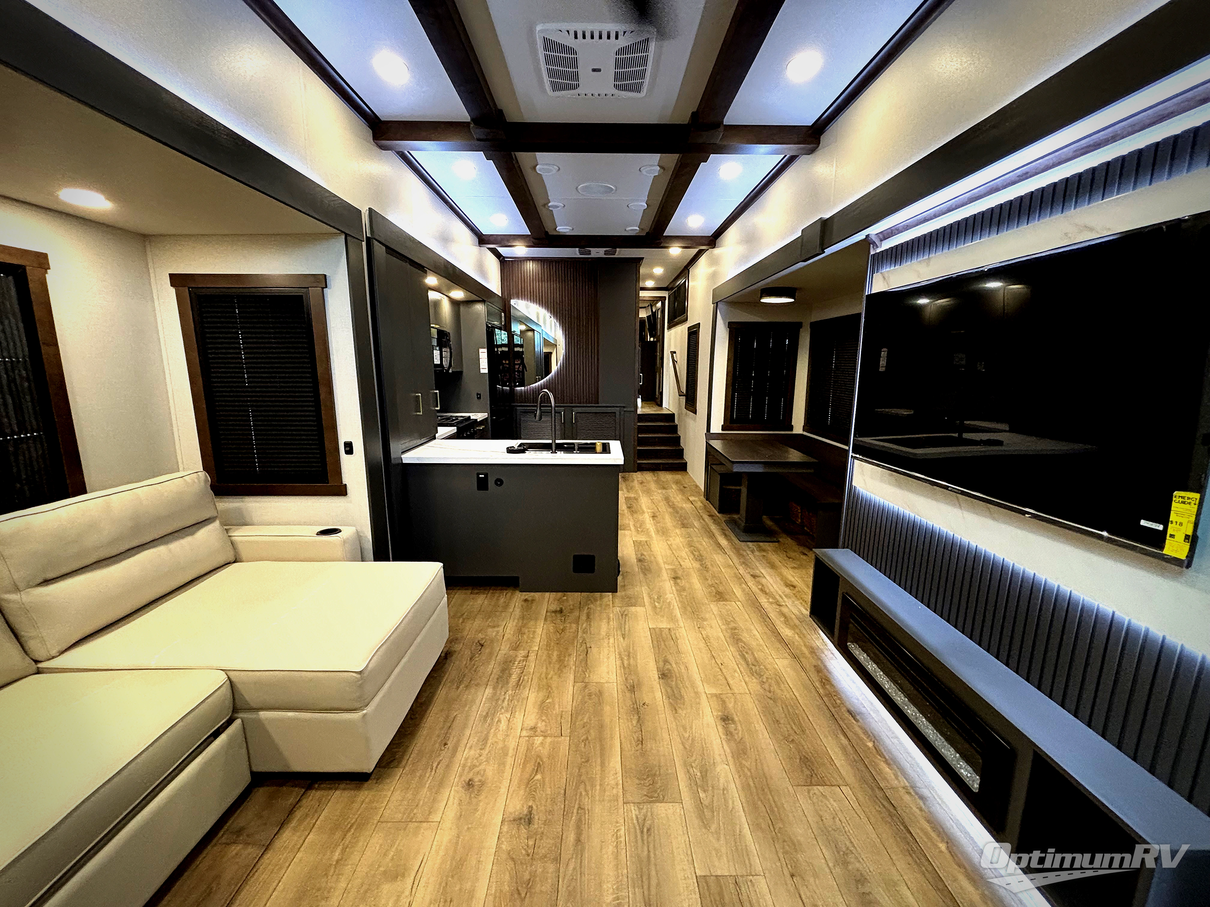 The rear living room is a spacious retreat, featuring a comfortable sectional sofa and a flip desk perfect for working or relaxing. Unwind with a glass of wine at the wine bar, or cozy up by the fireplace while enjoying your favorite show on the TV. The mud room is a practical and convenient feature, perfect for storing gear, boots, and jackets. The kitchen is fully equipped with overhead cabinets, a microwave, a refrigerator, and a table with swivel chairs, providing a comfortable spot to enjoy meals with family and friends. The full bathroom features an ample shower, providing plenty of space to get ready for the day, while the front bedroom is the perfect spot to relax and recharge after a long day of exploring, featuring a king bed, closet, and dresser.