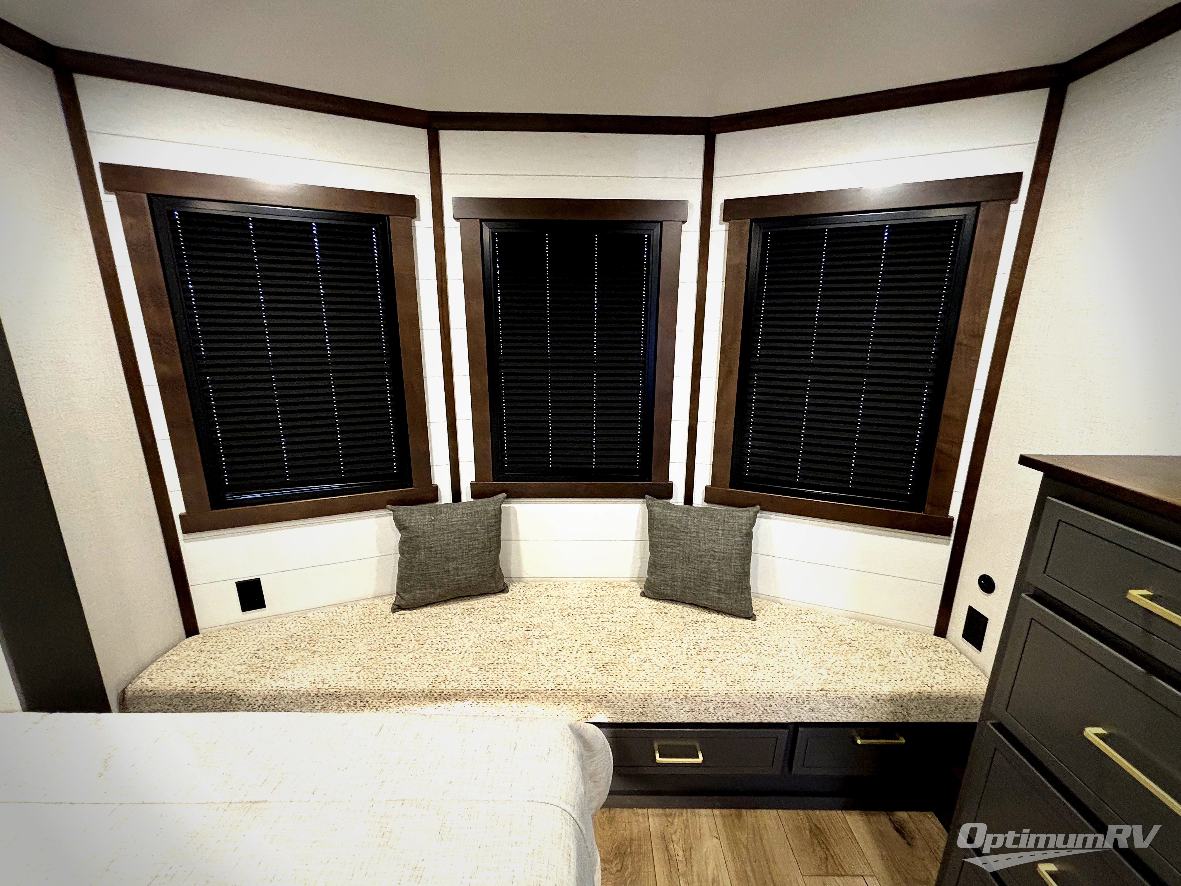 Hop on new adventures with the Forest River Cedar Creek Cottage Fifth Wheels! Each destination fifth wheel features a 101" wide body frame that provides a sturdy foundation for your adventures, while the AlphaPly TPO roof membrane offers superior durability and weather resistance. Plus, the 3M Bonded Sidewalls add an extra layer of protection and strength, and the hydraulic front jacks make setting up camp a breeze. In the luxurious interiors, the vinyl floor covering is easy to clean, and the Vixeinite flush floor slides in the kitchen and living area provide a seamless transition between the floor and the slide-outs. In addition, the 52" ceiling fan in the living room circulates air and adds to the spacious feel, and the kitchen island is a standout feature, boasting a solid surface counter, a flush-mount sink, and a stainless-steel design. You'll feel like you're cooking at home! Finally, the USB ports in the bathroom ensure you can keep your devices charged and within reach, even in the most convenient places.