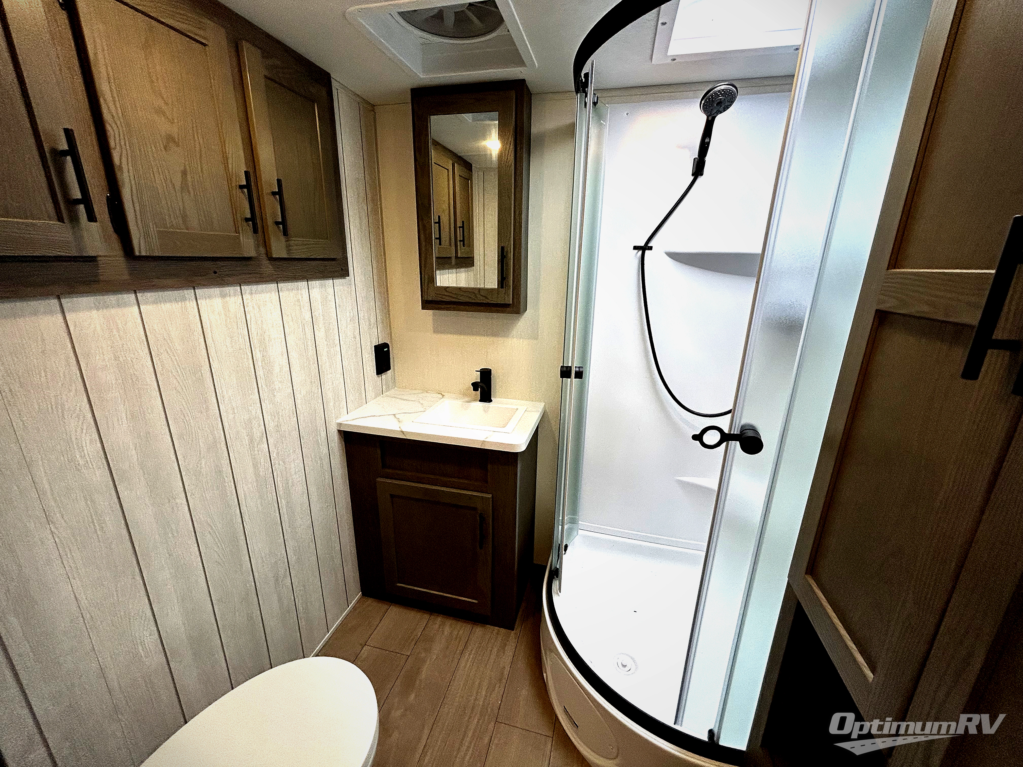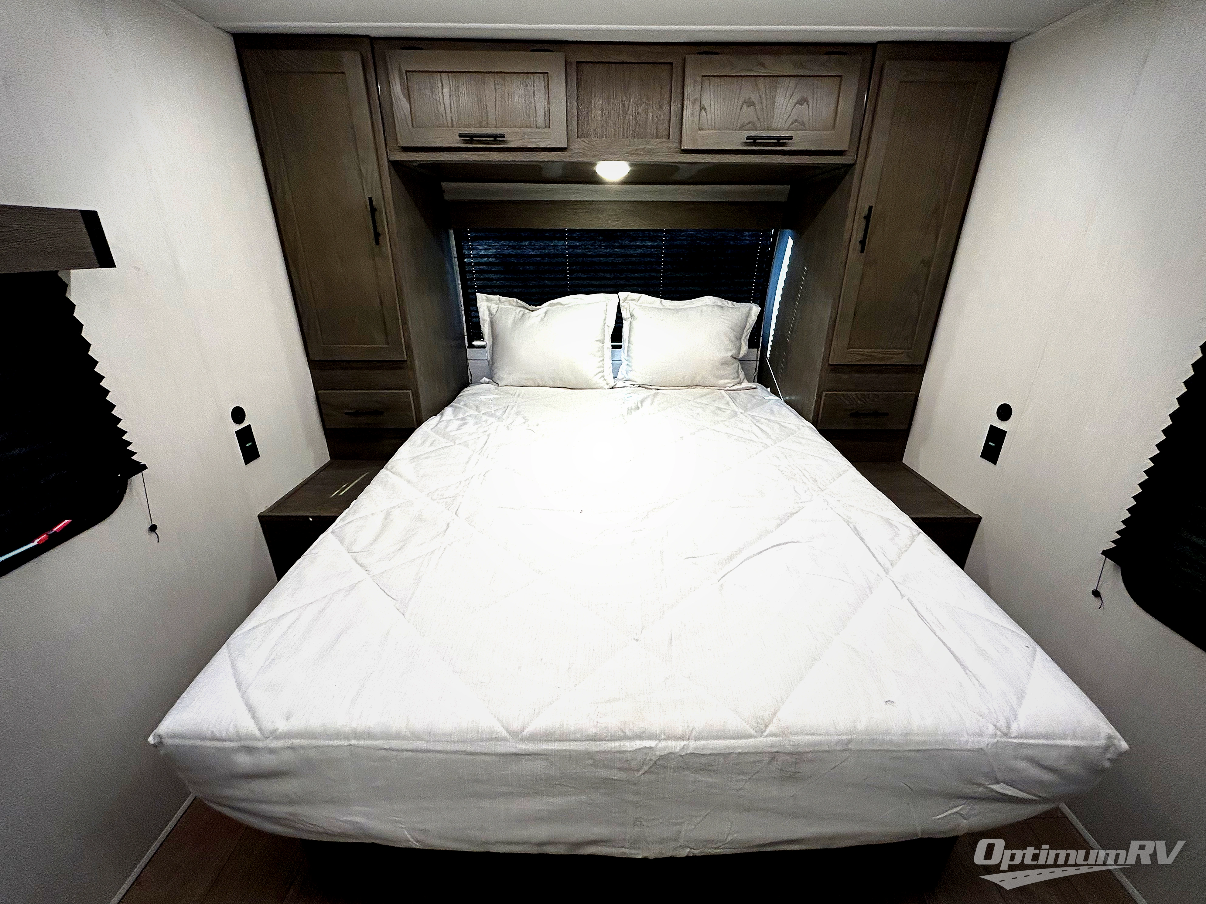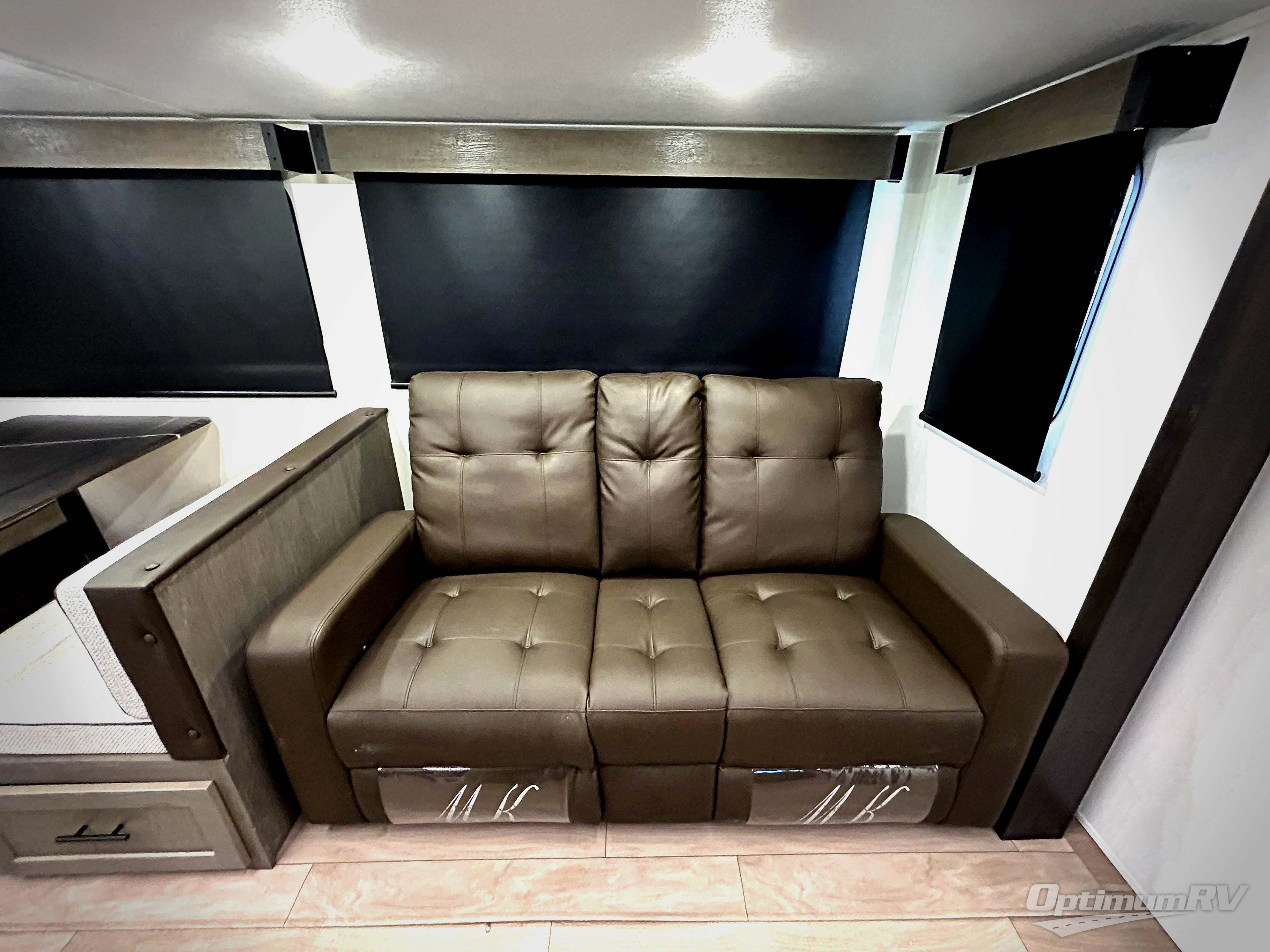 Head to your local state park in this travel trailer with a large slide out! You will love having more space to move about, and your crew can relax on the theater seating or play a game at the booth dinette. An optional TV can be added to the entertainment center, and the fireplace will make it feel a little more like home. There is a three burner cooktop and microwave oven in the kitchen, along with a 12V refrigerator and a walk-in pantry. If you enjoy cooking outdoors, then the outside kitchen will be waiting for you! The full rear bath will let you freshen up before bed, and the queen bed is sure to bring a great night's rest!