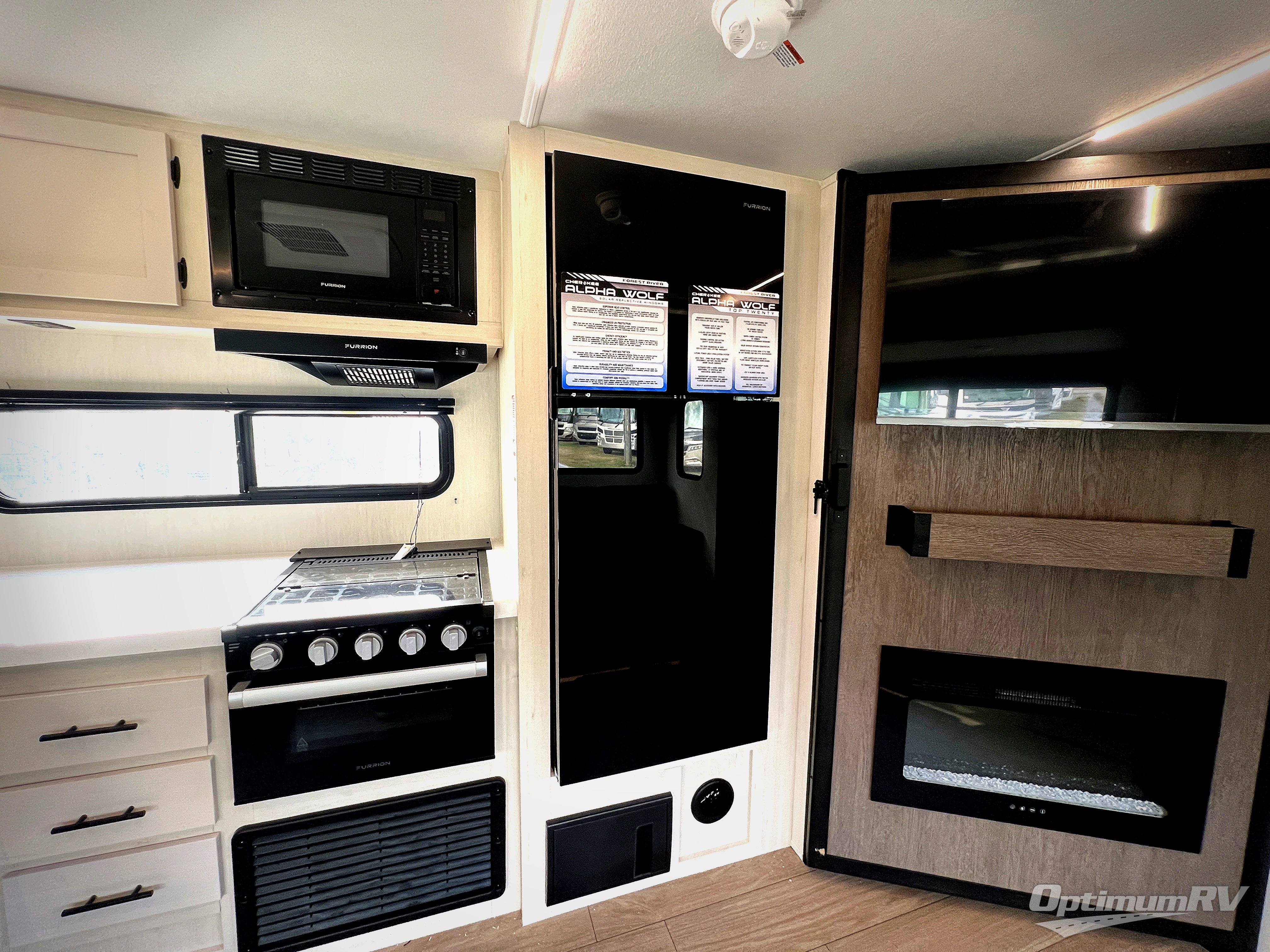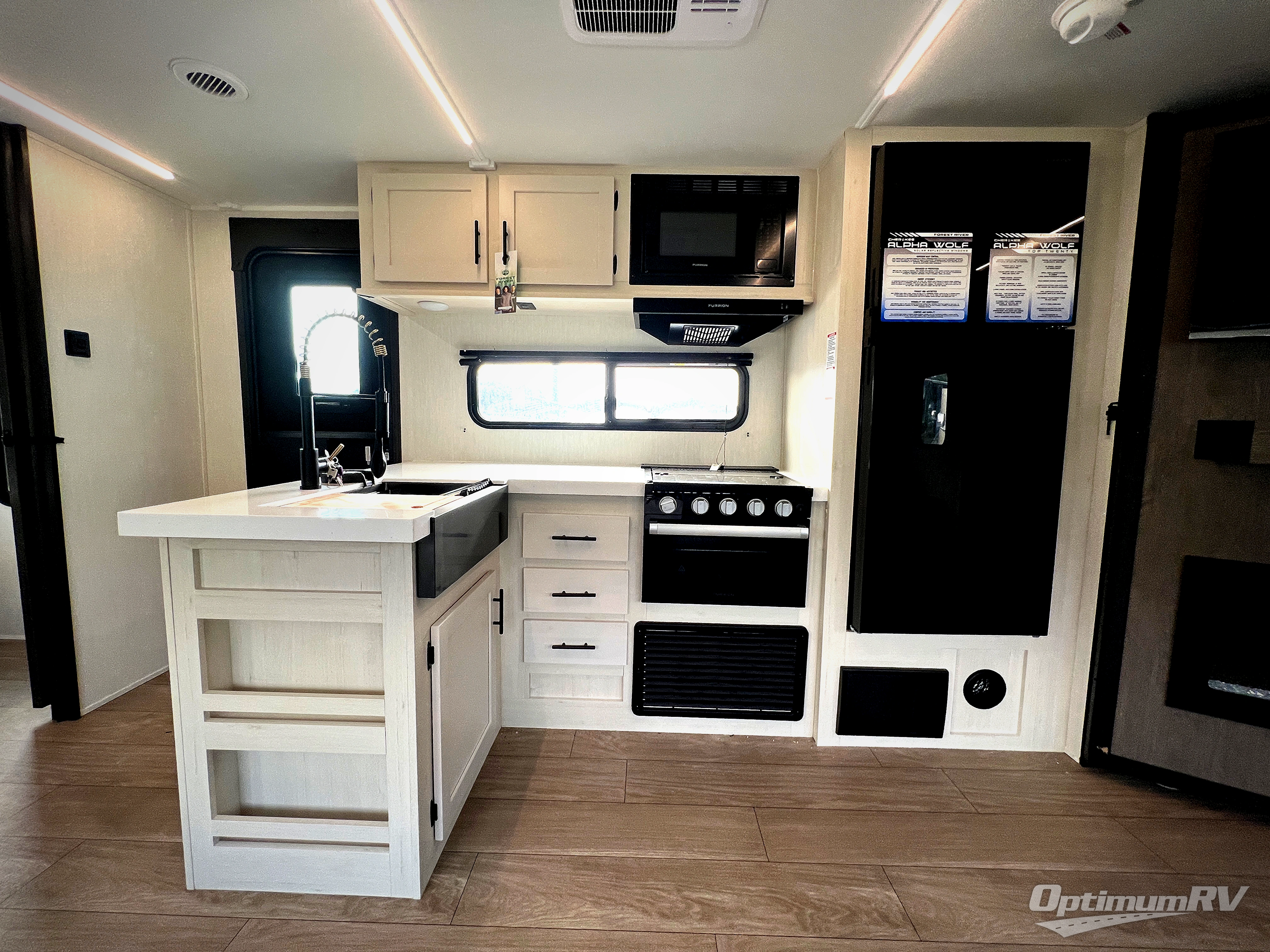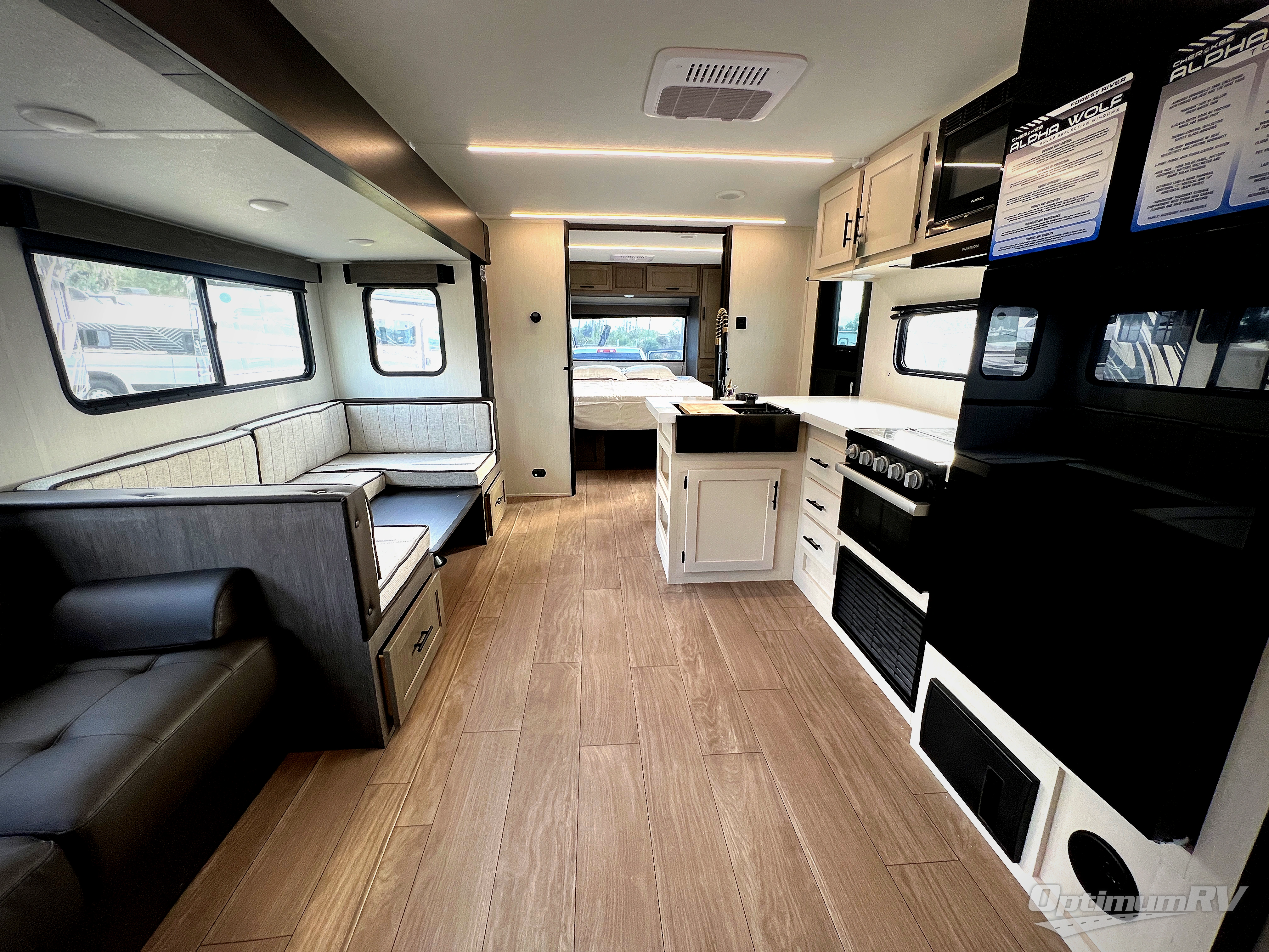 With any Cherokee Alpha Wolf travel trailer by Forest River you'll enjoy outstanding amenities, quality construction, and an affordable price. Each model features a "ToughBend" rigid skirt metal design, 5/8" tongue and groove plywood floor decking, and a "SuperTruss" roof structure that will hold up through years of camping memories. There is a pet friendly "clean sweep" floor design with no heat vents indoors, along with a super lumen lighting system, a 15,000 BTU quick cool central air conditioning, and many more comforts. There are many convenient exterior features such as, Leash Latch pet safety technology, an outside shower with hot and cold water, and exterior steps with oversized landing and quick release. The Weather Guard Package will add protection against the elements with an armored underbelly tank enclosure and forced air heat, thermo-control reflective safety glass windows, and upgraded laminated walls with block foam insulation!