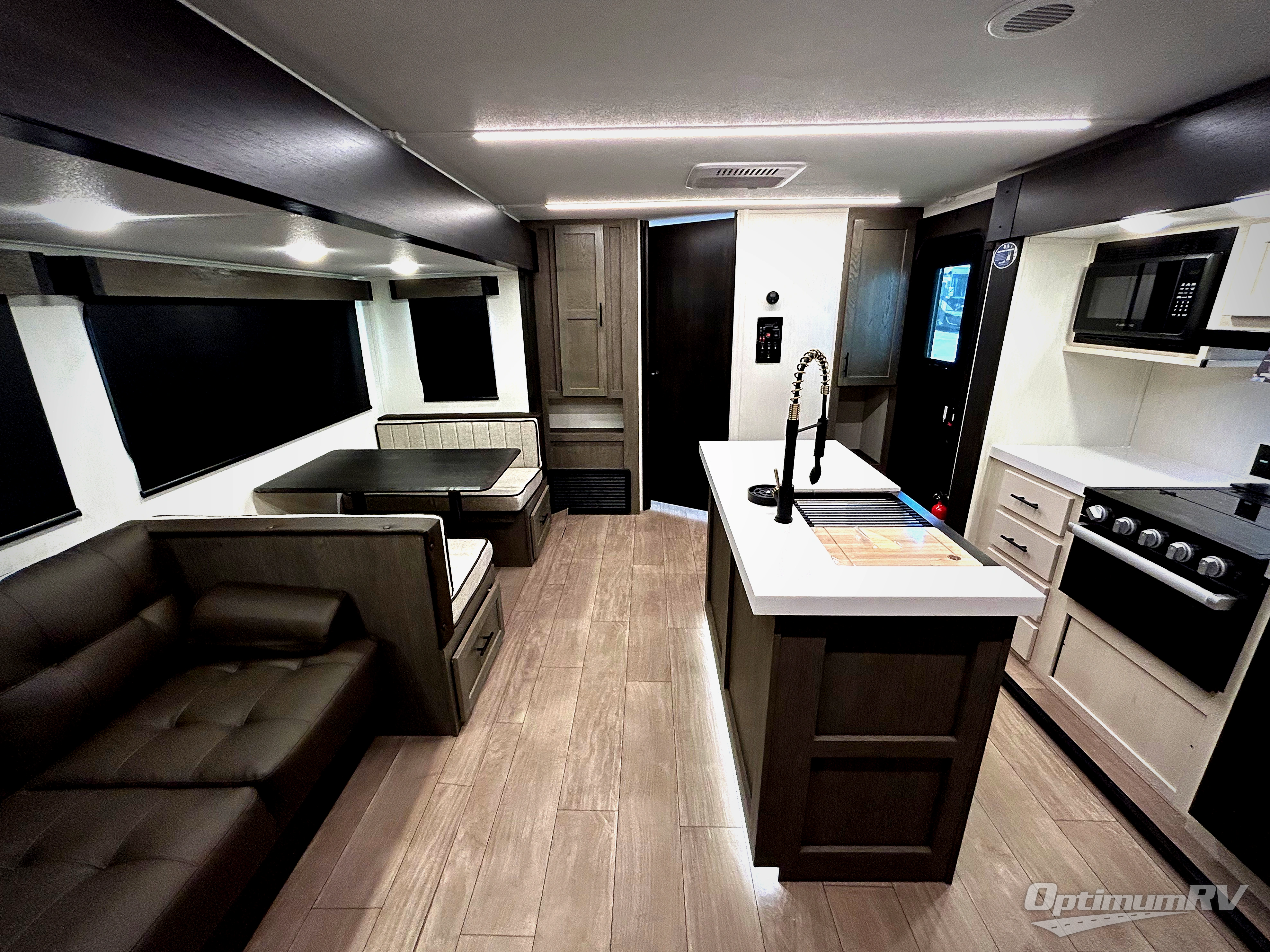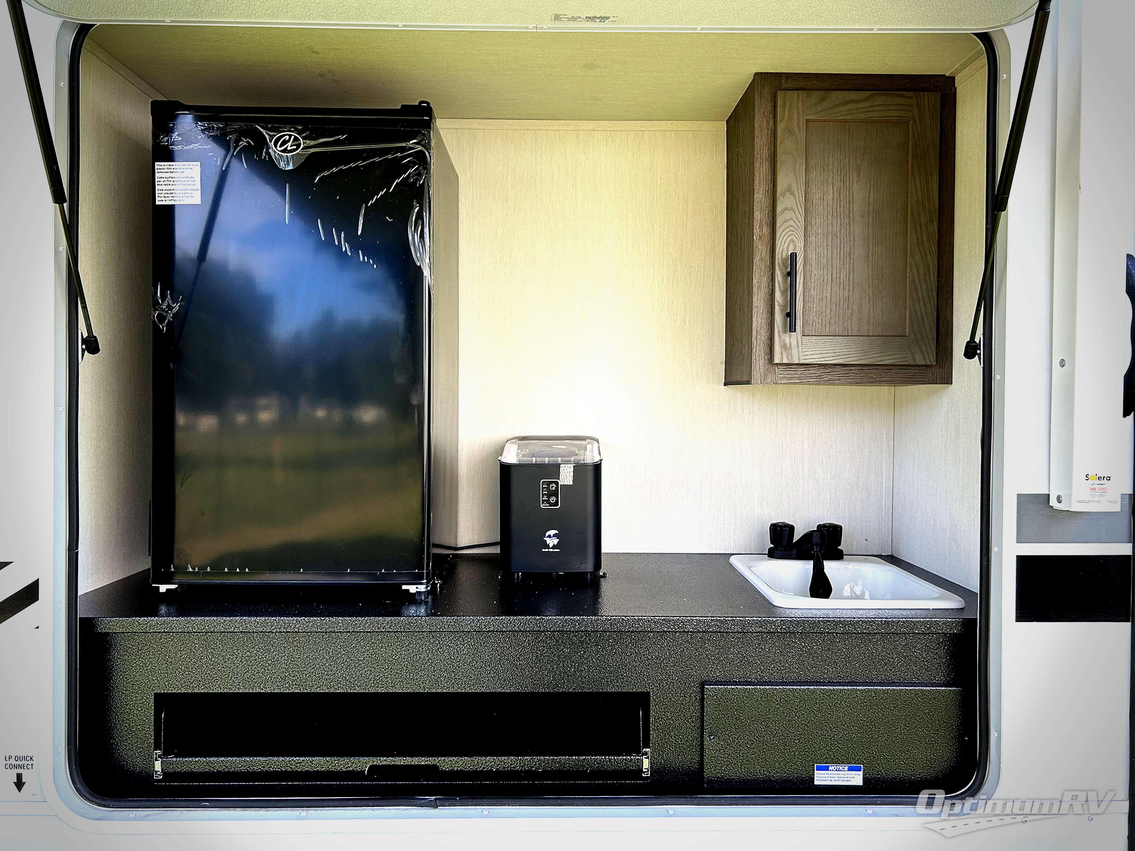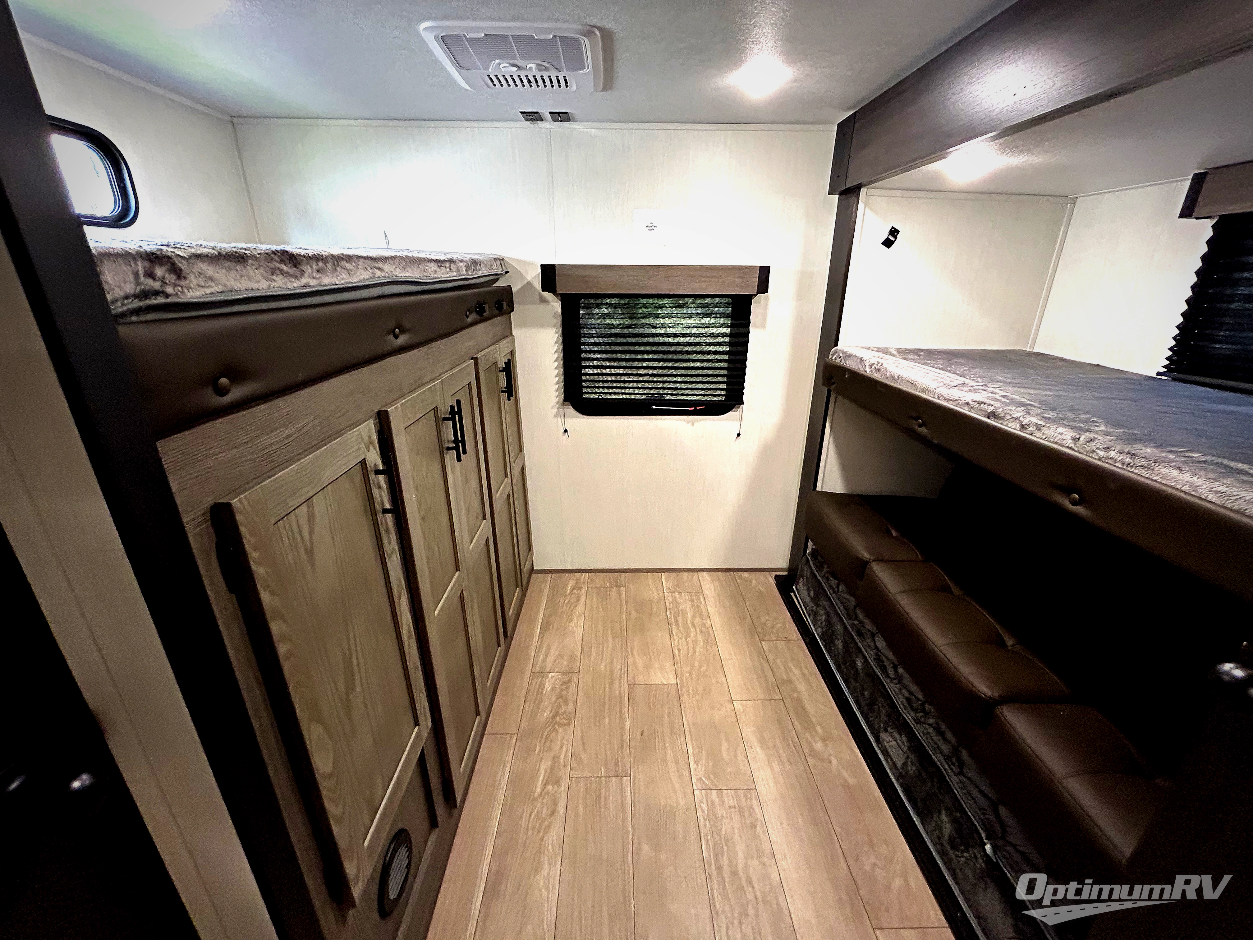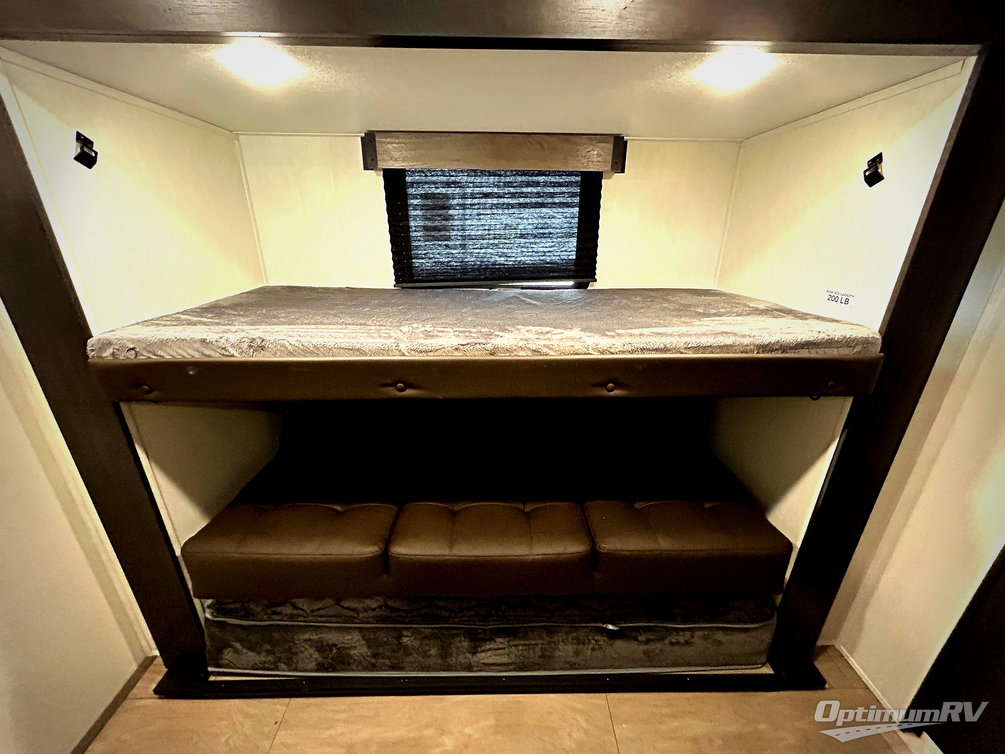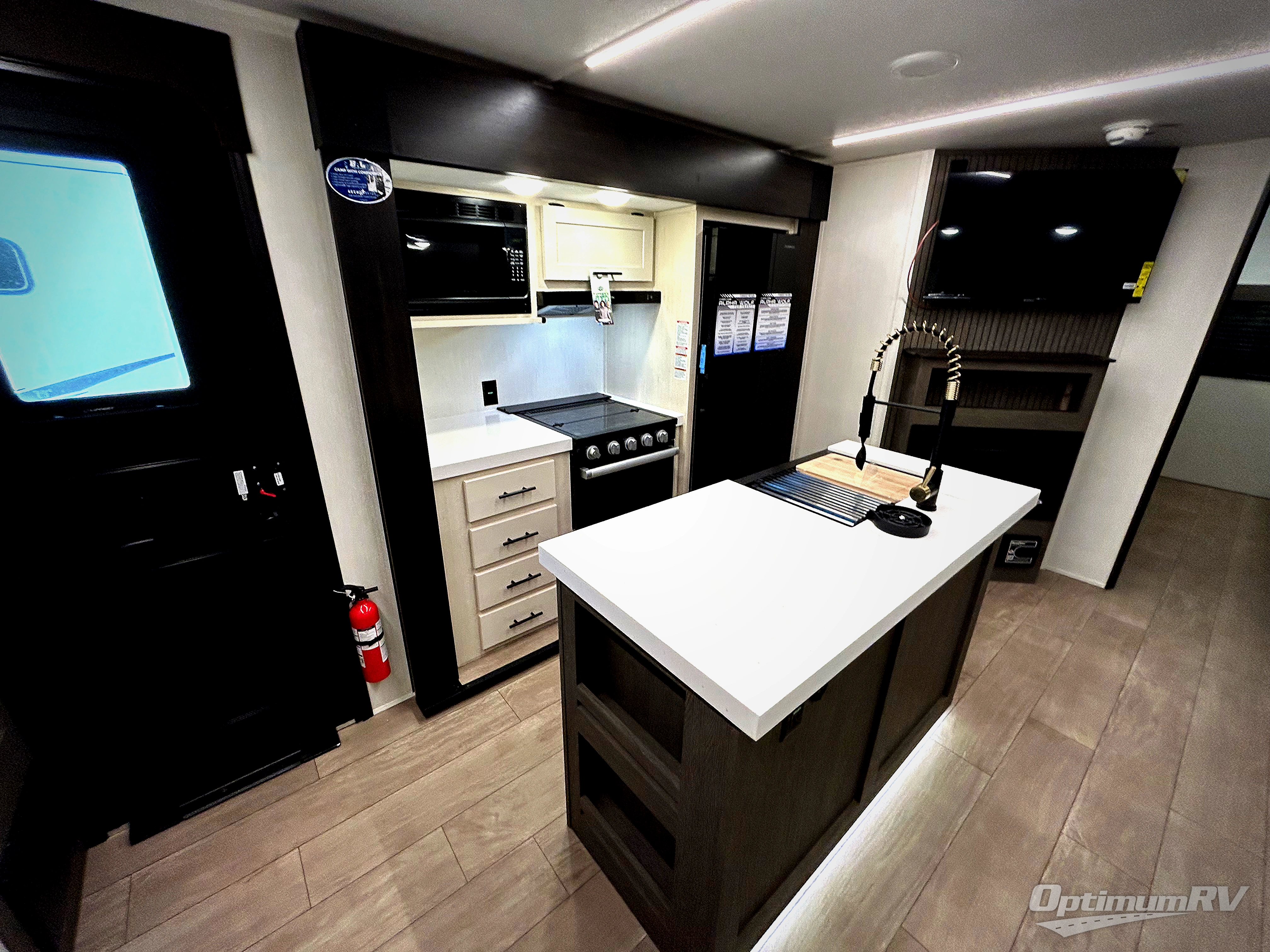 Load up your clothes, food, and outdoor gear to enjoy a long weekend away from the city in this travel trailer! There are triple slide outs, a private bunkhouse with a half bathroom with a second exterior entry/door for convenience, plus an outside kitchen, complete with ice! The bunkhouse also has two bunks, a jackknife sofa and a trundle bed, plus a slide out for more interior floor space. The main living and kitchen area is spacious as well with two opposing slides, a kitchen island with a large sink, a pantry, plus a cozy fireplace. The full walk-through bathroom allows double access, and the front bedroom allows you to sleep like royalty.