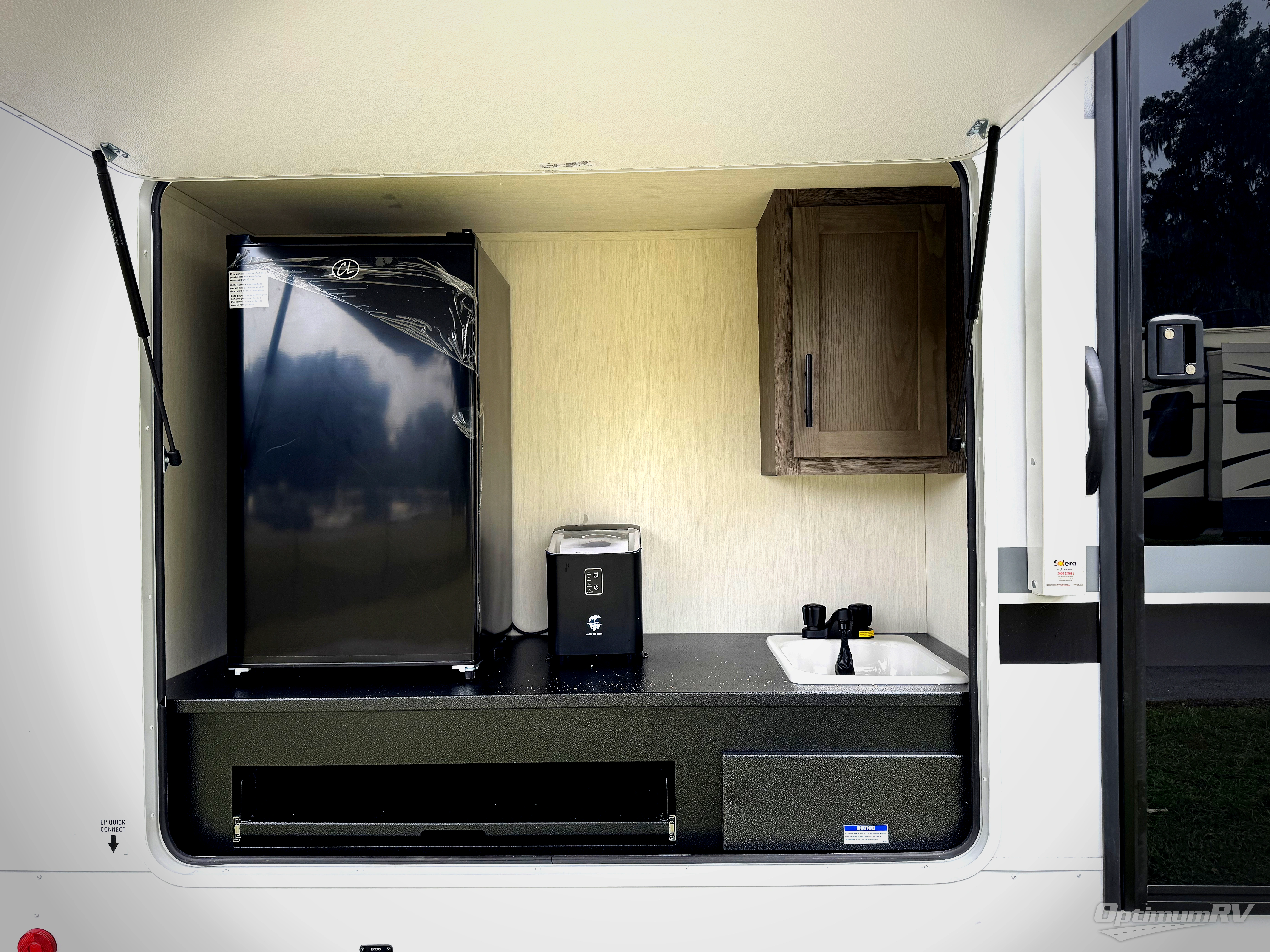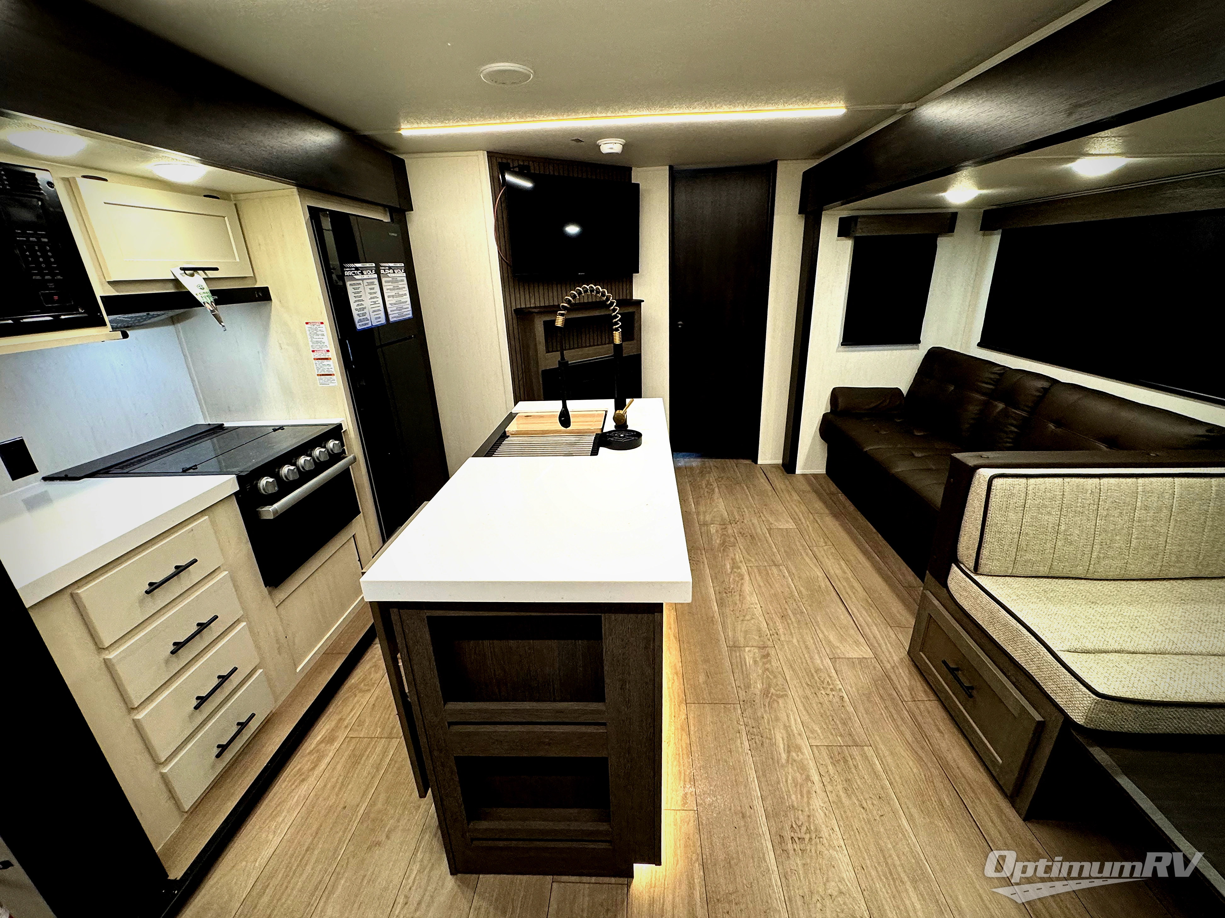 Load up your clothes, food, and outdoor gear to enjoy a long weekend away from the city in this travel trailer! There are triple slide outs, a private bunkhouse with a half bathroom with a second exterior entry/door for convenience, plus an outside kitchen, complete with ice! The bunkhouse also has two bunks, a jackknife sofa and a trundle bed, plus a slide out for more interior floor space. The main living and kitchen area is spacious as well with two opposing slides, a kitchen island with a large sink, a pantry, plus a cozy fireplace. The full walk-through bathroom allows double access, and the front bedroom allows you to sleep like royalty.