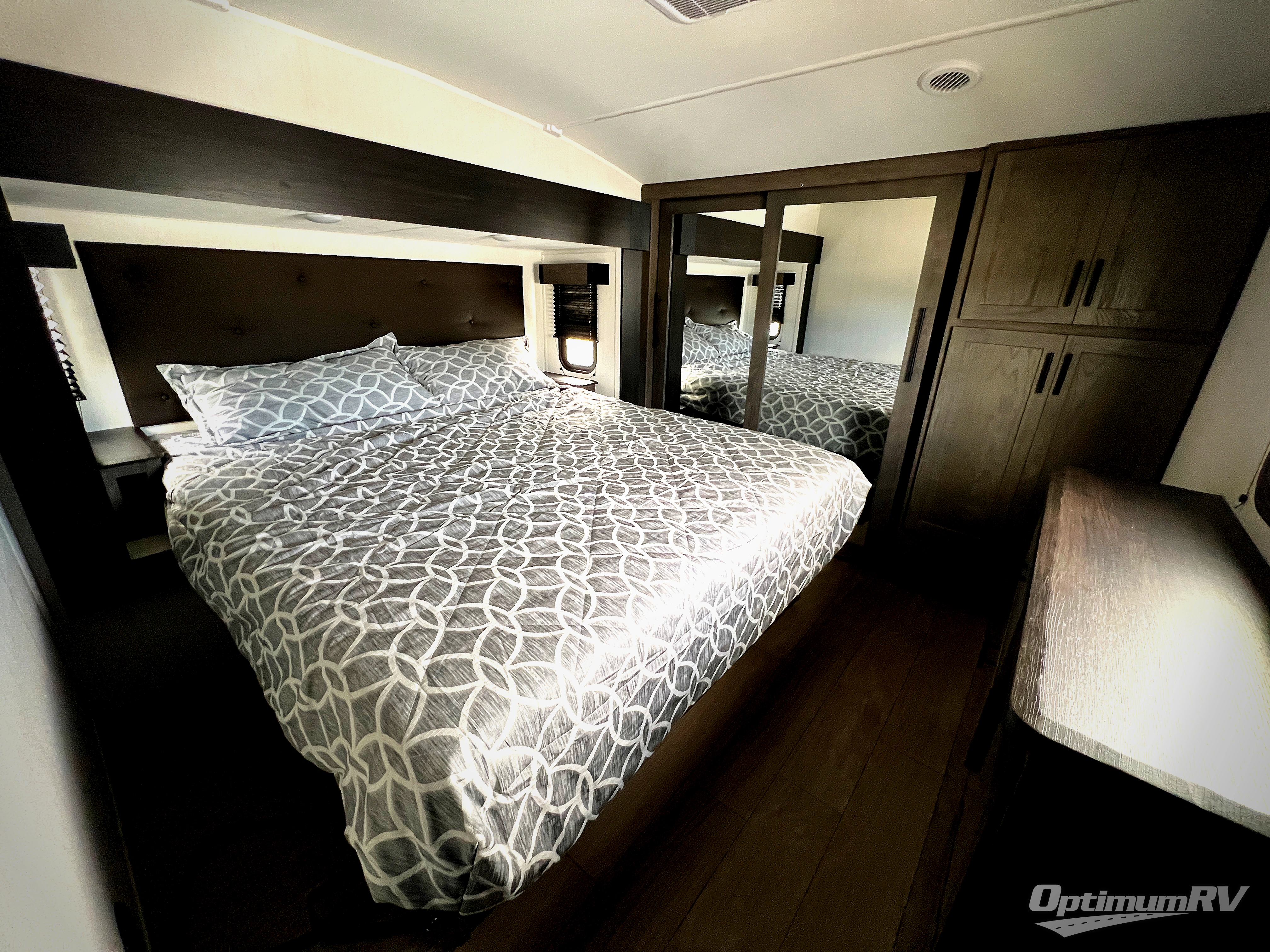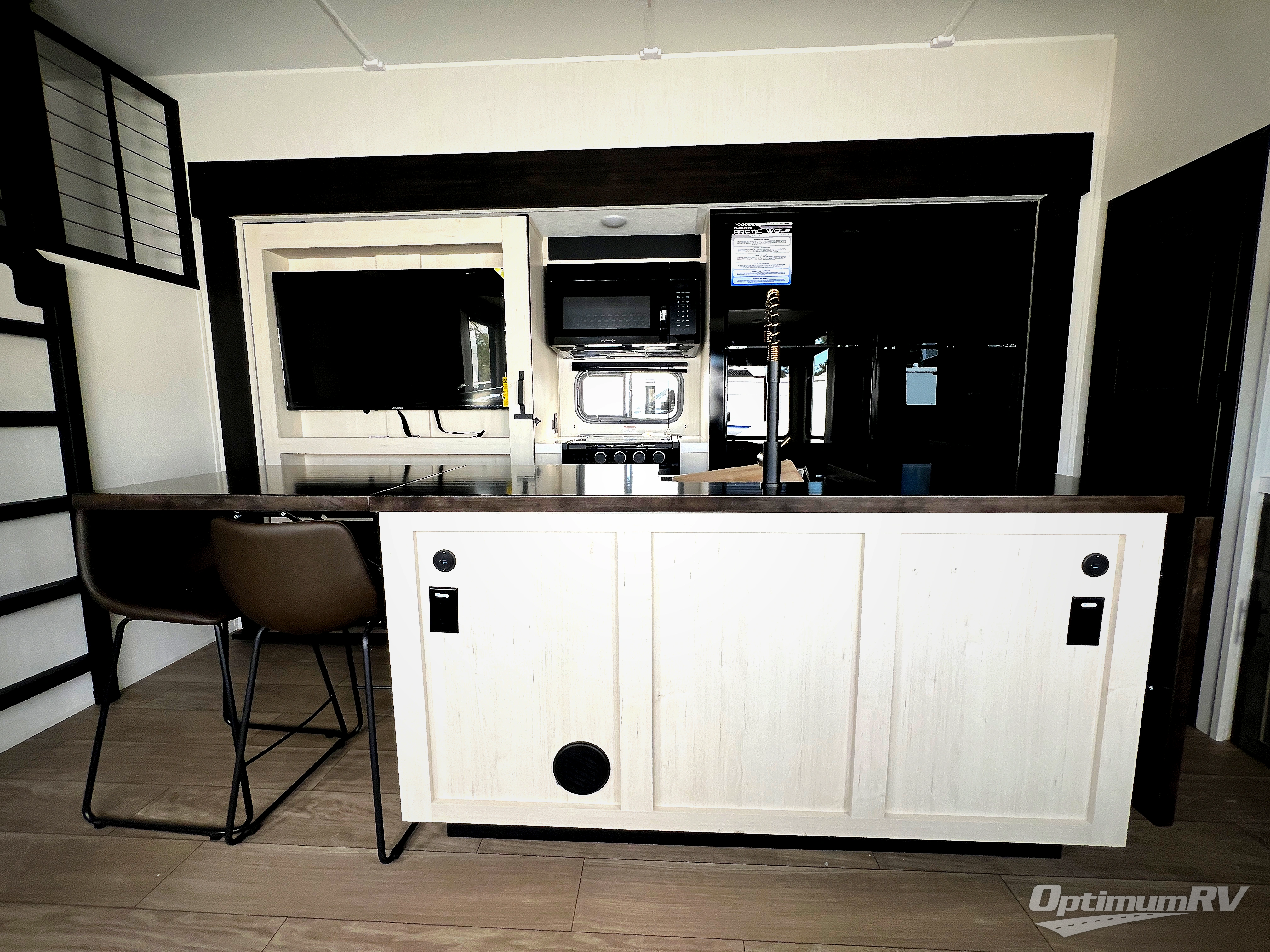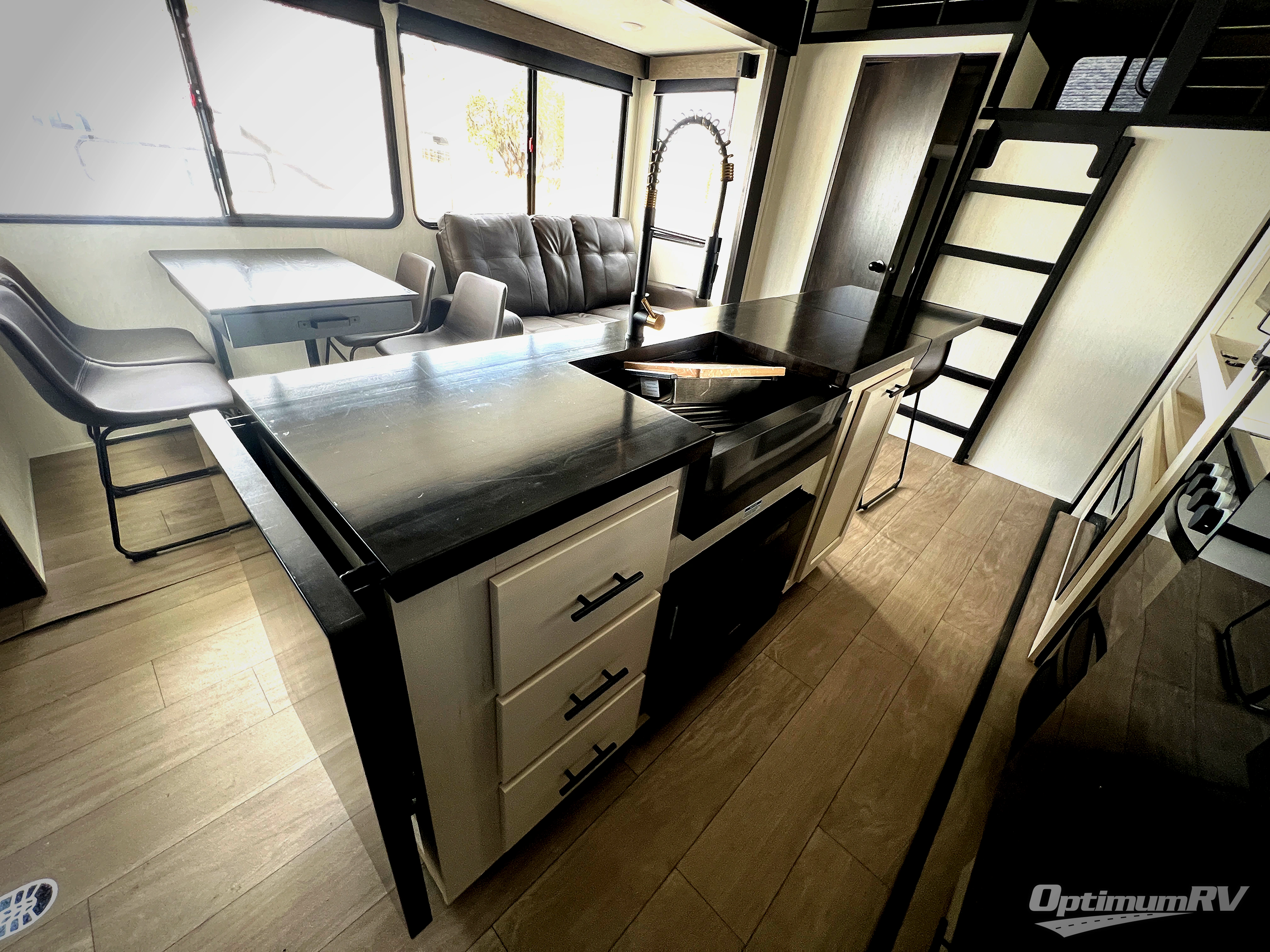 This quad-slide layout is set up for long stays and easy routines. The kitchen centers around a beautiful kitchen island for prep, the free-standing range is perfect for making full-size meals, and clean-up is a breeze with the built-in dishwasher. Across the living/kitchen zone you’ll find seating oriented to the entertainment wall and an LED TV, so movie nights don’t fight the cook space. Up front, the suite’s king bed slide faces a bedroom fireplace, with deep hanging space and drawers to keep wardrobes organized. Outside, the dual entry design improves campsite flow, and the triple-awning coverage stretches usable patio space. There is also more space for kids or guests in the upper loft!