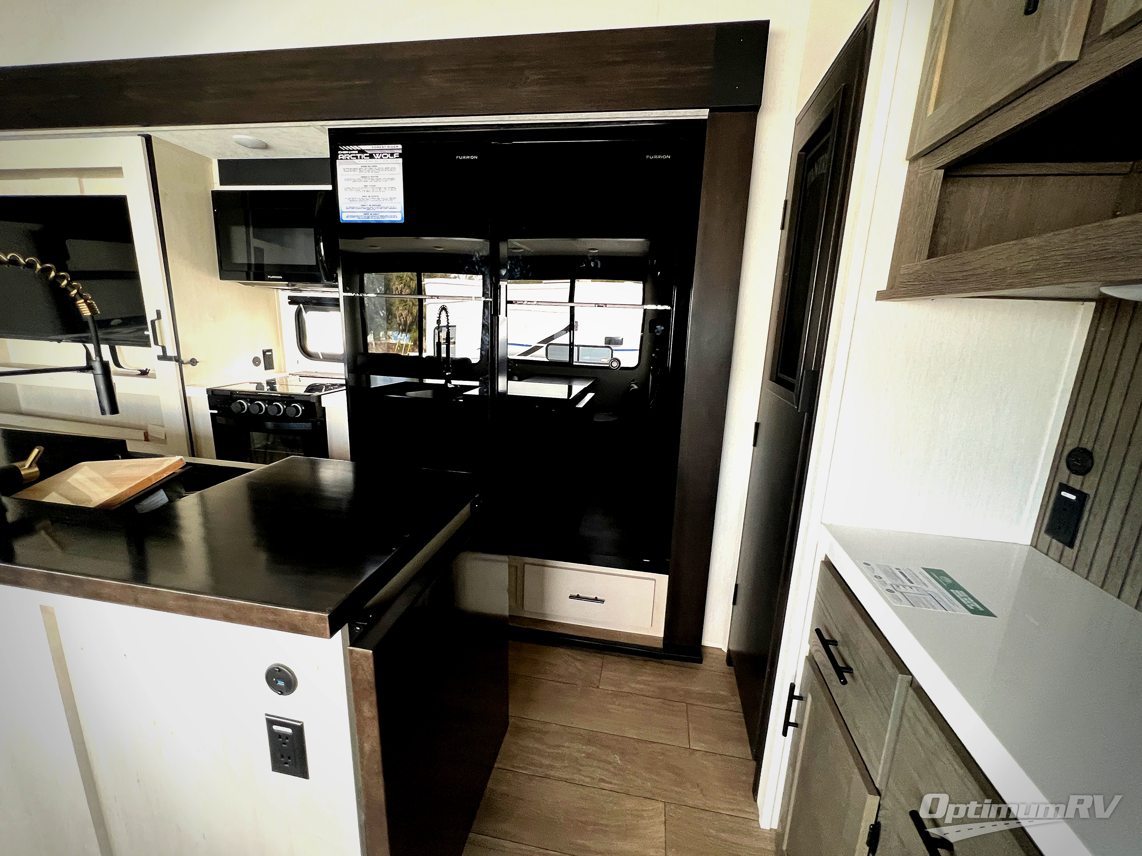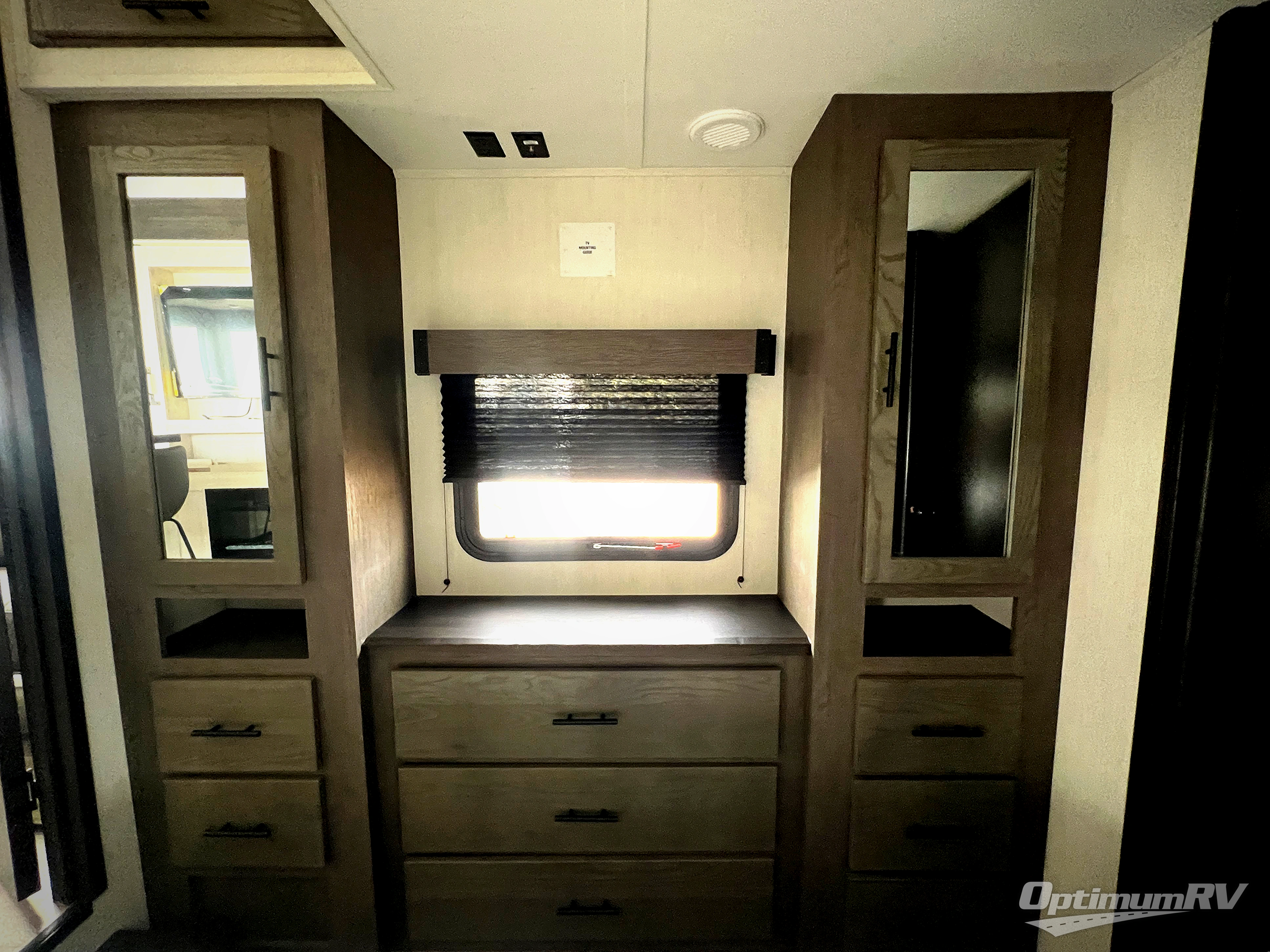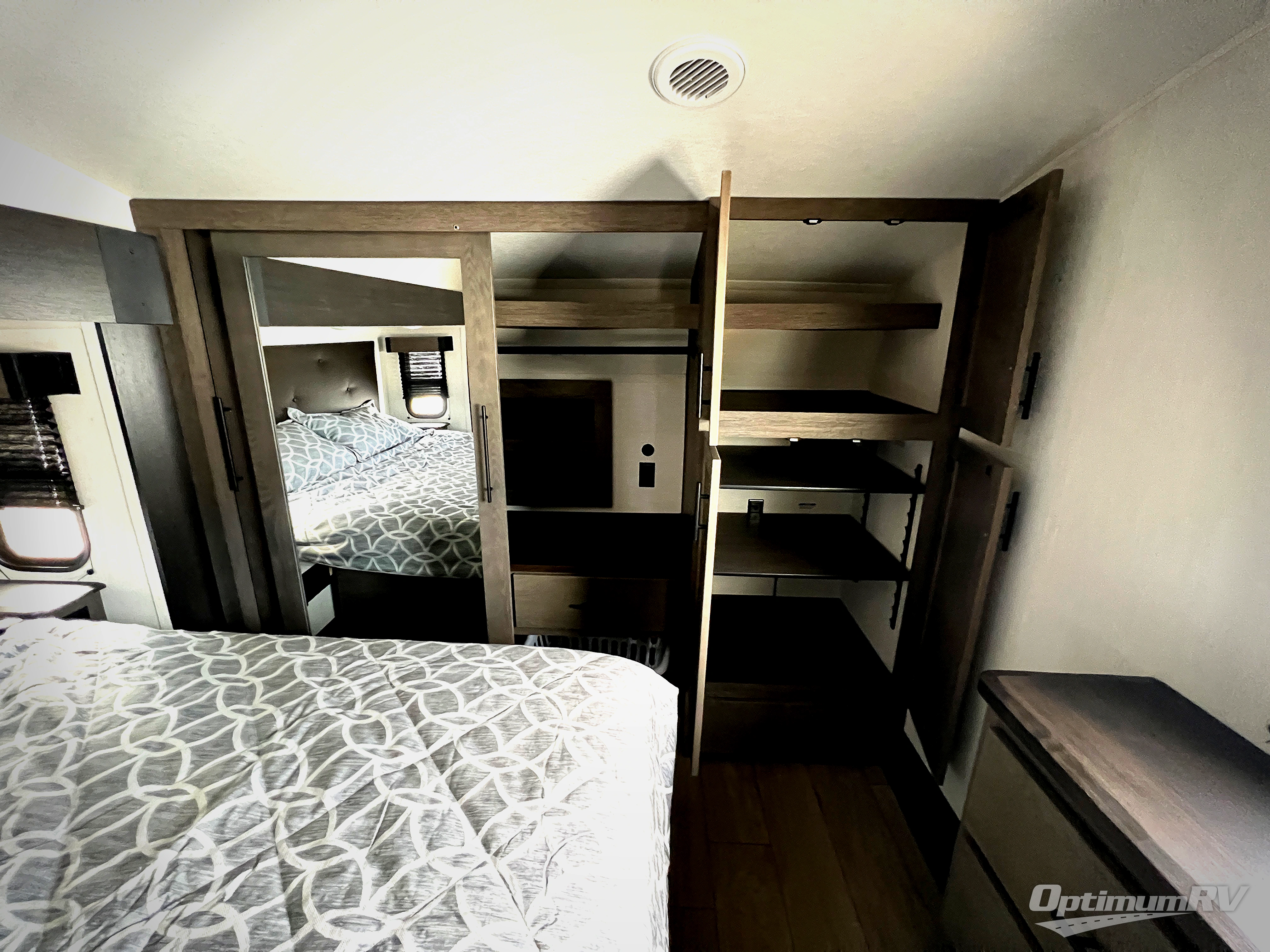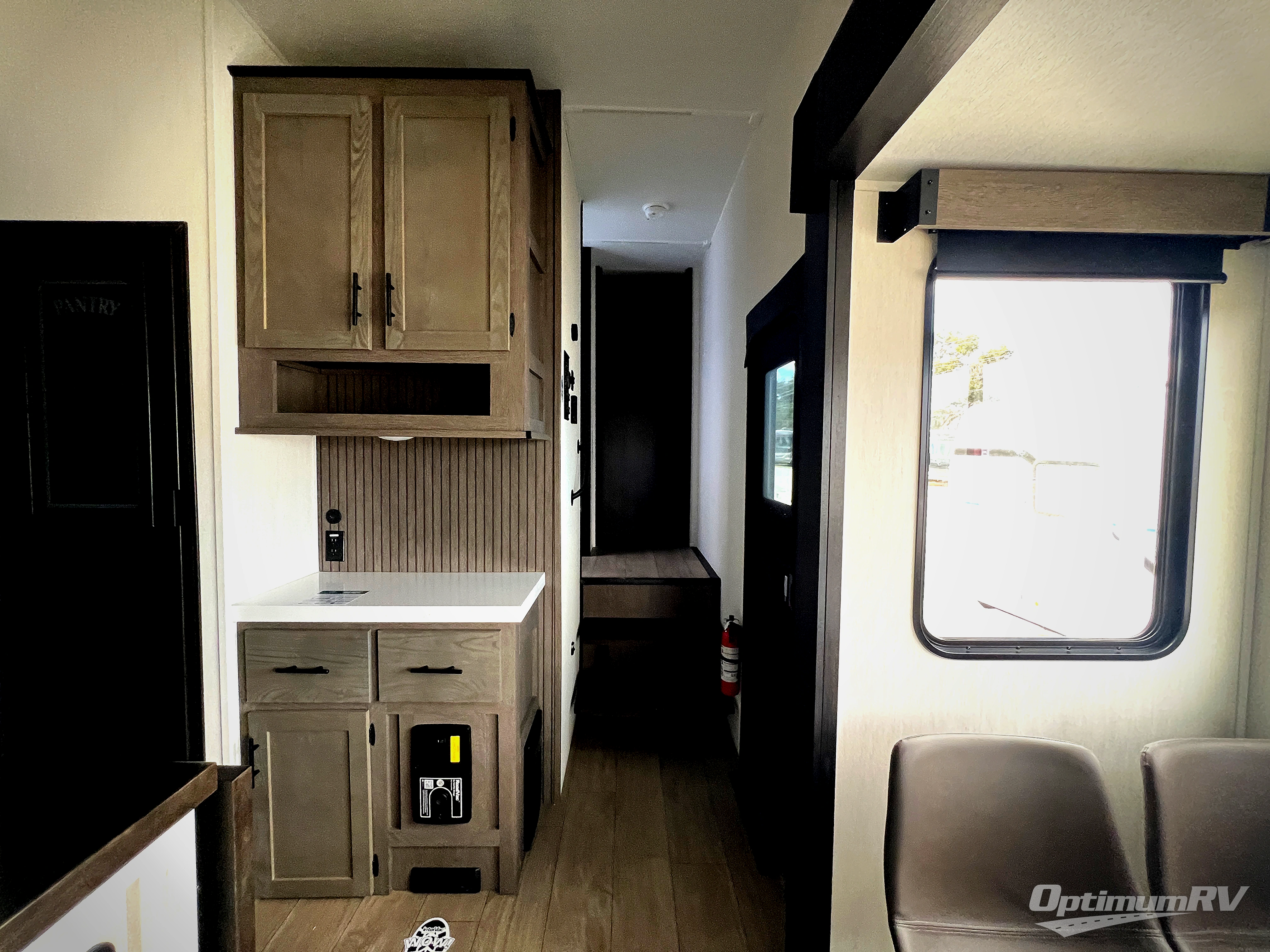 This quad-slide layout is set up for long stays and easy routines. The kitchen centers around a beautiful kitchen island for prep, the free-standing range is perfect for making full-size meals, and clean-up is a breeze with the built-in dishwasher. Across the living/kitchen zone you’ll find seating oriented to the entertainment wall and an LED TV, so movie nights don’t fight the cook space. Up front, the suite’s king bed slide faces a bedroom fireplace, with deep hanging space and drawers to keep wardrobes organized. Outside, the dual entry design improves campsite flow, and the triple-awning coverage stretches usable patio space. There is also more space for kids or guests in the upper loft!