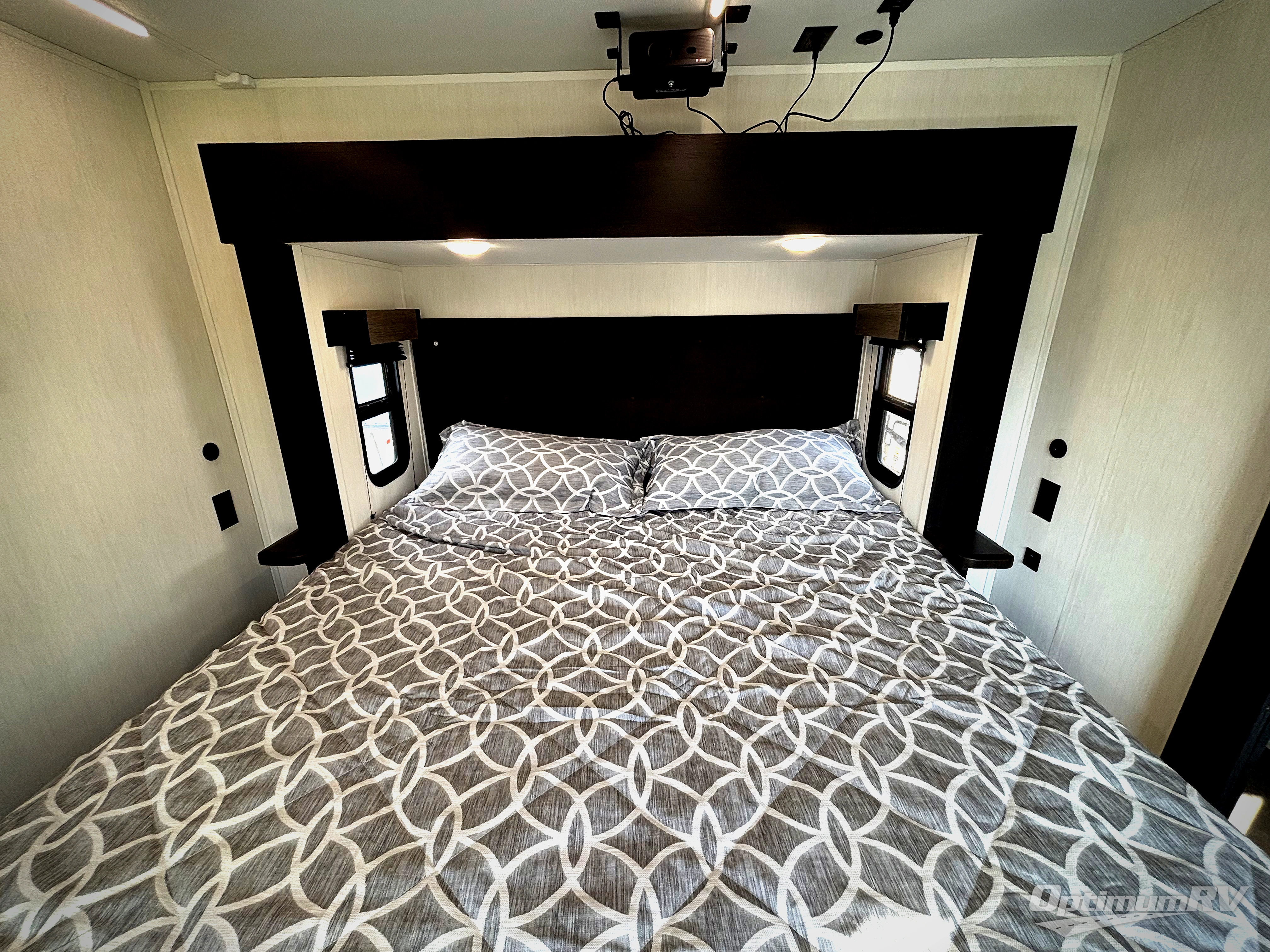 This thoughtfully arranged floorplan is built for extended stays and easy daily living. The rear lounge centers around an L-shaped sectional facing the entertainment wall and fireplace, with a nearby desk for work or hobbies. The kitchen’s island anchors a generous prep area, oversized pantry, and full cooking suite, so meals are simple whether you’re weekending or full-timing. Mid-coach, the guest half bath is convenient for all. Up front, the private bedroom’s king bed slide connects to a spa-style bath with large shower and dressing space, plus a substantial wardrobe to keep clutter out of sight. Outside, enjoy the campsite under dual power awnings that stretch along the patio side.