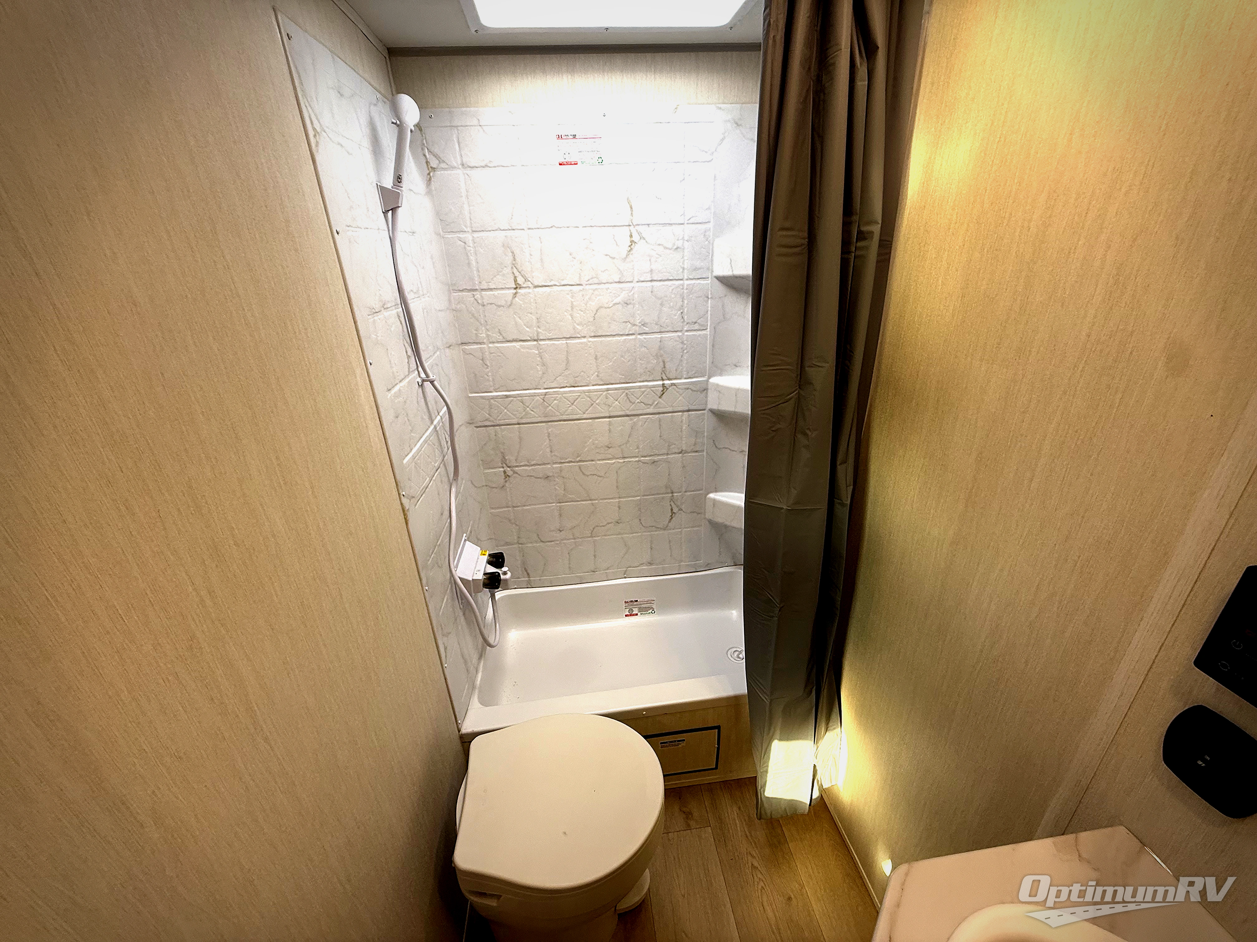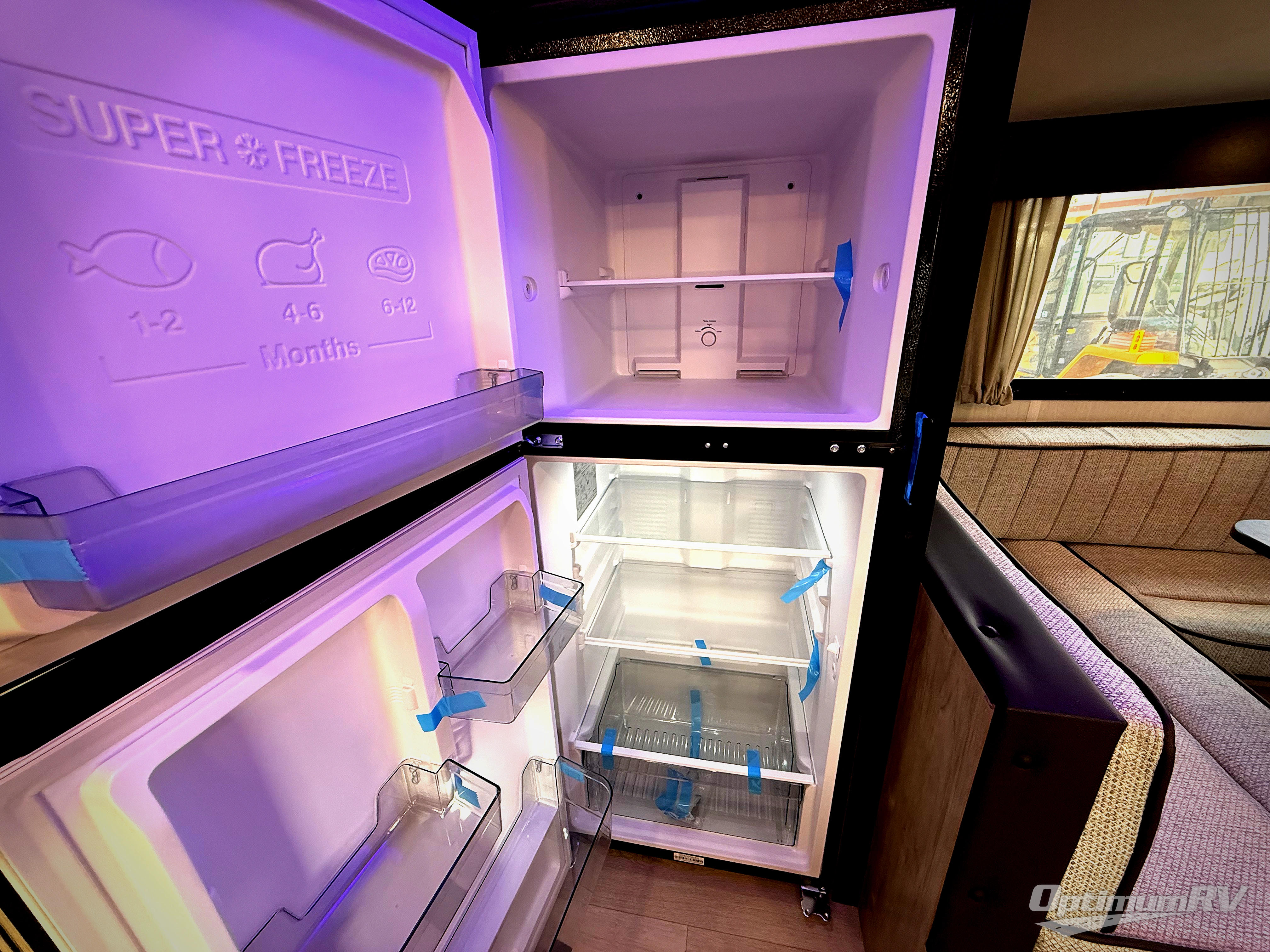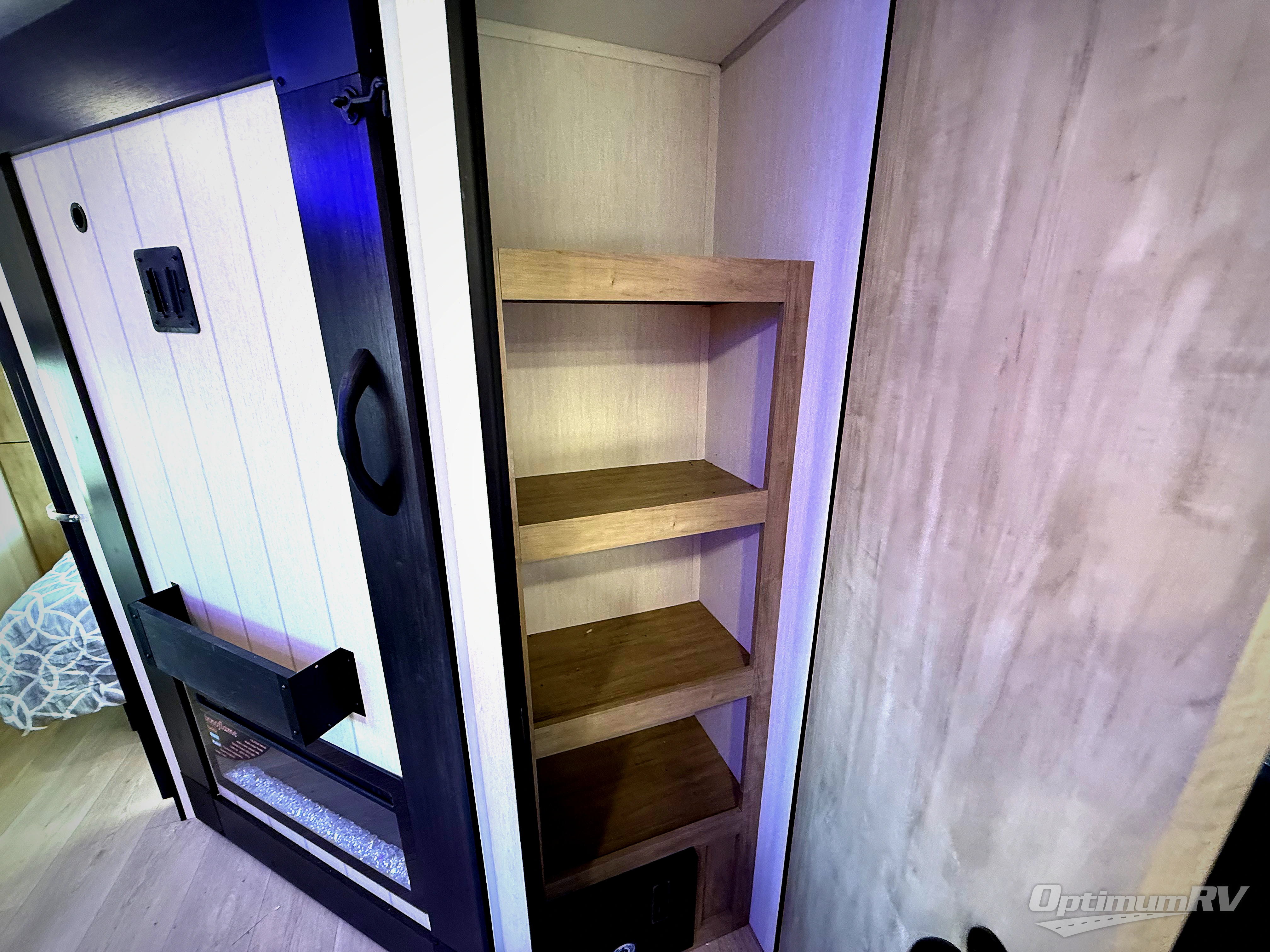 Enjoy time at the campground in this spacious travel trailer with a front private bedroom and double-size bunks for guests! The full interior kitchen and outside kitchen will let you make meals each day, and everyone can dine around the U-shaped dinette or under the 15' awning outside! This unit also includes ample storage space, including hidden shelves behind the fireplace and outside storage!
