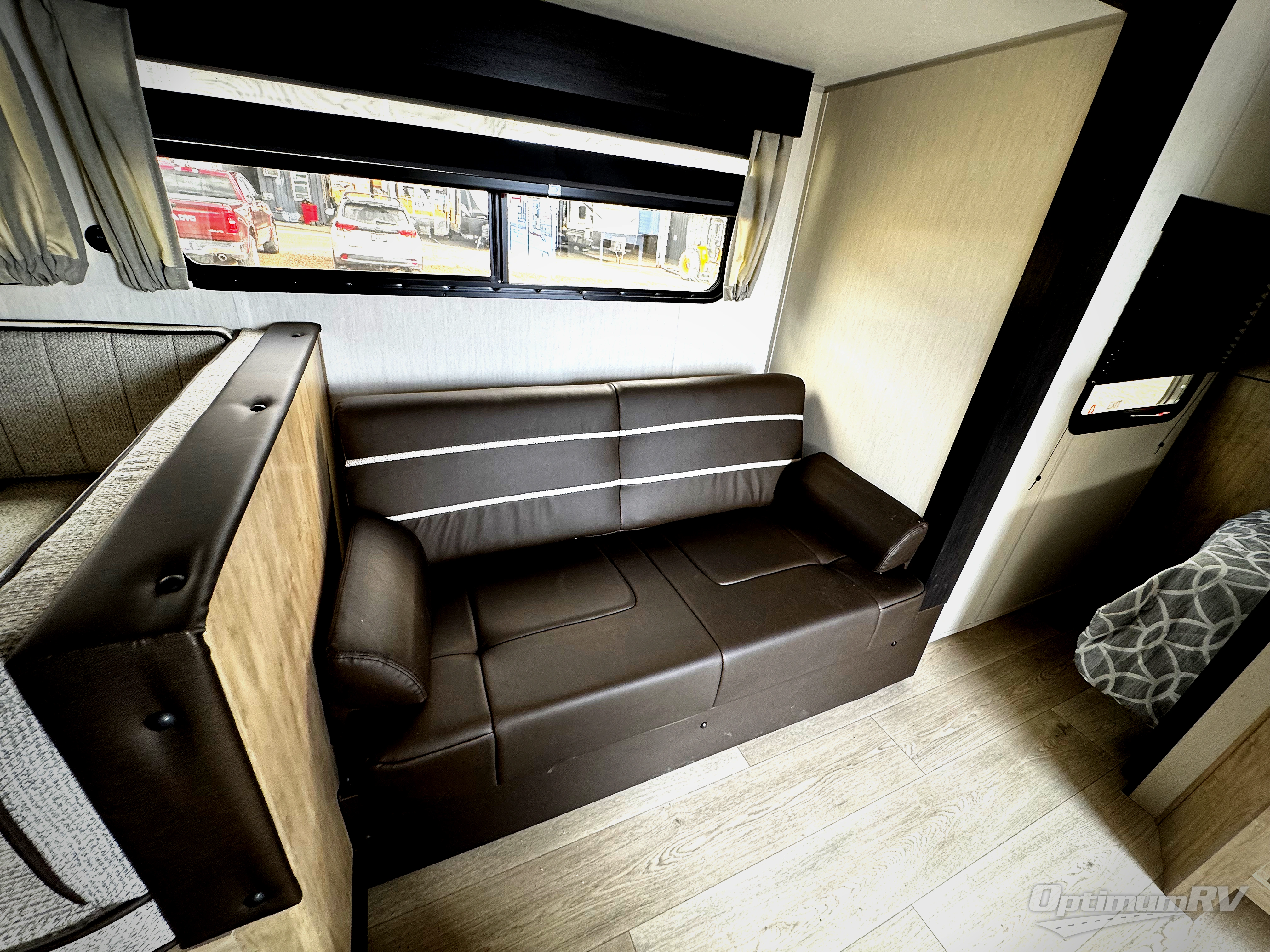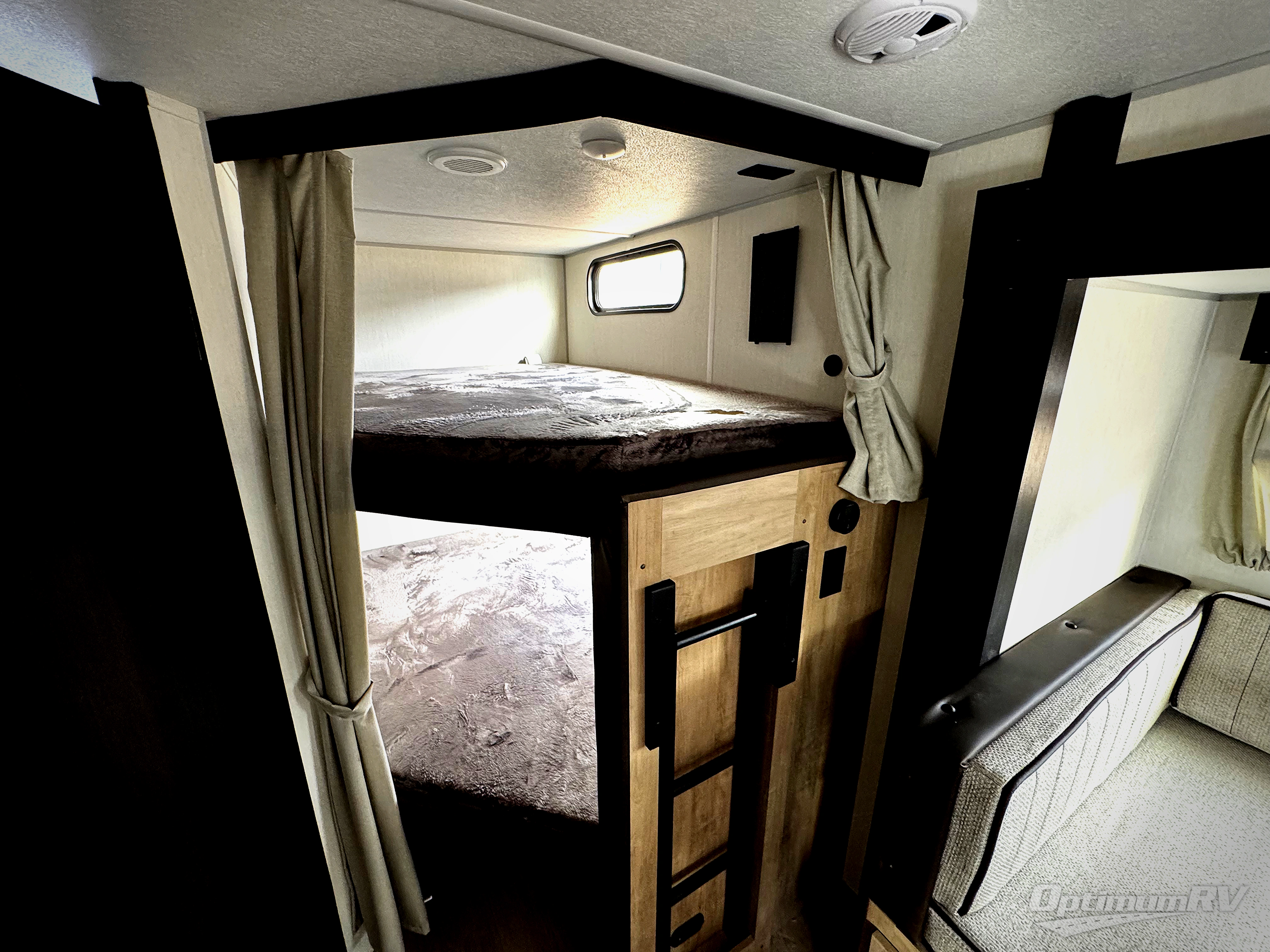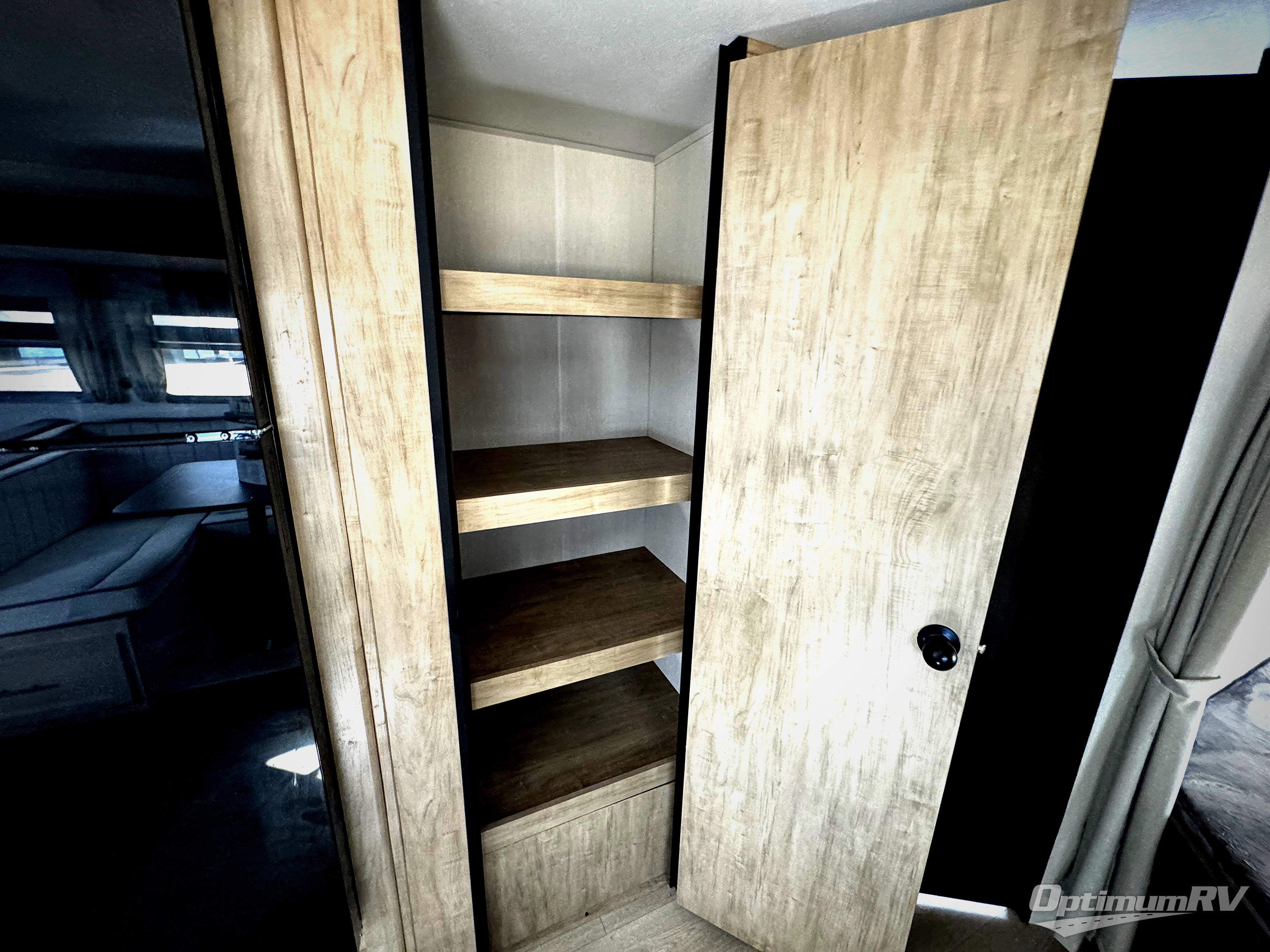 Come on inside this Cherokee Grey Wolf travel trailer and experience the convenience of a smooth flow of traffic in and out with two entry doors. The rear door leads into a full bath which is great for accessibility. Once inside, you will notice the large U-shaped dinette and the sofa which sit on the slide and create a spacious footprint for moving about, as well as great places to play games and socialize with your friends and family. A walk-in pantry provides plenty of storage allowing you to stock up on your favorite snacks and dry goods for your family adventure. At night, there is sleeping space for everyone between the double-size bunks and the RV king bed, plus the furniture.