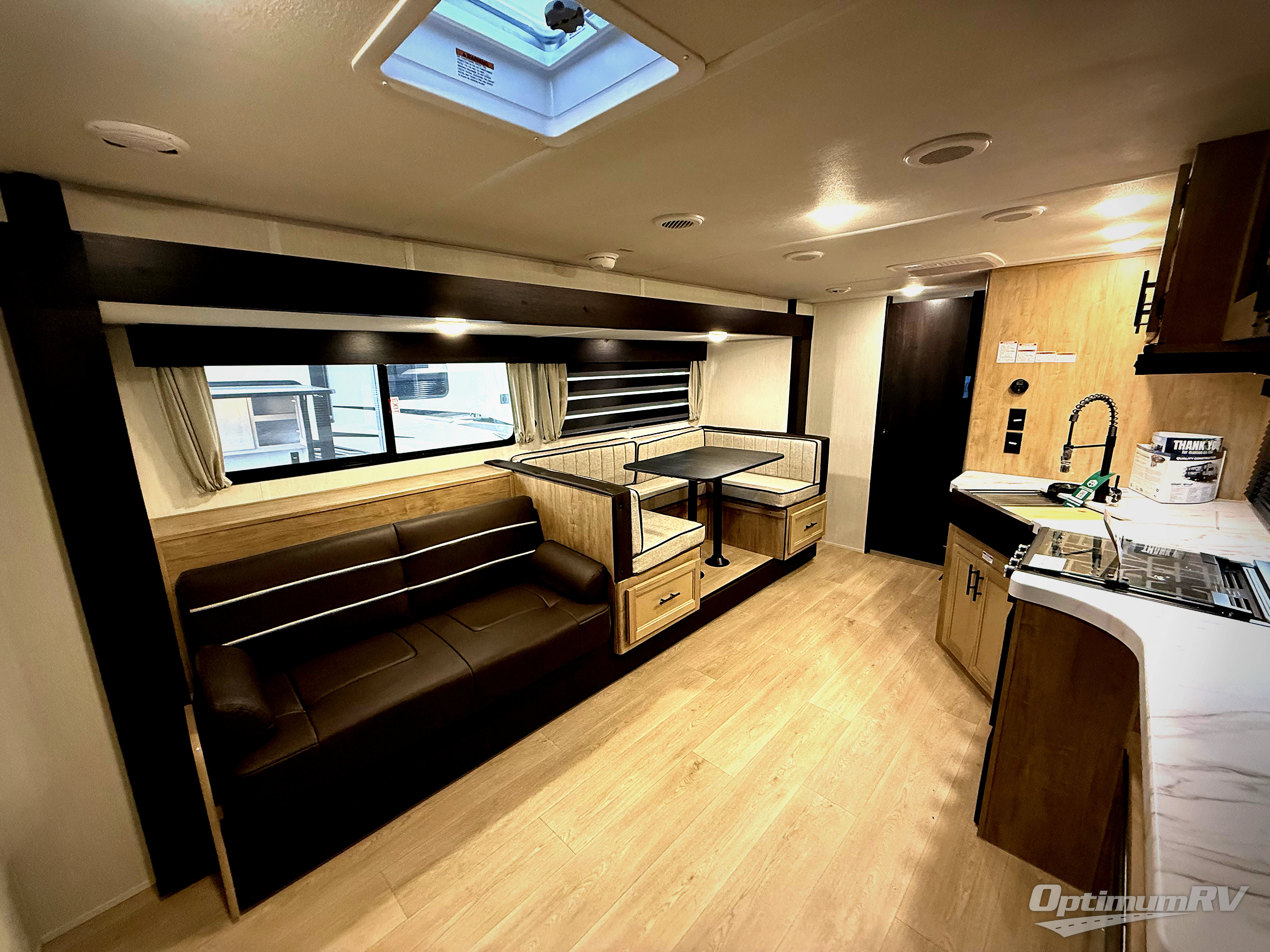 You and your spouse will have a fun time camping in this travel trailer! You will find all of the comforts you need with plenty of livable space including a U-shaped dinette slide. There is also a sofa for more seating when company arrives with a shelf above for your books. The spacious full rear bathroom has a shower with a skylight for more head room and natural lighting. You will find ample storage for clothing in the wardrobe beside the RV king bed in the front private bedroom. There is even an outside kitchen protected by the 15' awning!