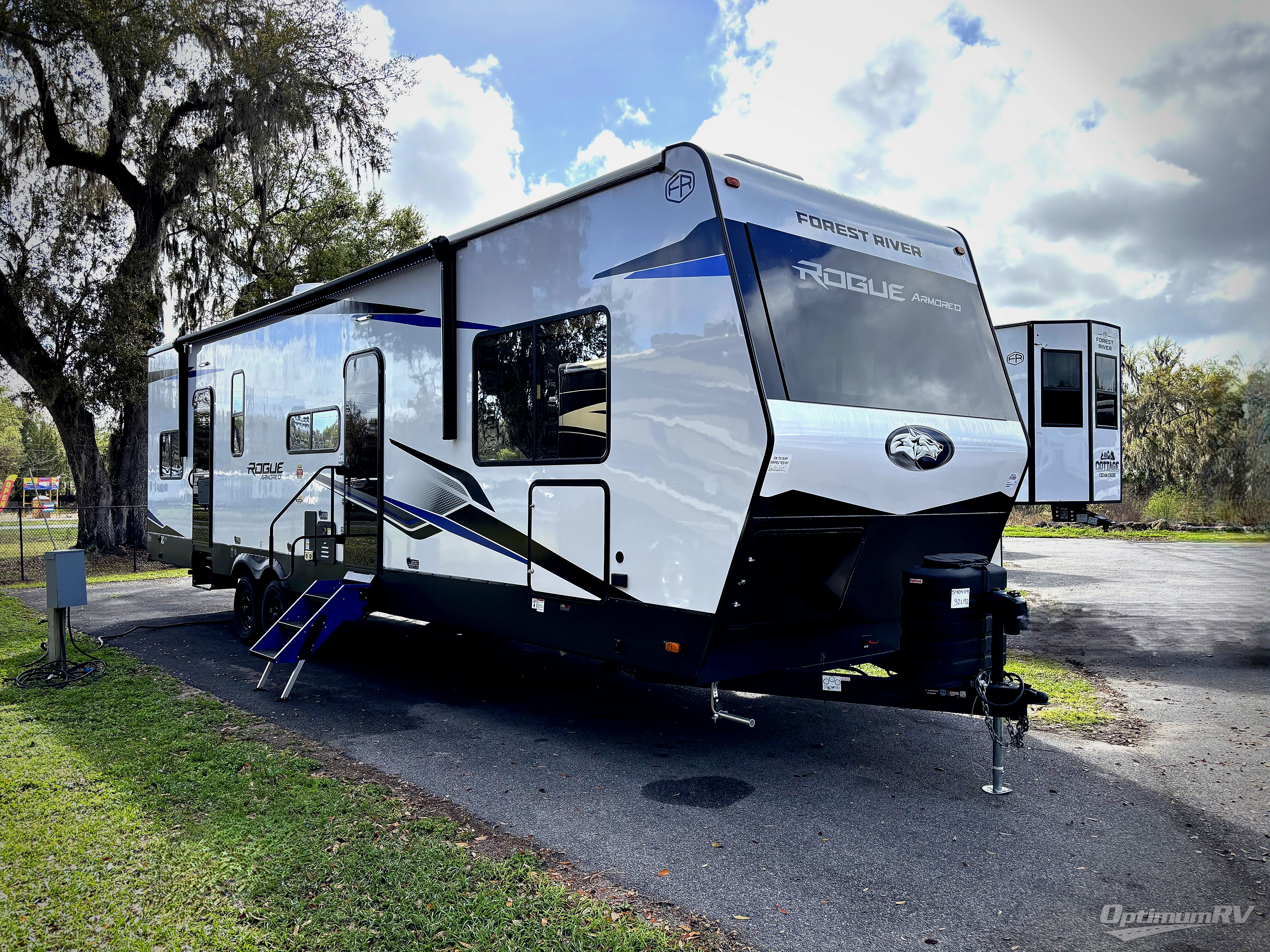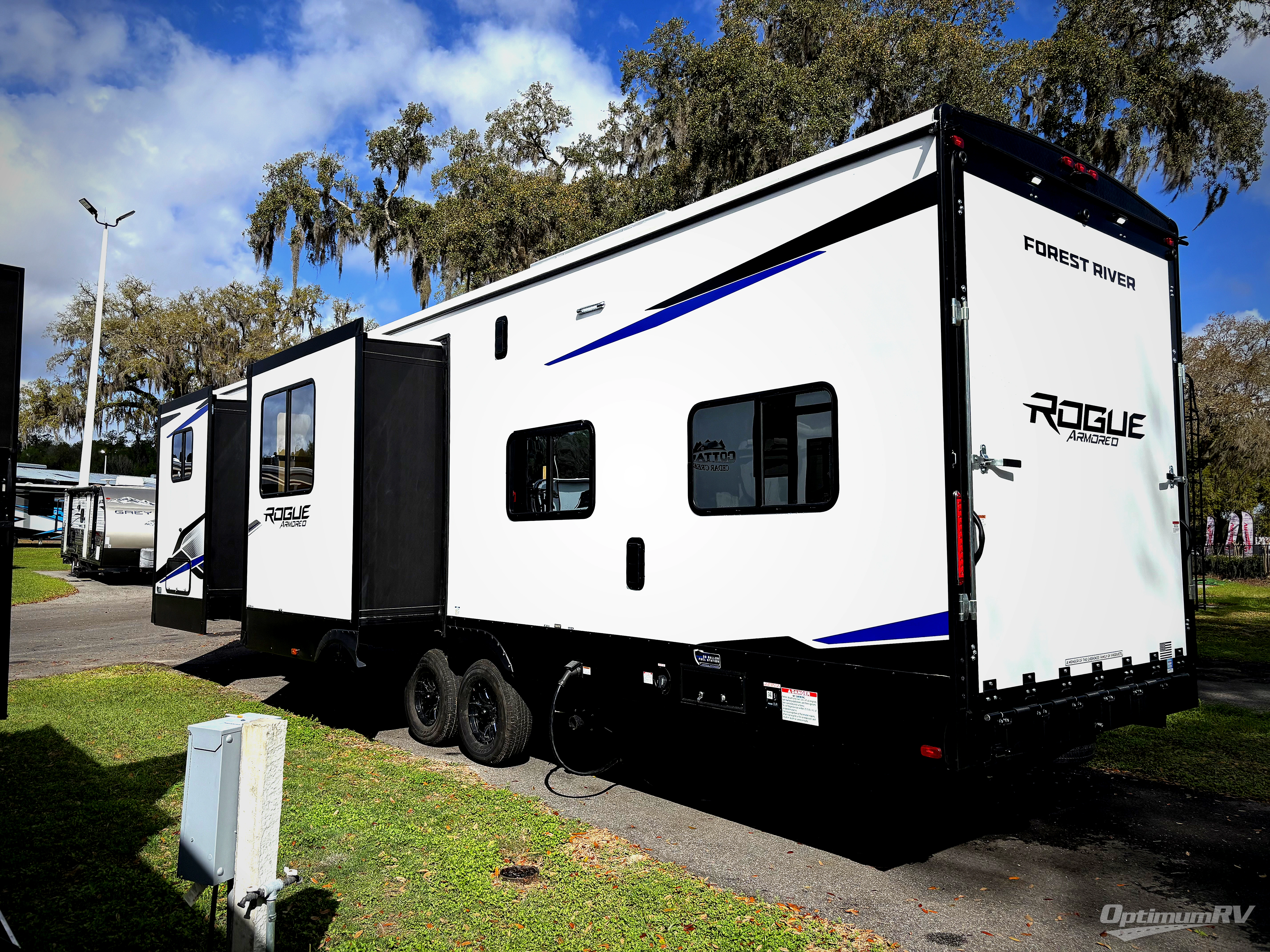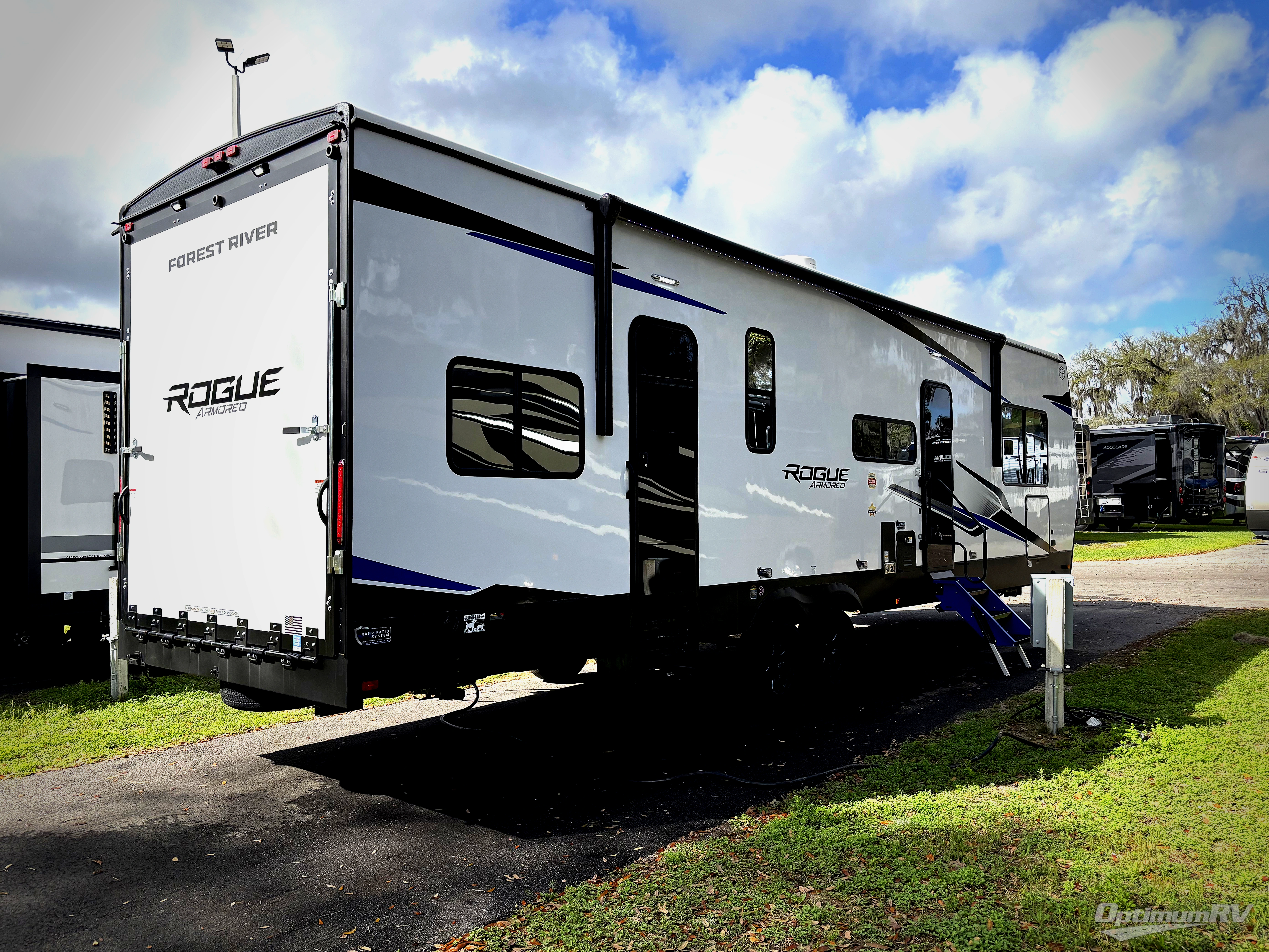 Every one of these Forest River Cherokee Rogue Armored travel trailer toy haulers come with the features you want most at an affordable price tag! The DuraPoxy gas/oil resistant floor has 5,000 lb. tie downs to ensure your toys will arrive safely without damaging the flooring, plus the 3,000 lb. rated ramp door makes it easy to load them. A 15,000 BTU A/C will keep you cool even on the hottest summer days, and there are heated enclosed holding tanks with 12V heat pads on every tank for added protection. Each model includes a fuel station with a digital readout, a ramp door patio system, a tire pressure monitoring system, and many more stand-out features. Inside, you'll find zebra shades in the living room, multiple USB charging stations, a multi-functional kitchen sink, glass shower doors, and many more comforts!