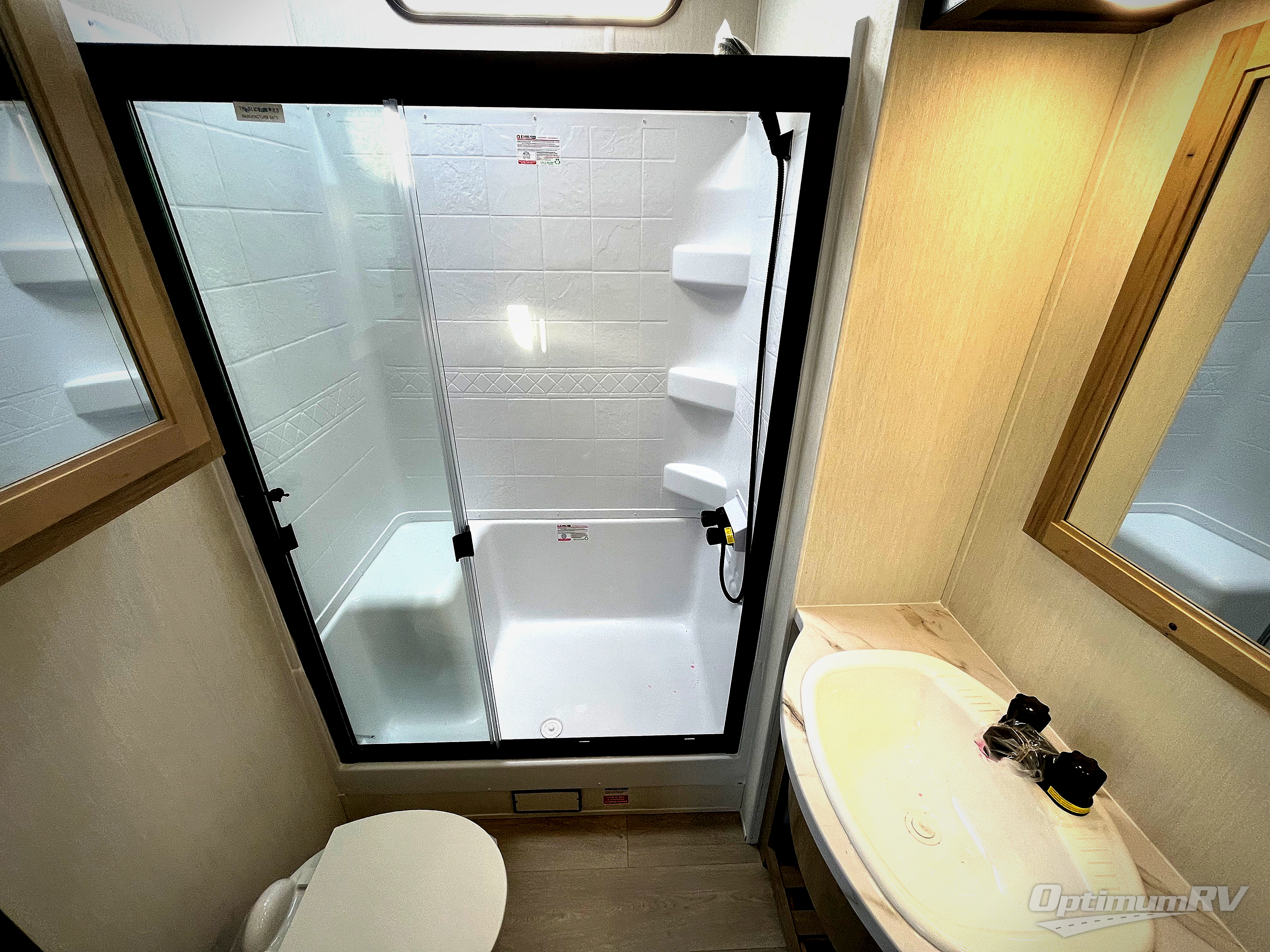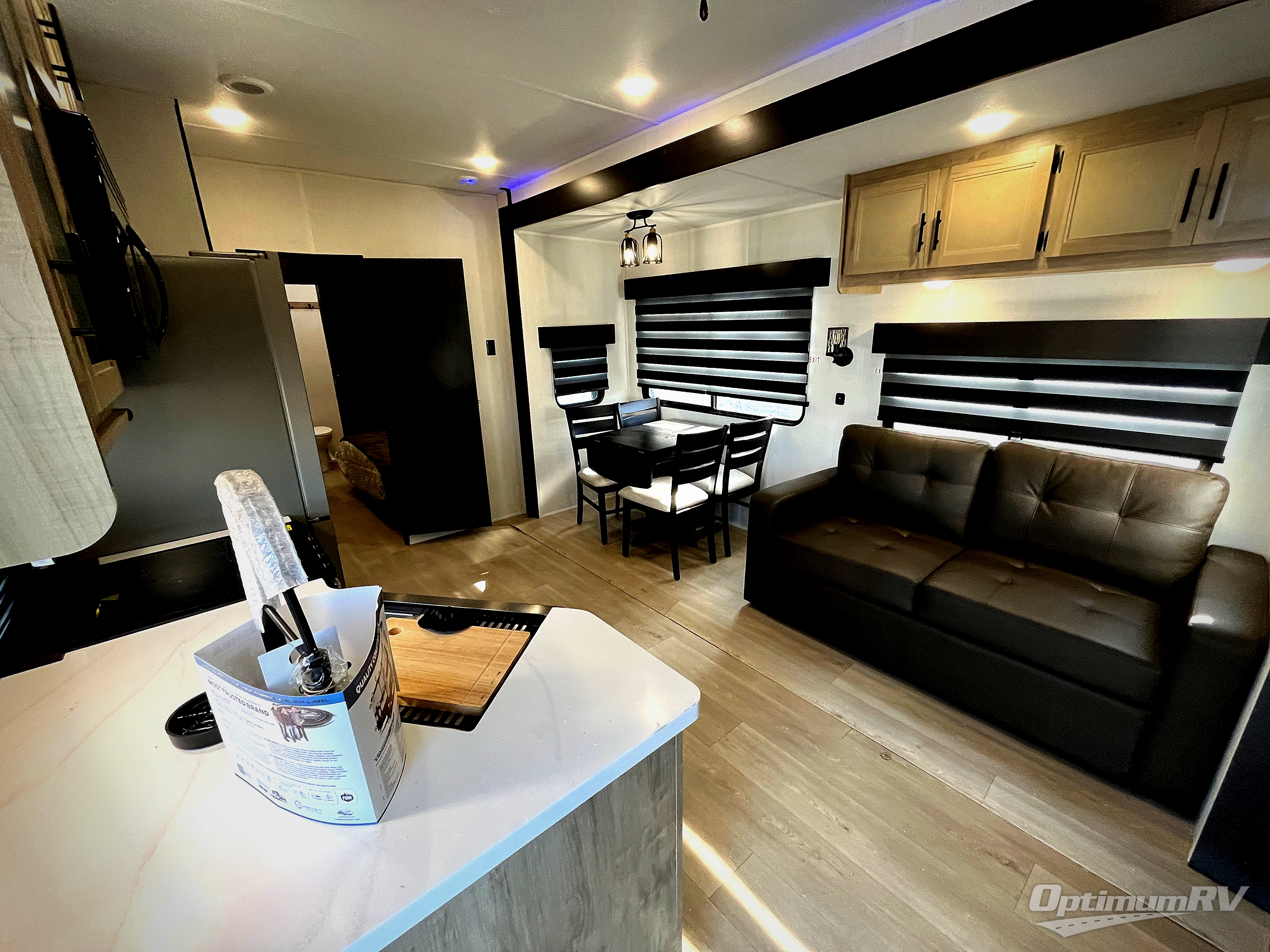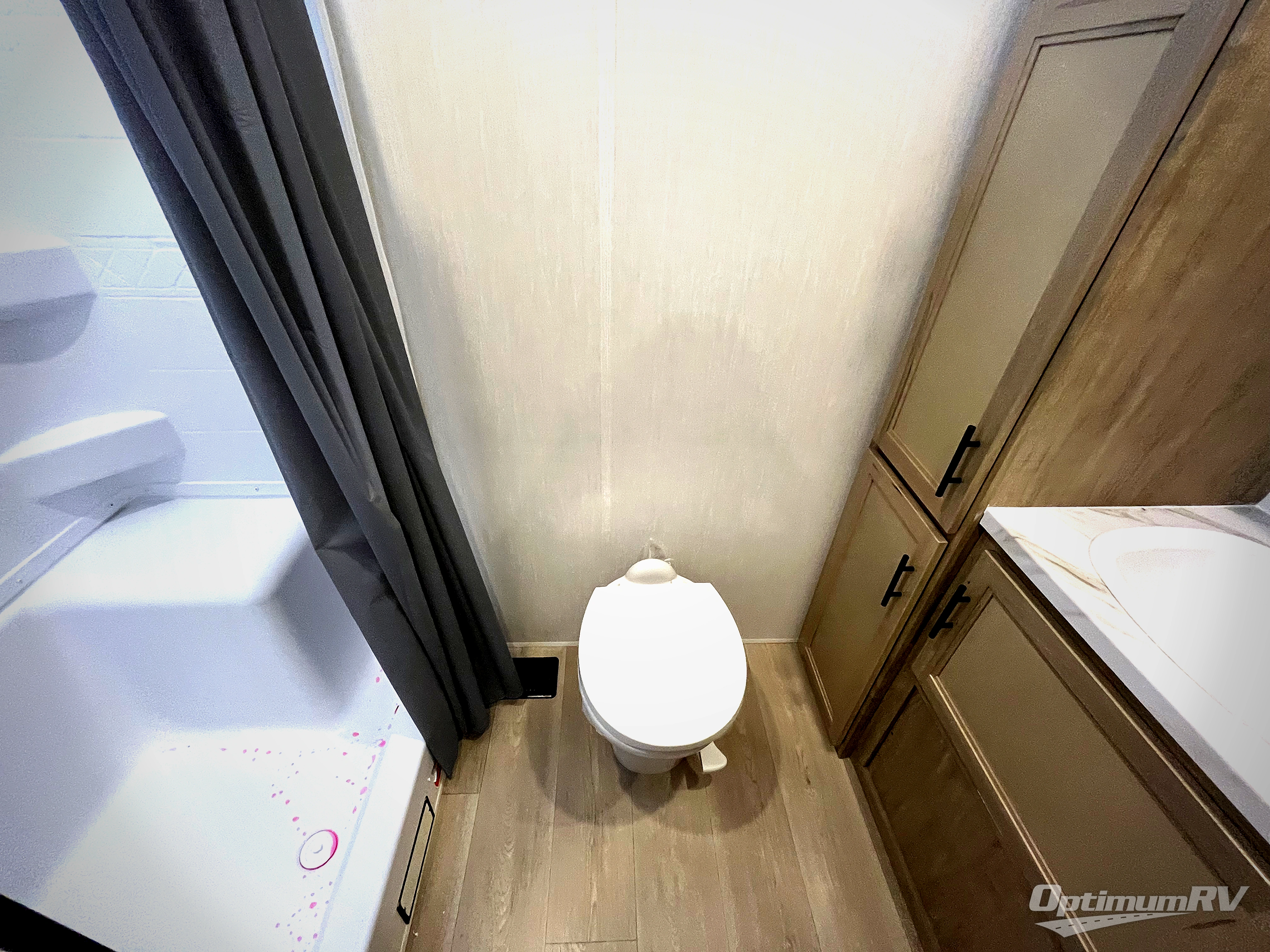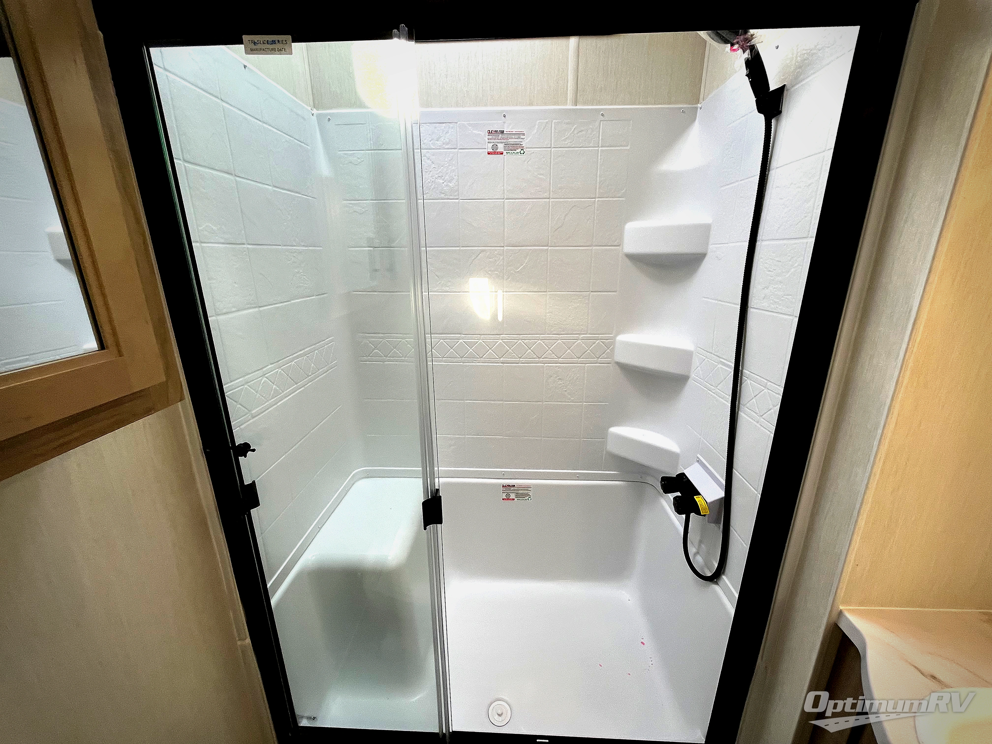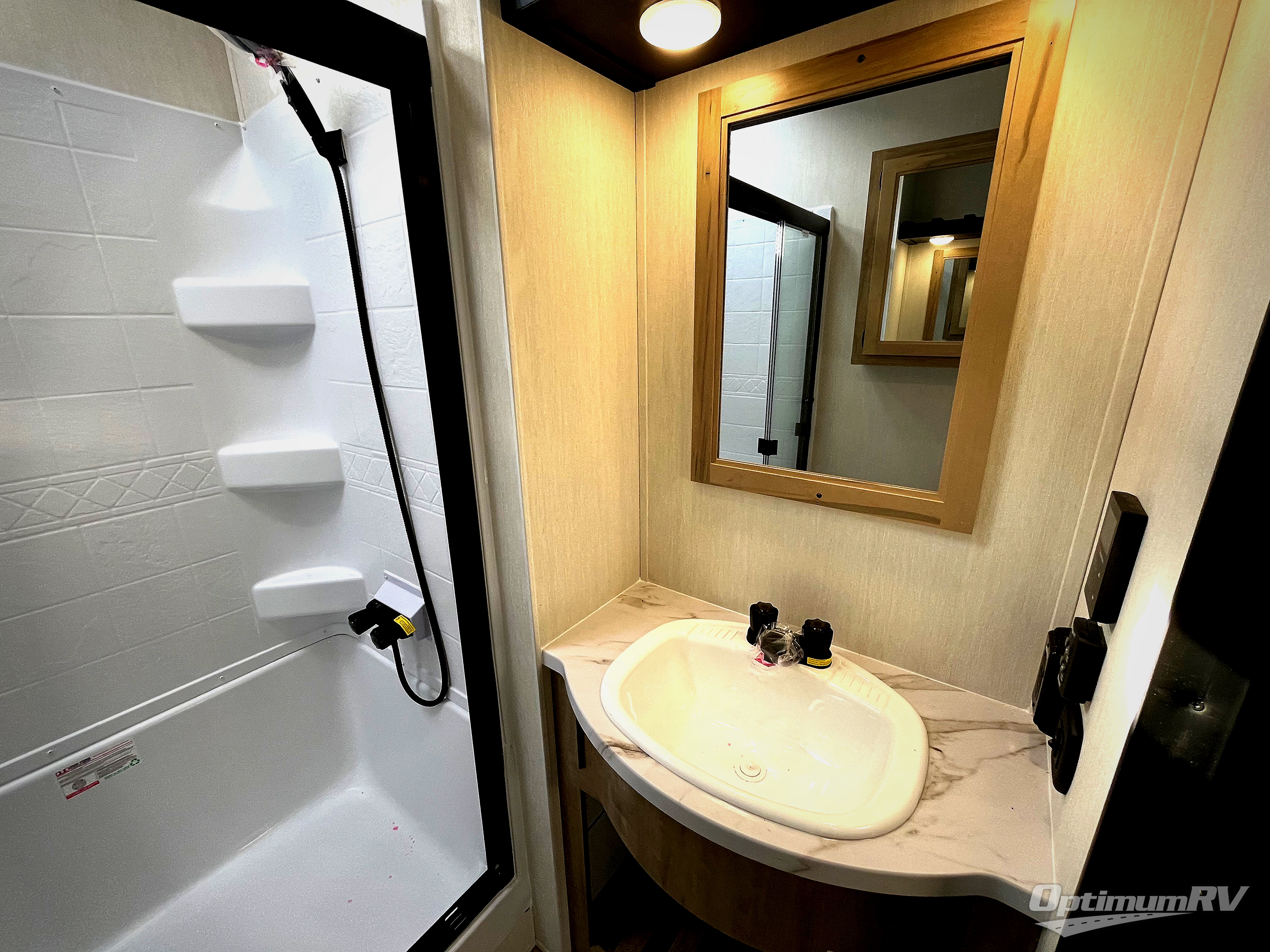 Spacious and comfortable is how you will describe this destination travel trailer featuring triple slides, two full baths, and a spacious combined kitchen and living area thanks to the large slide here featuring a free standing dinette and sofa. The kitchen includes everything you need to comfortably cook while you are away, and allows you to make meals for your family just like at home. There is a large pantry where you can keep plenty of snacks and dry goods for your trip. In the rear of the coach, there is a private bedroom featuring a queen bed slide for added space, comfortable sleeping, as well as ample storage between a dresser and wardrobe for your clothing. In the very back, a master suite bath featuring a vanity with sink, a shower with a seat, and linen storage for your towels and toiletries. This front bedroom also features a king bed slide!