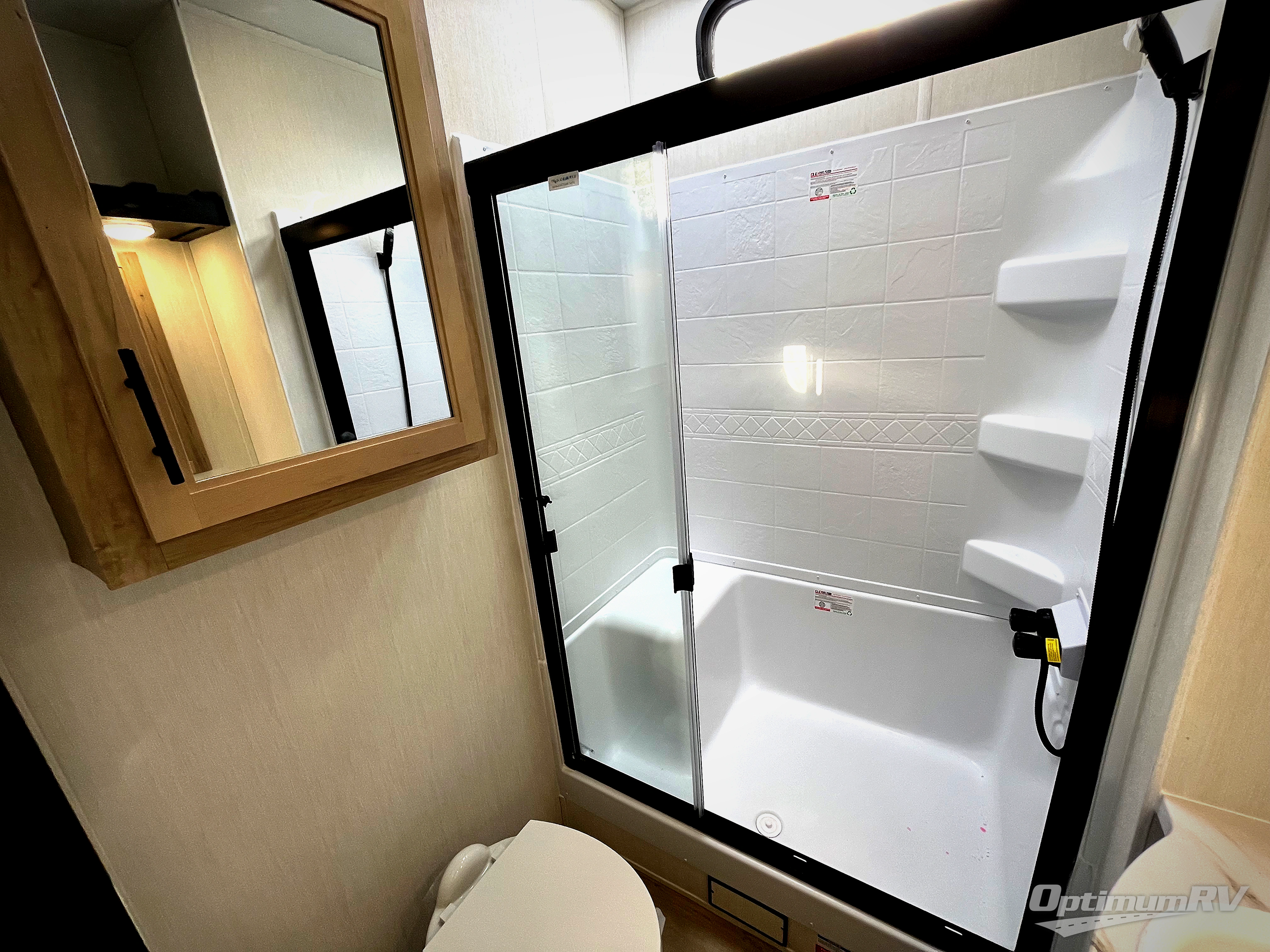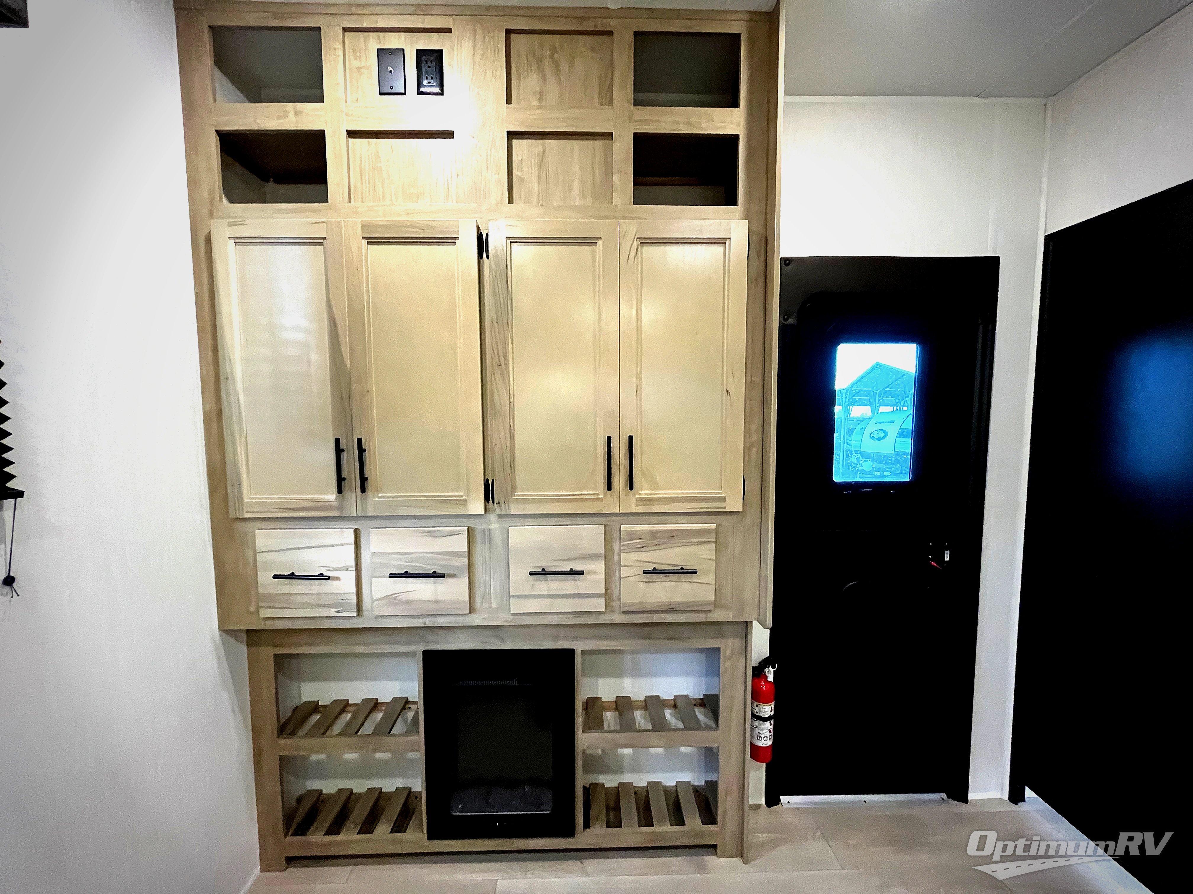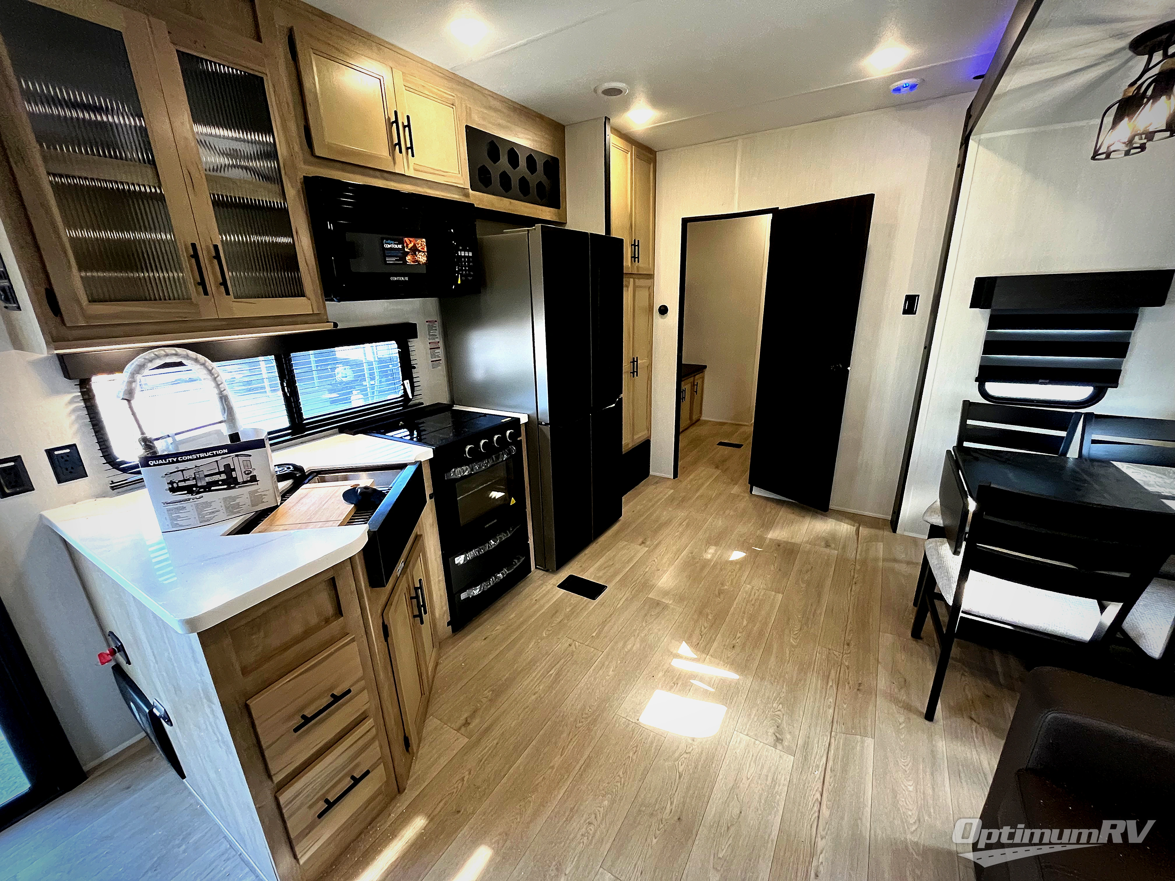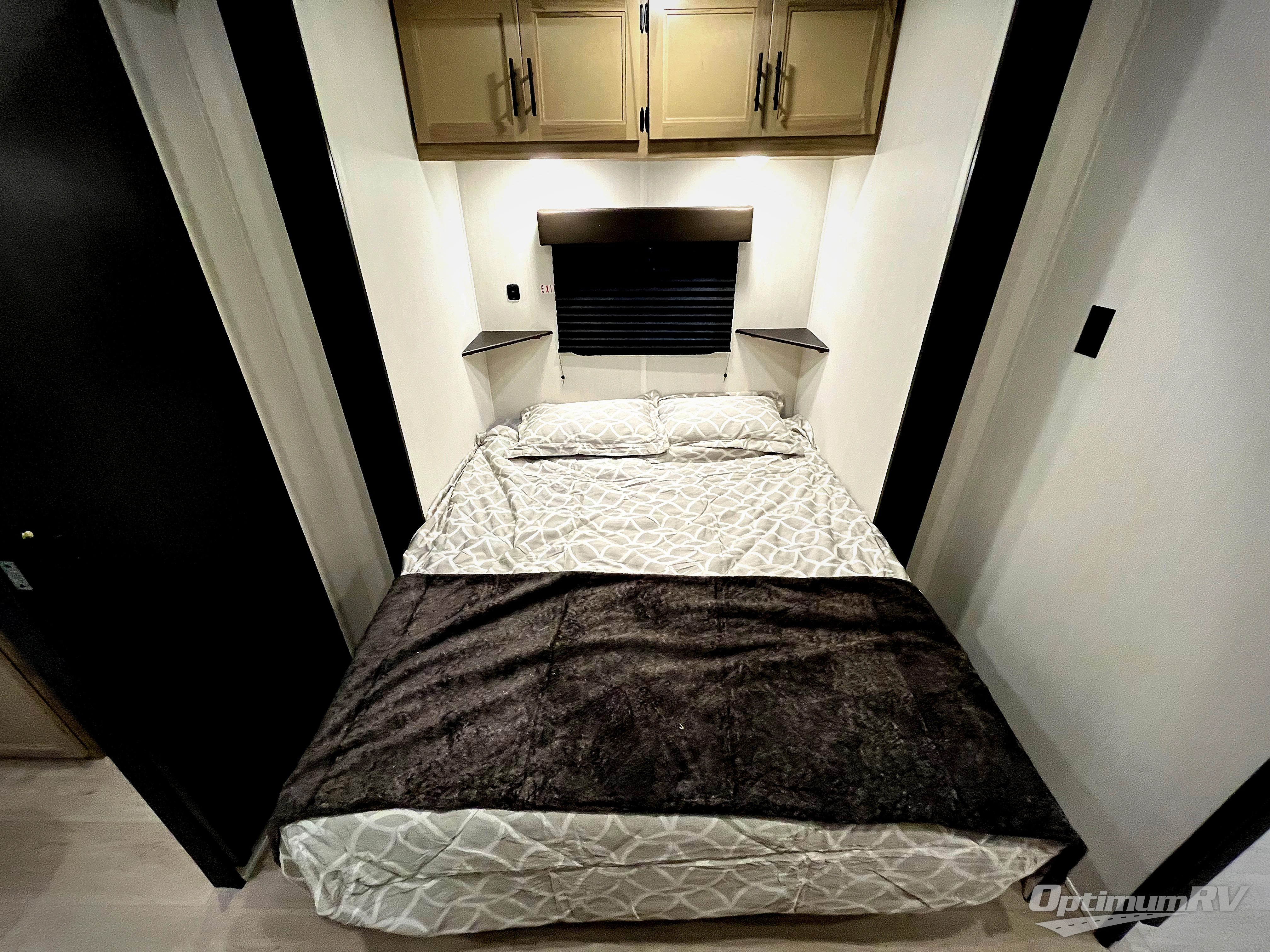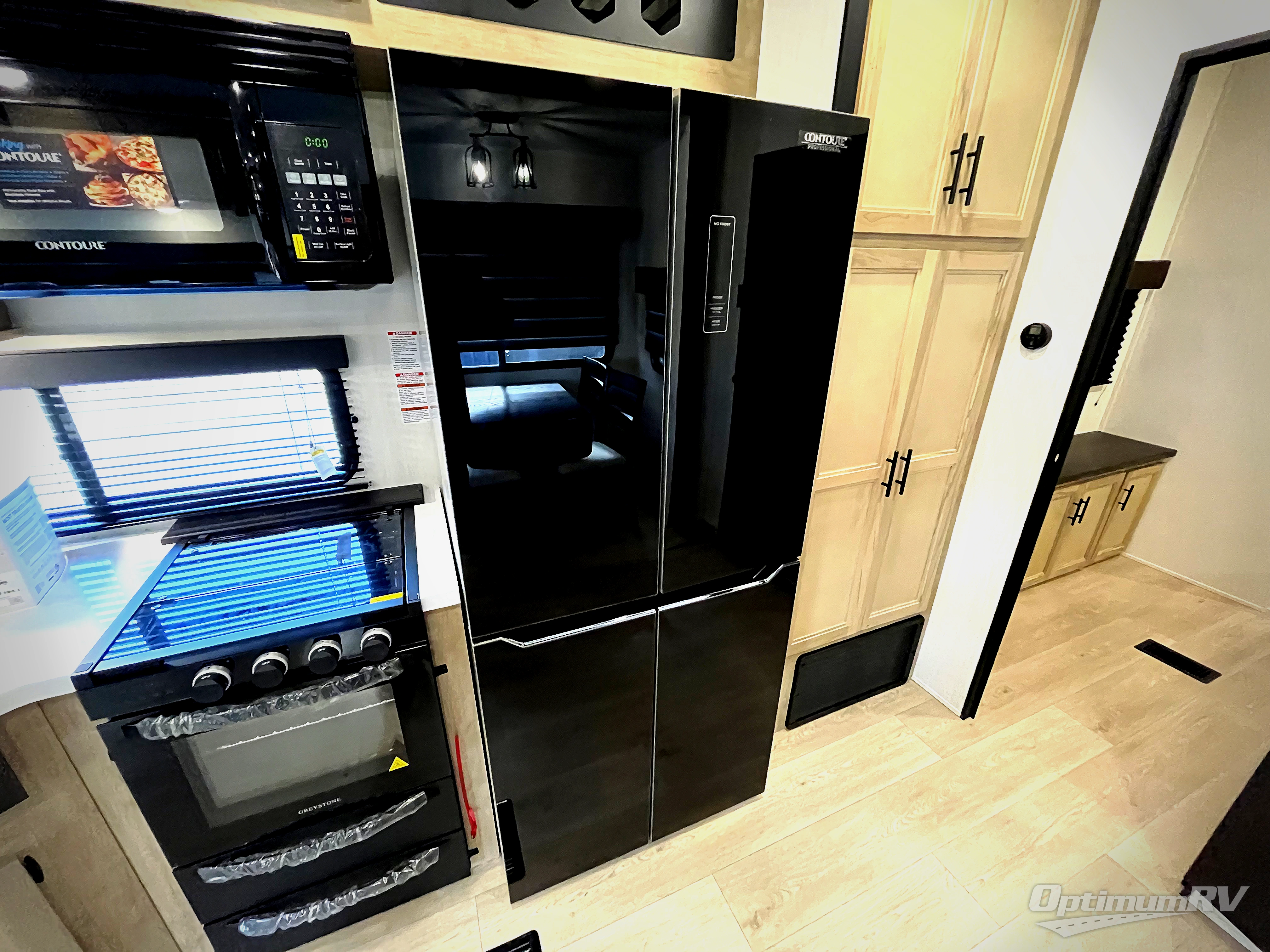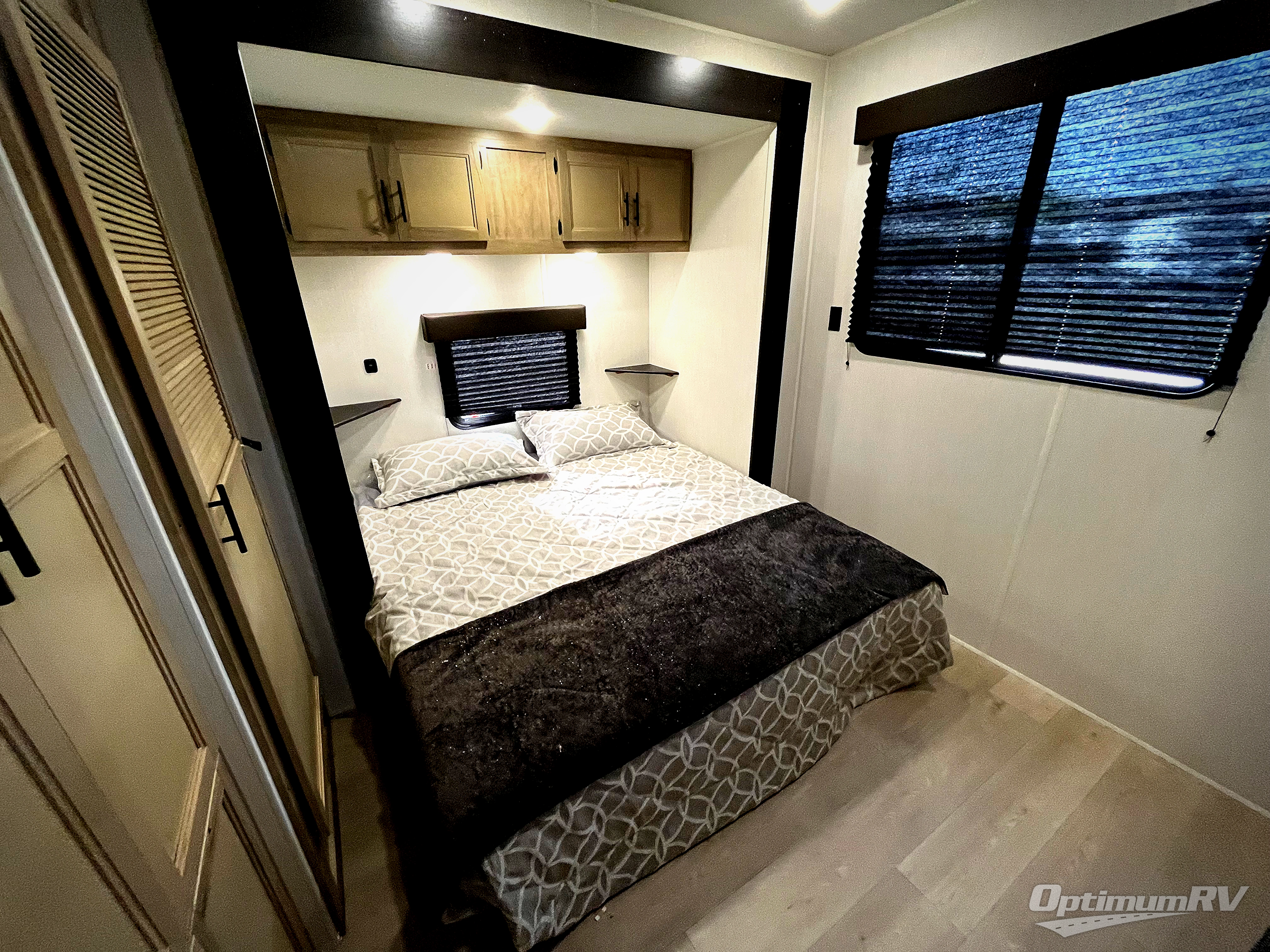 Spacious and comfortable is how you will describe this destination travel trailer featuring triple slides, two full baths, and a spacious combined kitchen and living area thanks to the large slide here featuring a free standing dinette and sofa. The kitchen includes everything you need to comfortably cook while you are away, and allows you to make meals for your family just like at home. There is a large pantry where you can keep plenty of snacks and dry goods for your trip. In the rear of the coach, there is a private bedroom featuring a queen bed slide for added space, comfortable sleeping, as well as ample storage between a dresser and wardrobe for your clothing. In the very back, a master suite bath featuring a vanity with sink, a shower with a seat, and linen storage for your towels and toiletries. This front bedroom also features a king bed slide!