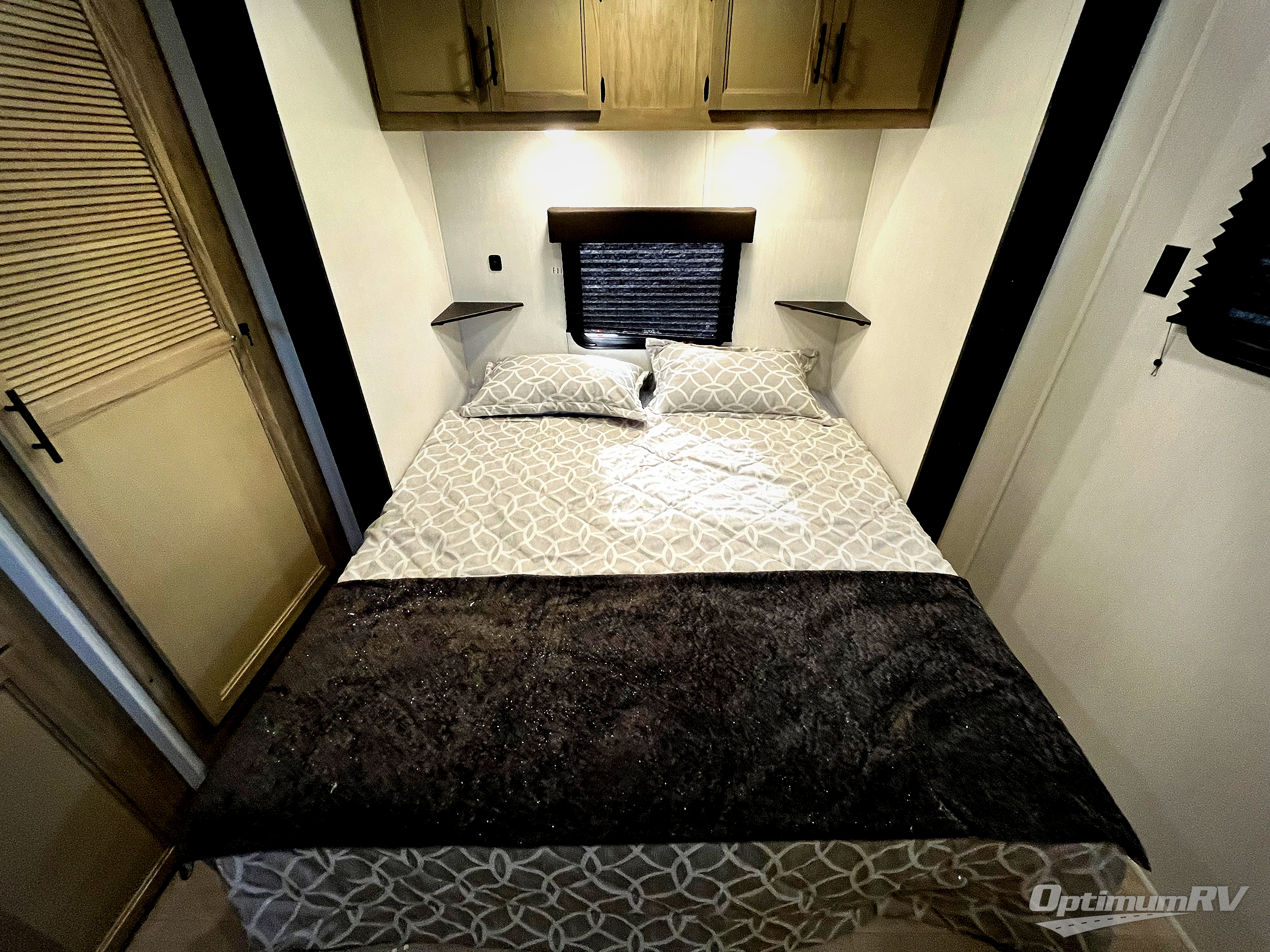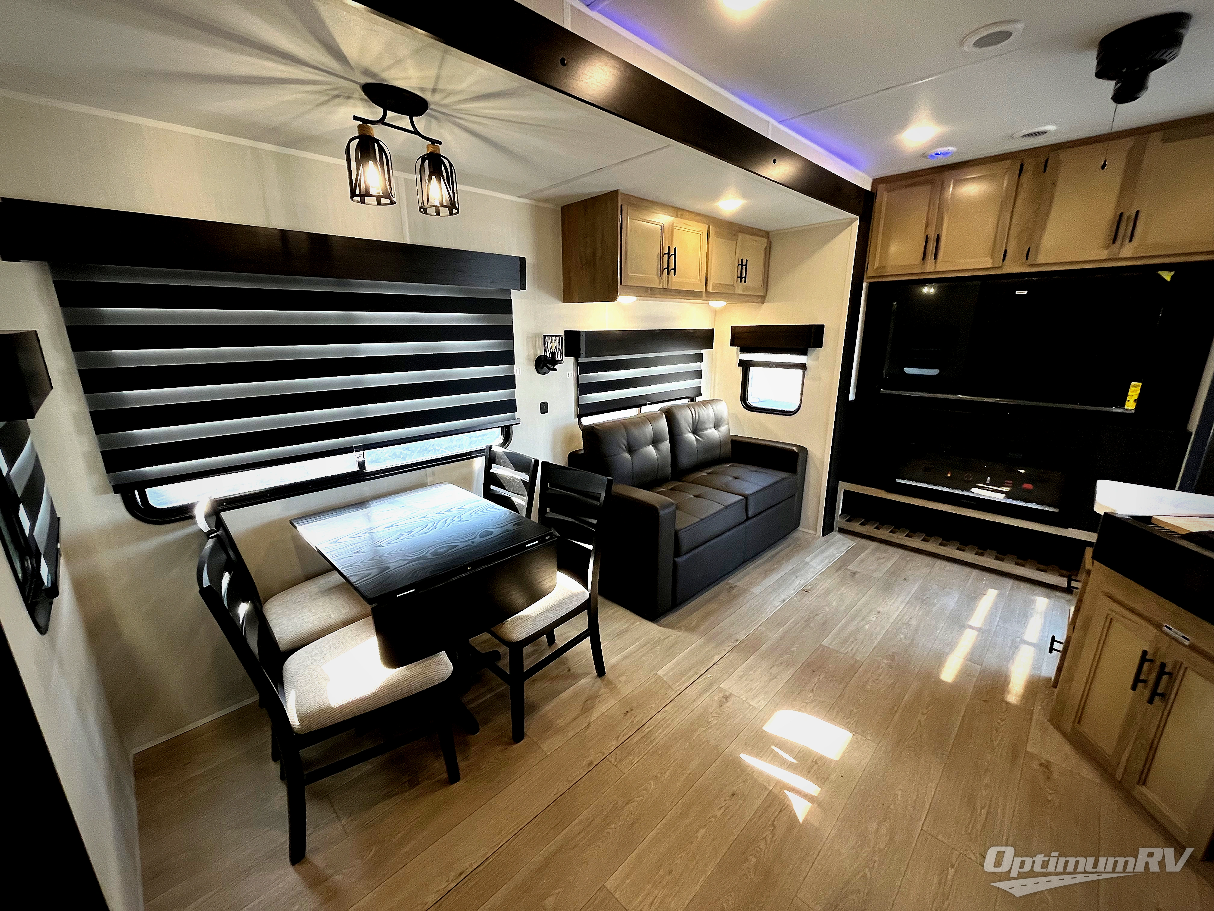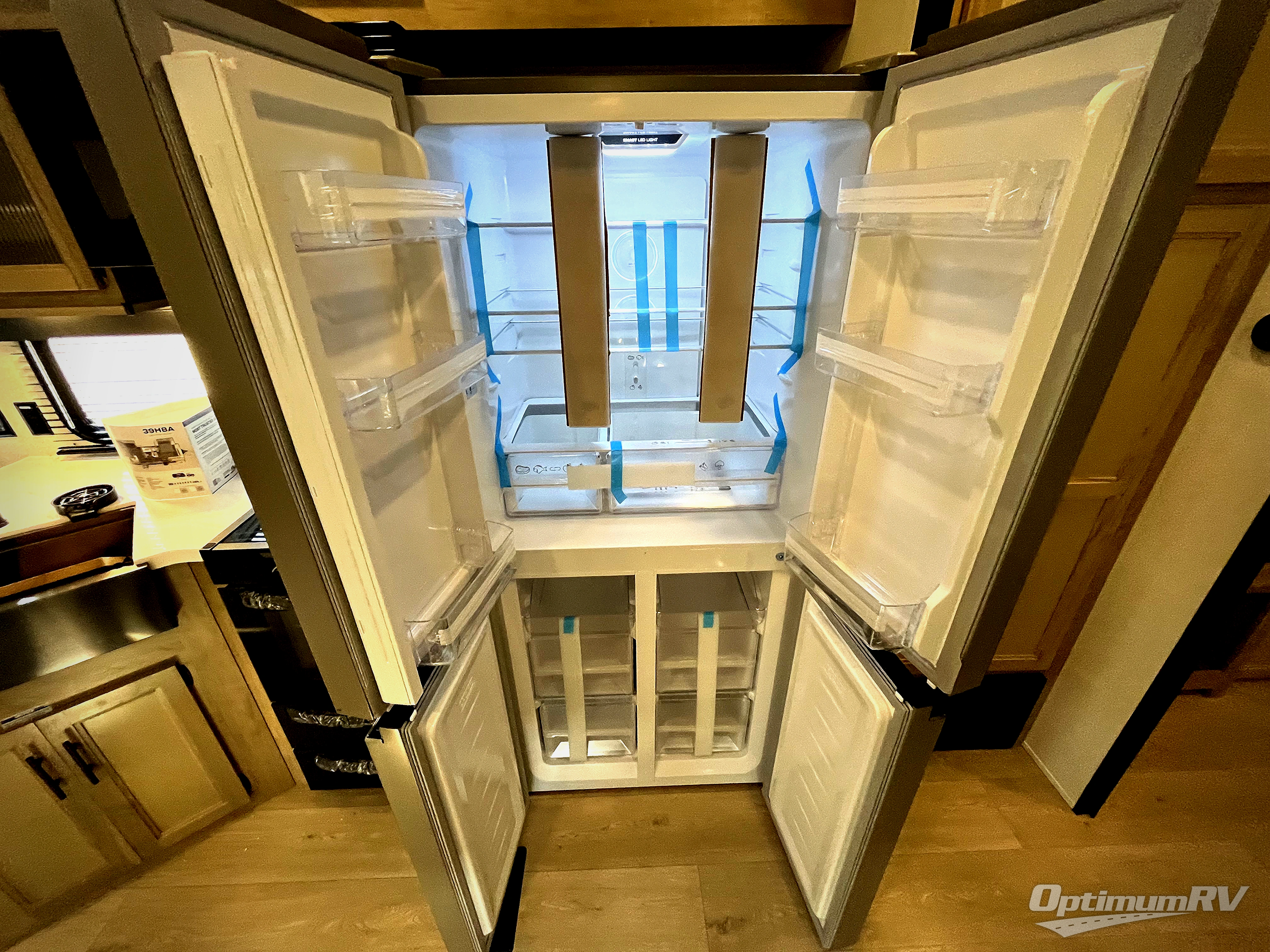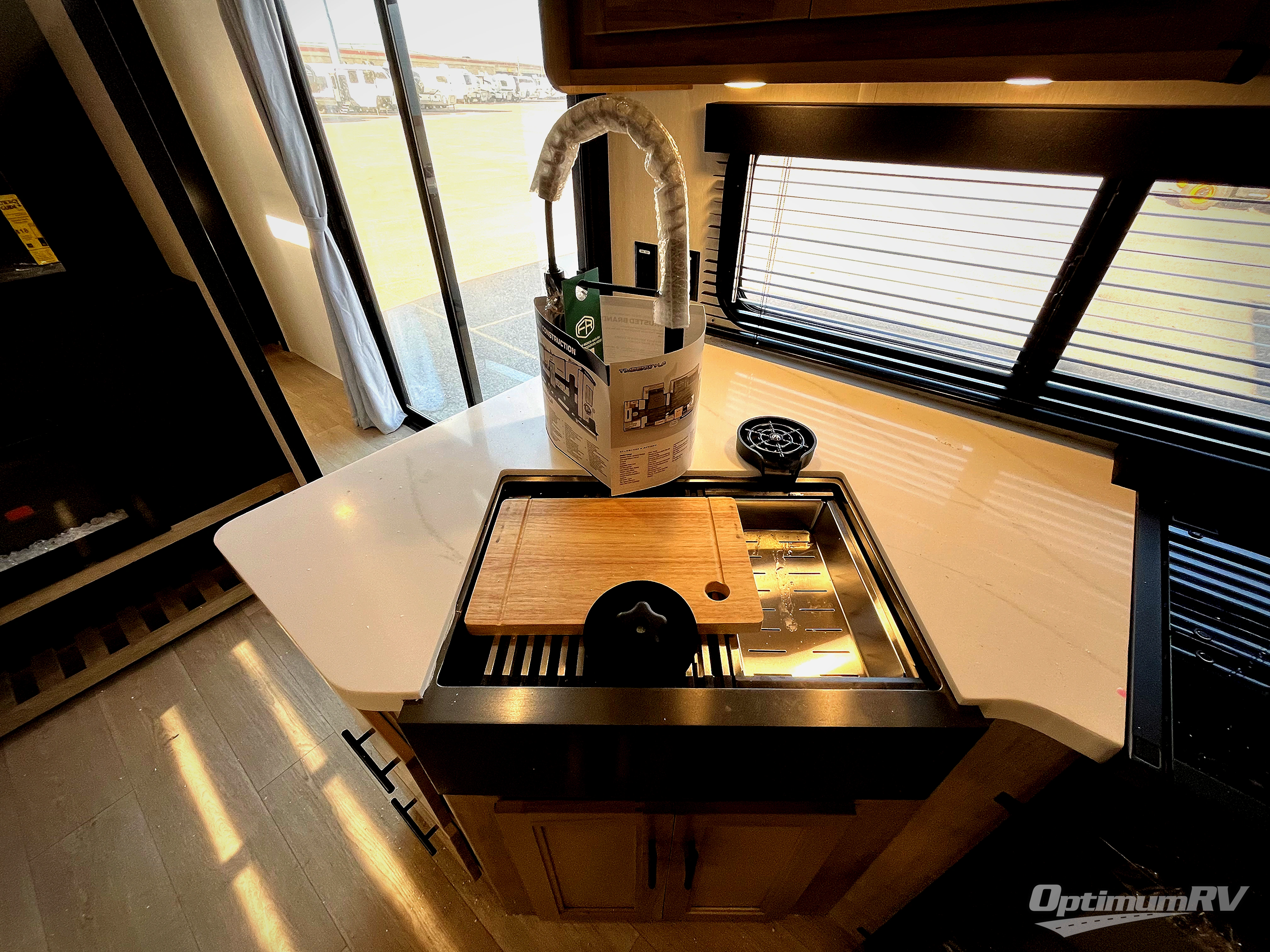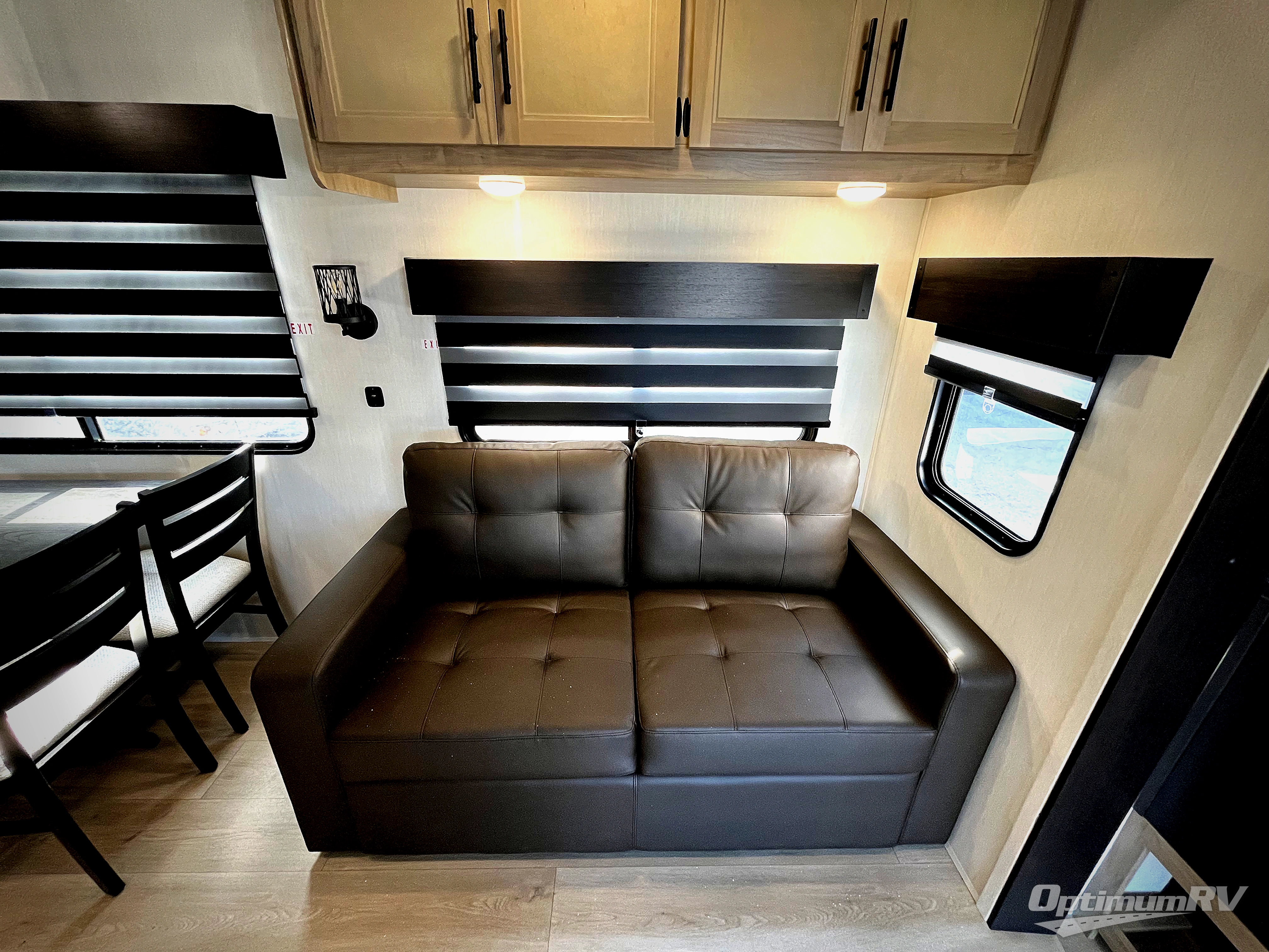 Spacious and comfortable is how you will describe this destination travel trailer featuring triple slides, two full baths, and a spacious combined kitchen and living area thanks to the large slide here featuring a free standing dinette and sofa. The kitchen includes everything you need to comfortably cook while you are away, and allows you to make meals for your family just like at home. There is a large pantry where you can keep plenty of snacks and dry goods for your trip. In the rear of the coach, there is a private bedroom featuring a queen bed slide for added space, comfortable sleeping, as well as ample storage between a dresser and wardrobe for your clothing. In the very back, a master suite bath featuring a vanity with sink, a shower with a seat, and linen storage for your towels and toiletries. This front bedroom also features a king bed slide!