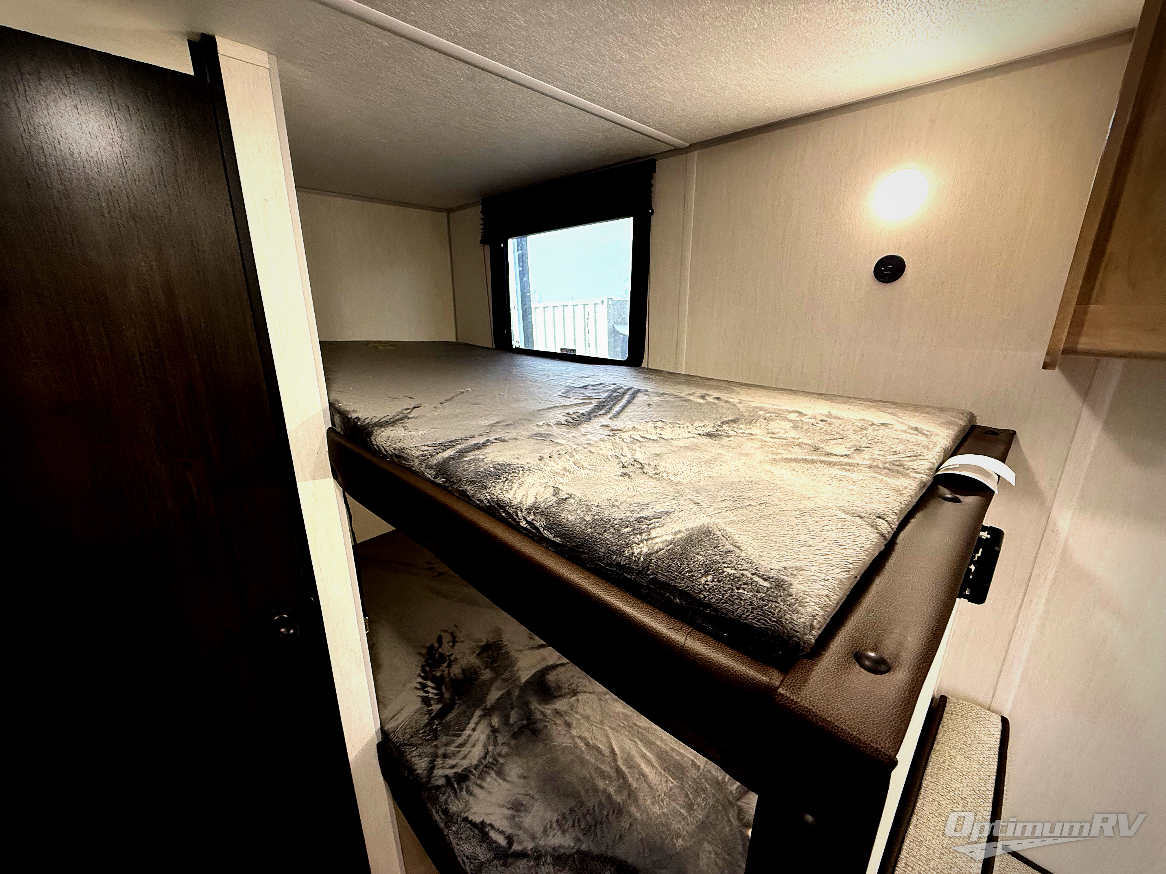 The whole family can sleep comfortably in this travel trailer! It has a set of bunk beds for the kids to sleep on, and you can sleep comfortably on the front queen bed with overhead cabinets and a shelf. There is even an exterior storage plus door that accesses the storage space under the bottom bunk. The chef will enjoy preparing their best home cooked meals either indoors with the high output cooktop or at the outside mini kitchen while staying protected by the 12' power awning!