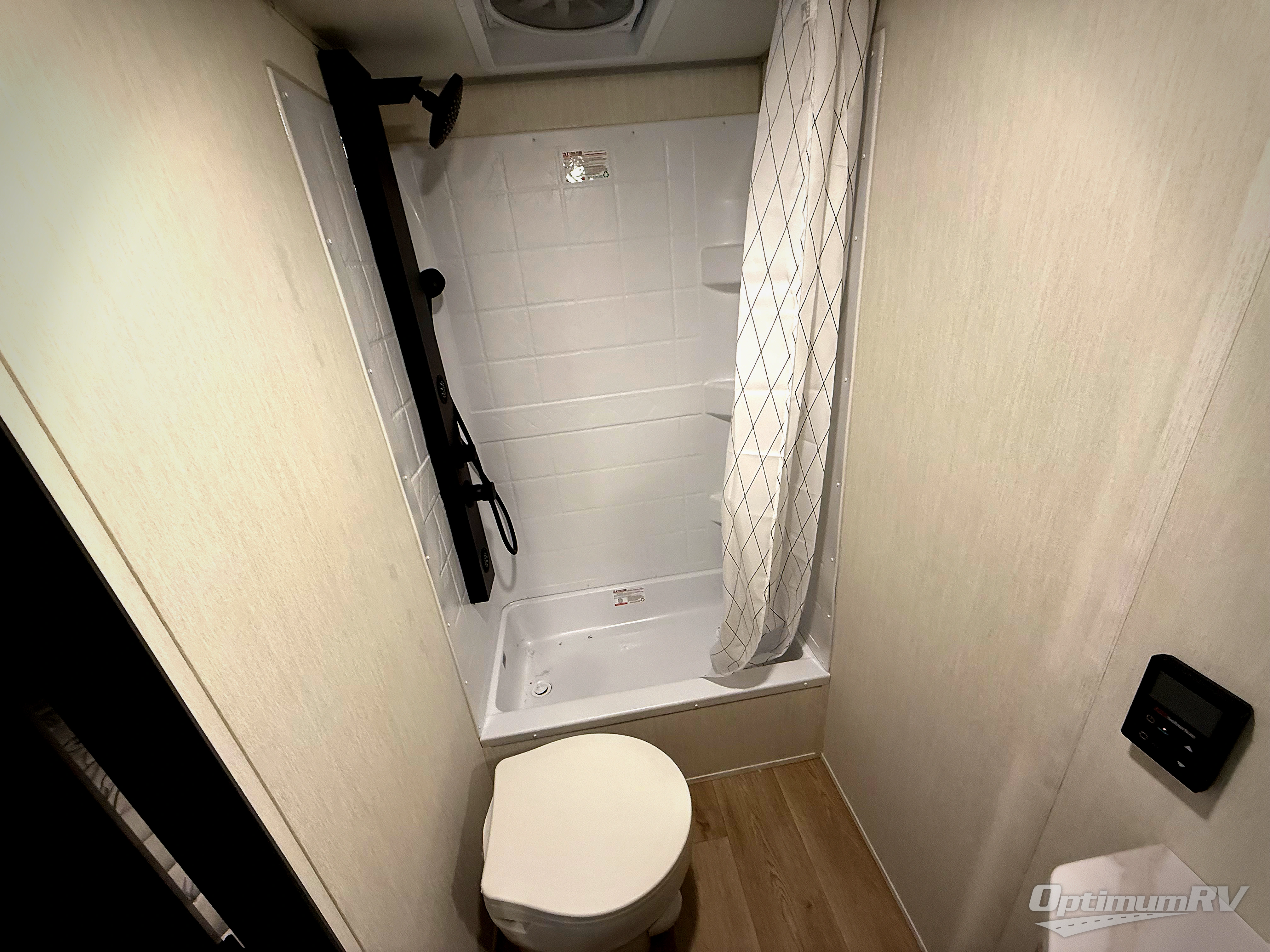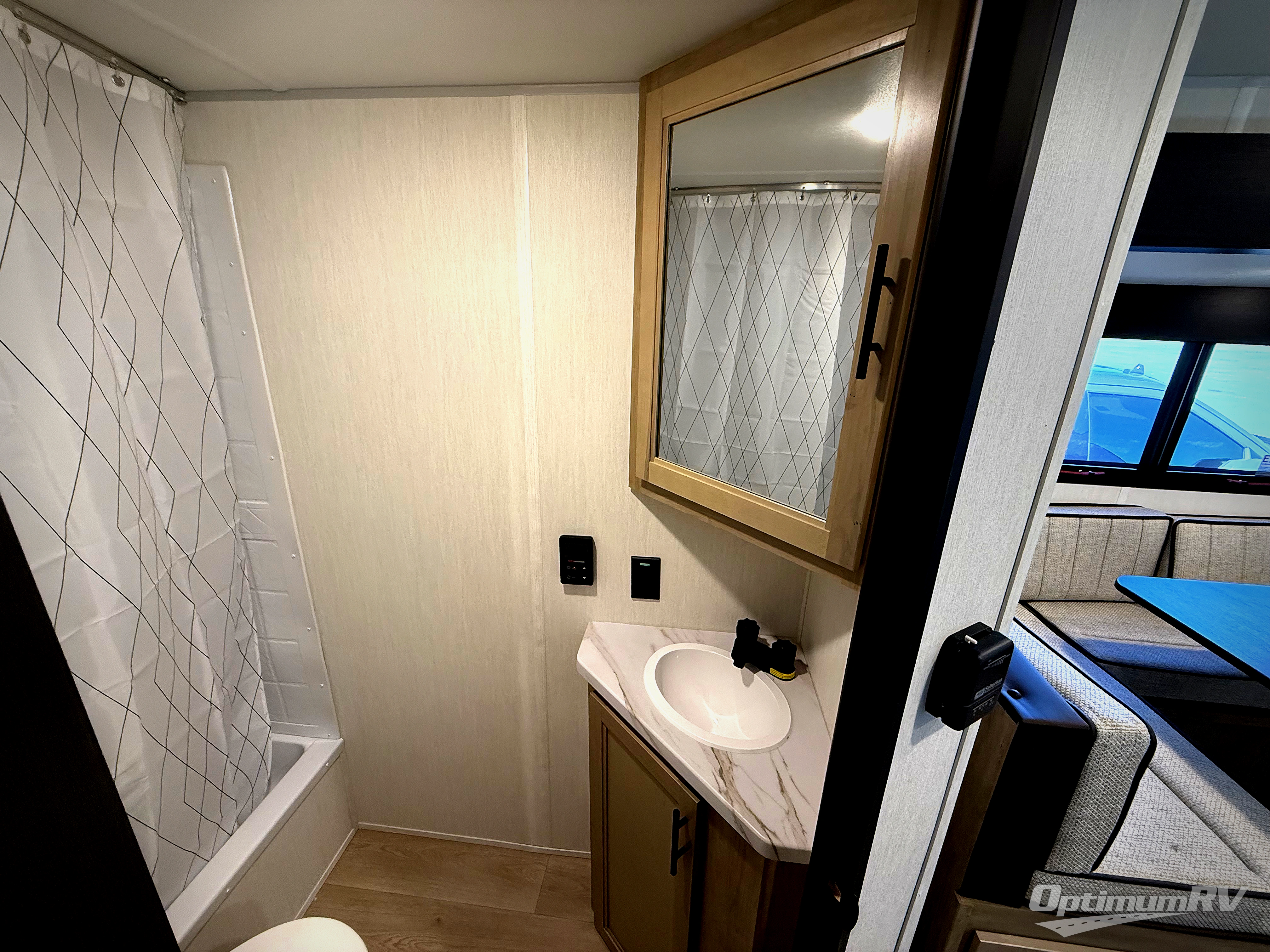 This family travel trailer is ready to head to the campground whenever you are! The kiddos can sleep on the set of double-size bed bunks, and you can sleep on the front queen bed, plus the U-shaped dinette slide can also transform into an extra sleeping space when you aren't using it to enjoy a meal. You can prepare your delicious meals on the range or at the outside mini kitchen and stay protected by the awning. The exterior not only has outside storage and an outside TV mount but also features an outside storage plus door for access to the storage space underneath the bottom bunk bed. The rear corner bath allows everyone to stay clean and refreshed while you camp.