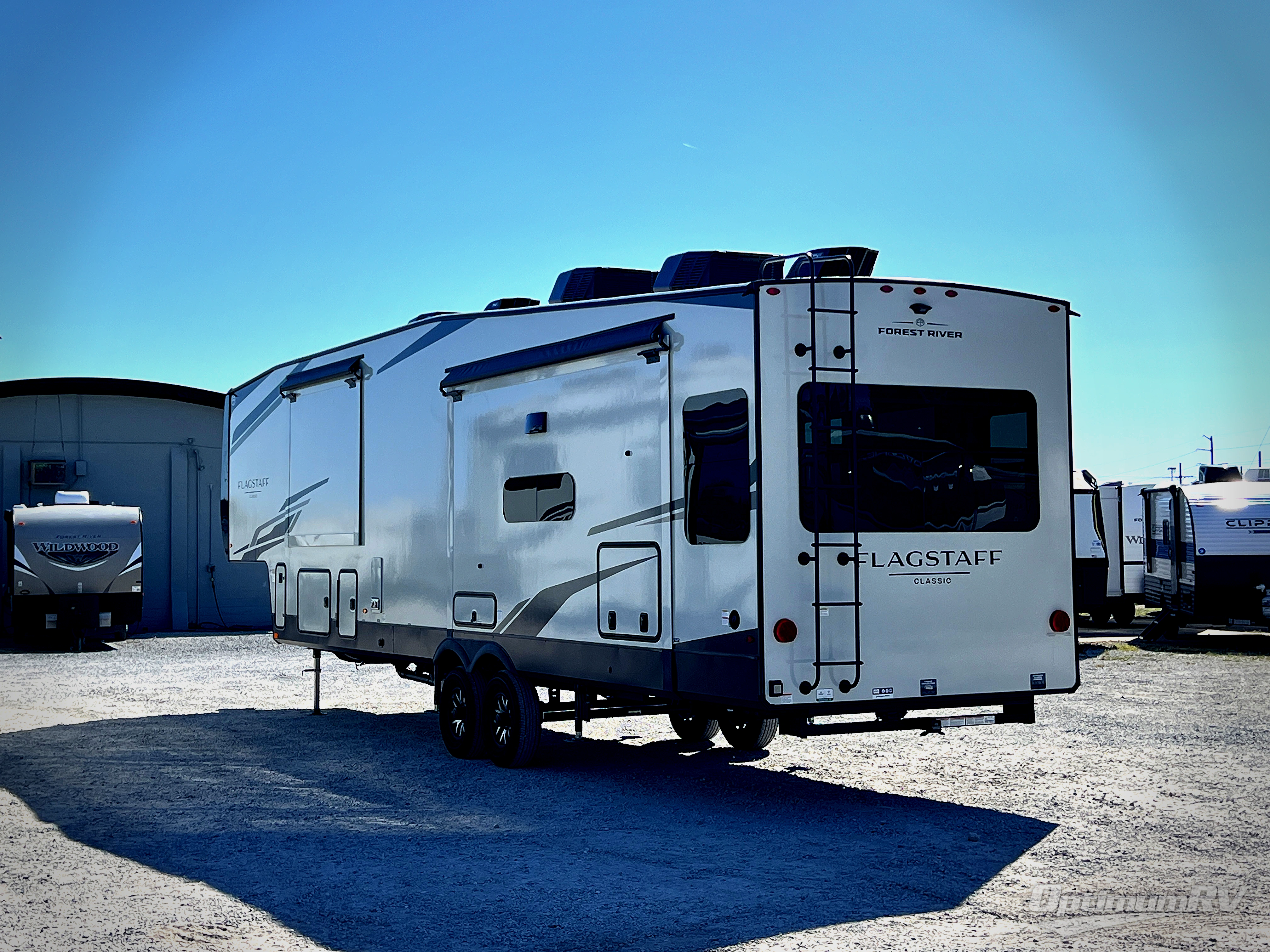 Each one of these Forest River Flagstaff Classic fifth wheels or travel trailers will be your home on wheels! Their quality craftsmanship and attention to detail shines through the enclosed underbelly, the fully laminated walkable roof, and six-sided full-aluminum frame. Towing your unit will be easy with the Goodyear Endurance tires plus RoadTech tire pressure monitoring. Additional exterior features include a 200W solar panel, slam baggage doors, a Key-Alike lock system, and double 30 lb. LP tanks to name a few conveniences. Head inside to find a residential style gas range, solid surface kitchen and bath countertops, soft close hidden cabinet hinges, and more comforts!
