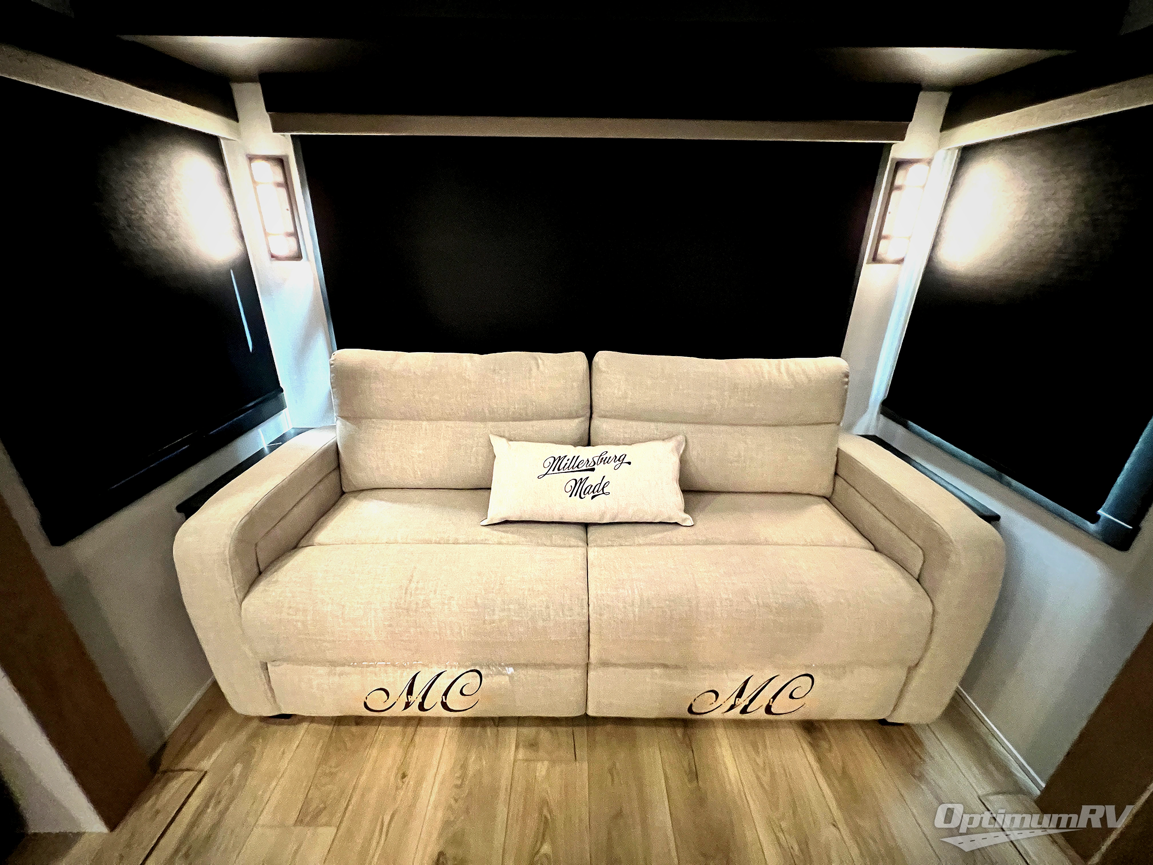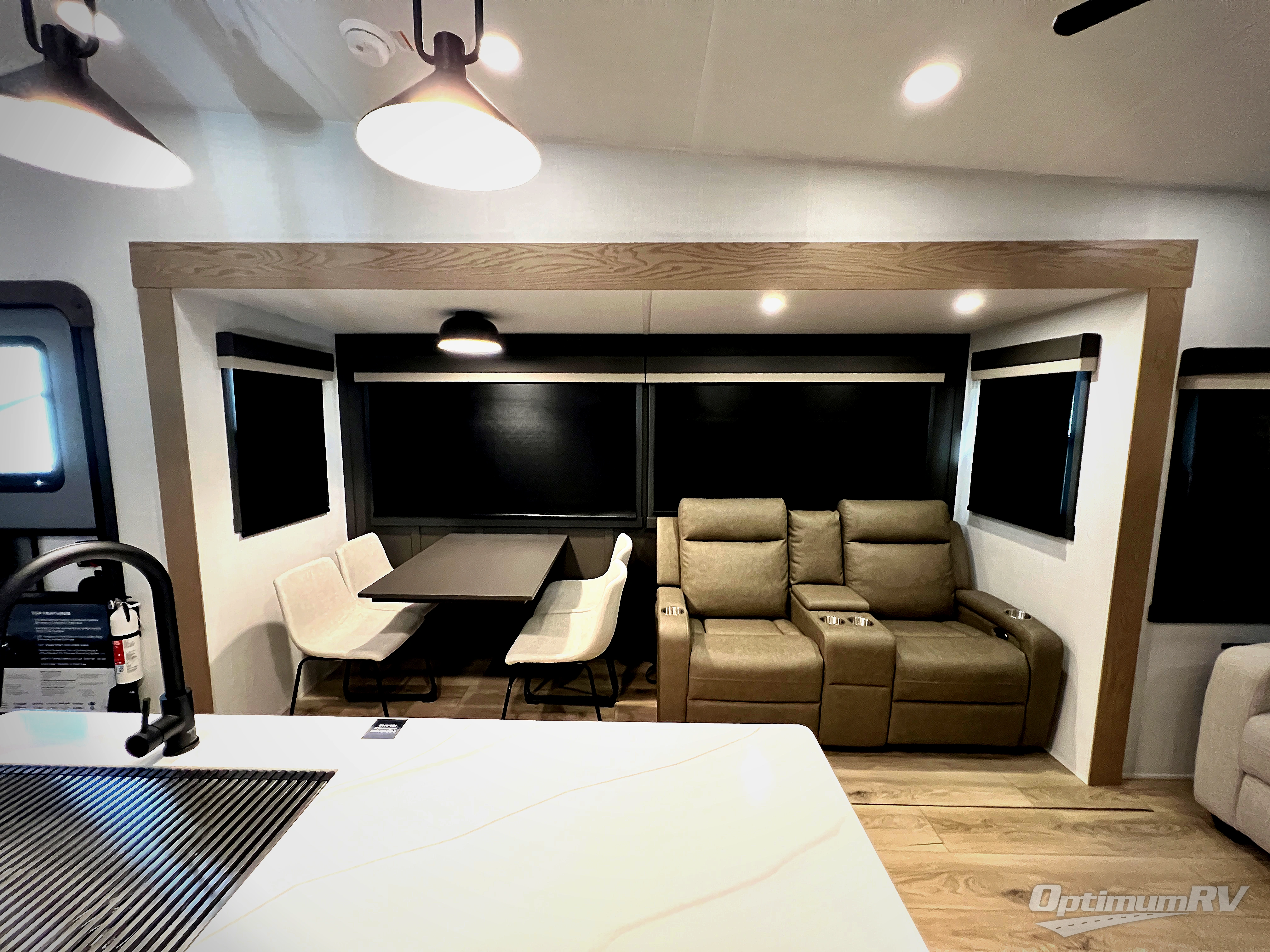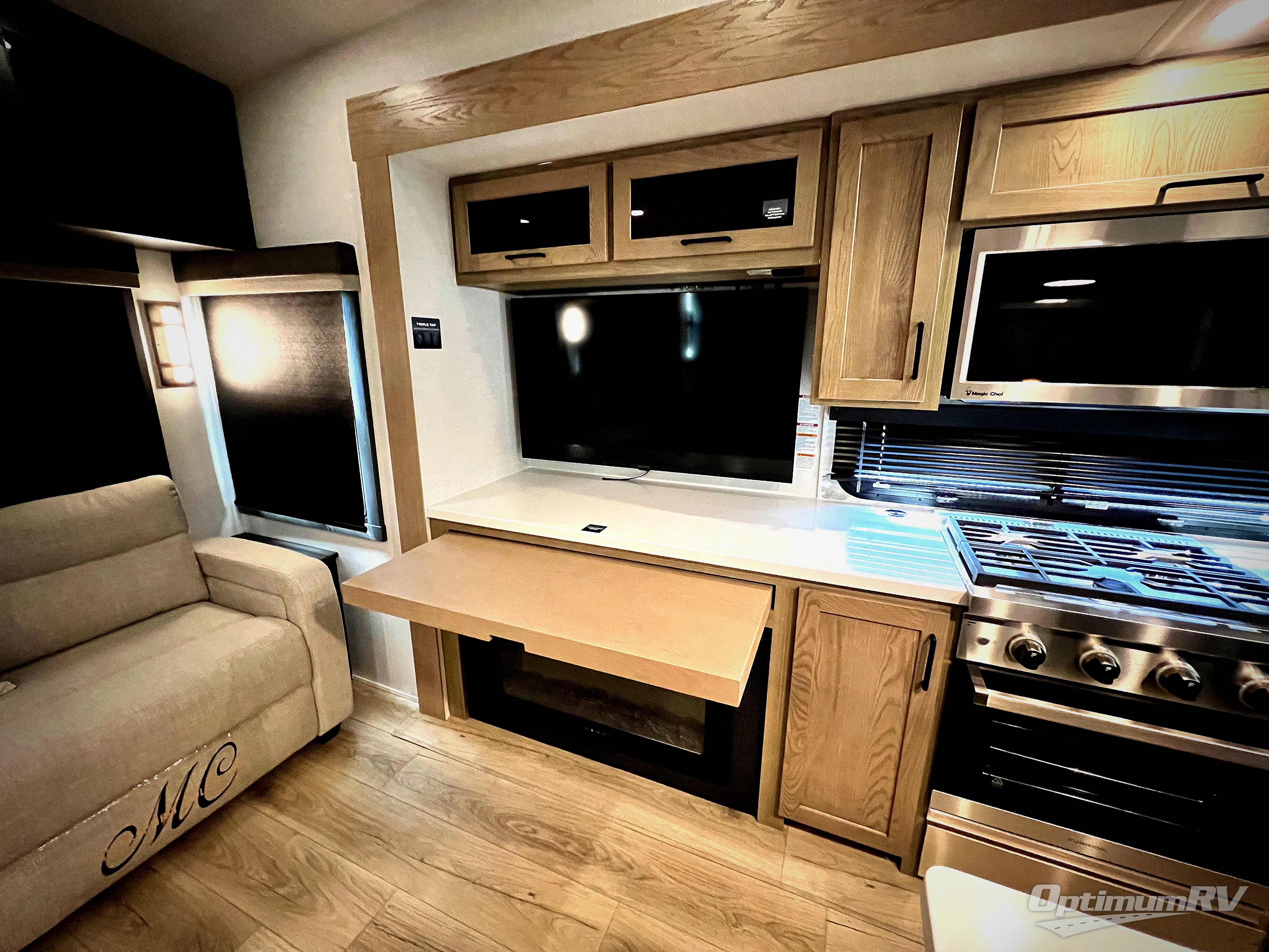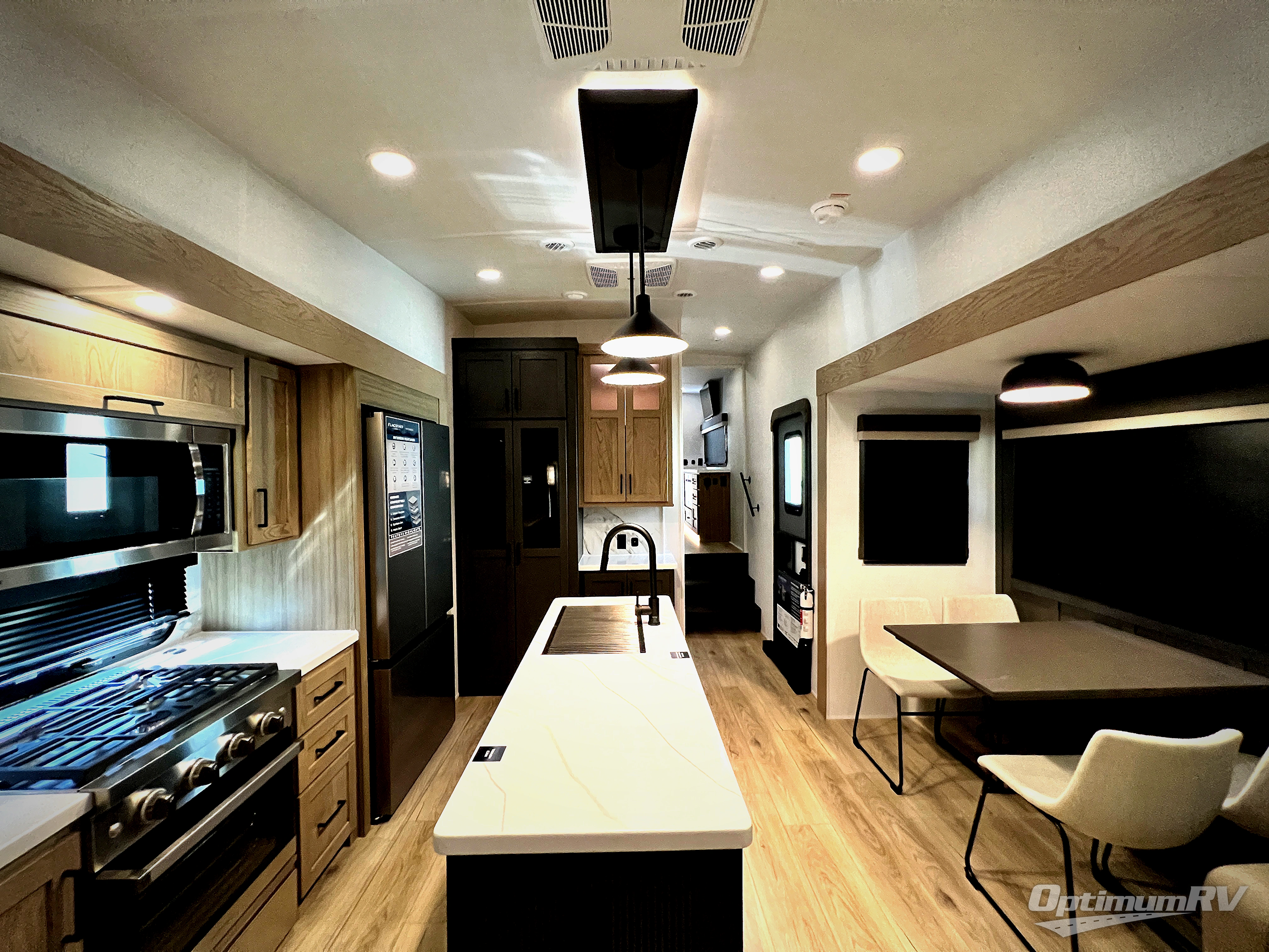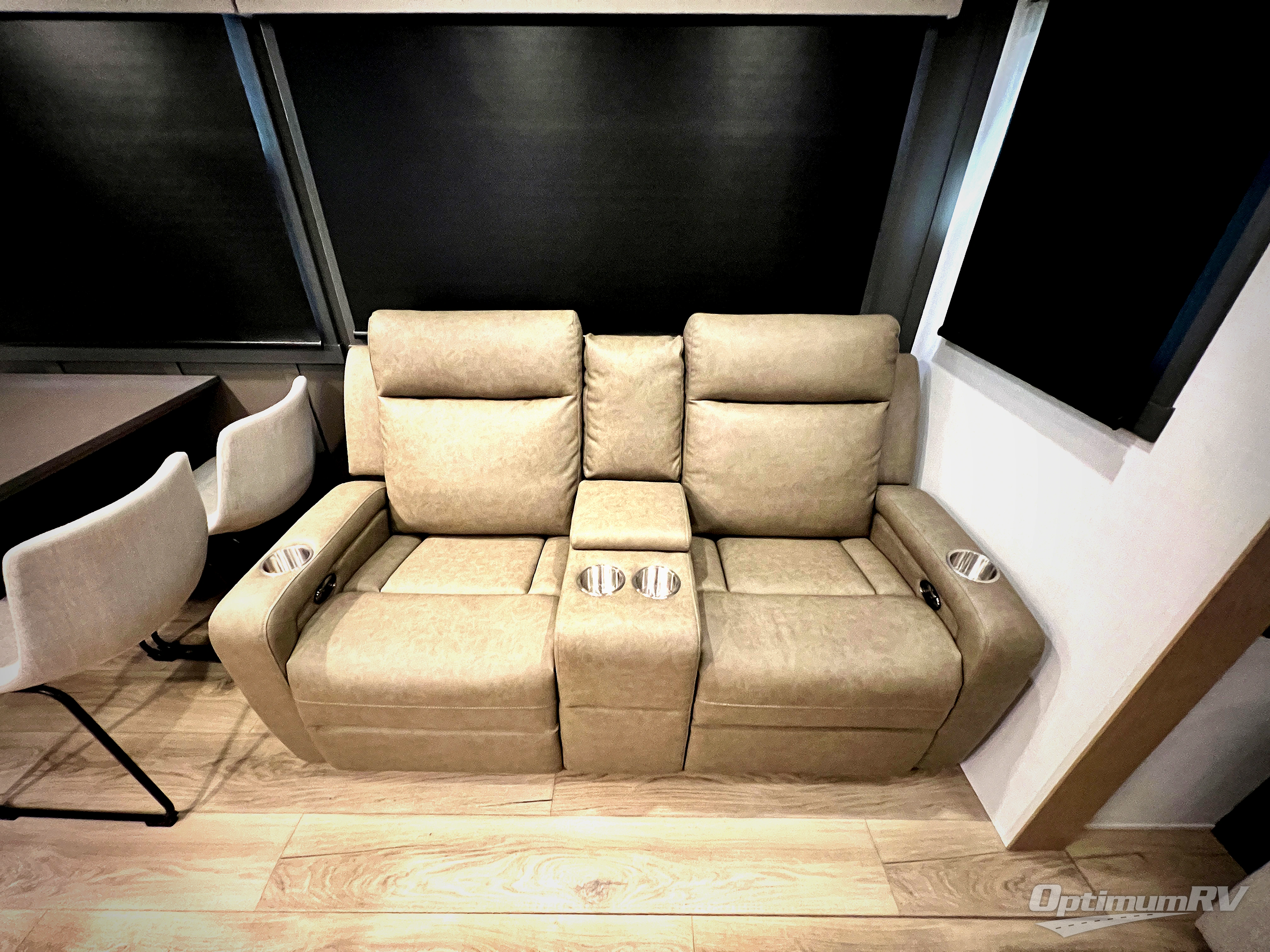 You can't go wrong when choosing this spacious fifth wheel! The master bedroom features a king bed slide out, wardrobe, and a dresser with a fireplace, and the full front bath is sure to bring comfort. There are dual bath sinks here, tons of storage, and even washer and dryer prep if you choose to add these appliances. The mid-coach half bath will come in handy if you have guests staying over on the rear hide-a-bed sofa. You'll also find a theater seat and a rotating table and chairs where you can dine and relax each day, plus there is a large kitchen island so the chef of your group has plenty of prep space. A Smart TV and fireplace will make your space feel more like home, and there is a pull-out desk here if you need to get some work done!