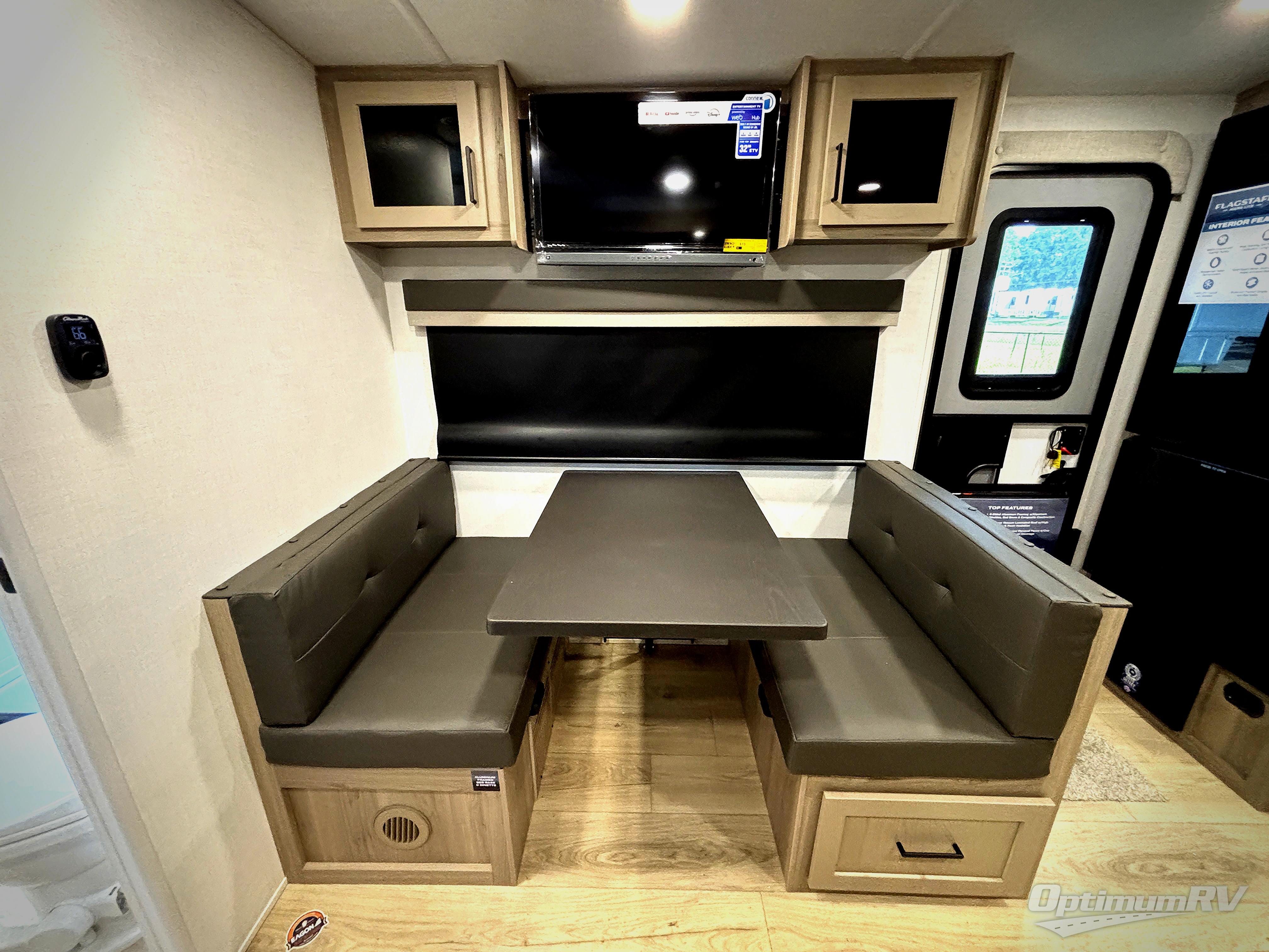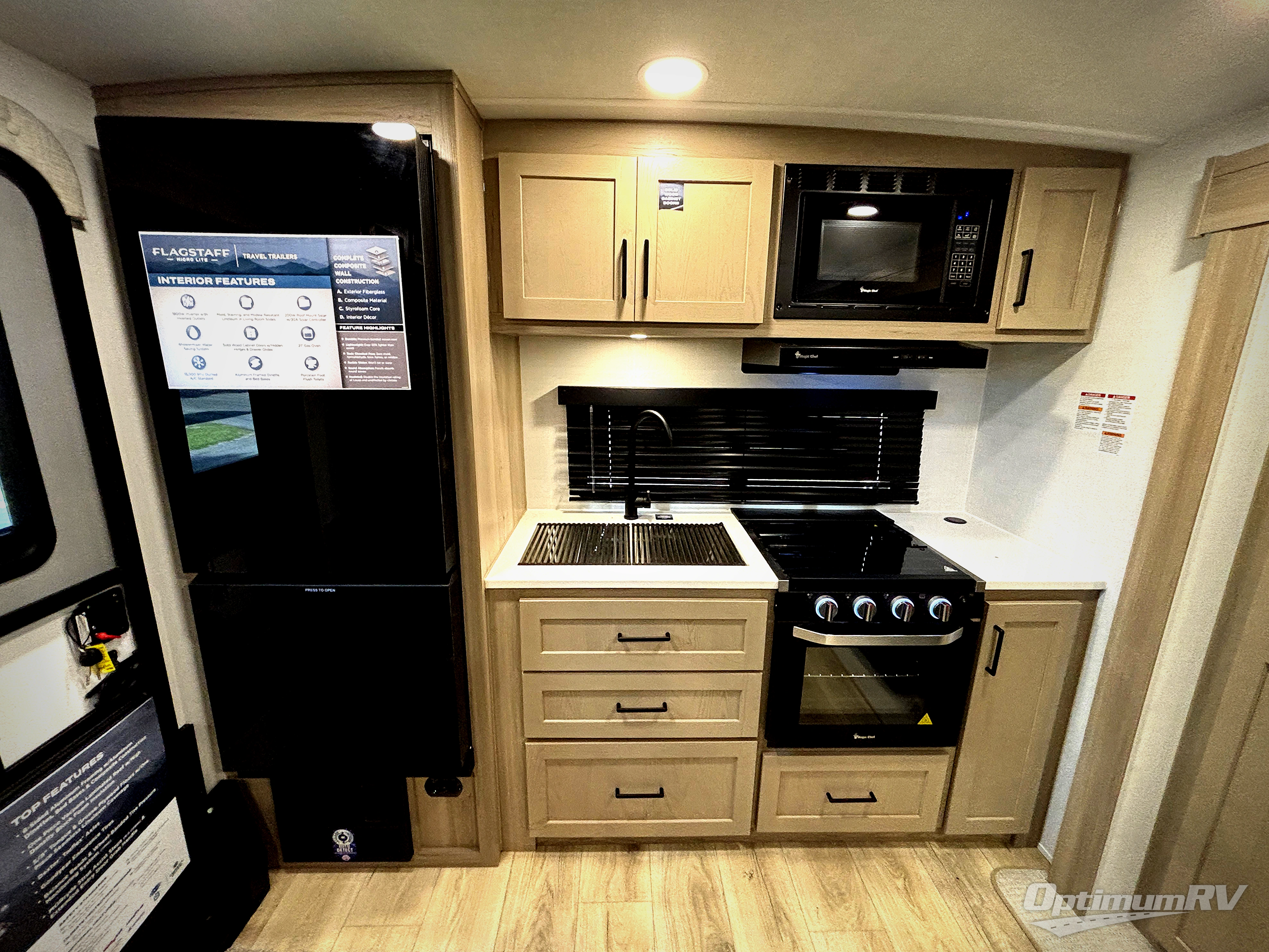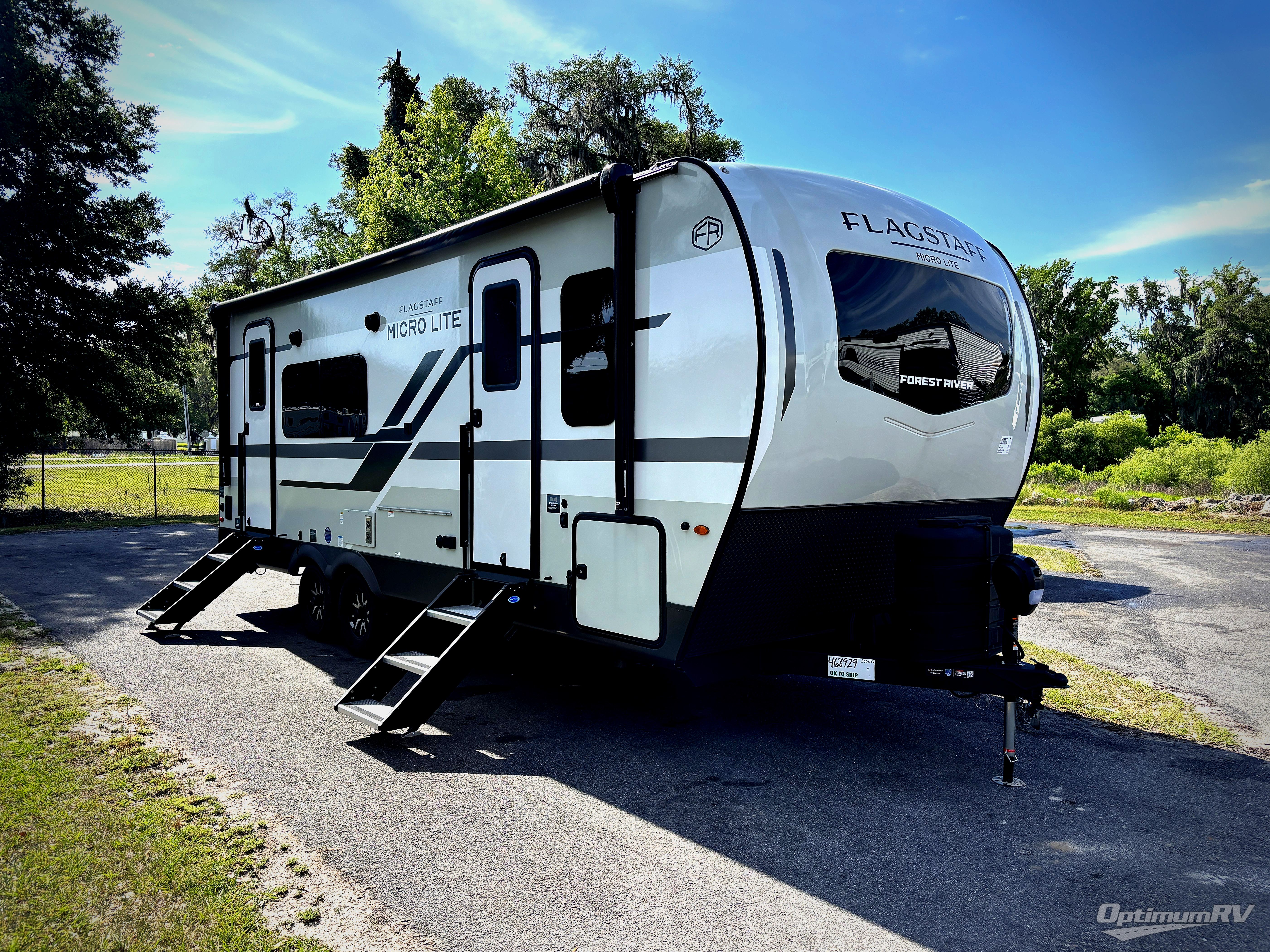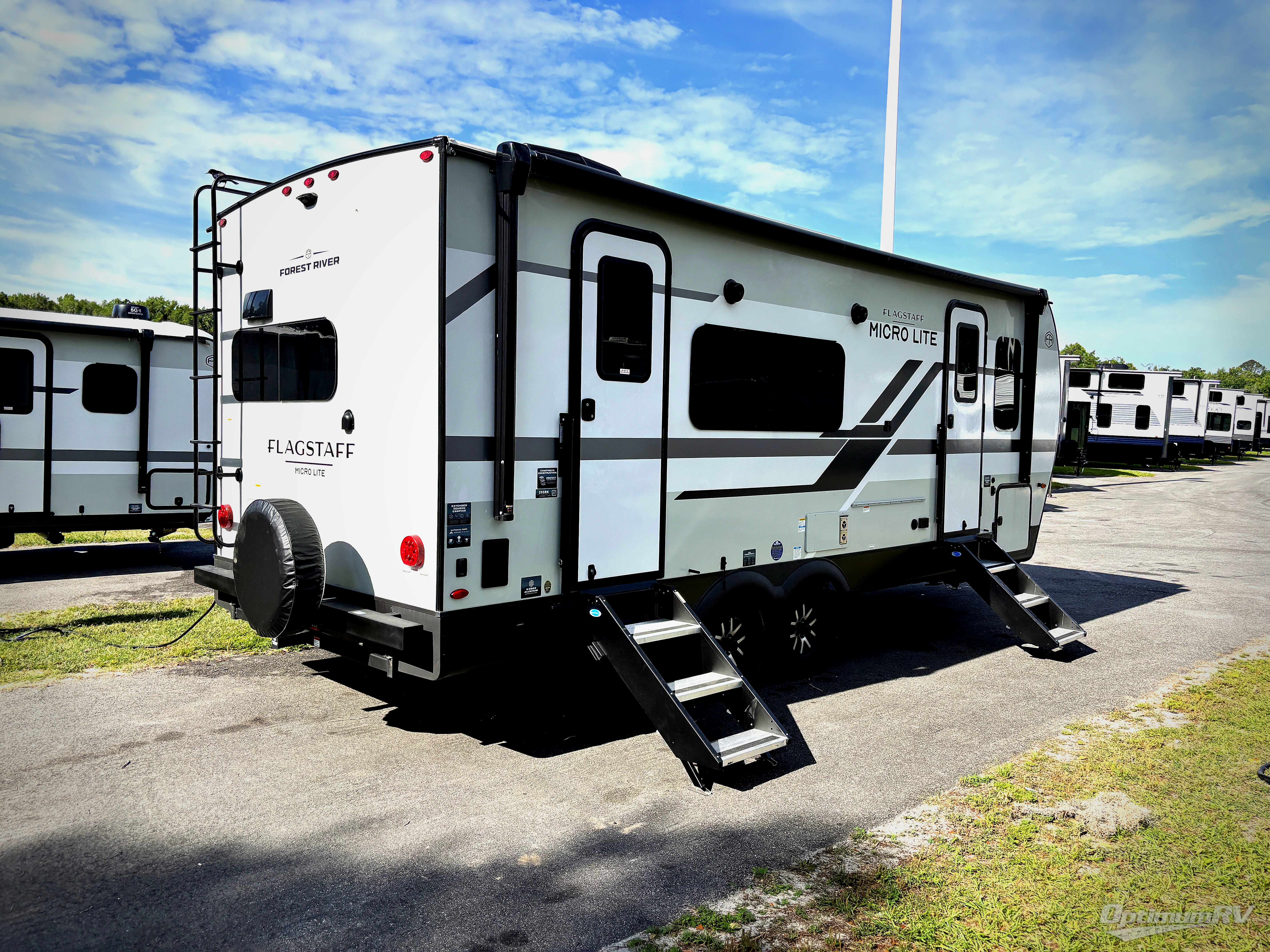 With any Flagstaff Micro Lite travel trailer by Forest River you will enjoy lightweight towing, durable construction, and added interior comforts to make each trip memorable! Each model features RoadTech tire pressure monitoring, Dexter Torflex axles, and nitrogen-filled Goodyear endurance tires for smooth towing from home to campground. The 6-sided aluminum framed construction provides a strong foundation so you can enjoy your RV for years to come, plus the radiant foil in the front cap, underbelly and slides help insulate your trailer. Additional exterior features include a 200W solar panel, back-up camera prep, frameless windows, and slam baggage doors. Each model includes the Great Expectations Package with roller shades, solid surface kitchen countertops, and hidden hinge cabinet doors. There is also an exterior hot/cold water port, outside speakers, a power tongue jack and stabilizer jacks, plus many more conveniences.