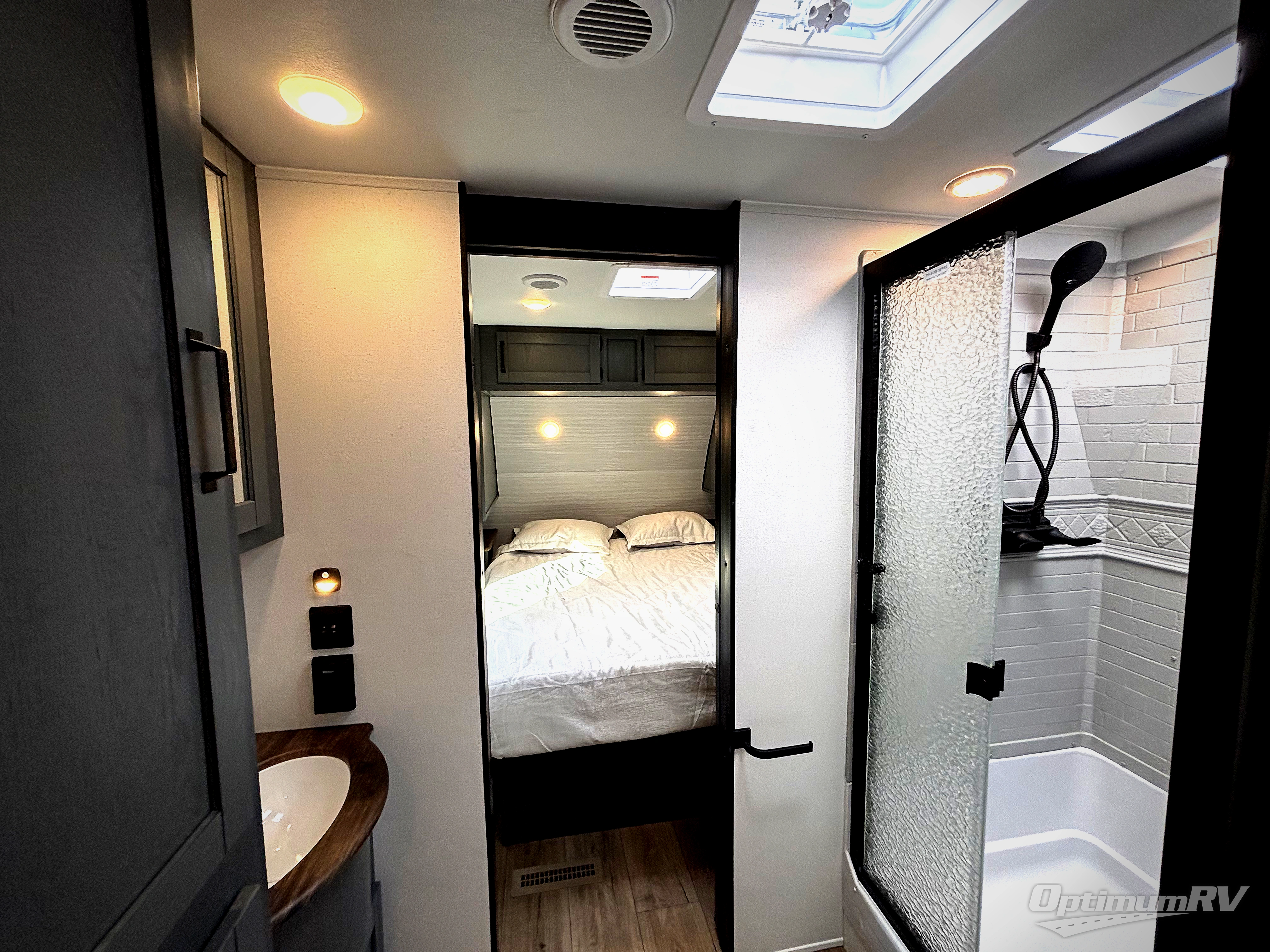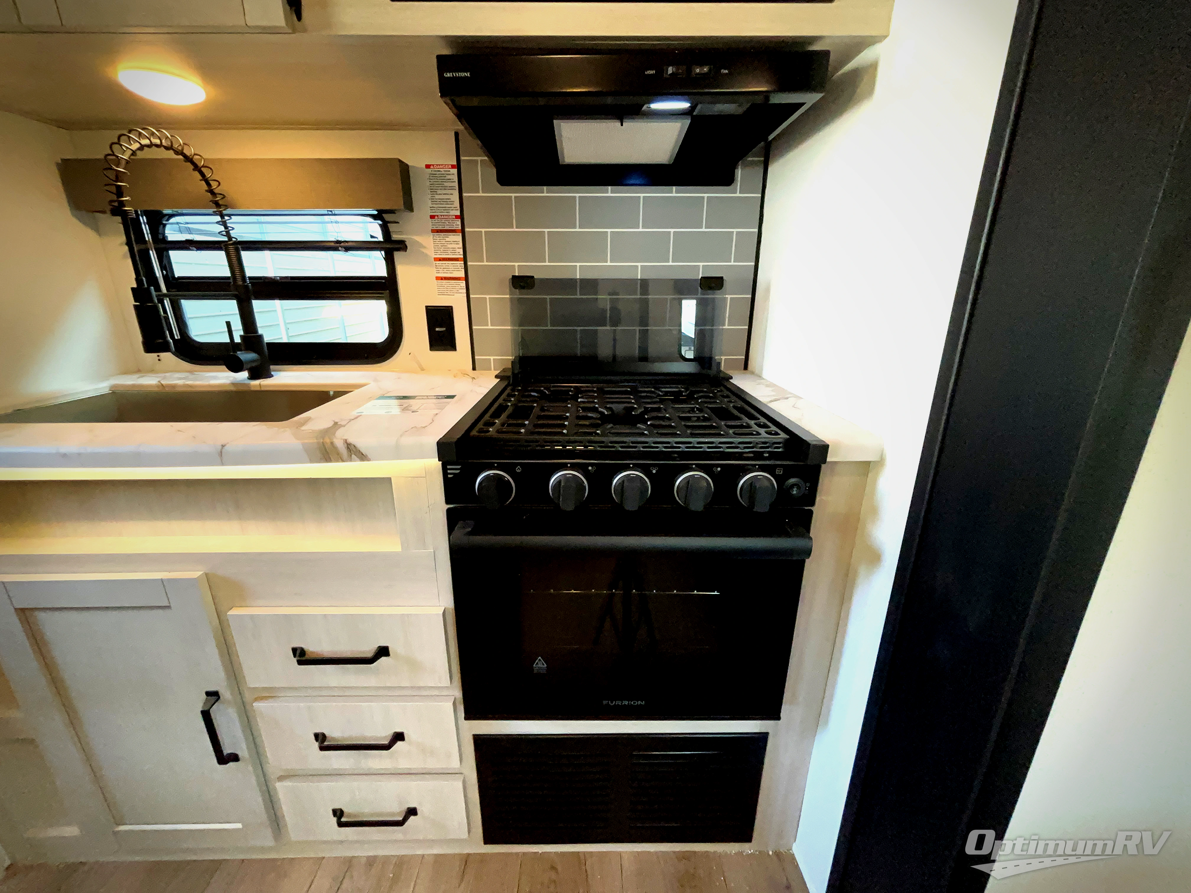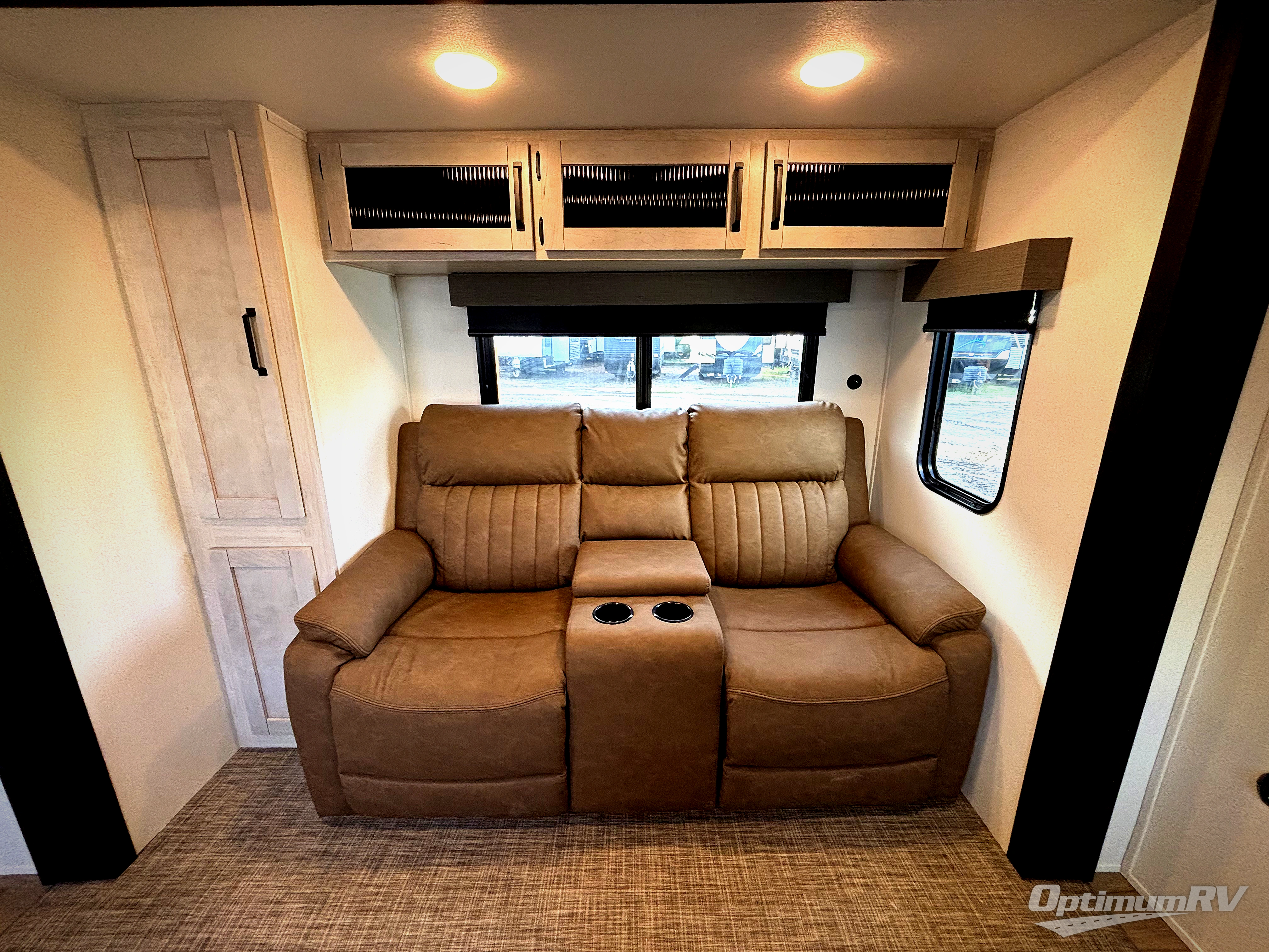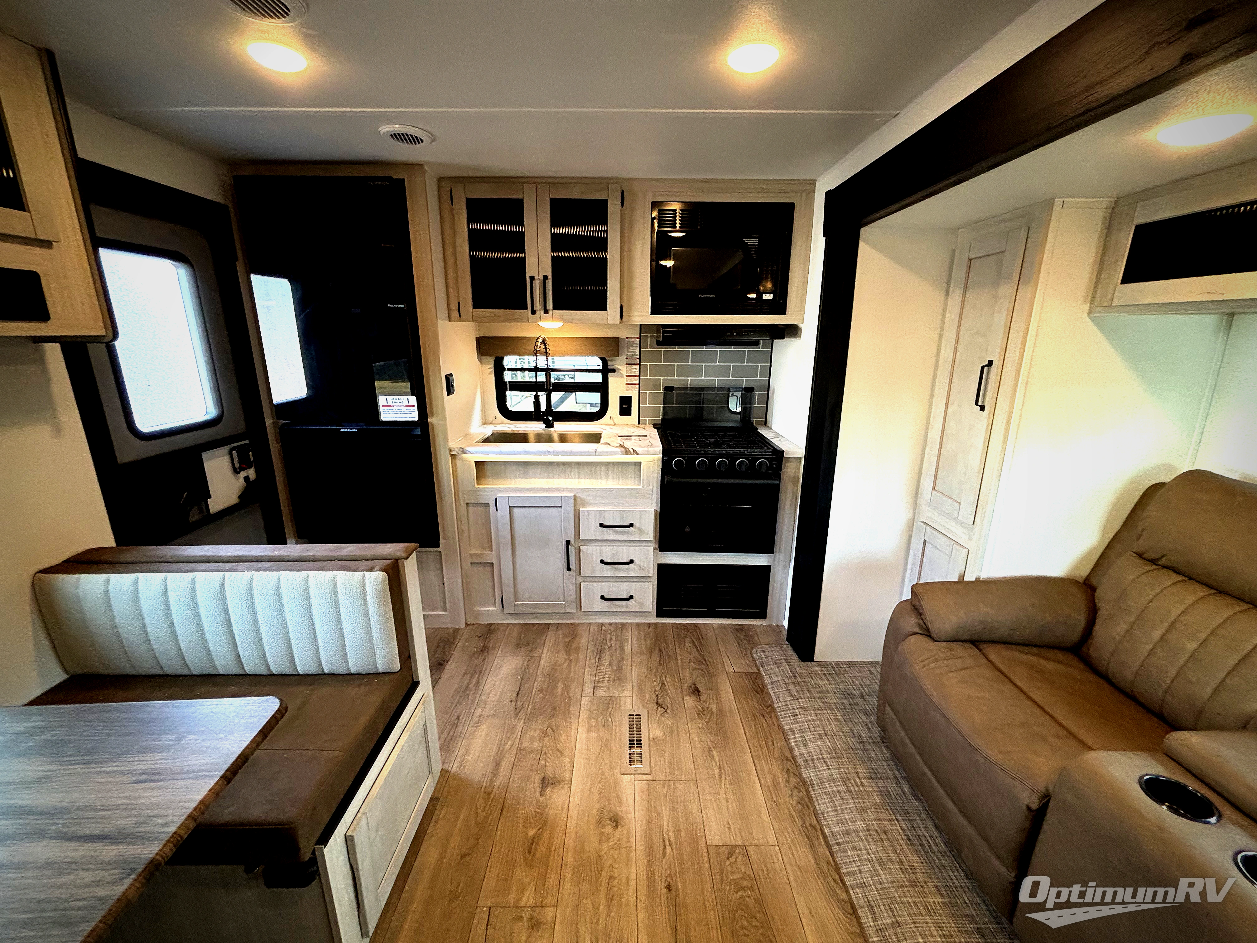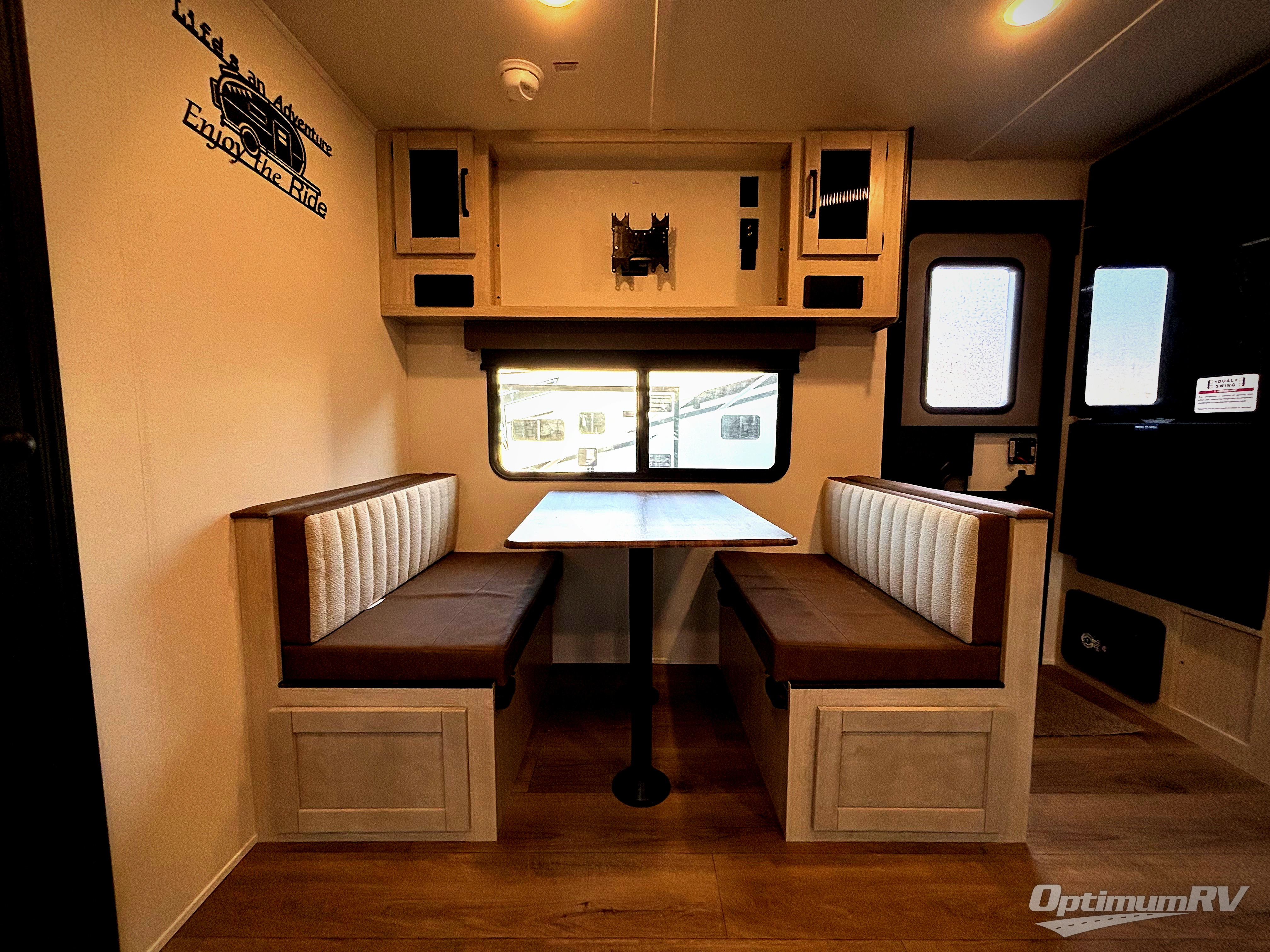 This rear kitchen travel trailer will be perfect for camping trips to the lake or woods! Once you've made breakfast on the stainless steel oven and range, you can dine at the booth dinette or take your plate outdoors to sit under the 18' electric awning. There is also a sofa slide out inside for a comfy place to relax. The walk-thru bath features a shower with a seat for added comfort, and you'll love having your own space in the front master bedroom. Here, you'll find a queen bed plus dual bedside closets to keep your things organized!