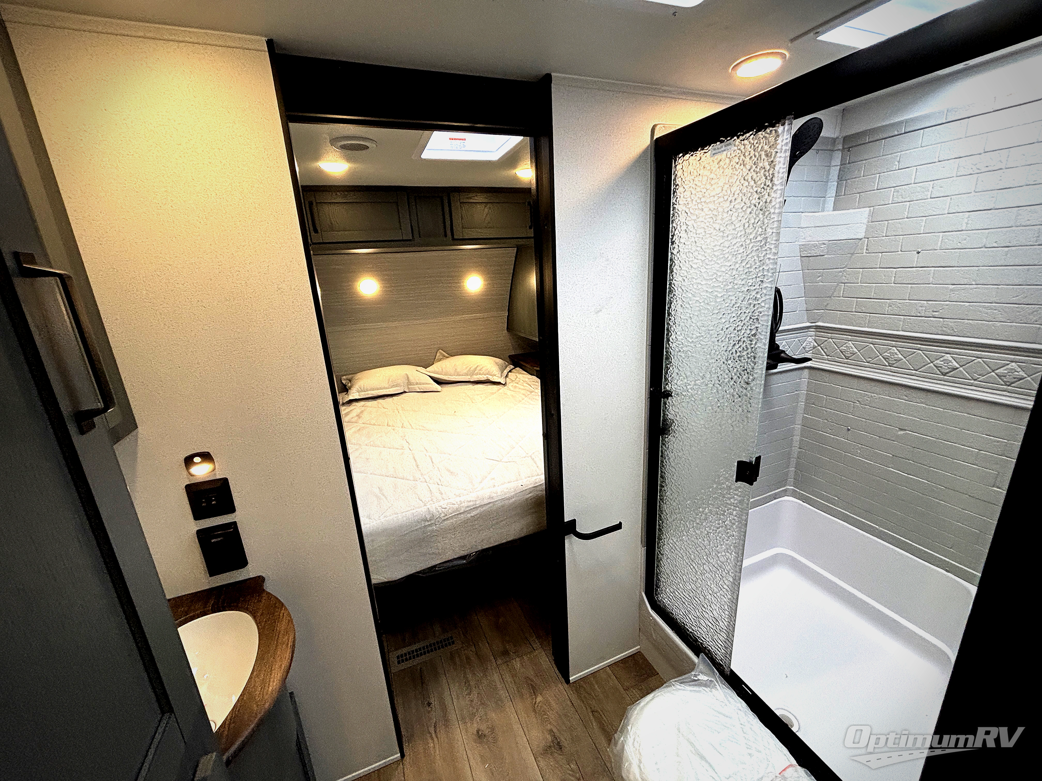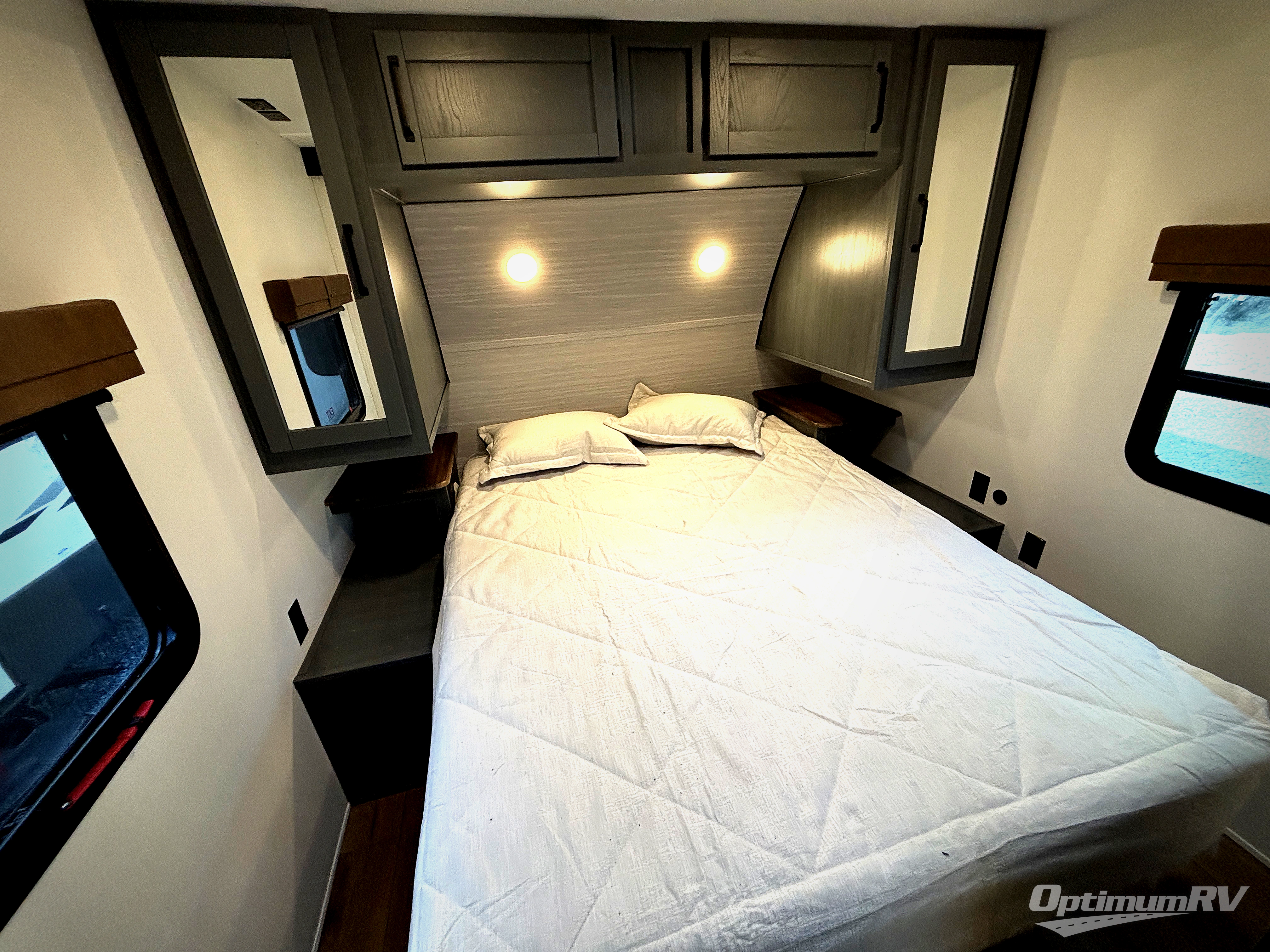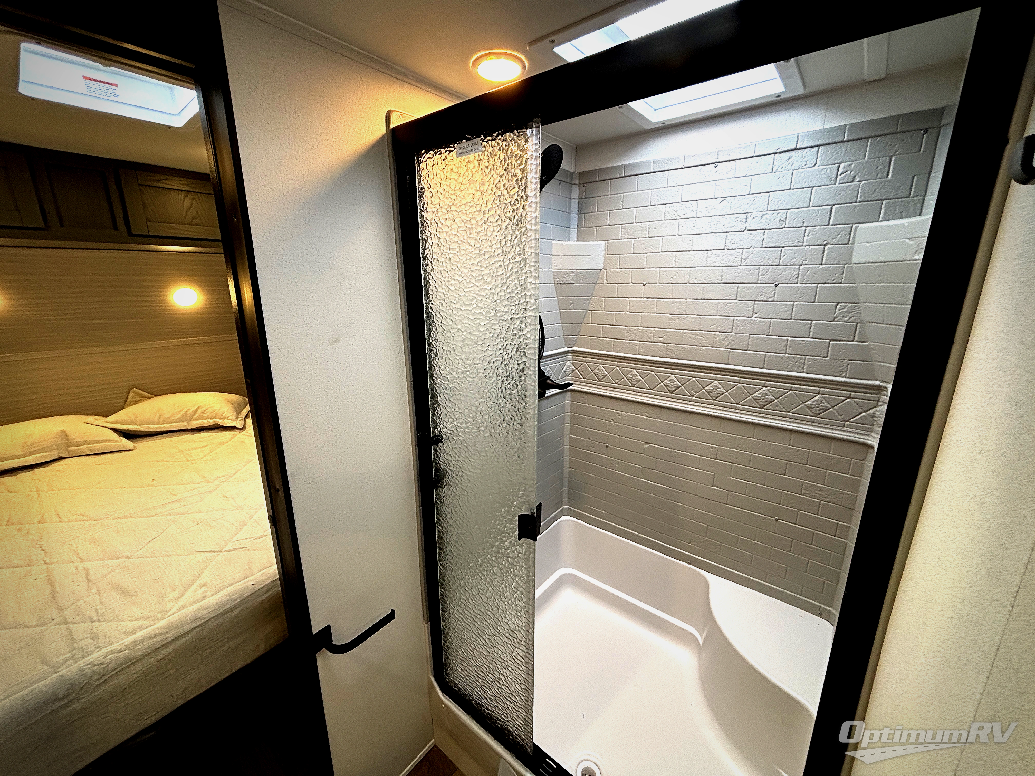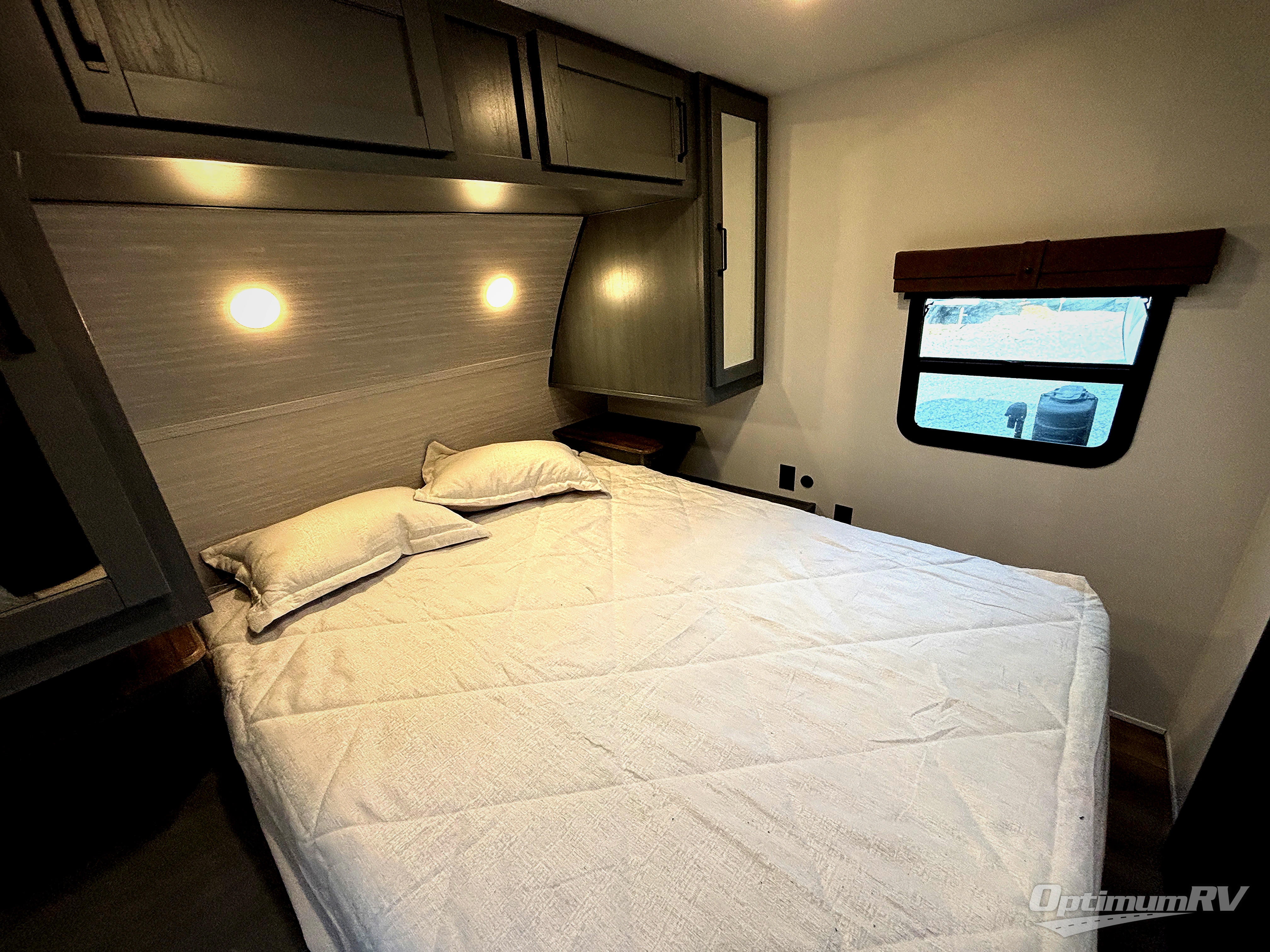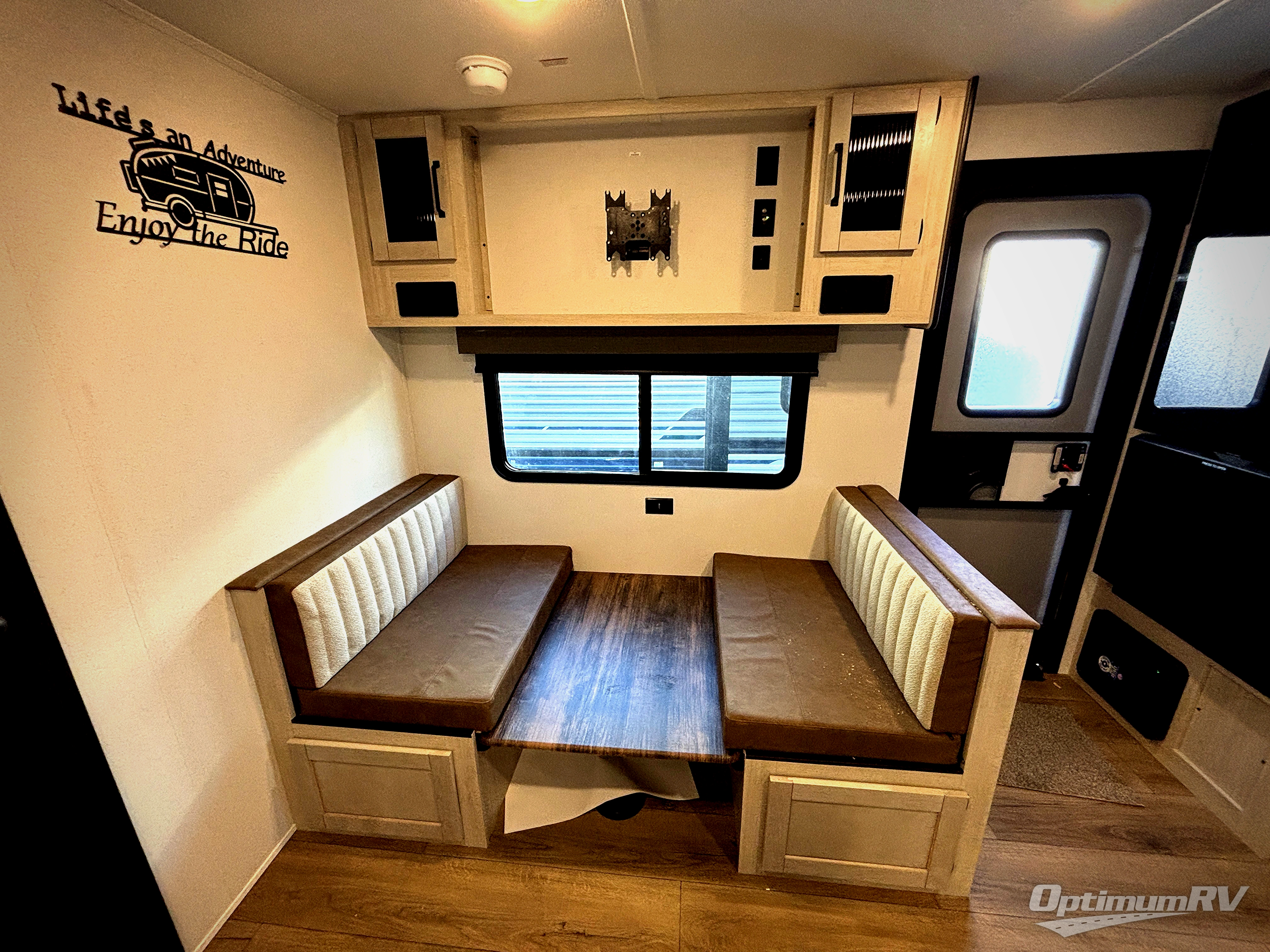 This rear kitchen travel trailer will be perfect for camping trips to the lake or woods! Once you've made breakfast on the stainless steel oven and range, you can dine at the booth dinette or take your plate outdoors to sit under the 18' electric awning. There is also a sofa slide out inside for a comfy place to relax. The walk-thru bath features a shower with a seat for added comfort, and you'll love having your own space in the front master bedroom. Here, you'll find a queen bed plus dual bedside closets to keep your things organized!
