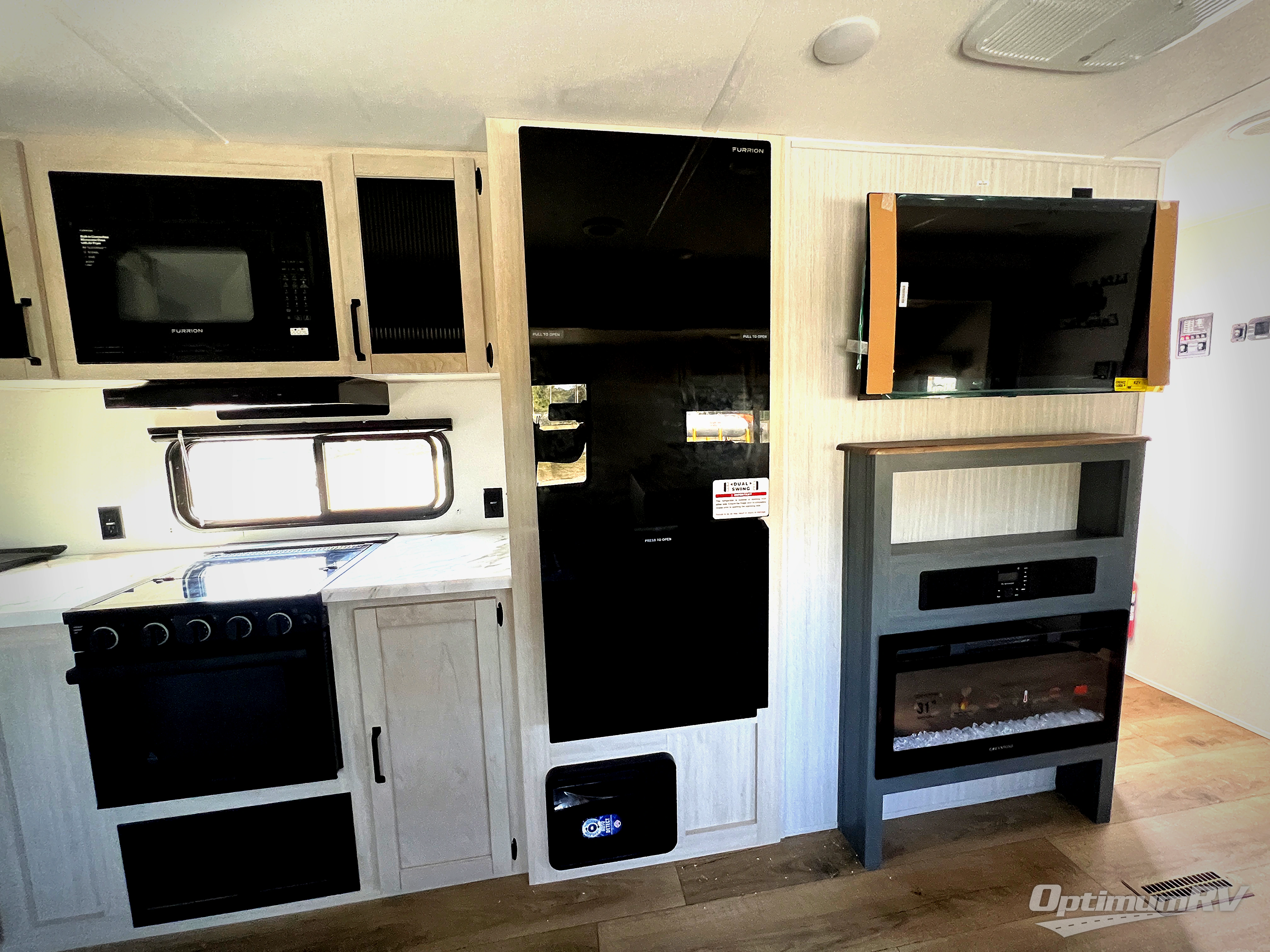 Head to the lake in this double slide out travel trailer that can sleep four to five each night. You will love having the front private bedroom all to yourselves that includes a queen bed slide out, a front wardrobe, a closet with washer and dryer prep, plus your own exterior entry door. Your guests can sleep on the sofa and booth dinette within the second slide out, and the full rear bath is tucked away for privacy. This model also includes an entryway closet/pantry for food storage and jackets, and the fireplace across from the sofa makes your space cozier. An optional outside micro kitchen is available also if you like to cook outdoors!