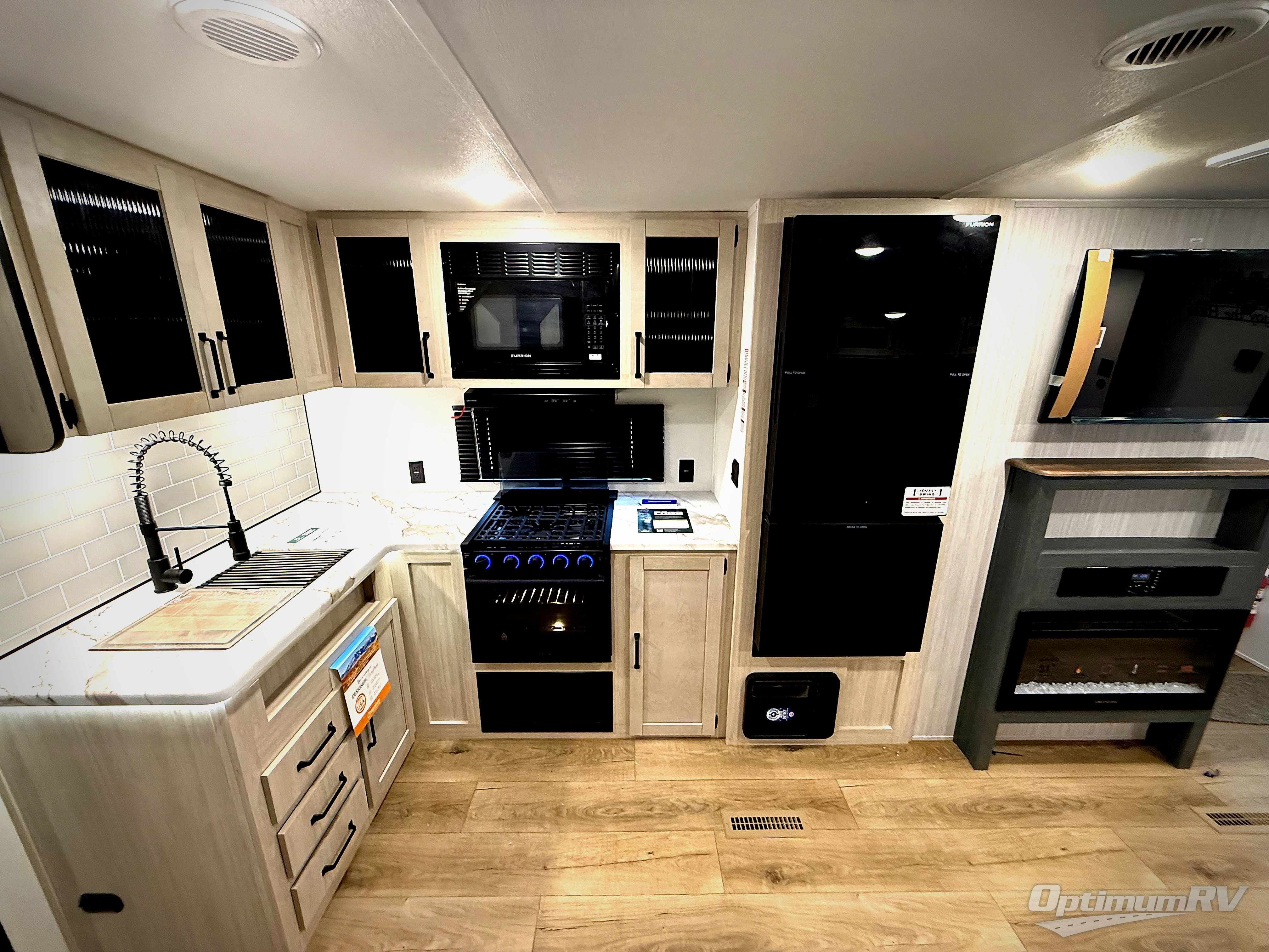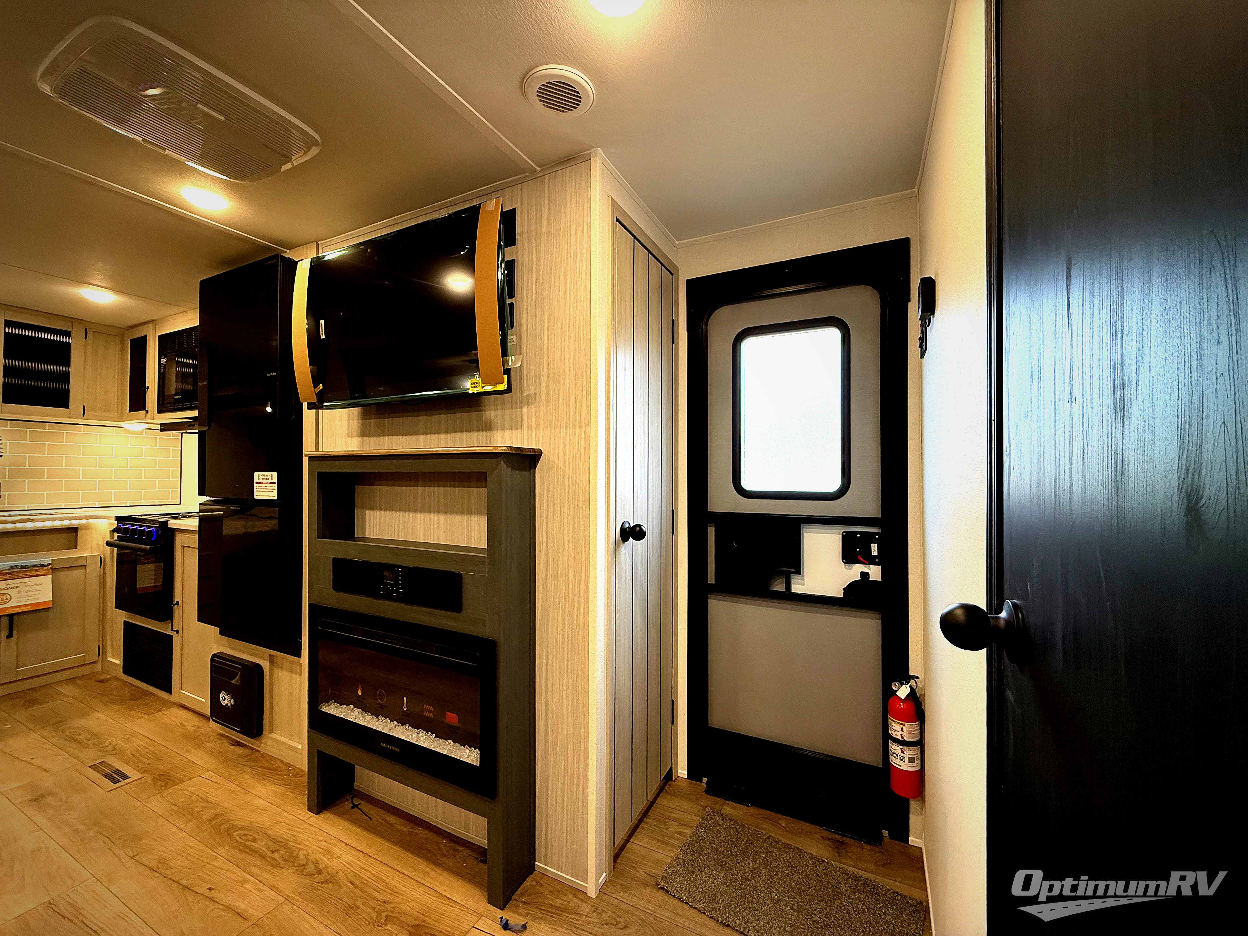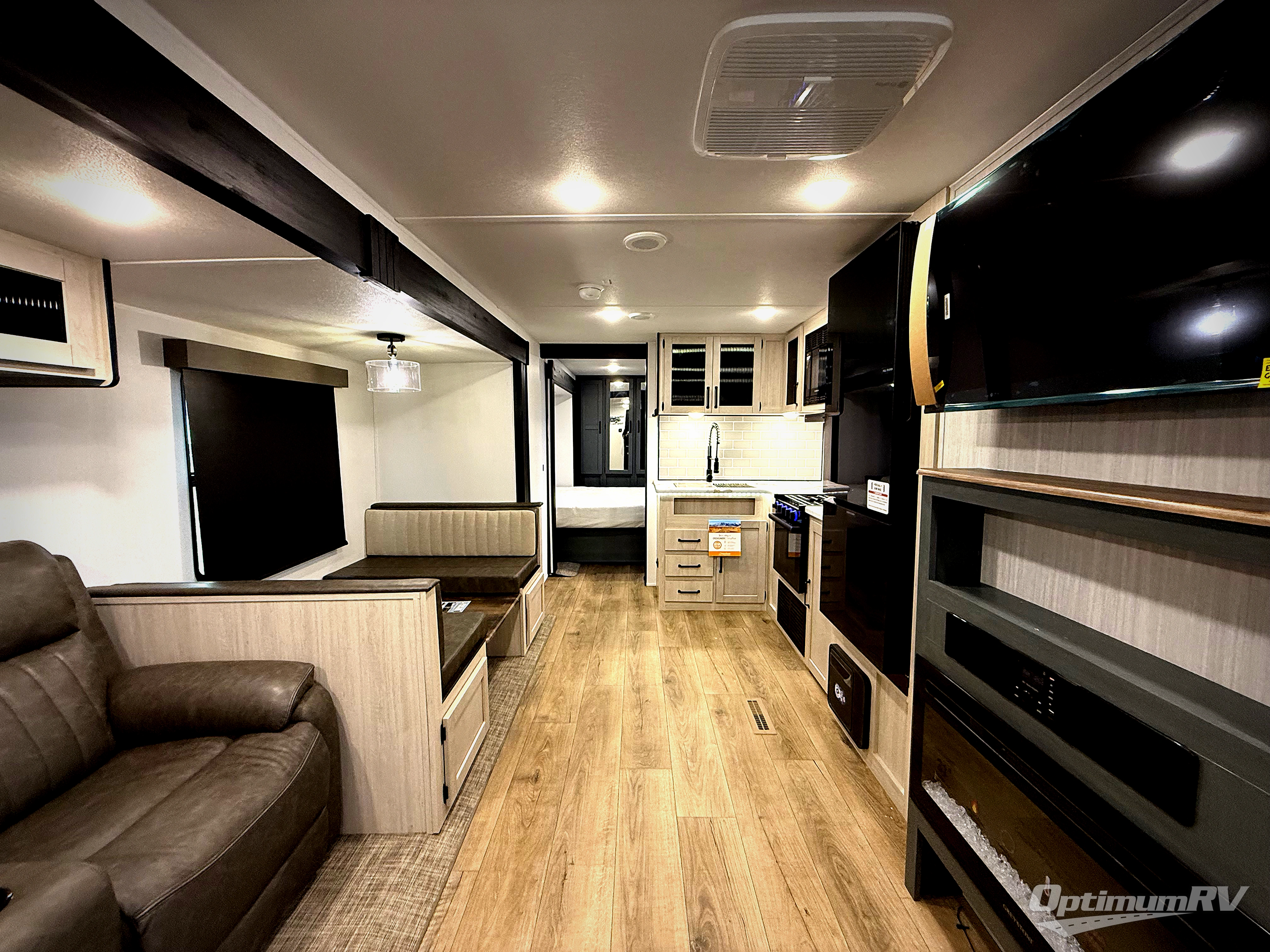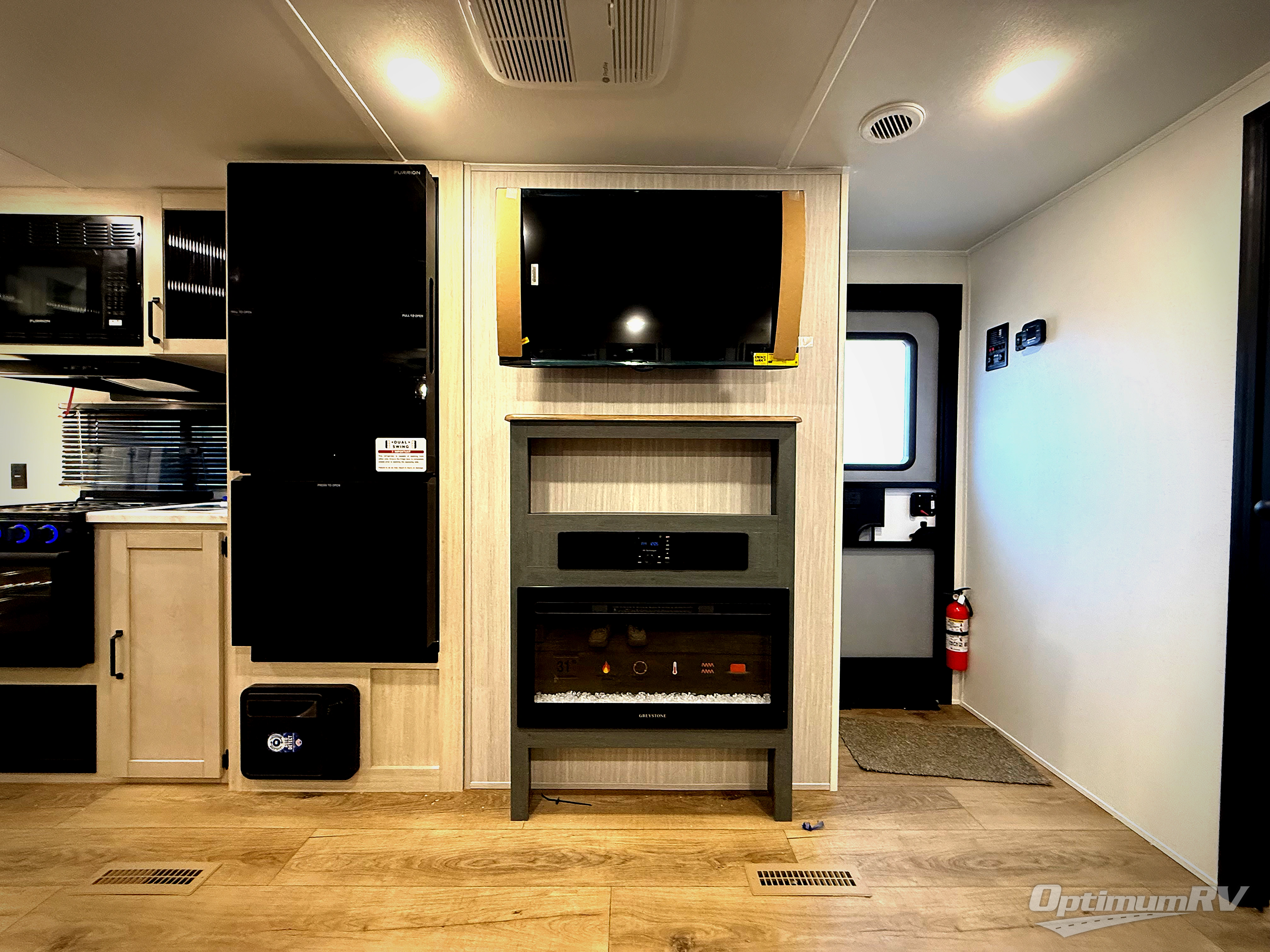 Head to the lake in this double slide out travel trailer that can sleep four to five each night. You will love having the front private bedroom all to yourselves that includes a queen bed slide out, a front wardrobe, a closet with washer and dryer prep, plus your own exterior entry door. Your guests can sleep on the sofa and booth dinette within the second slide out, and the full rear bath is tucked away for privacy. This model also includes an entryway closet/pantry for food storage and jackets, and the fireplace across from the sofa makes your space cozier. An optional outside micro kitchen is available also if you like to cook outdoors!