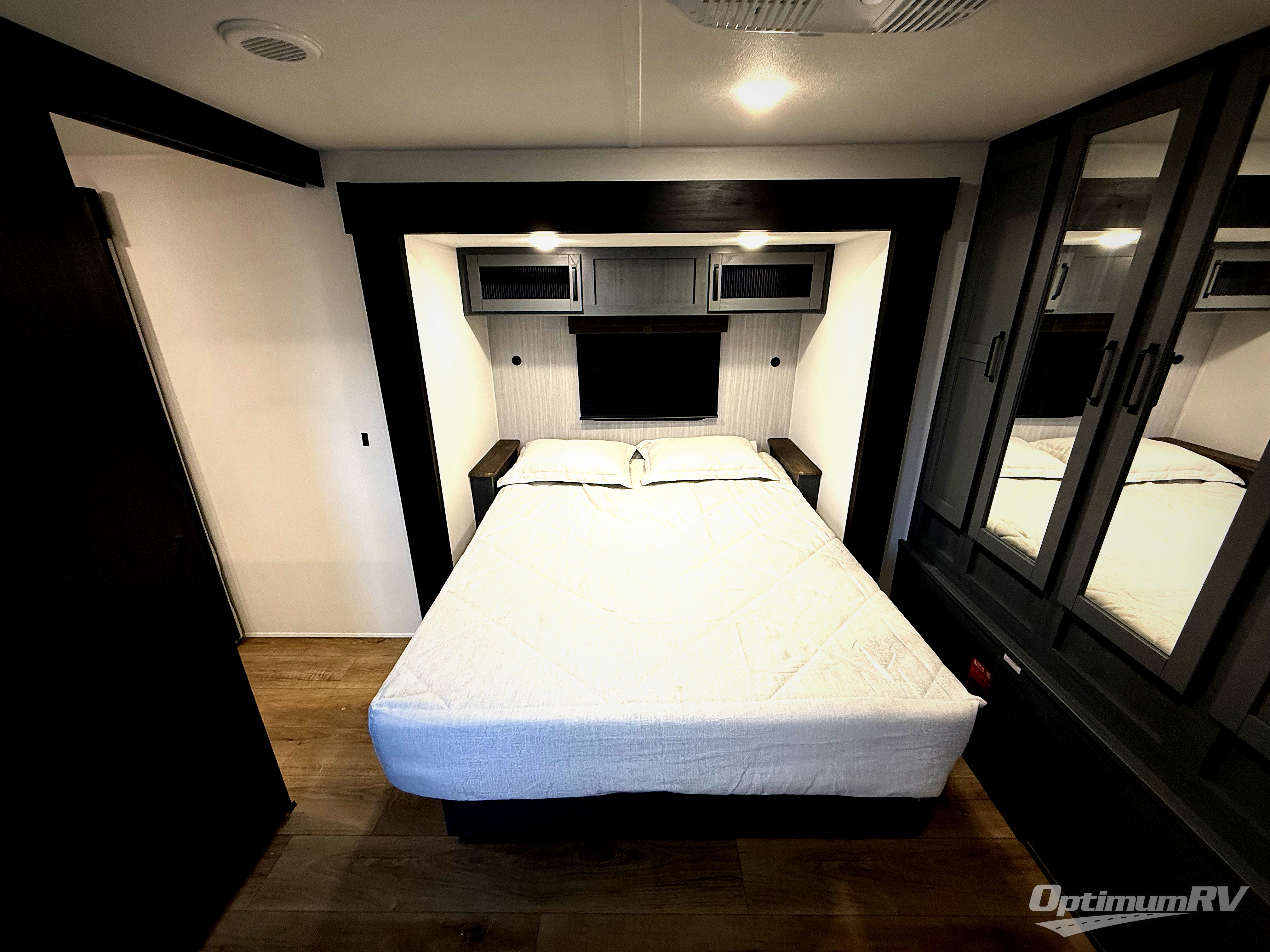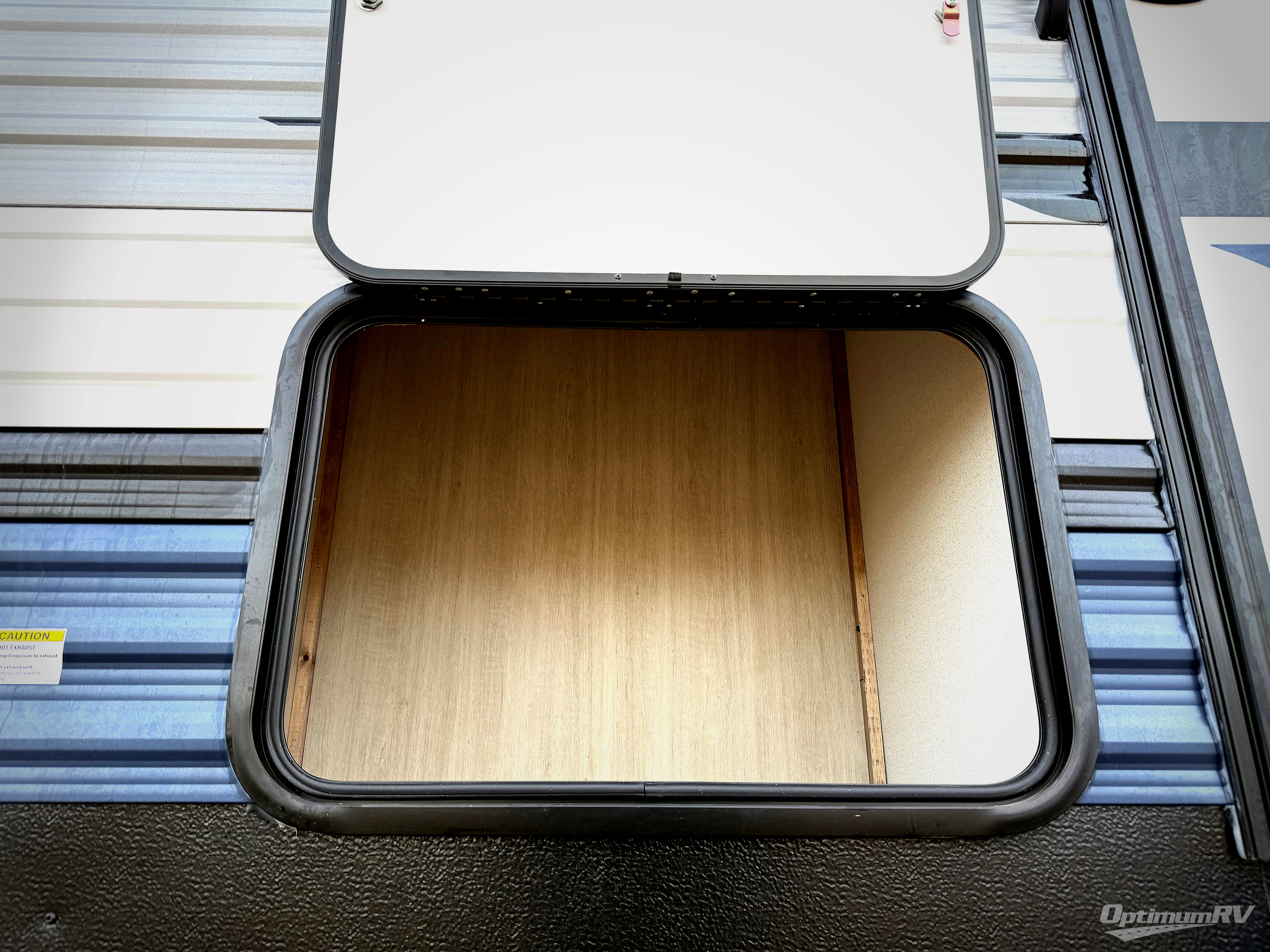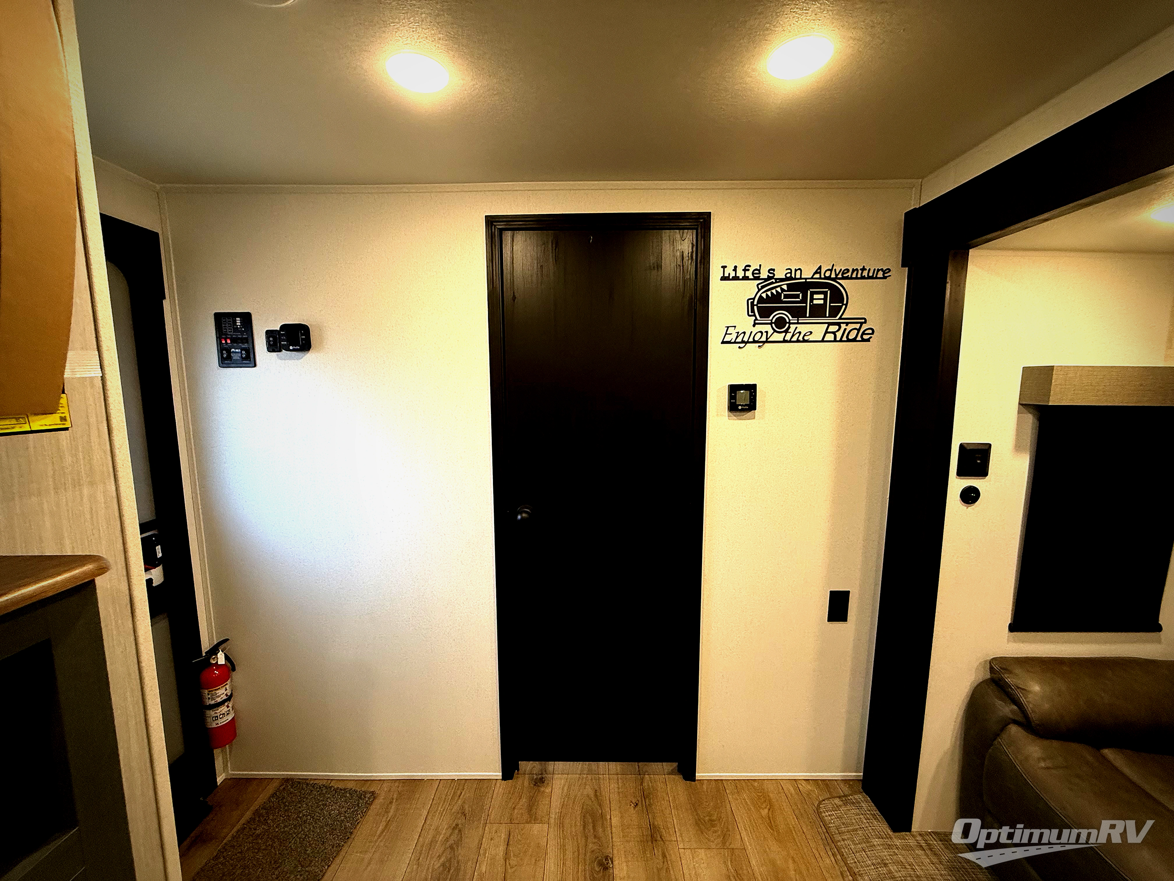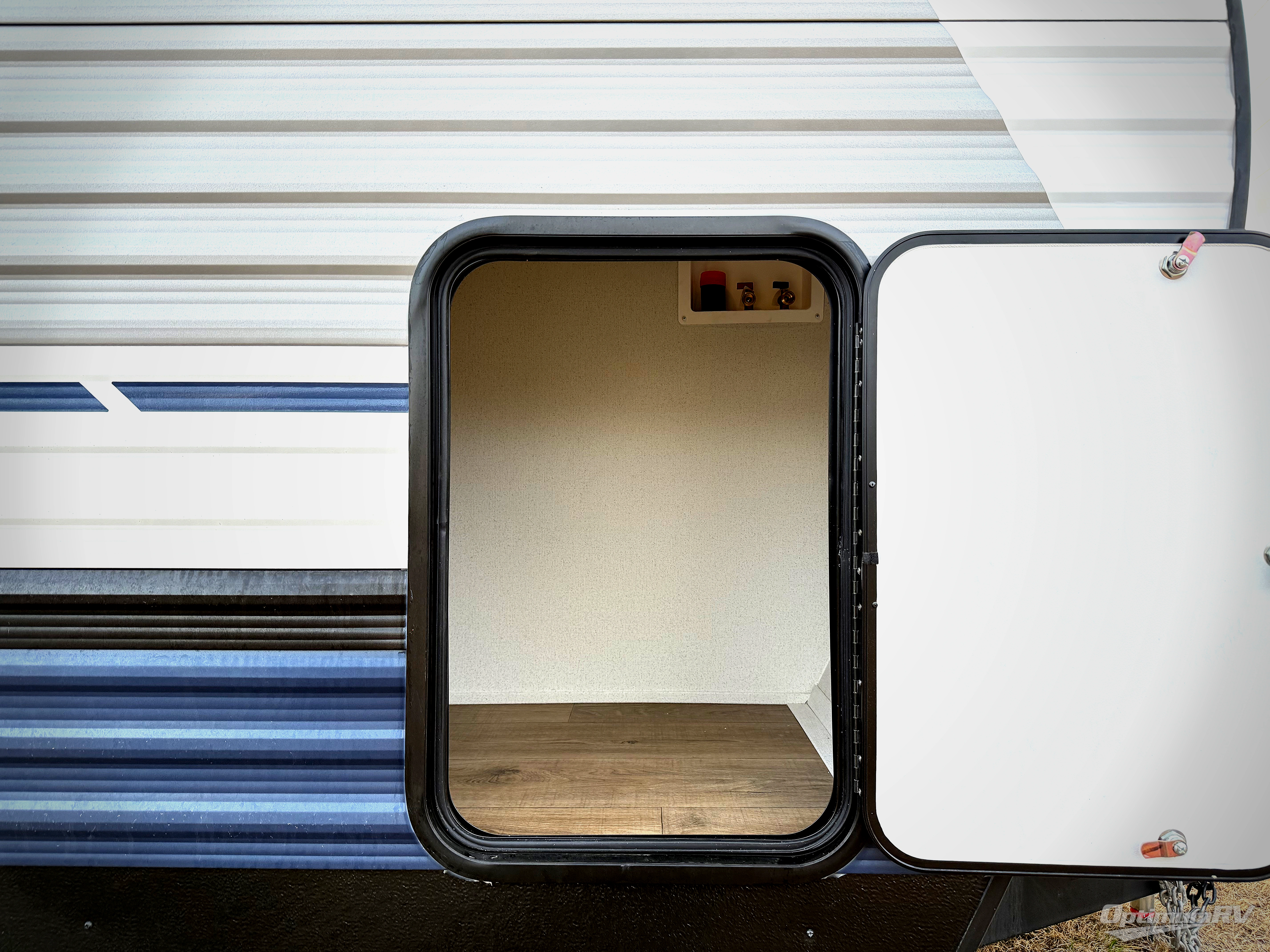 Head to the lake in this double slide out travel trailer that can sleep four to five each night. You will love having the front private bedroom all to yourselves that includes a queen bed slide out, a front wardrobe, a closet with washer and dryer prep, plus your own exterior entry door. Your guests can sleep on the sofa and booth dinette within the second slide out, and the full rear bath is tucked away for privacy. This model also includes an entryway closet/pantry for food storage and jackets, and the fireplace across from the sofa makes your space cozier. An optional outside micro kitchen is available also if you like to cook outdoors!