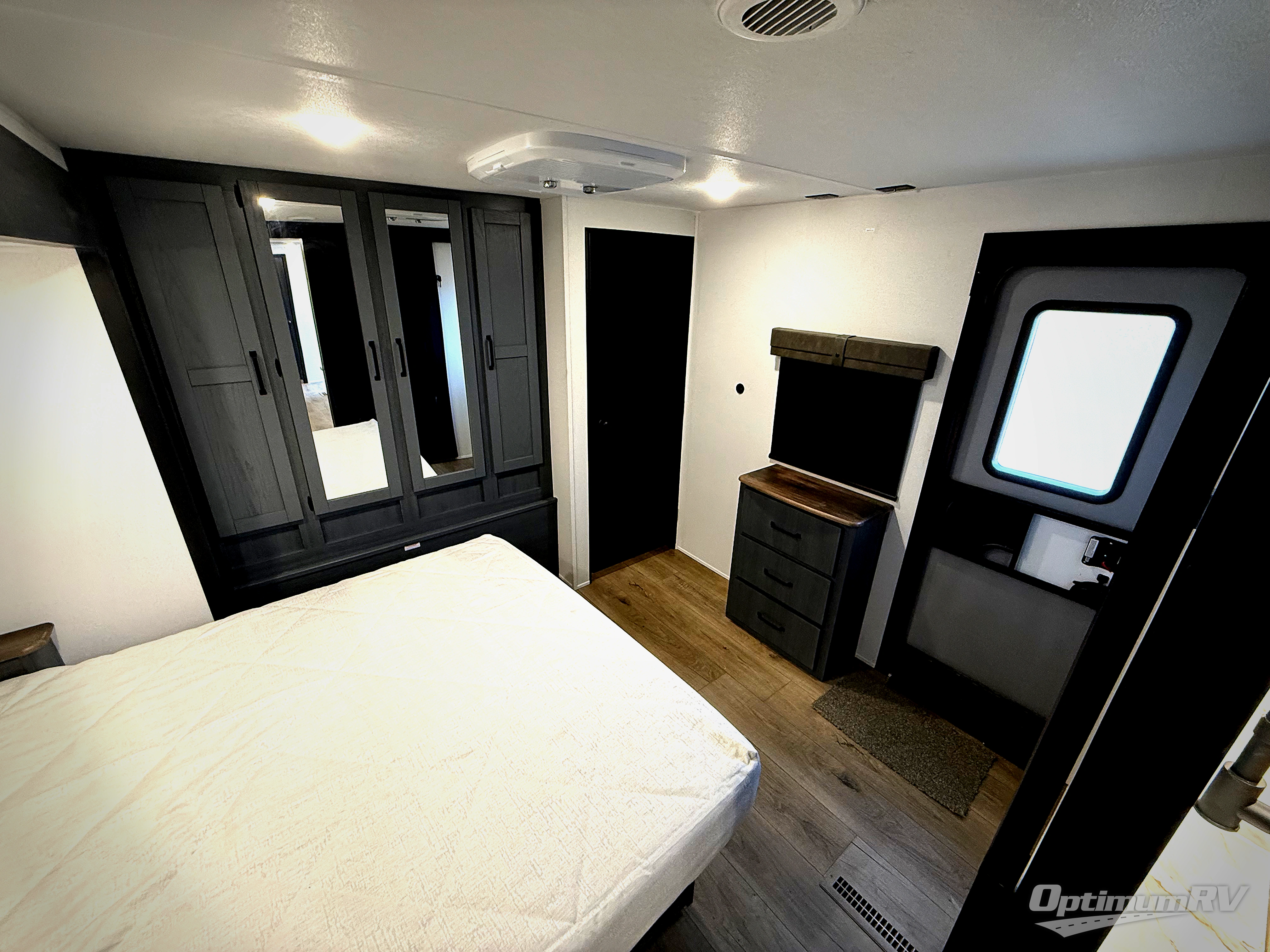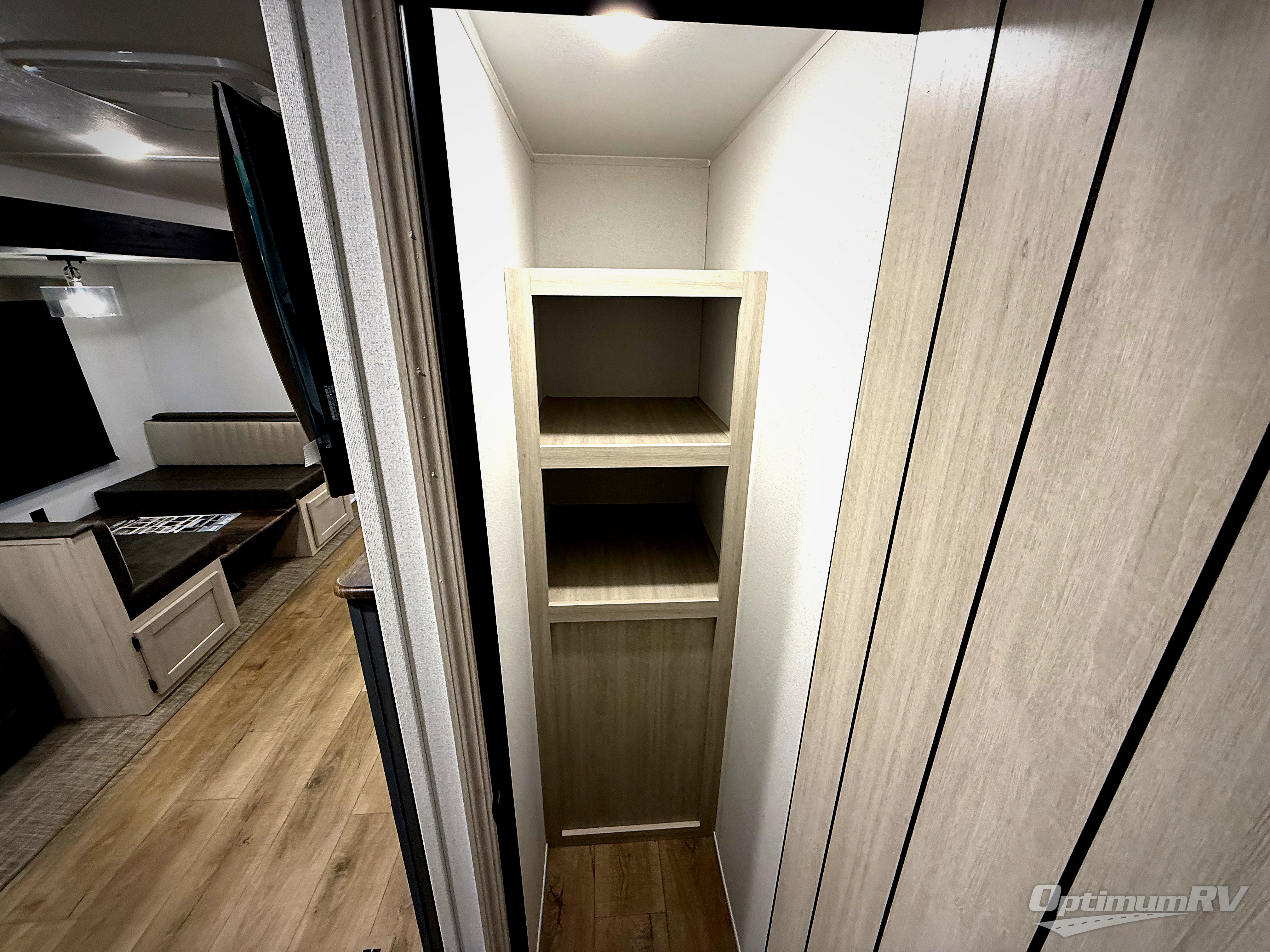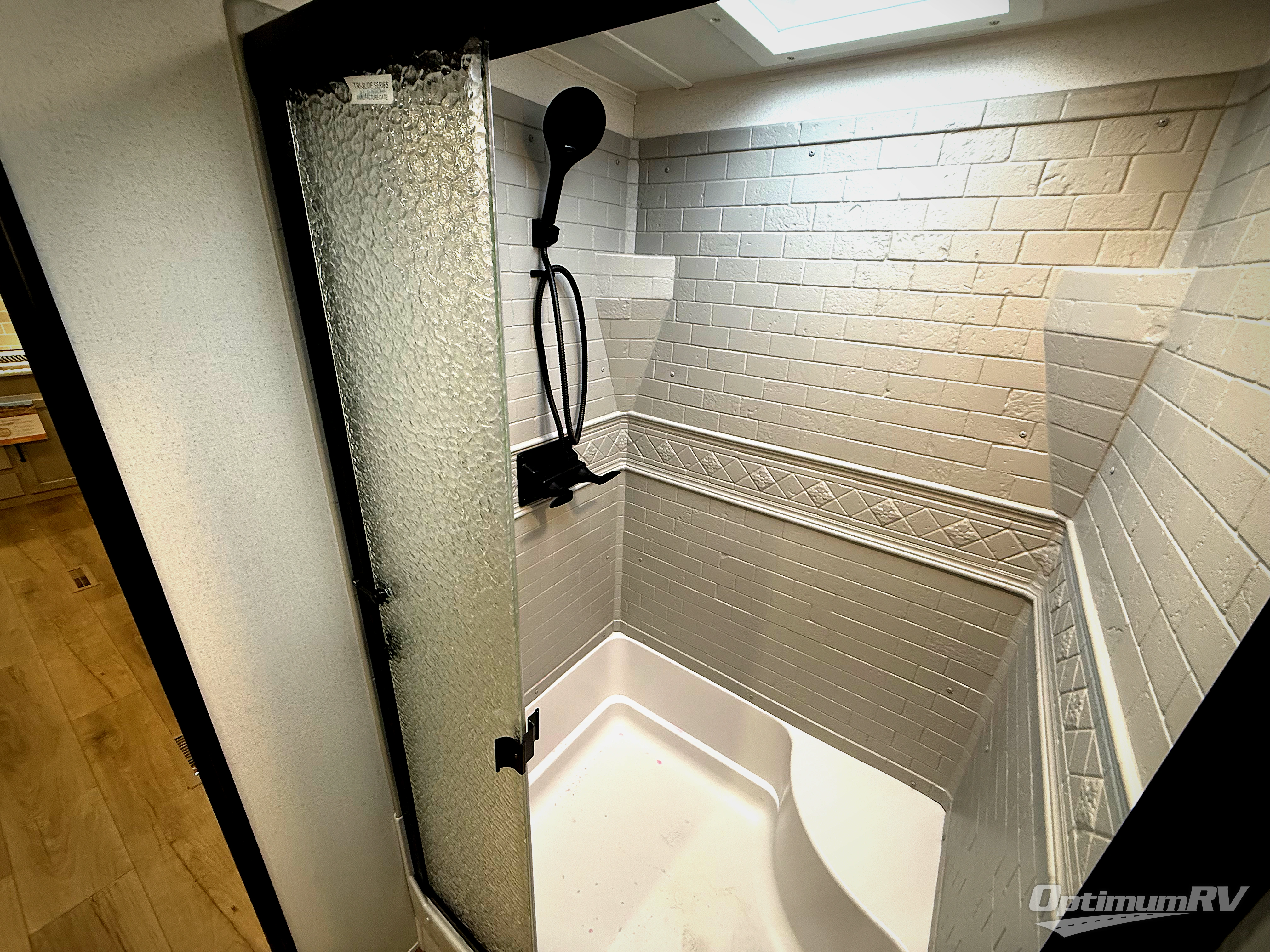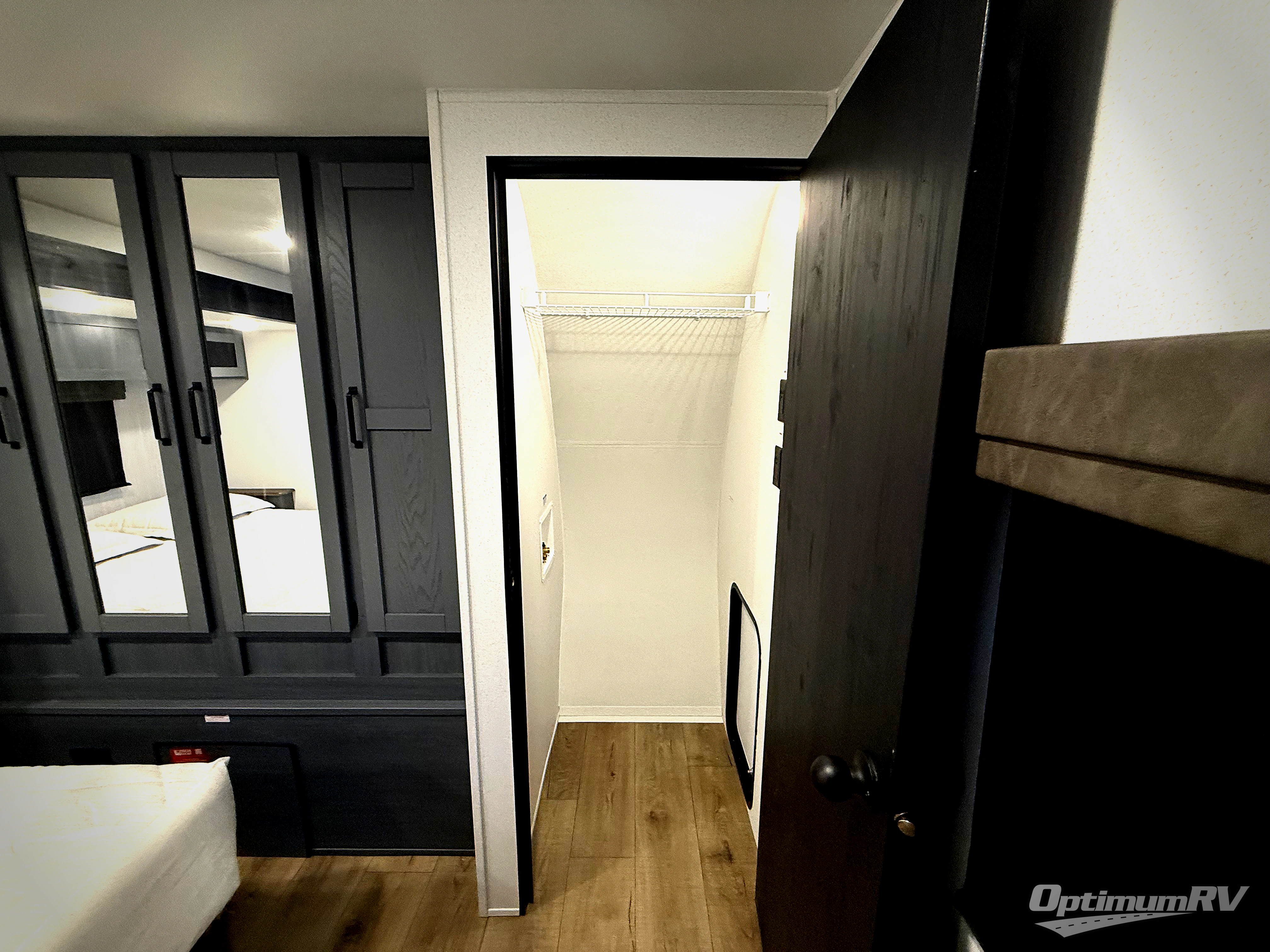 Head to the lake in this double slide out travel trailer that can sleep four to five each night. You will love having the front private bedroom all to yourselves that includes a queen bed slide out, a front wardrobe, a closet with washer and dryer prep, plus your own exterior entry door. Your guests can sleep on the sofa and booth dinette within the second slide out, and the full rear bath is tucked away for privacy. This model also includes an entryway closet/pantry for food storage and jackets, and the fireplace across from the sofa makes your space cozier. An optional outside micro kitchen is available also if you like to cook outdoors!