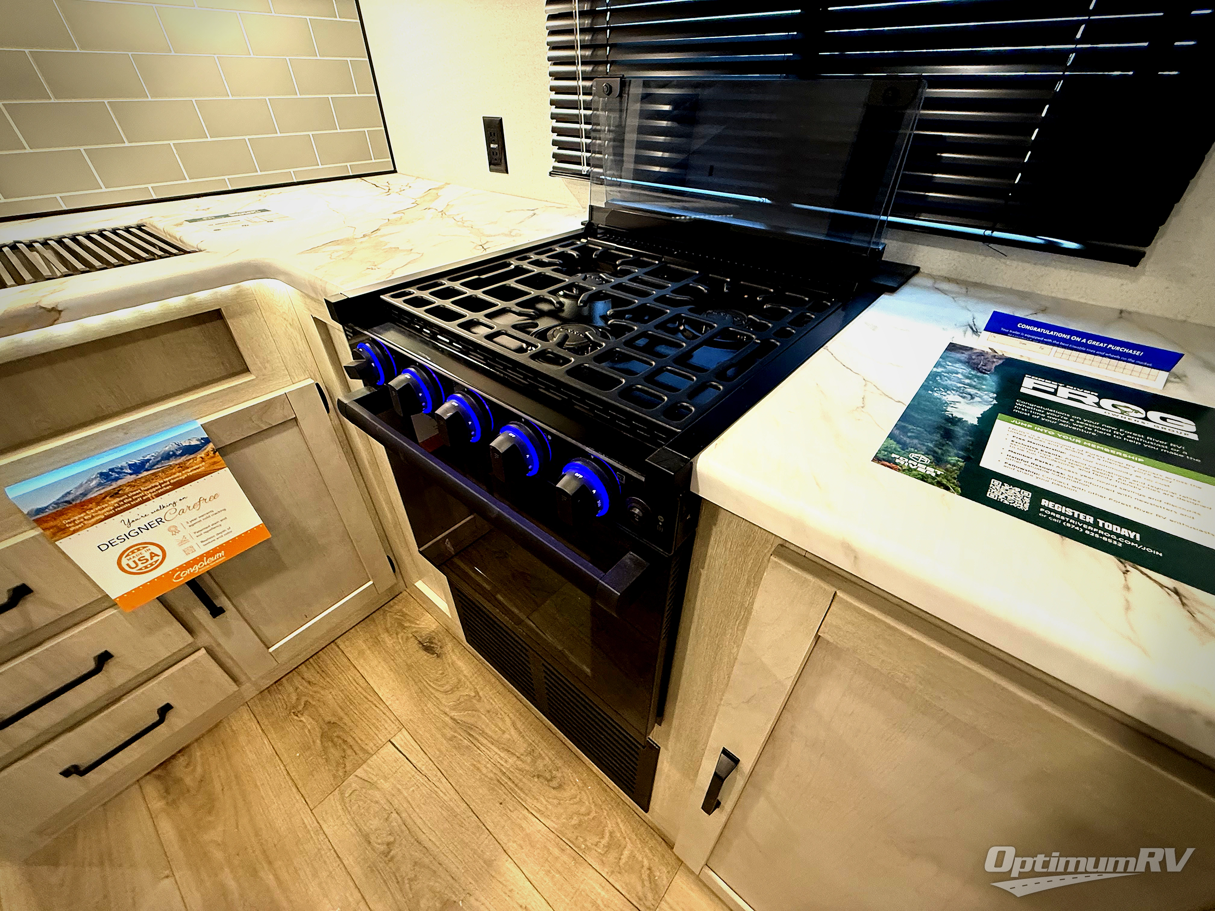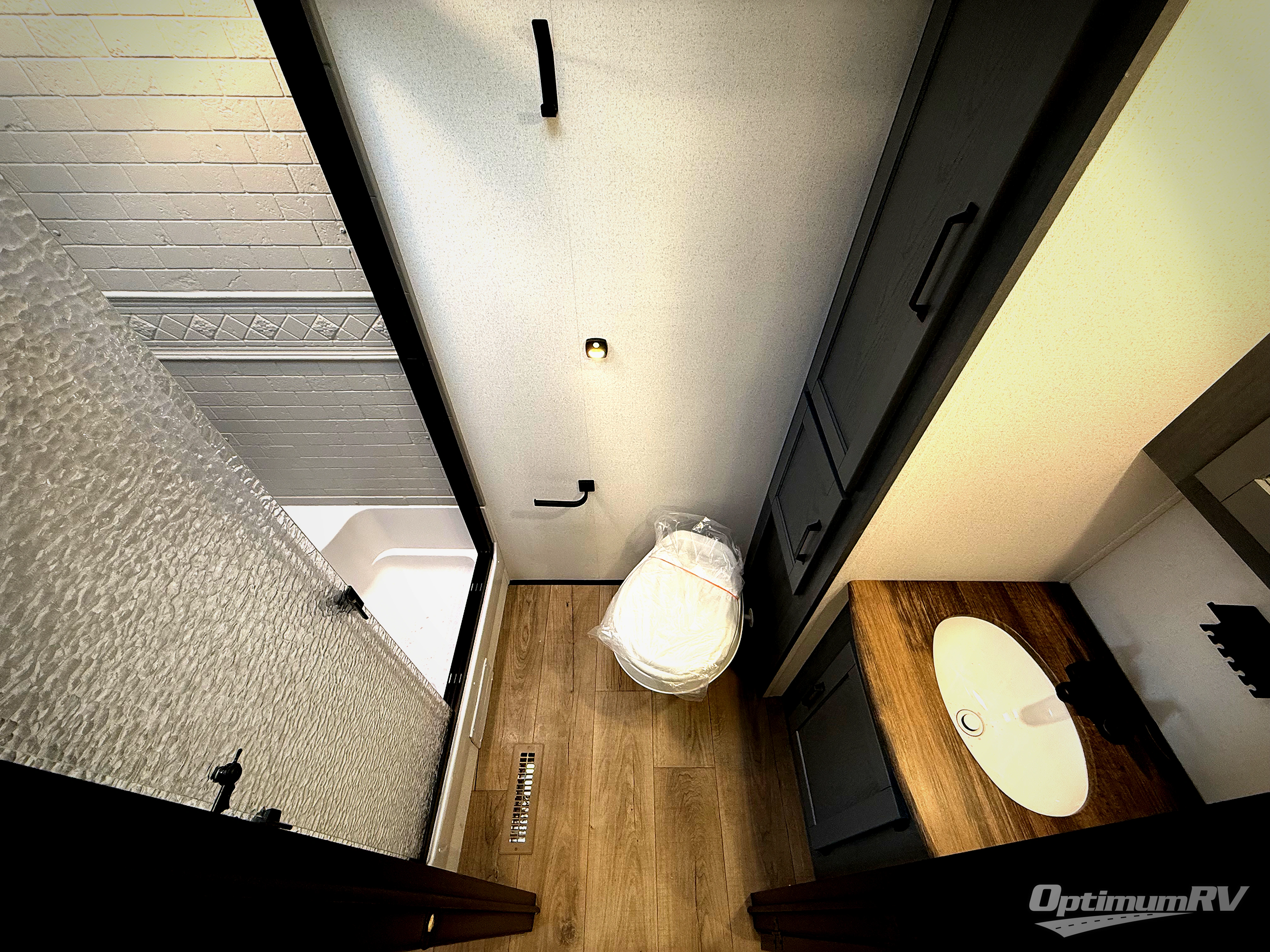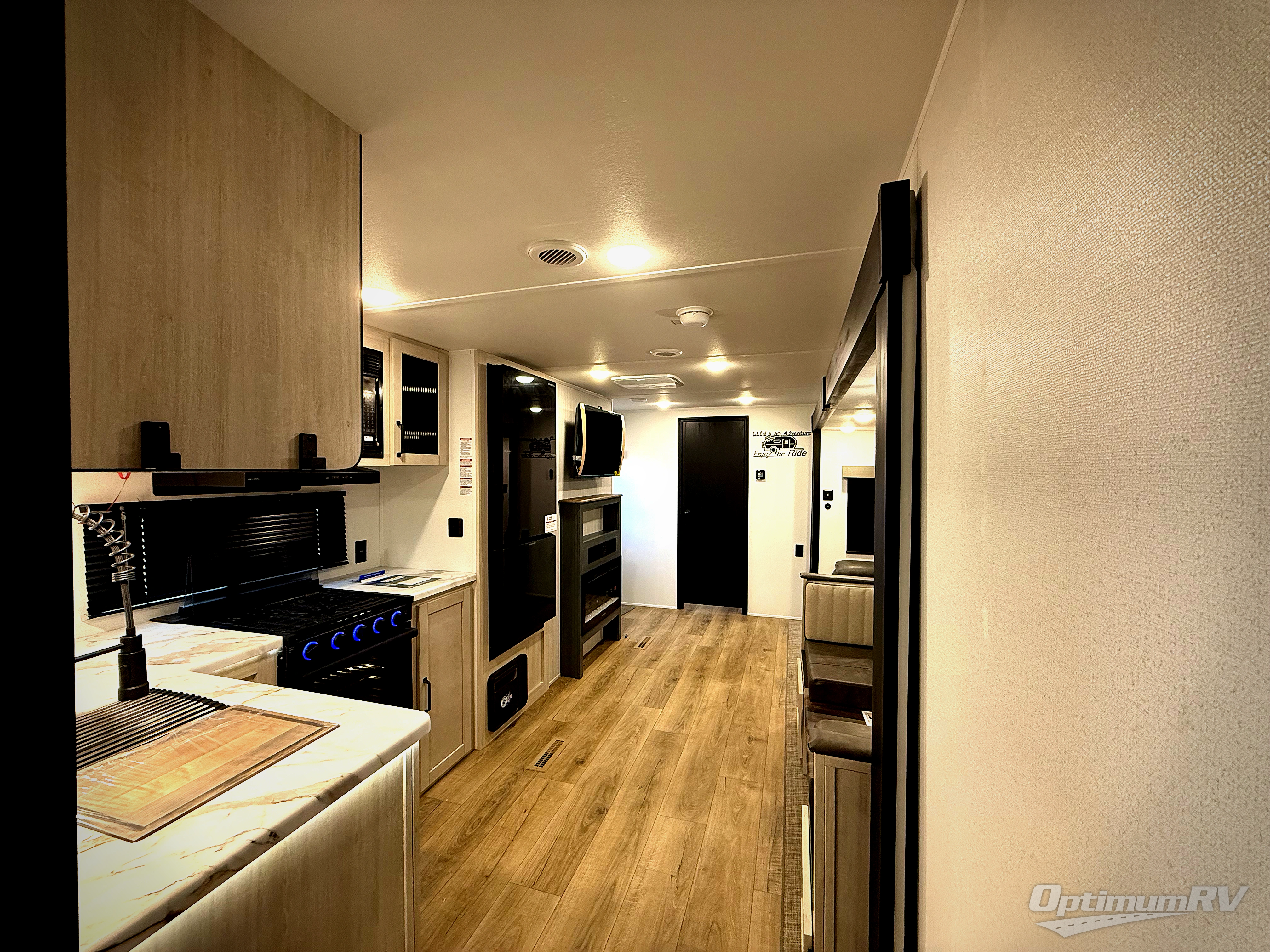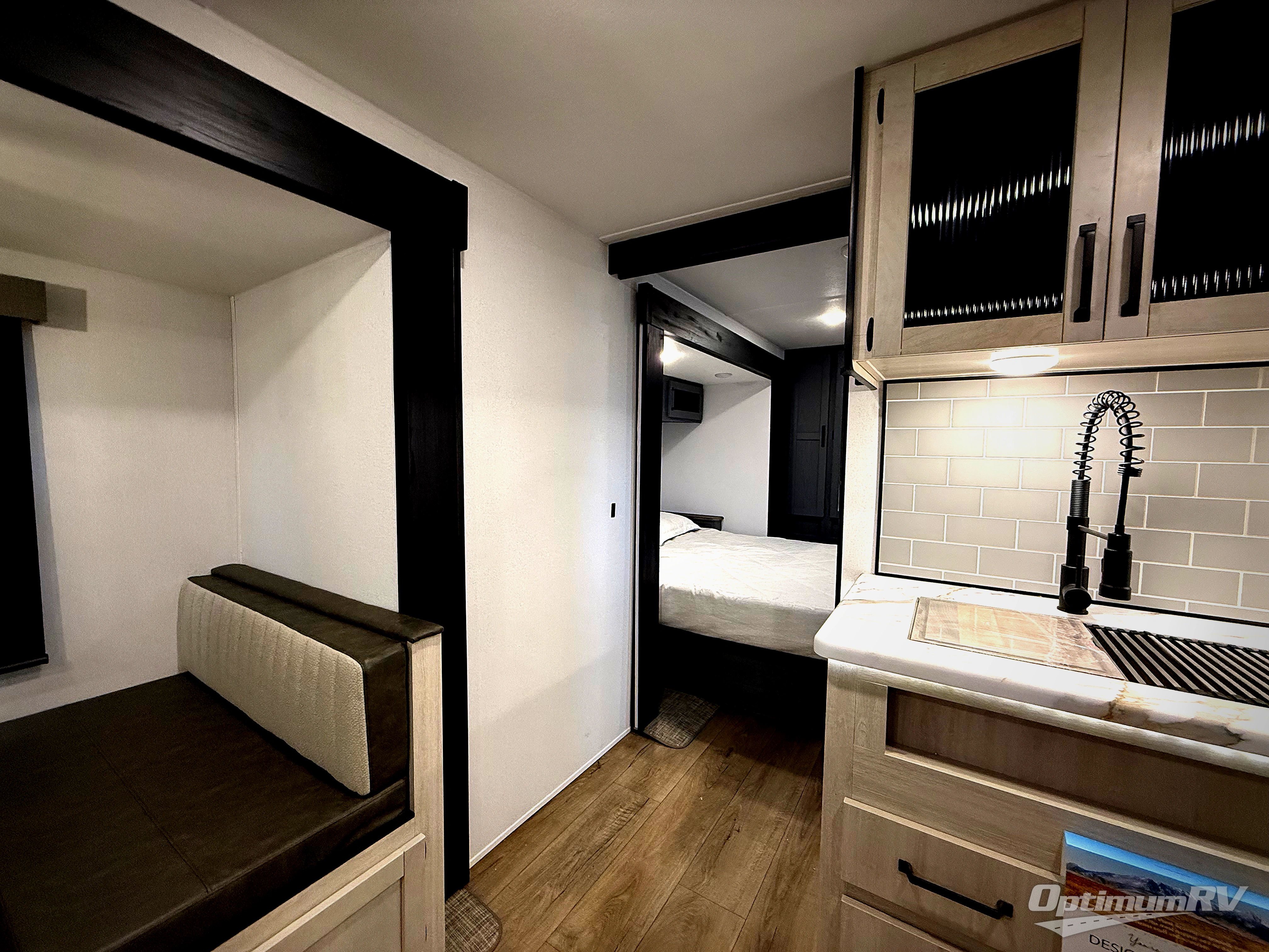 Head to the lake in this double slide out travel trailer that can sleep four to five each night. You will love having the front private bedroom all to yourselves that includes a queen bed slide out, a front wardrobe, a closet with washer and dryer prep, plus your own exterior entry door. Your guests can sleep on the sofa and booth dinette within the second slide out, and the full rear bath is tucked away for privacy. This model also includes an entryway closet/pantry for food storage and jackets, and the fireplace across from the sofa makes your space cozier. An optional outside micro kitchen is available also if you like to cook outdoors!