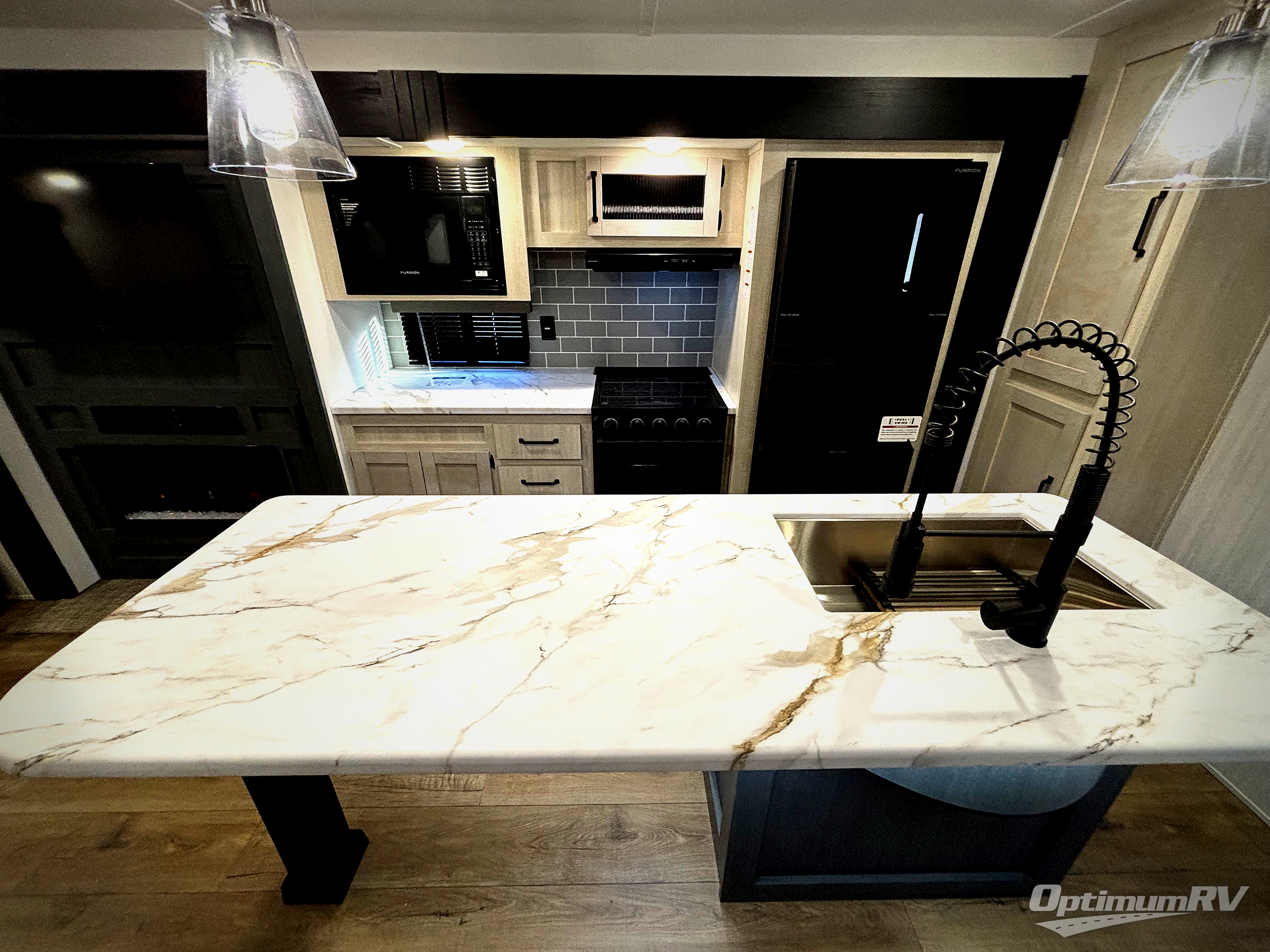 Pack your bags and head to your favorite camping spot in this spacious travel trailer. There is a front private bedroom with a queen bed, dual shirt closets, plus washer and dryer prep if you choose to add these appliances. If you have guests staying over, they can sleep on the L-shaped sofa with a theater sofa on the end. And you're sure to appreciate the hidden pantry behind the entertainment center and fireplace! A full kitchen lets you make breakfast for your crew, and there is a large kitchen island with four chairs to dine at.