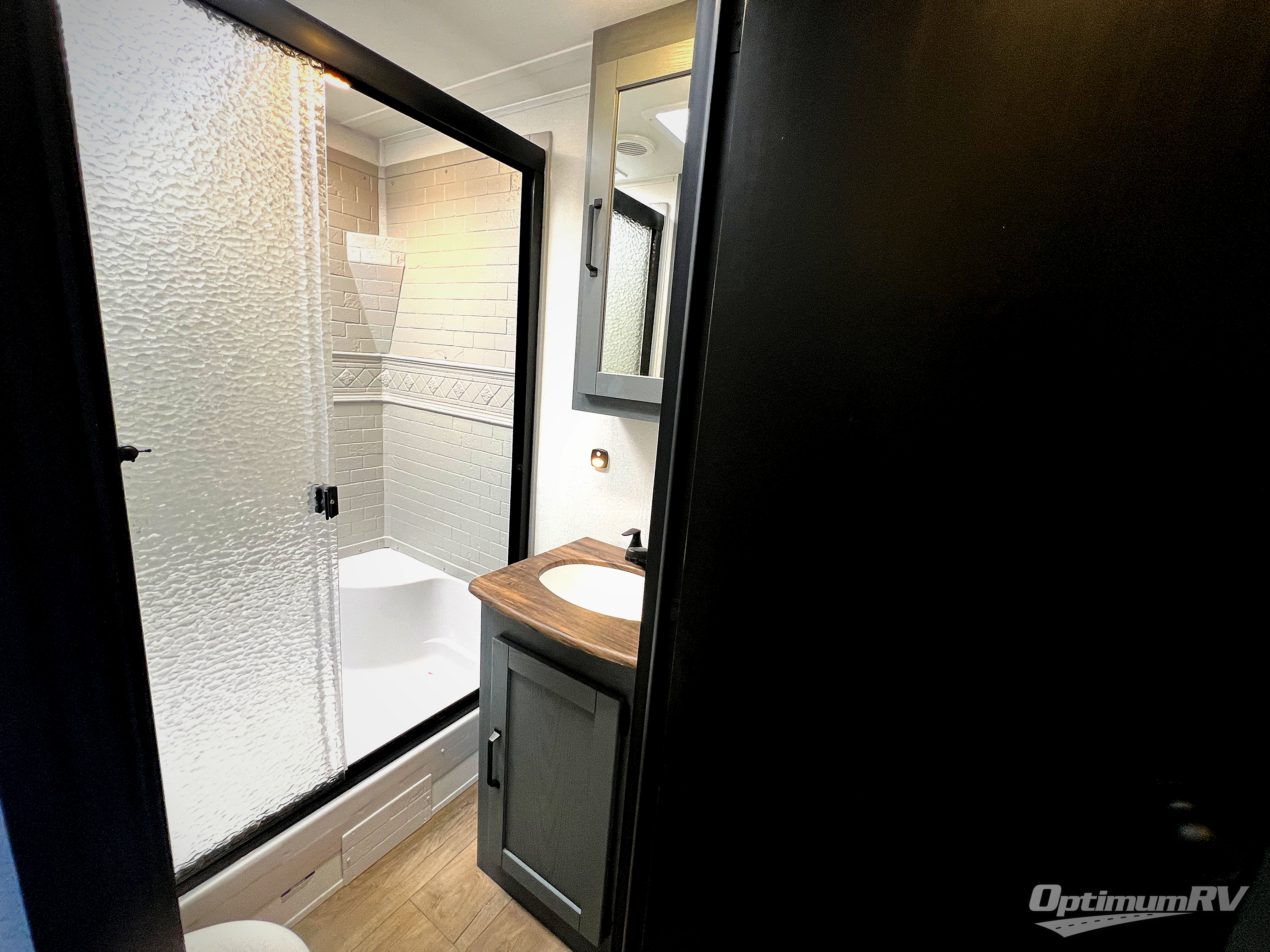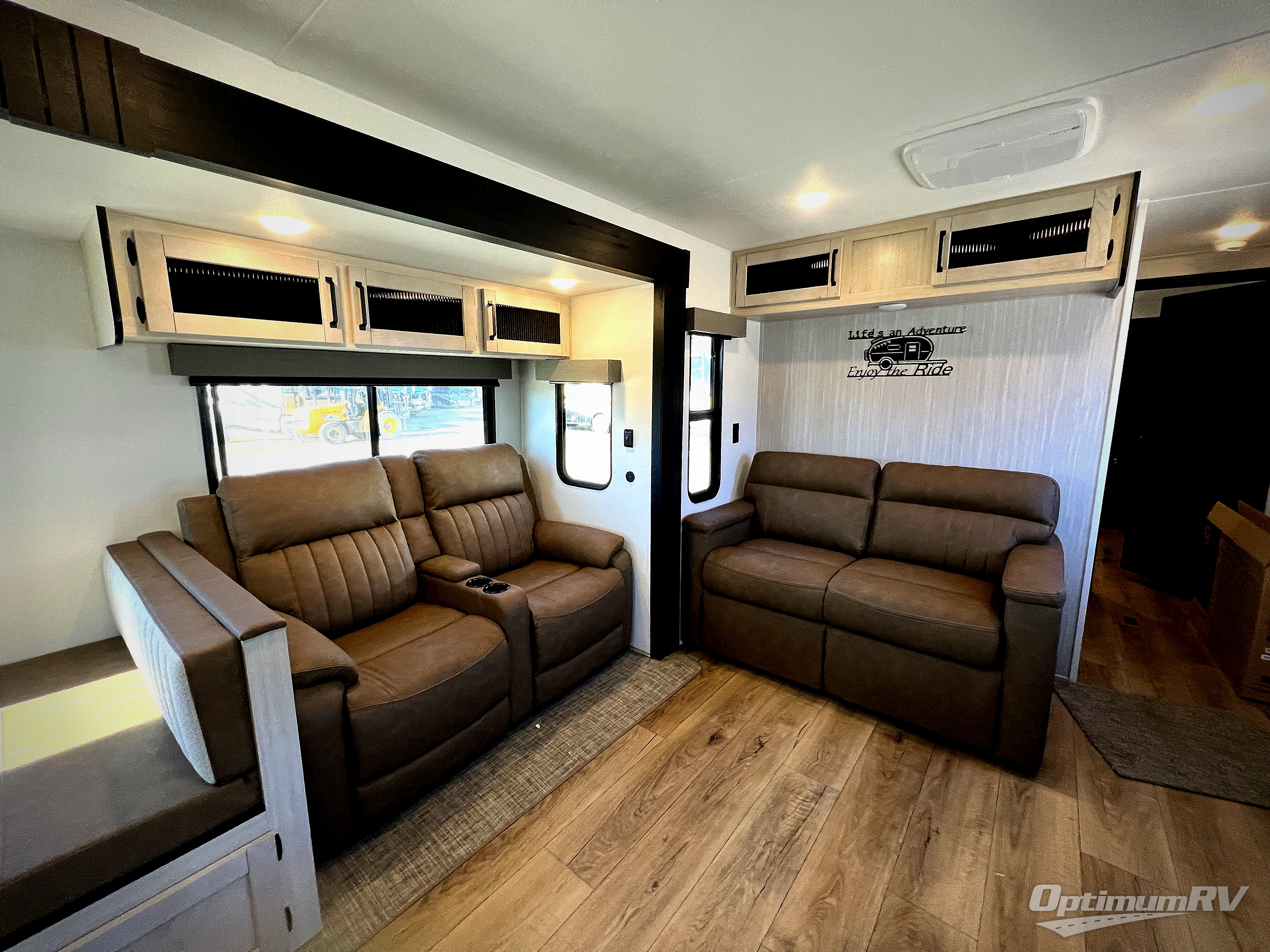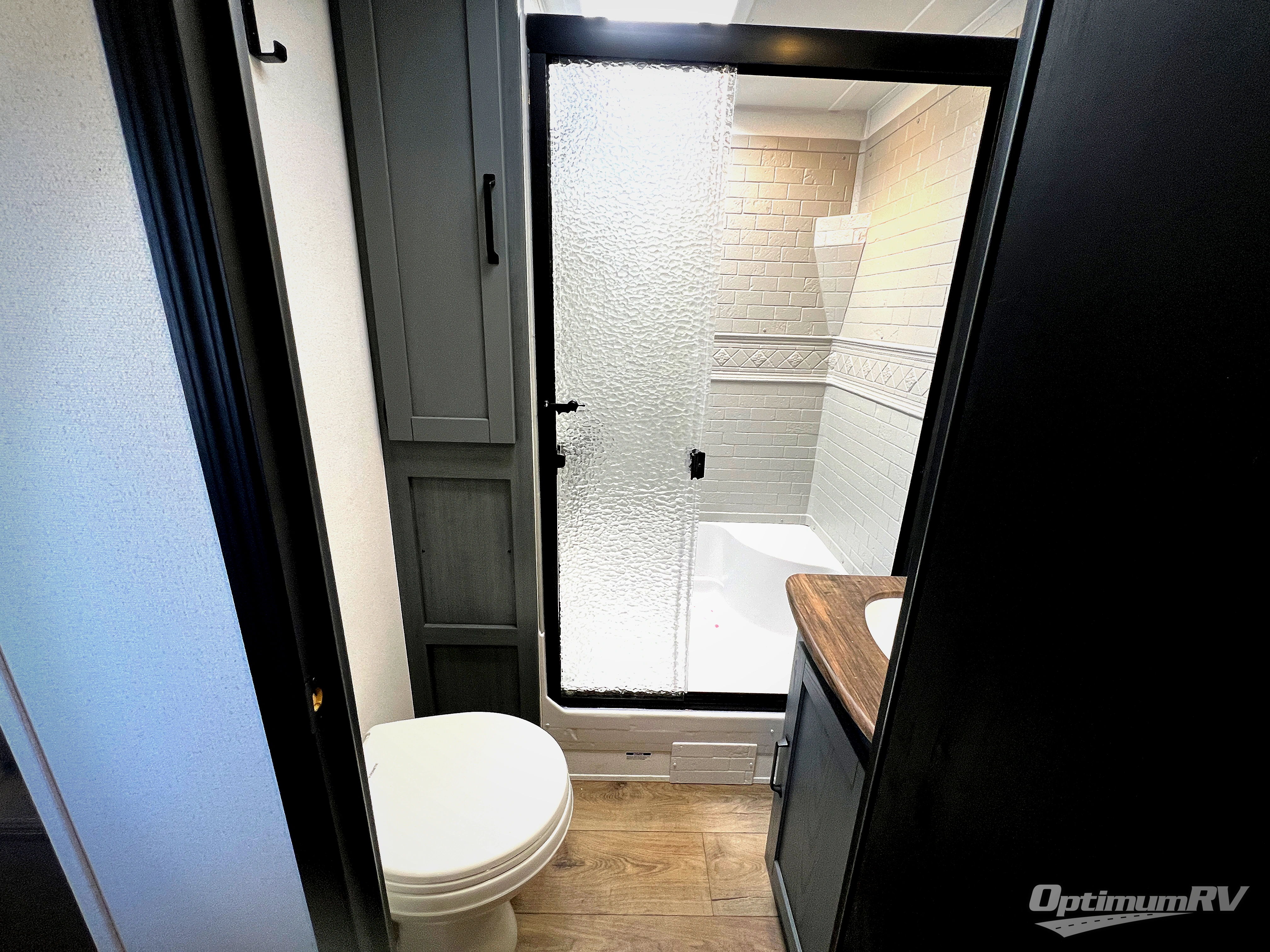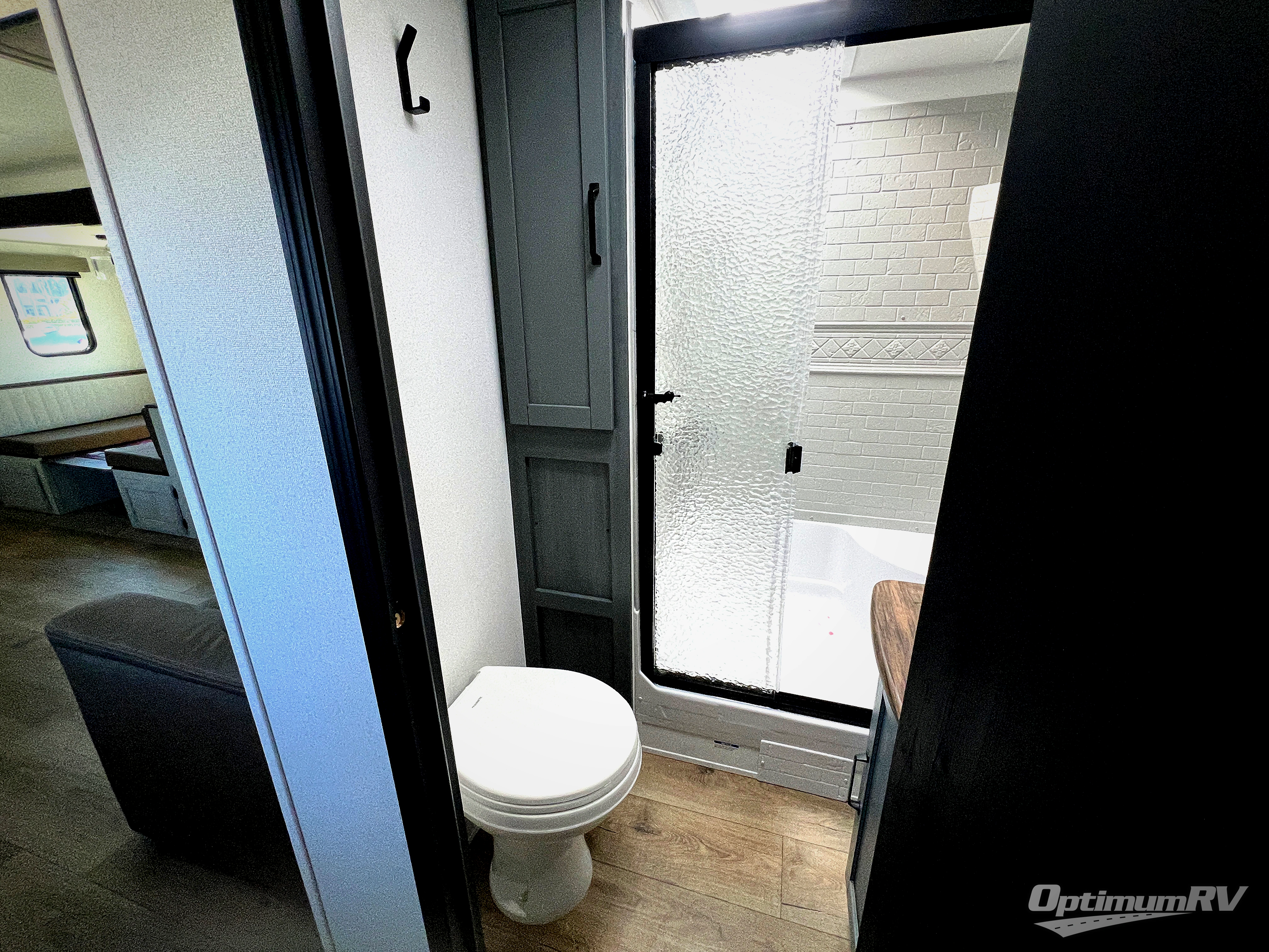 You won't want to camp any other way once you step inside this travel trailer! The rear kitchen has a stainless-steel oven and range to prepare your best meals, a 12V refrigerator to keep your perishables fresh, and a walk-in pantry for your canned goods and snacks for movie night. After a fun day at the beach, you can play a card game at the booth dinette, relax on the theater seating and sofa, or rinse the sand out of your hair in the 32" x 40" shower with a seat in the full bathroom. There is also a front private bedroom with a queen bed slide across from a dresser and a front closet with another closet with washer and dryer prep.