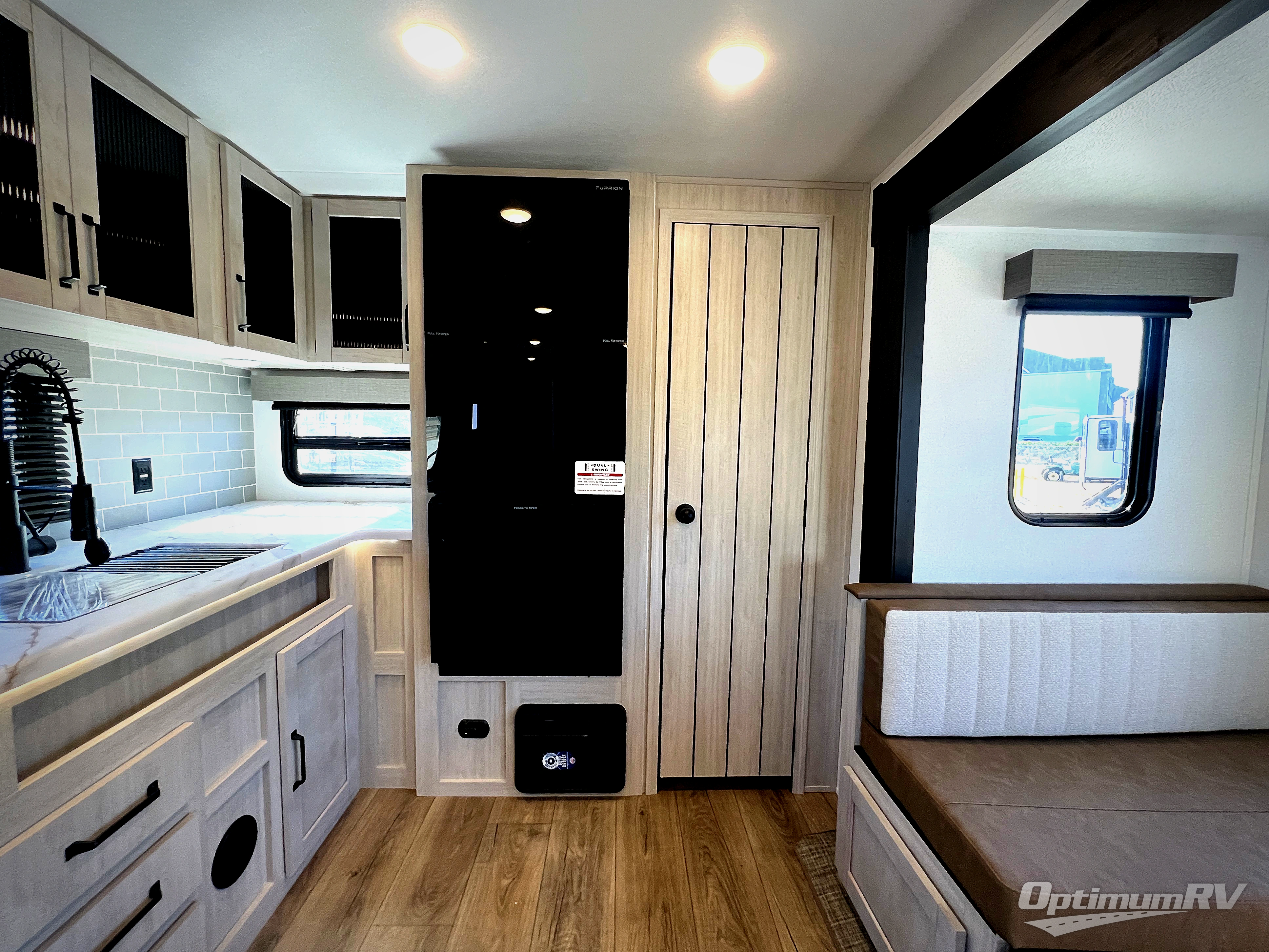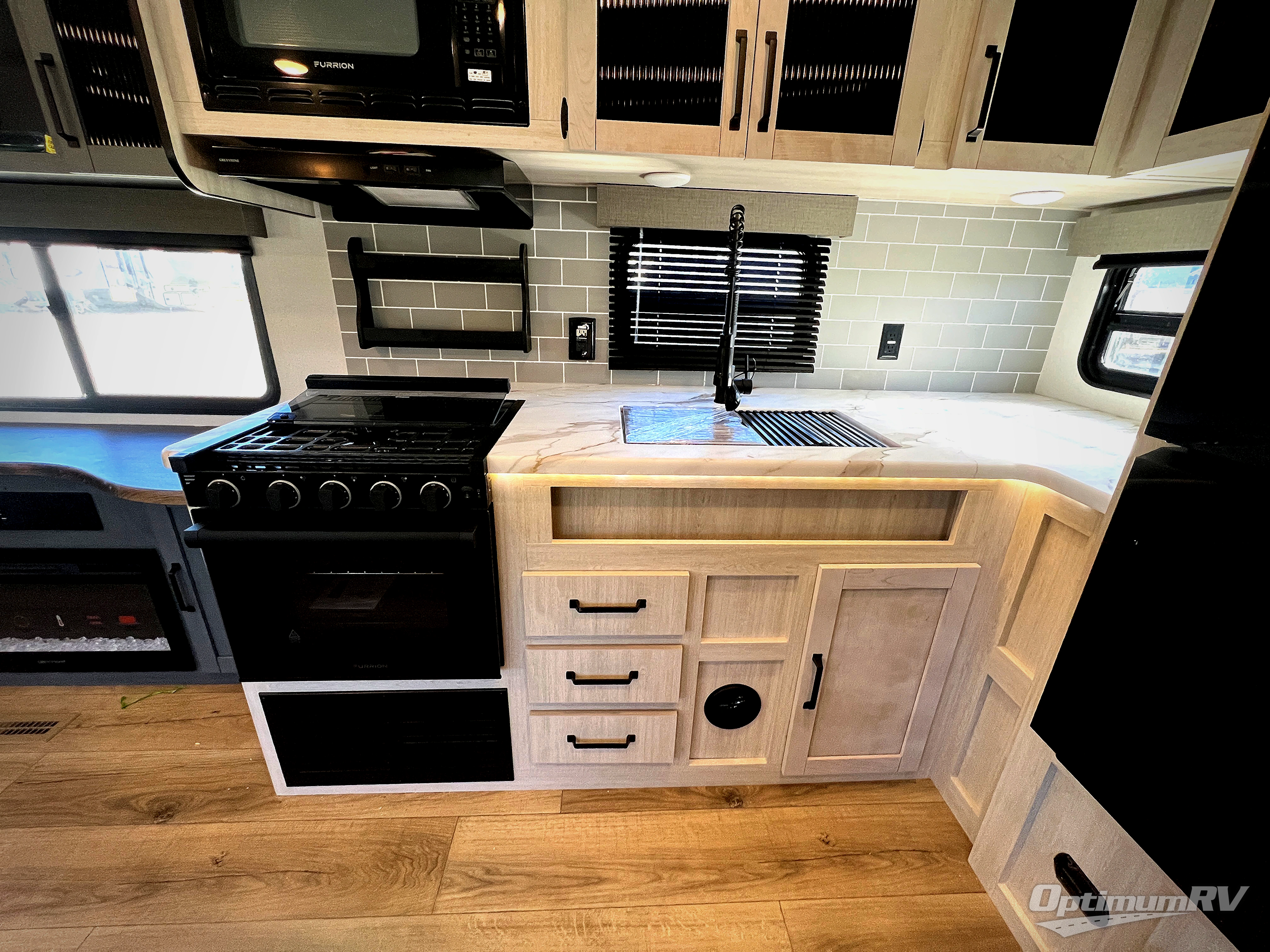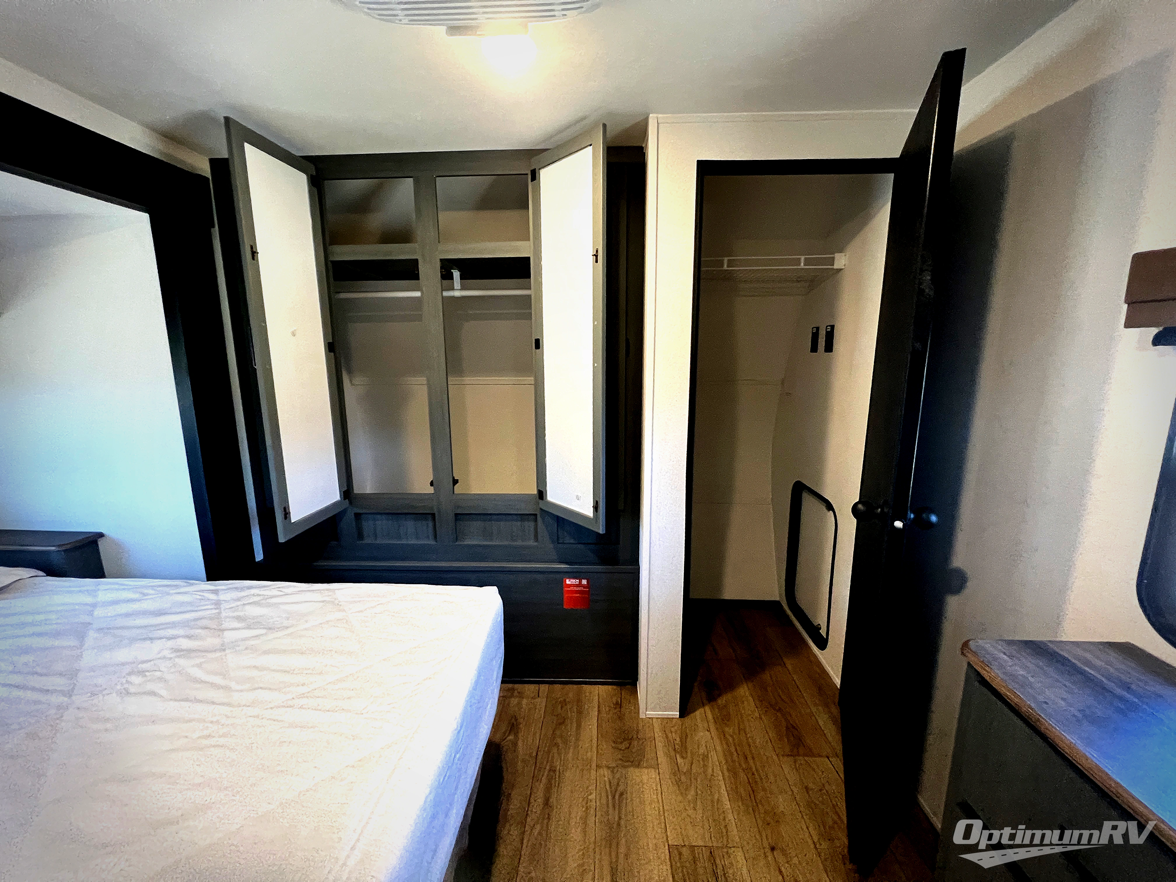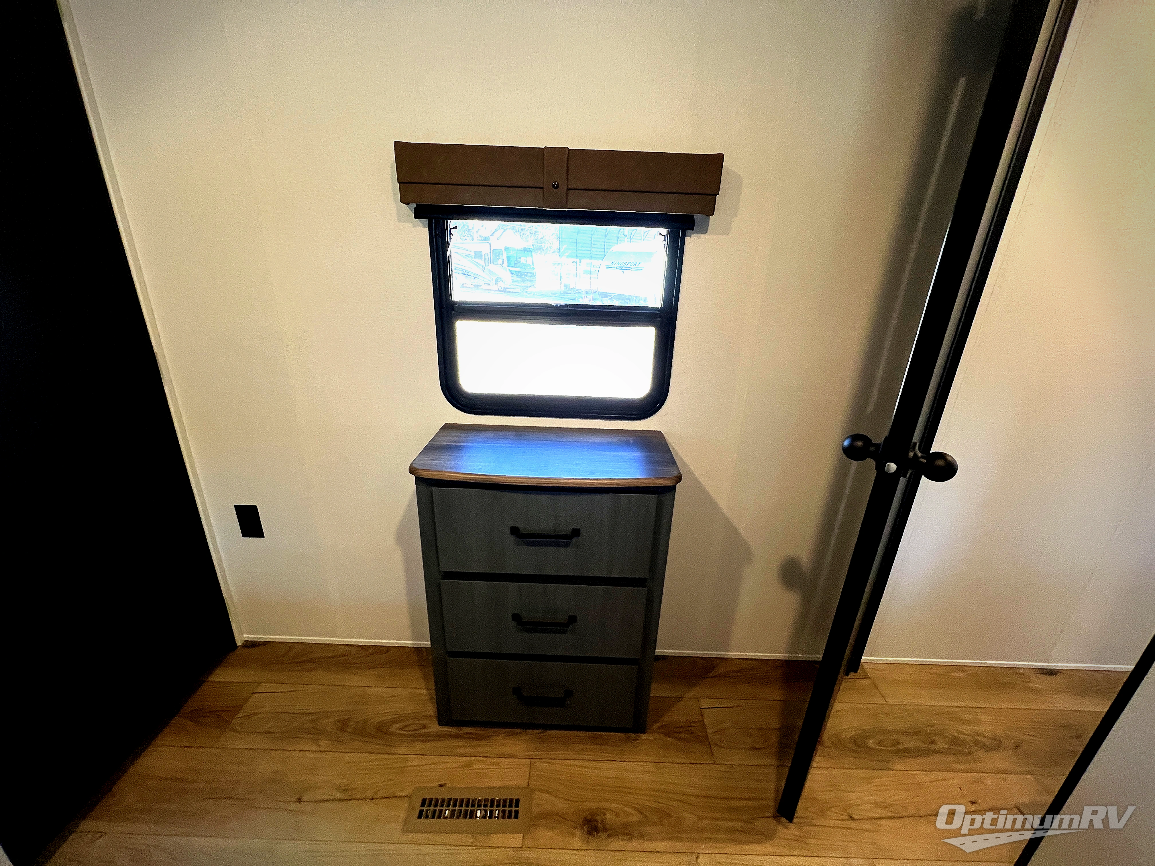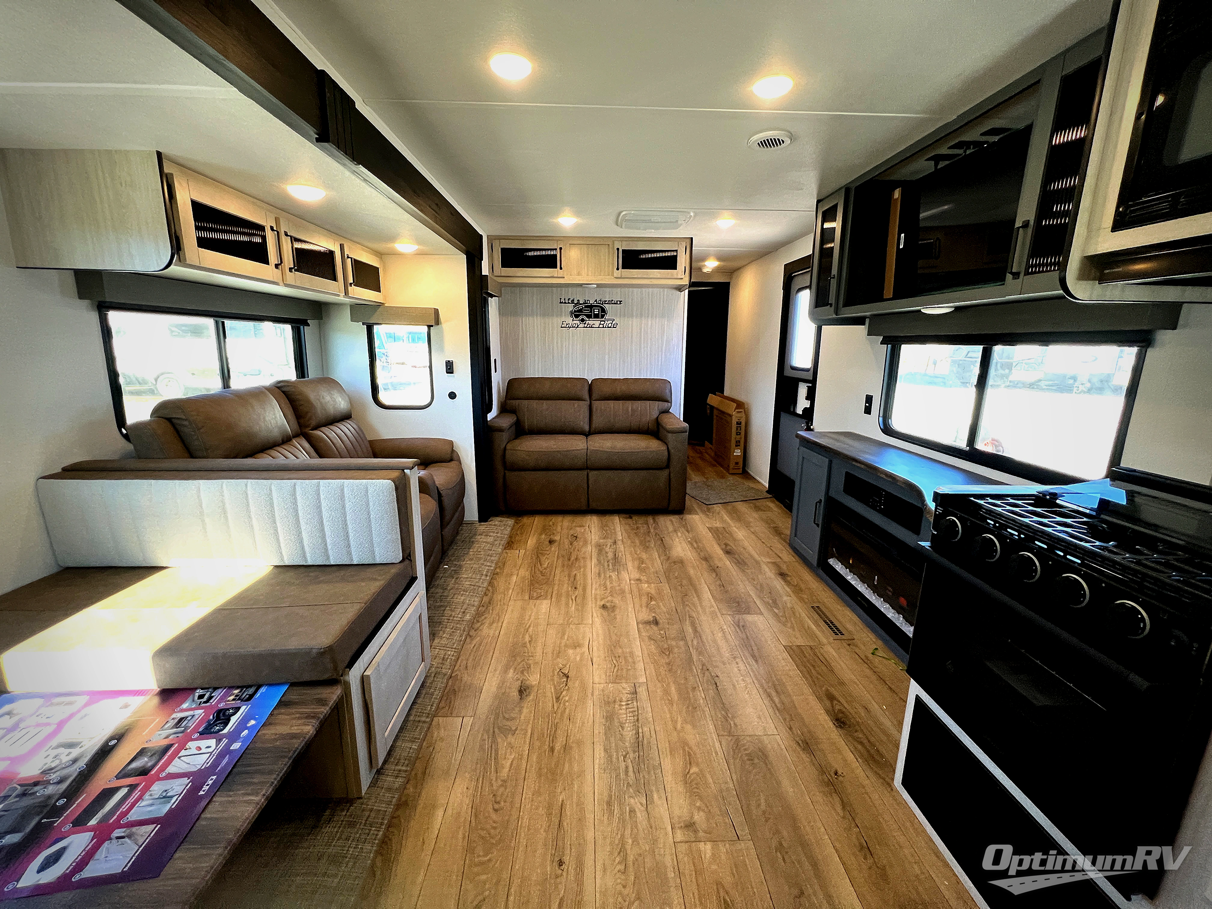 You won't want to camp any other way once you step inside this travel trailer! The rear kitchen has a stainless-steel oven and range to prepare your best meals, a 12V refrigerator to keep your perishables fresh, and a walk-in pantry for your canned goods and snacks for movie night. After a fun day at the beach, you can play a card game at the booth dinette, relax on the theater seating and sofa, or rinse the sand out of your hair in the 32" x 40" shower with a seat in the full bathroom. There is also a front private bedroom with a queen bed slide across from a dresser and a front closet with another closet with washer and dryer prep.