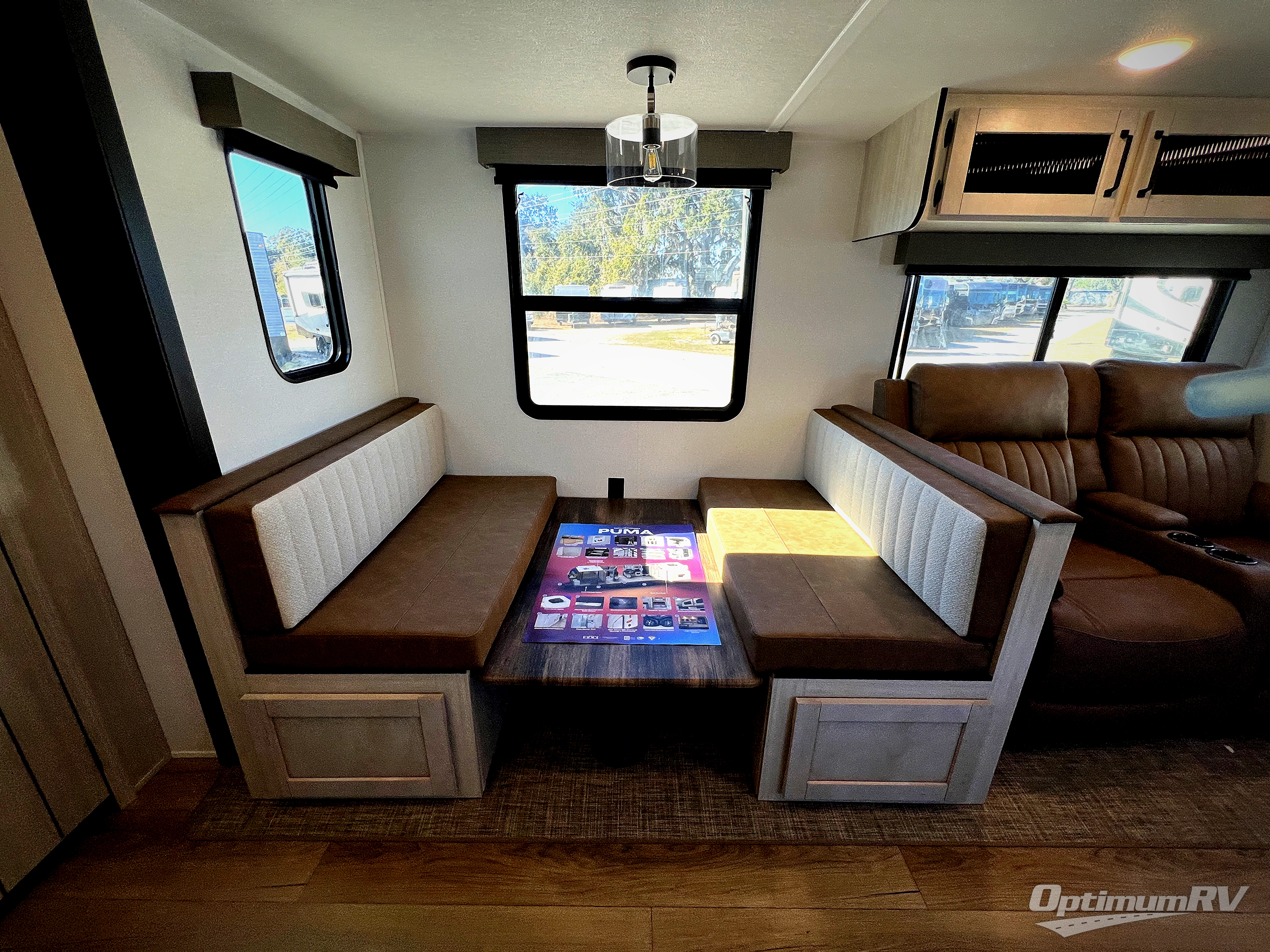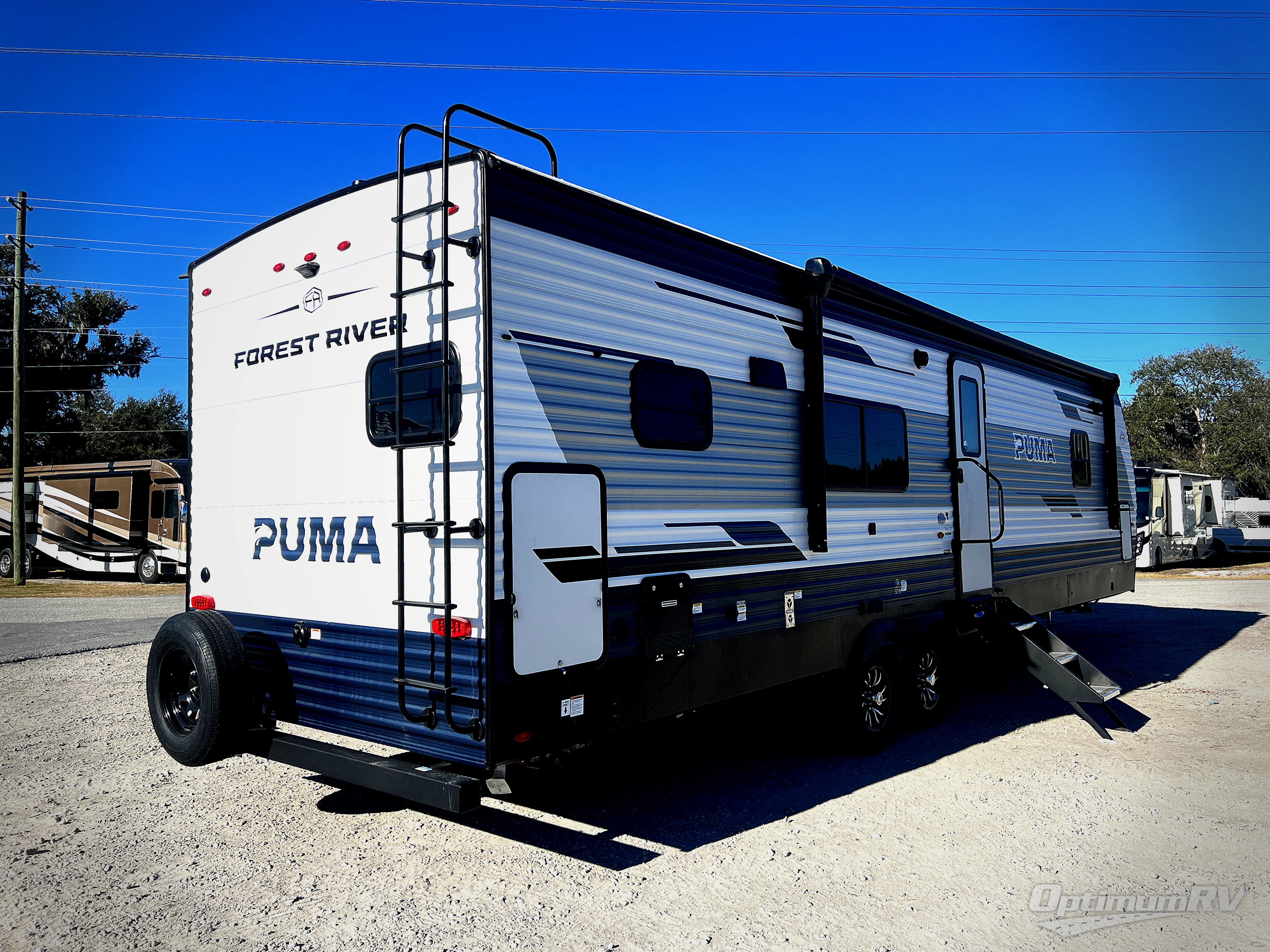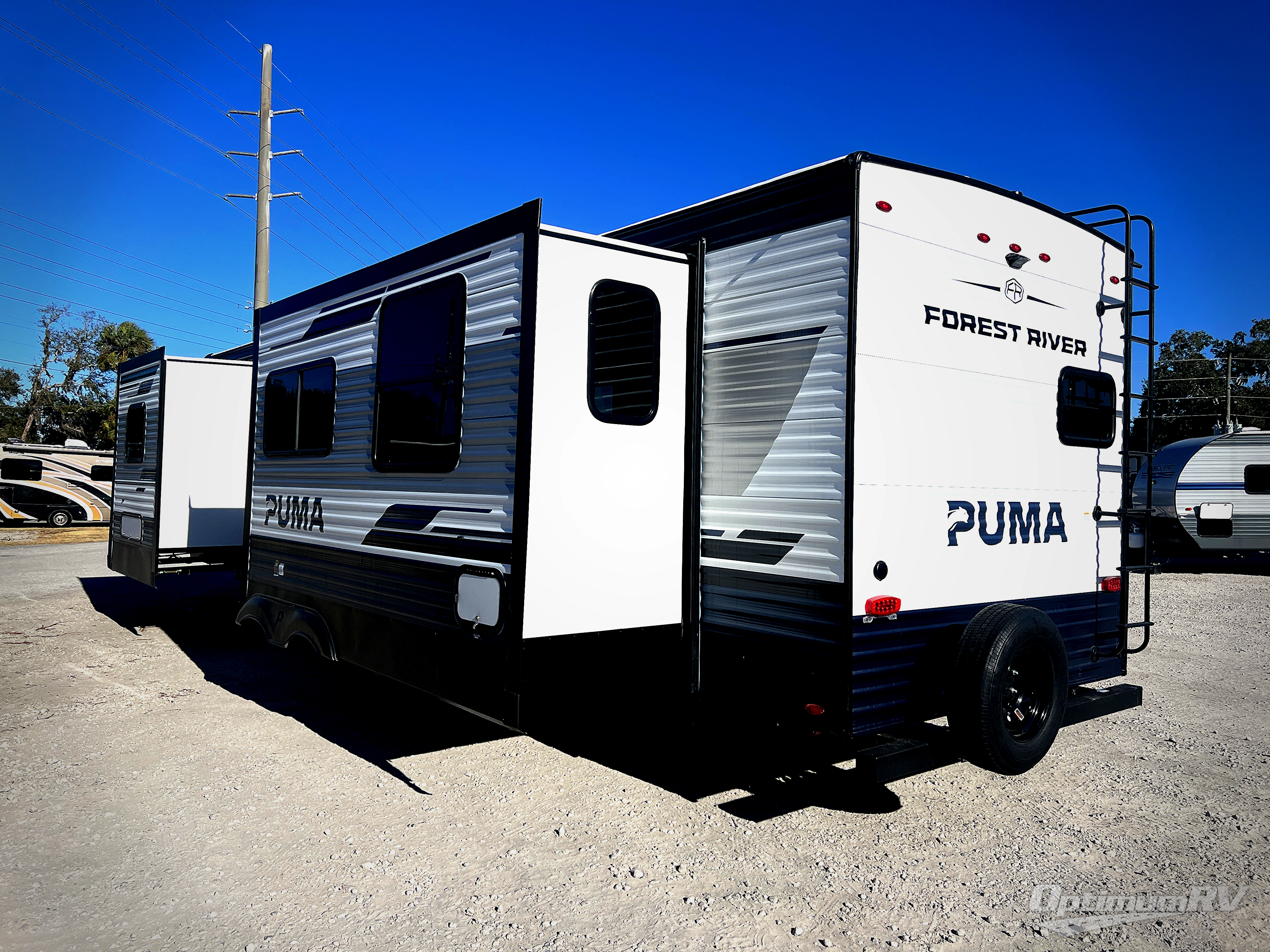 If you're looking for family-fun adventures, then you need one of these Forest River Puma travel trailers! They are built rugged, easy to tow, and jam packed with features. The Darco wrapped underbelly will help protect your unit, and the roof and side mount solar prep gives you the option to add off-grid power. Inside, the Congoleum linoleum will be easy to keep clean, and the night roller shades will provide privacy when it's time to turn in. You'll also enjoy an electric awning with an LED light strip plus an AM/FM/Bluetooth stereo and two outside speakers to keep the party going!
