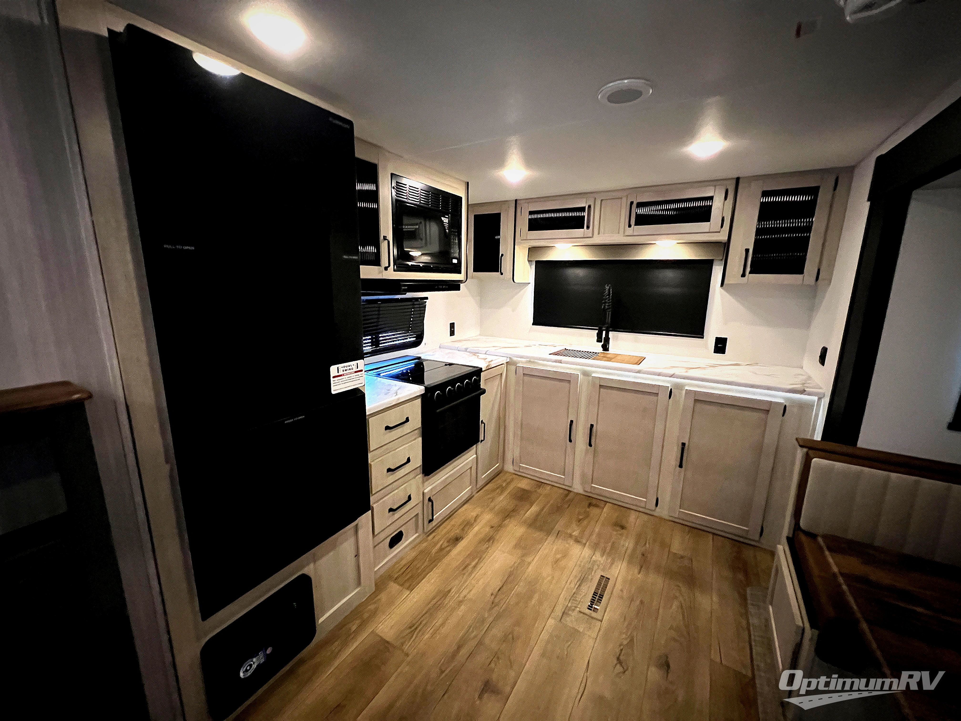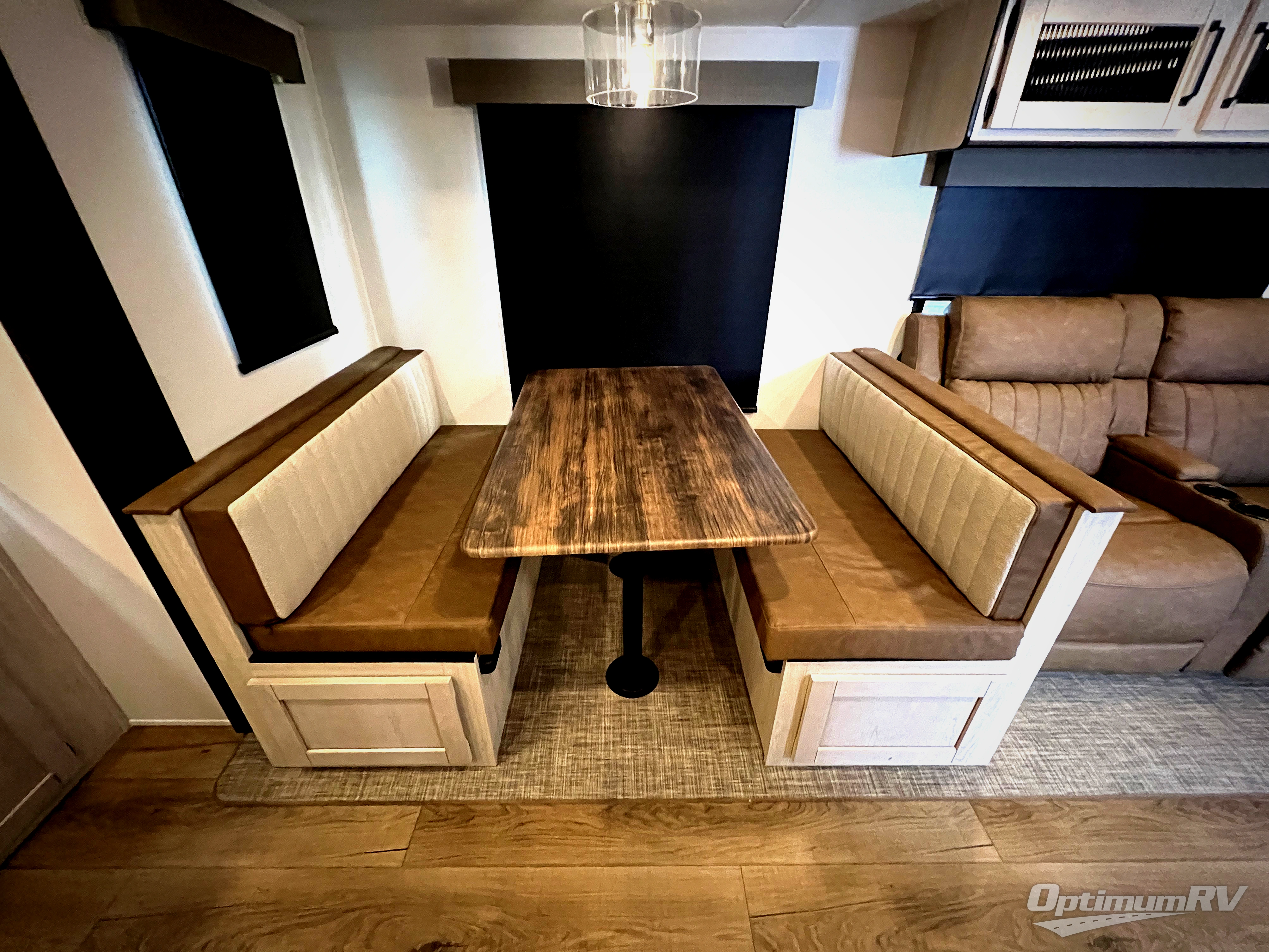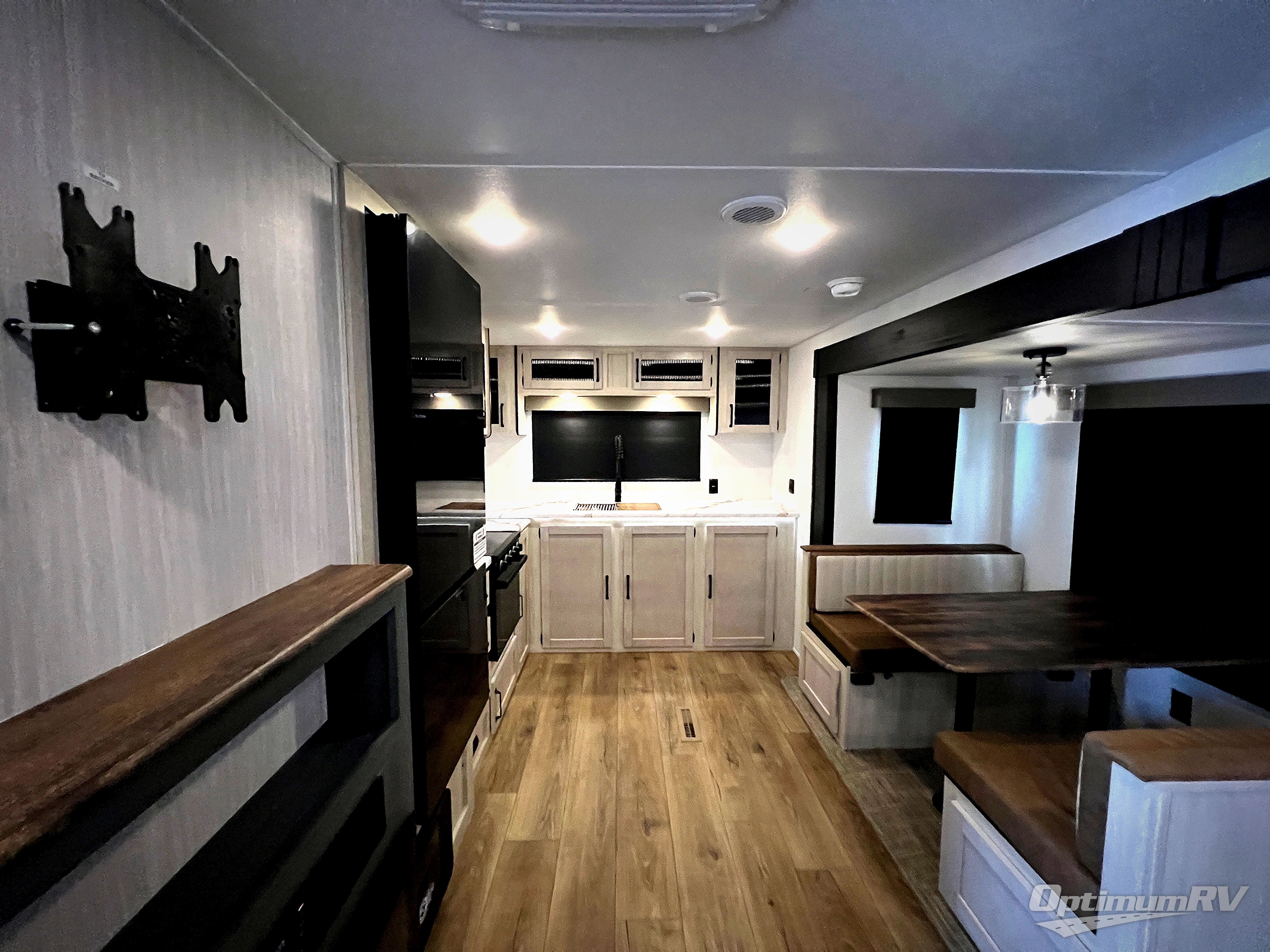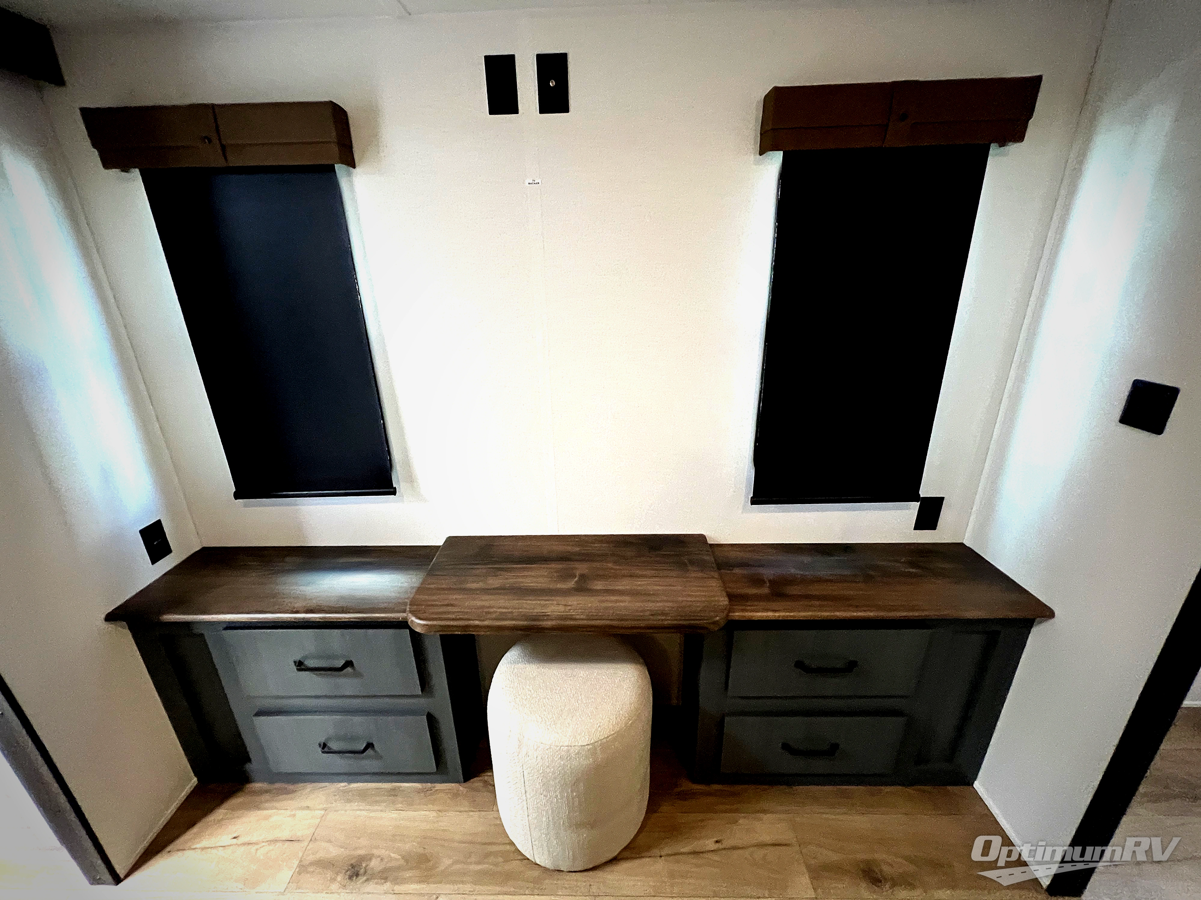 You'll love camping in this double slide out travel trailer with a rear kitchen and a spacious front bath! There is a 40" shower here, along with a linen closet, shirt closet, plus a closet with washer/dryer prep. The master bedroom includes a king bed slide out, dual bedroom dressers, a desk and a TV hookup if you want the option to watch movies in bed. The combined kitchen and living area is made open by the large slide out, which houses the sofa and booth dinette. These pieces of furniture area conveniently across from the entertainment center and fireplace to make it feel more like home. The chef of your group will appreciate generous counter space in the rear kitchen, and if they like to cook outdoors, and optional mini kitchen with a griddle can be added!