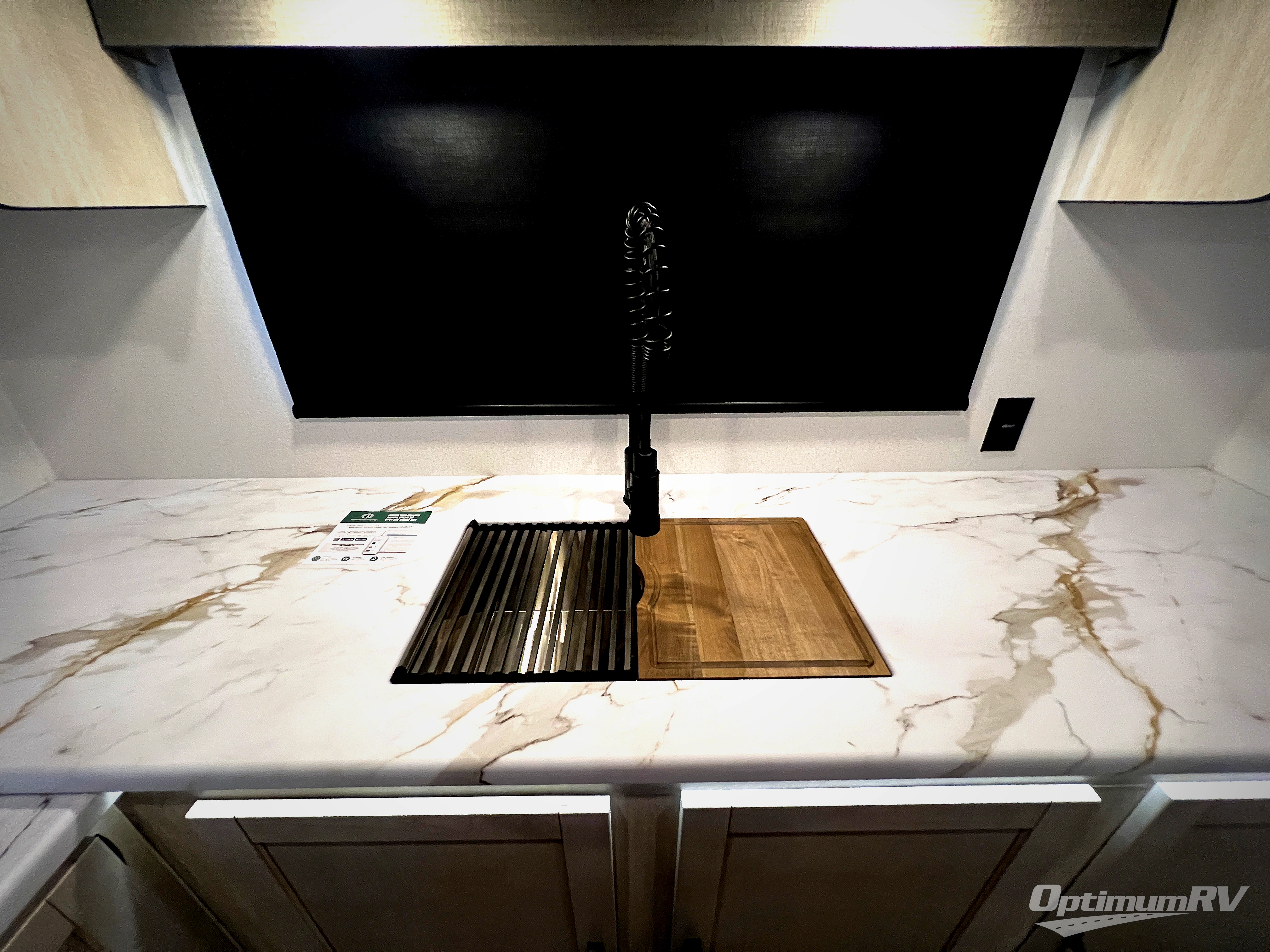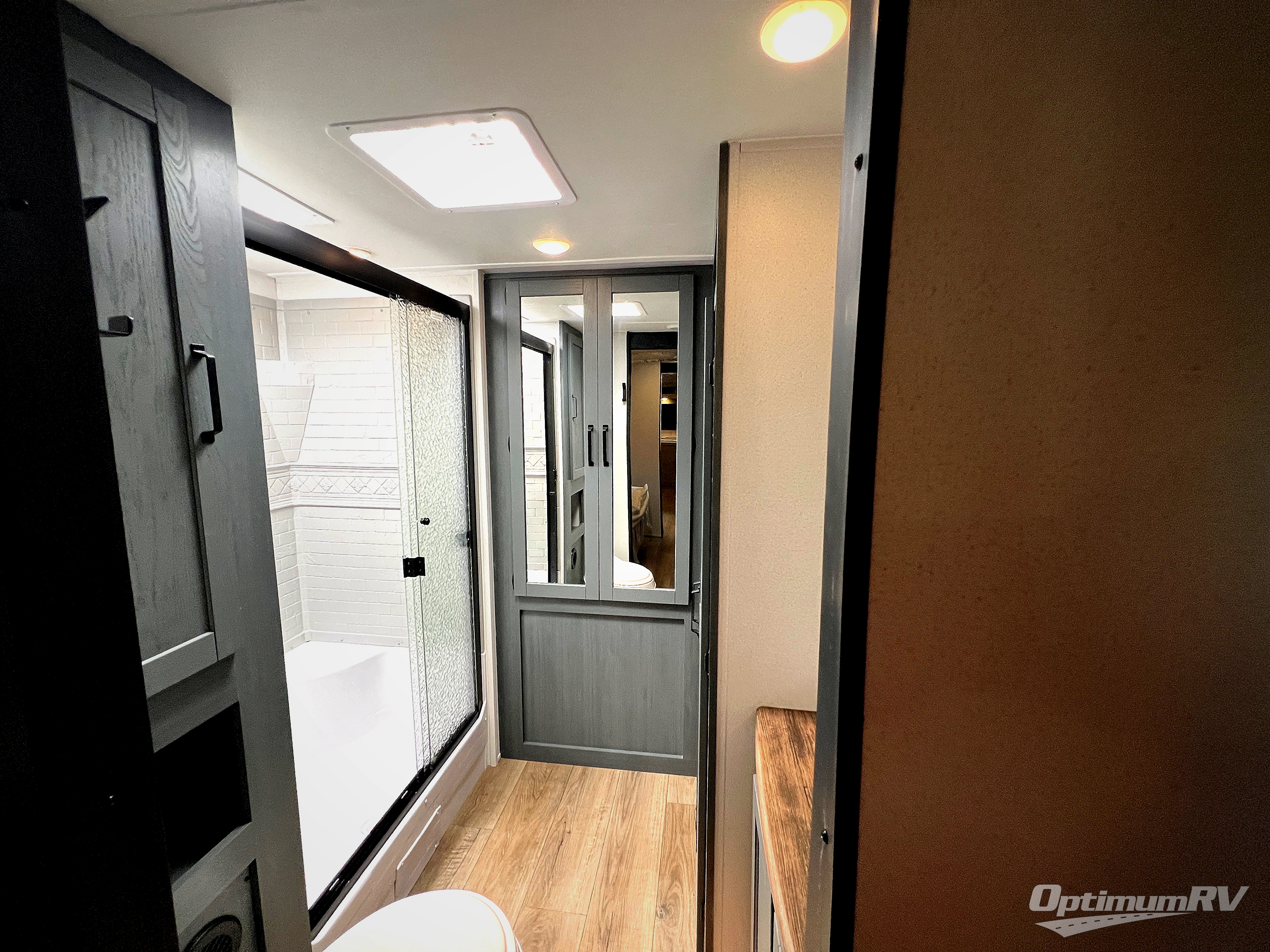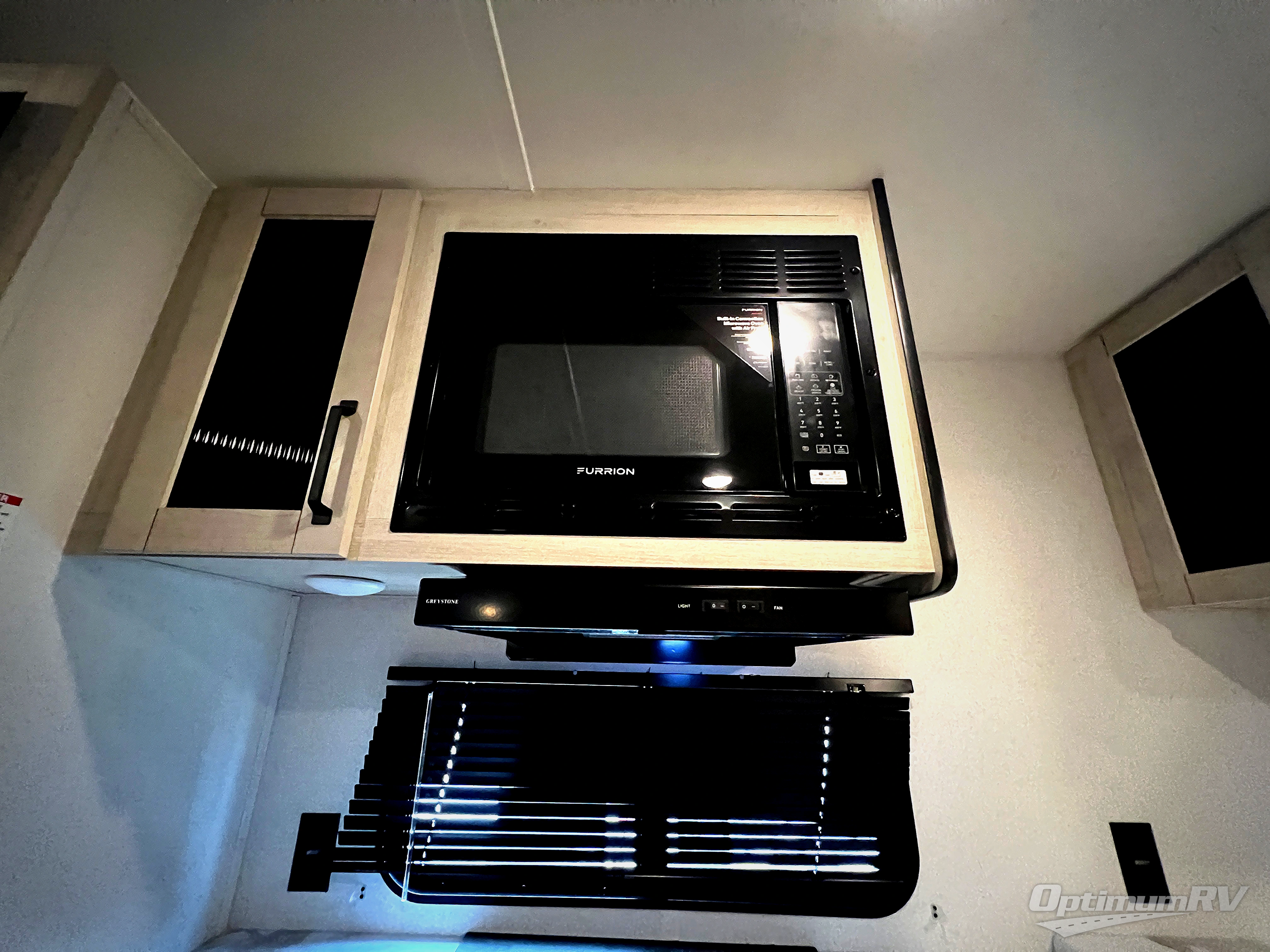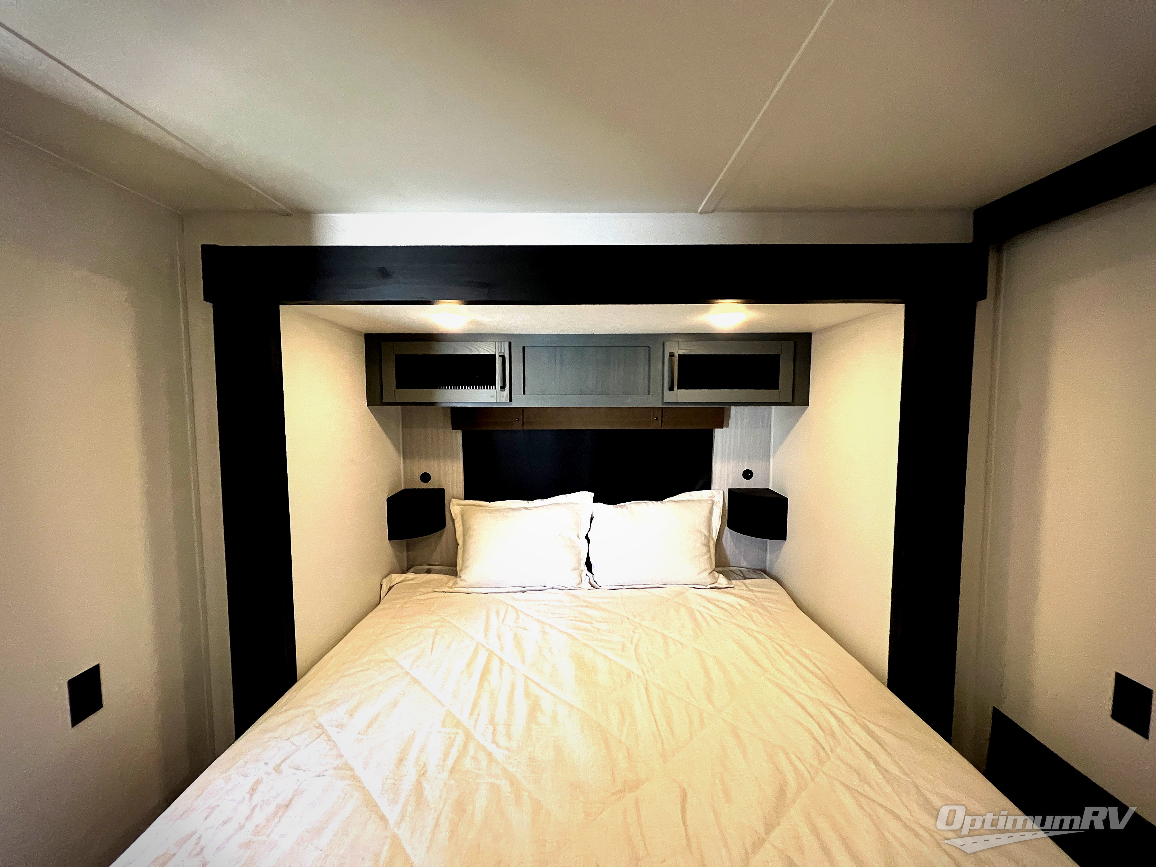 You'll love camping in this double slide out travel trailer with a rear kitchen and a spacious front bath! There is a 40" shower here, along with a linen closet, shirt closet, plus a closet with washer/dryer prep. The master bedroom includes a king bed slide out, dual bedroom dressers, a desk and a TV hookup if you want the option to watch movies in bed. The combined kitchen and living area is made open by the large slide out, which houses the sofa and booth dinette. These pieces of furniture area conveniently across from the entertainment center and fireplace to make it feel more like home. The chef of your group will appreciate generous counter space in the rear kitchen, and if they like to cook outdoors, and optional mini kitchen with a griddle can be added!