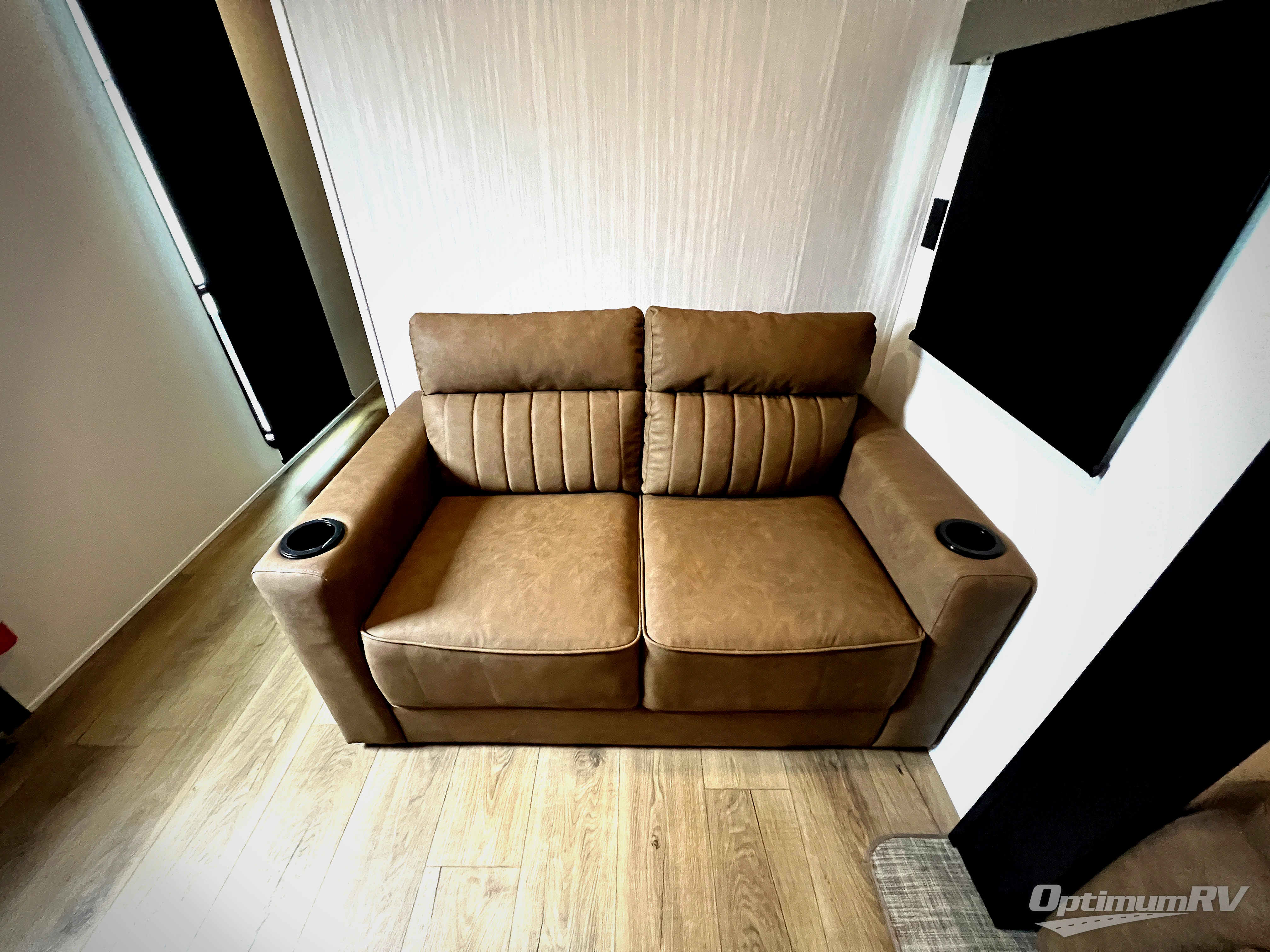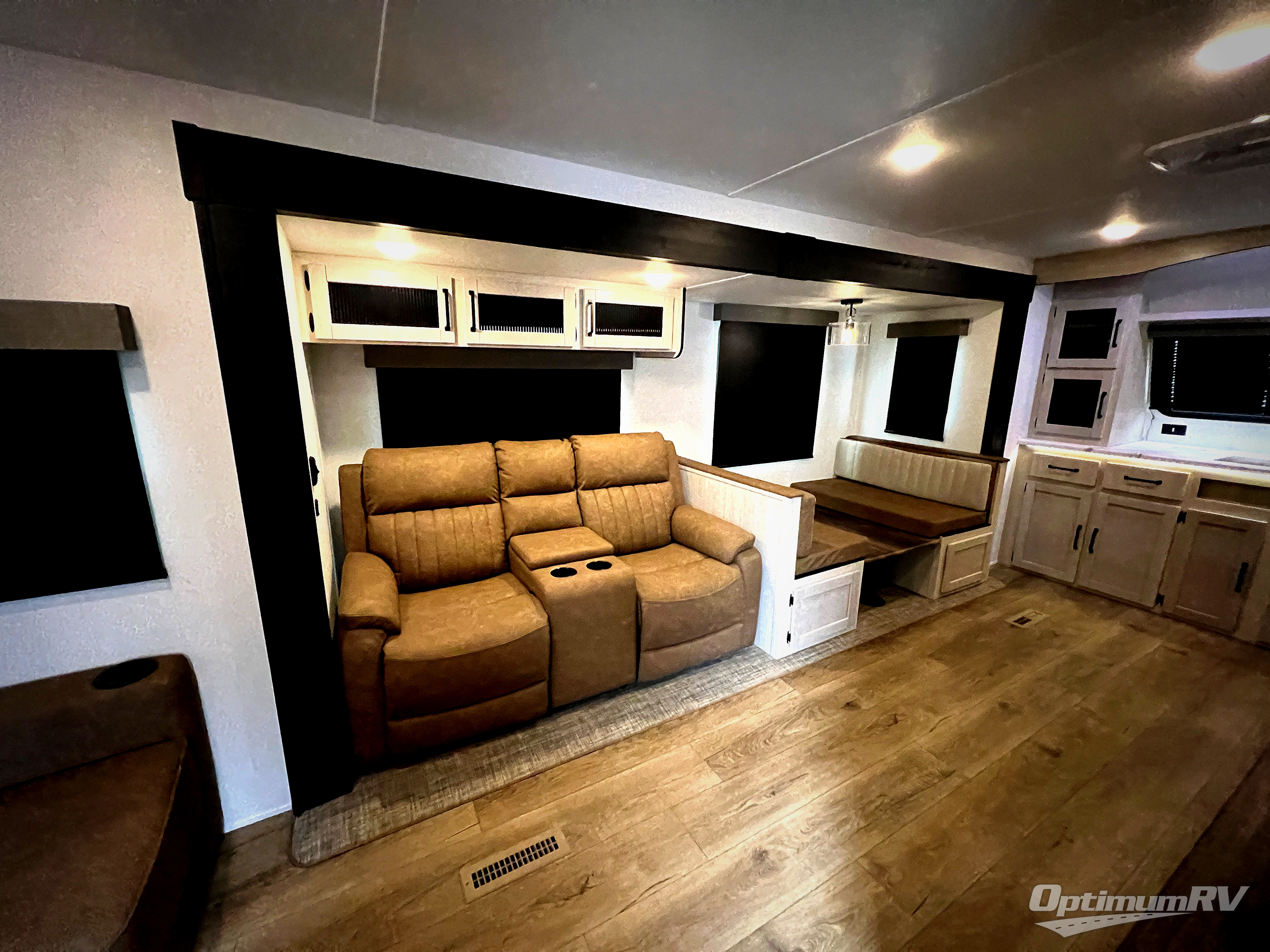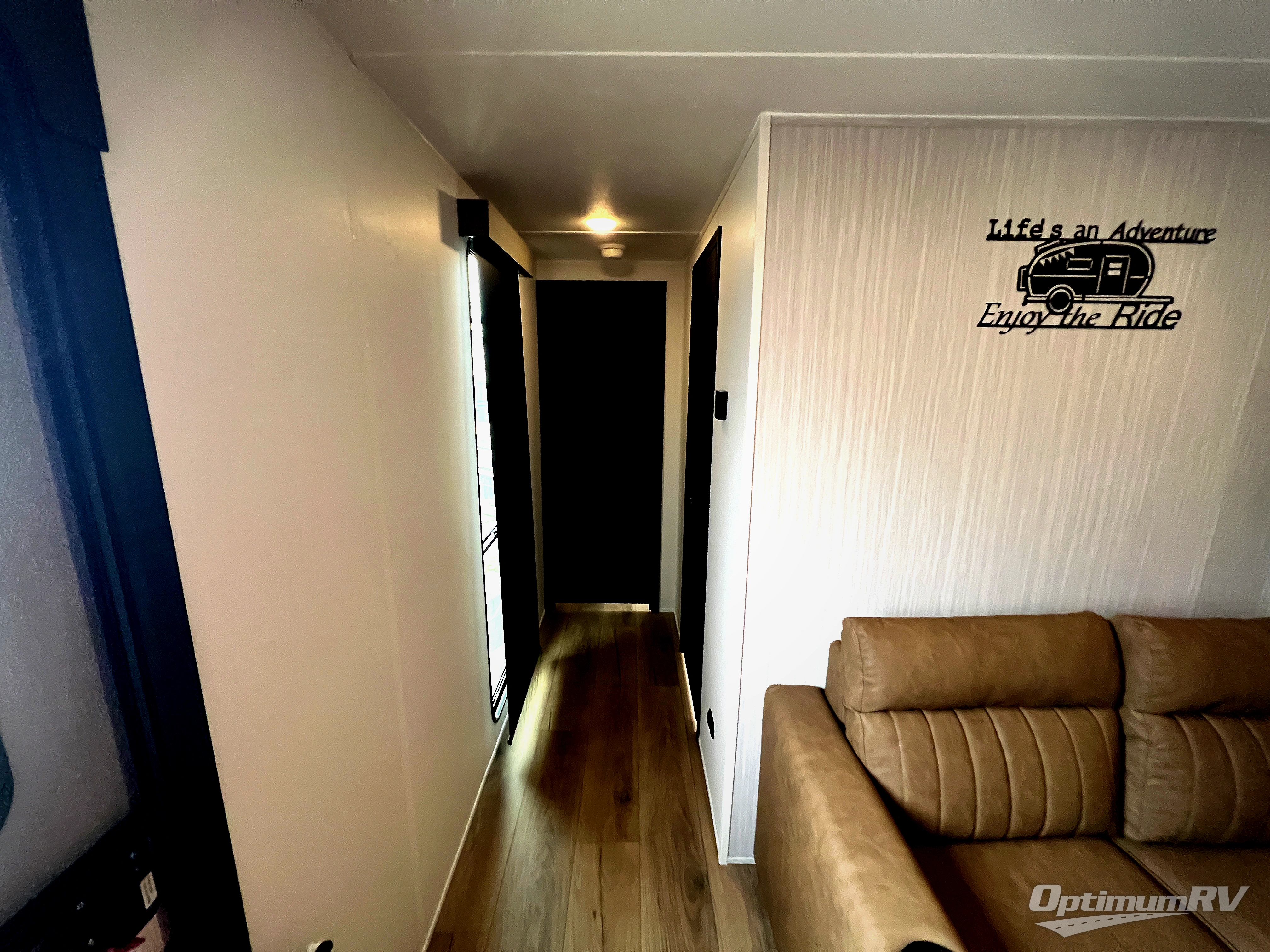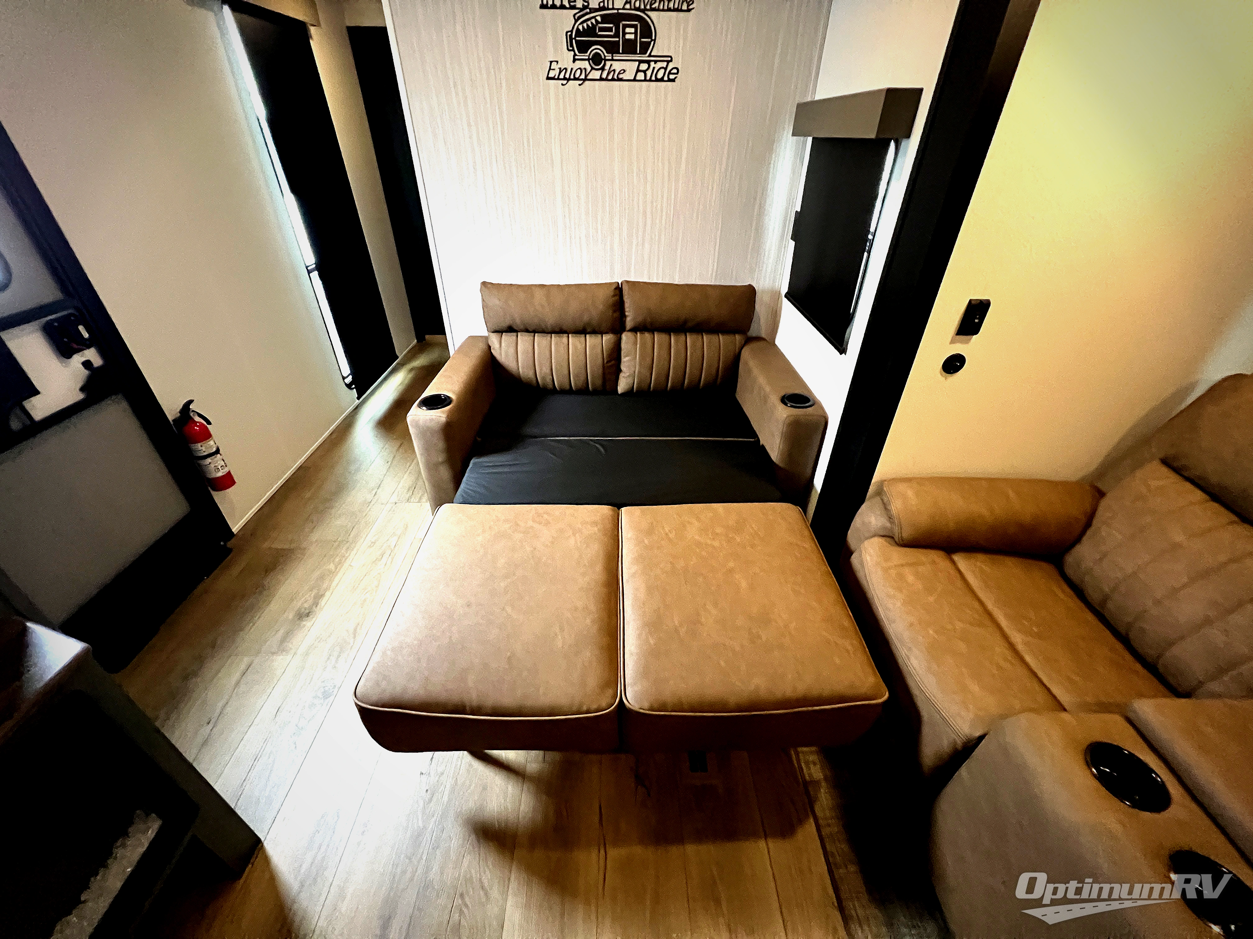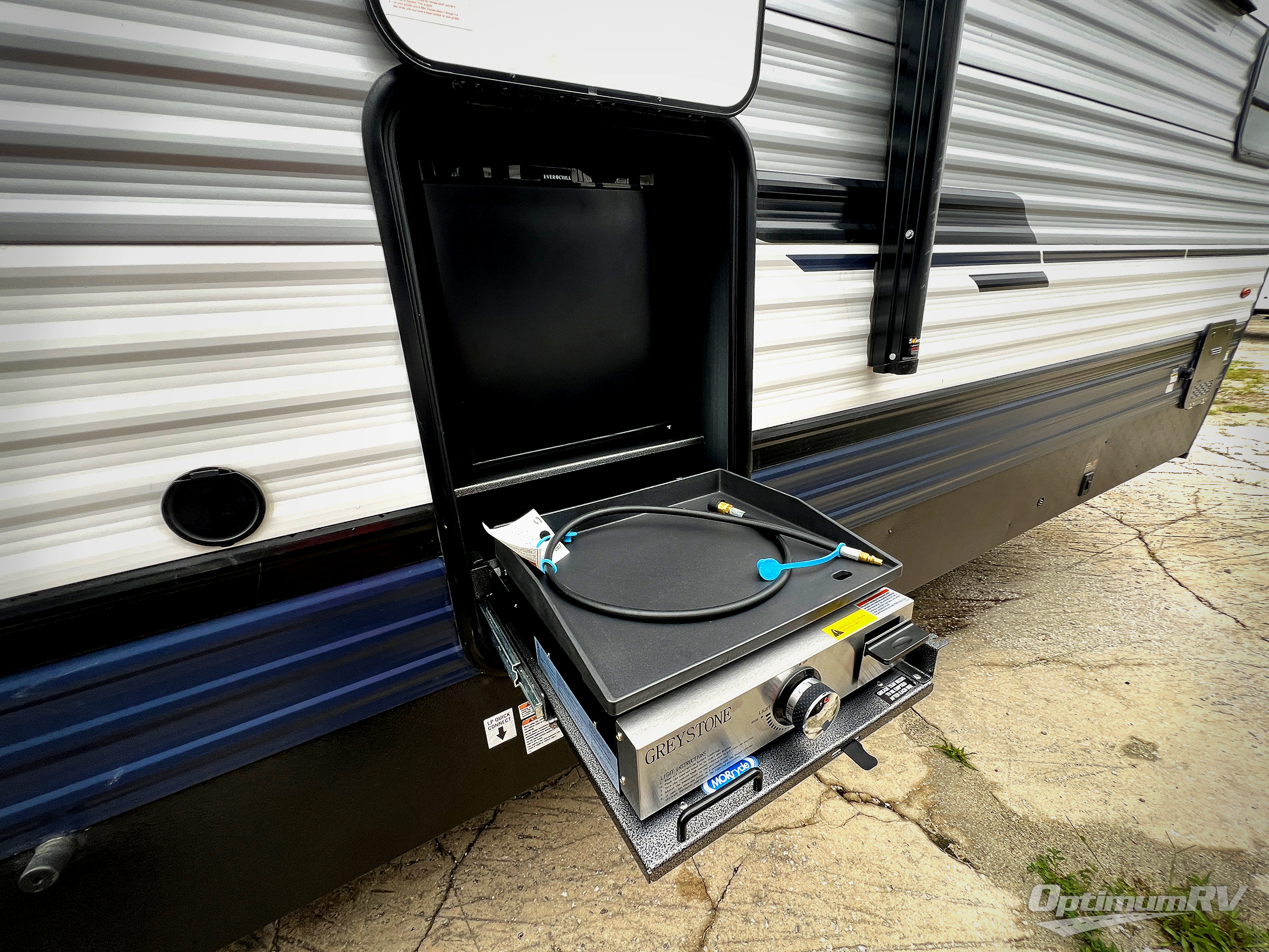 Experience a home away from home with this travel trailer! The front kitchen has everything you will need to prepare your best meals and you can enjoy them at the booth dinette. The rear private bedroom has a 72" x 80" king bed slide across from a dresser, a wardrobe, and a closet with washer and dryer prep. Freshen up in the full bathroom with the 32" x 40" shower and then enjoy a cup of coffee relaxing in one of the two recliners or on the sofa! Choose the optional outside micro kitchen with a griddle for even more convenience!