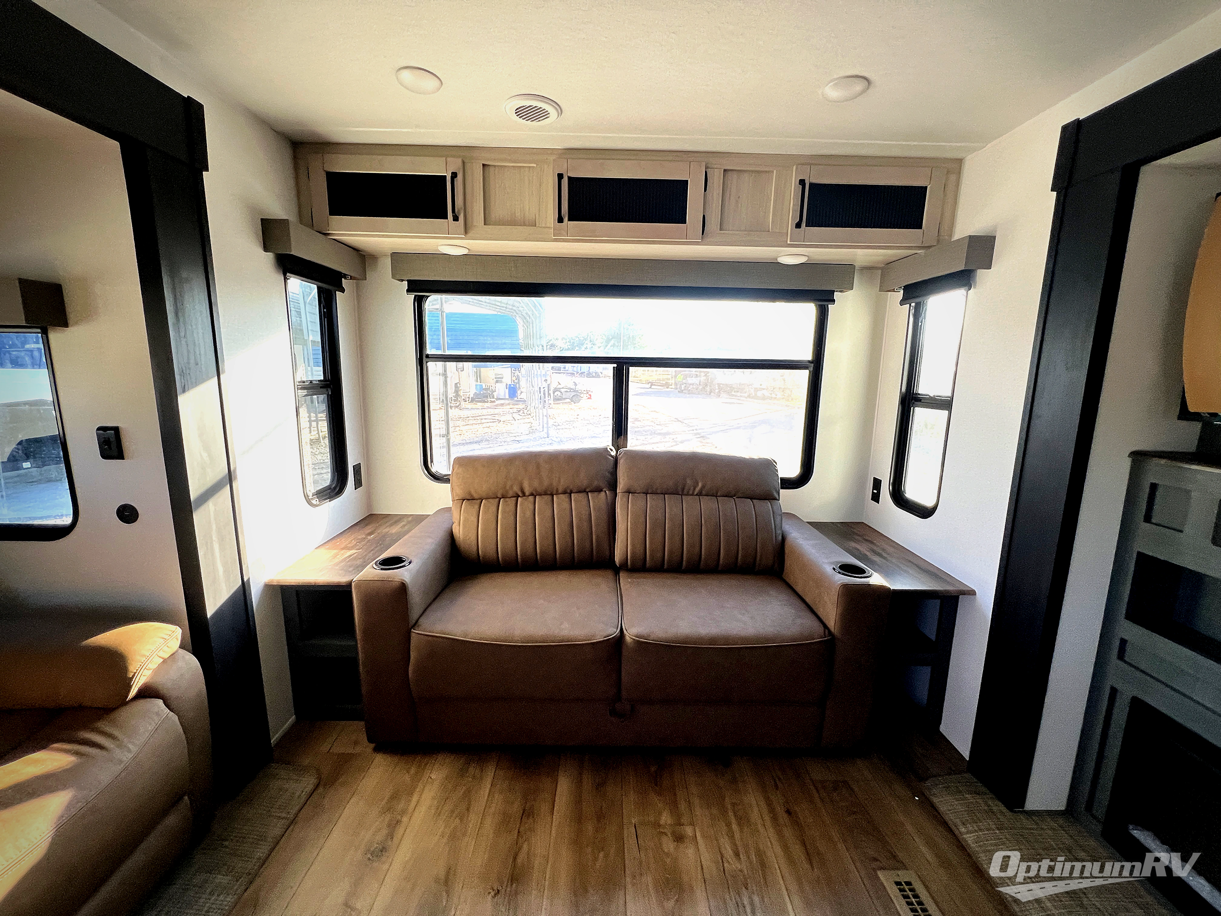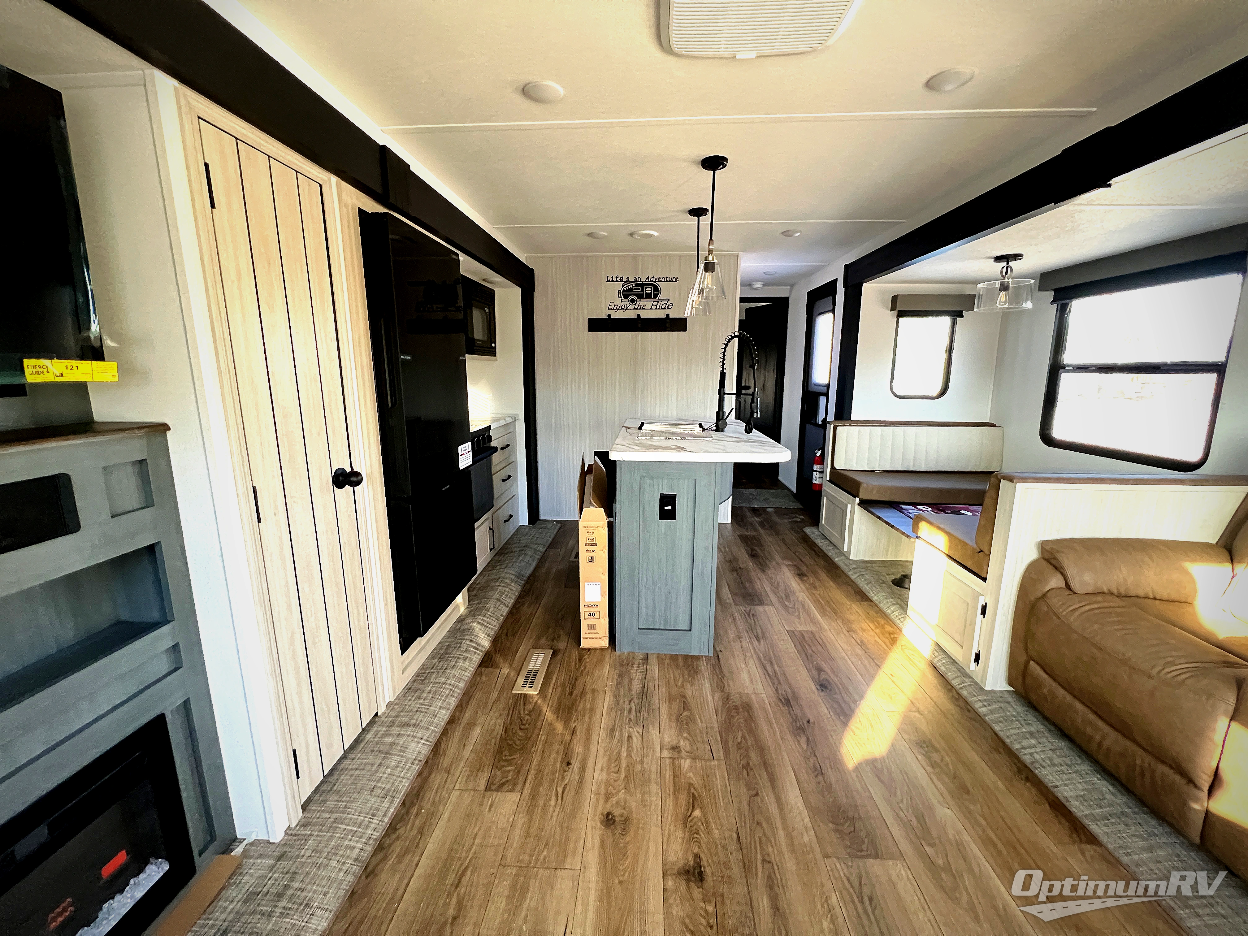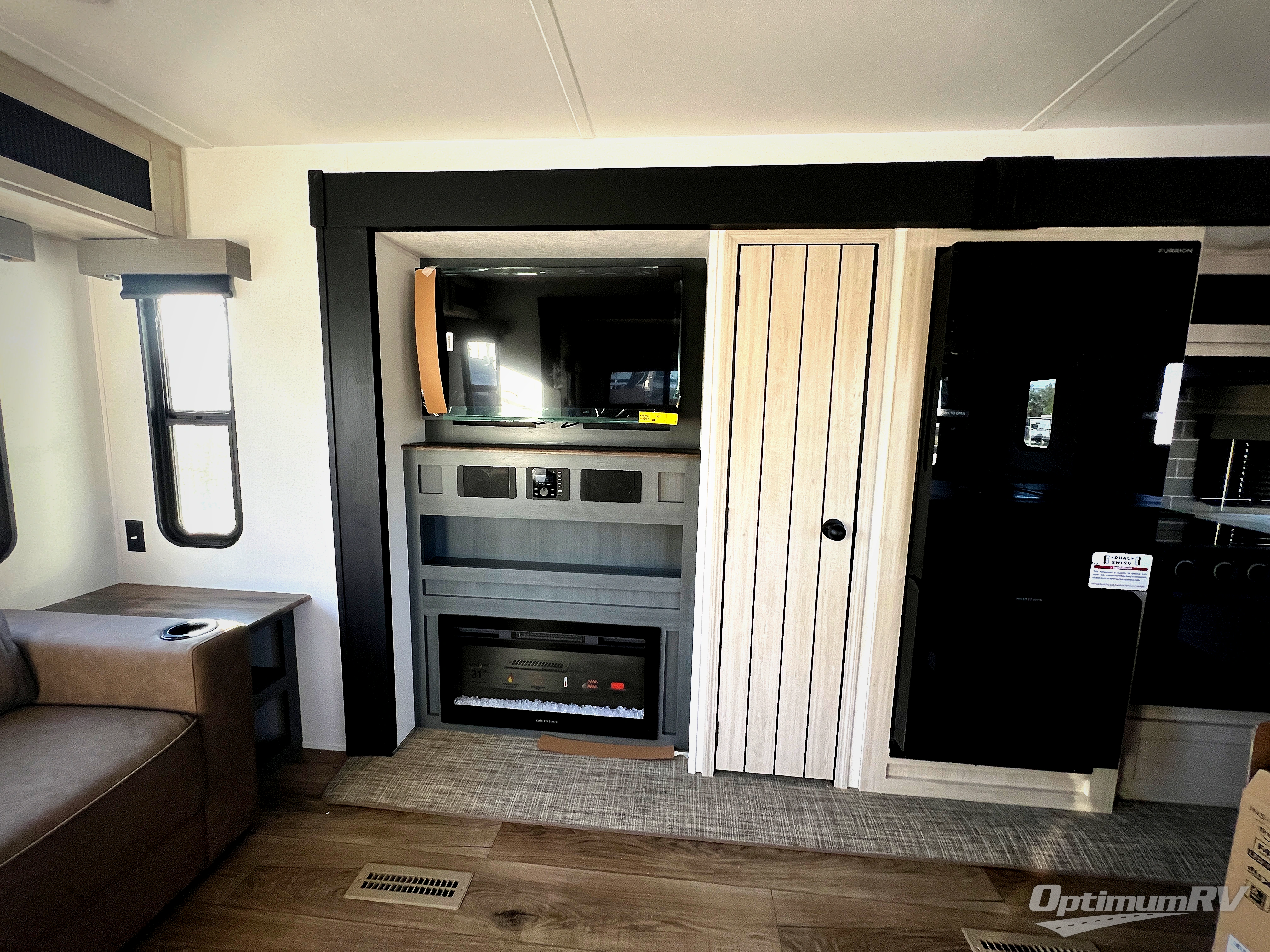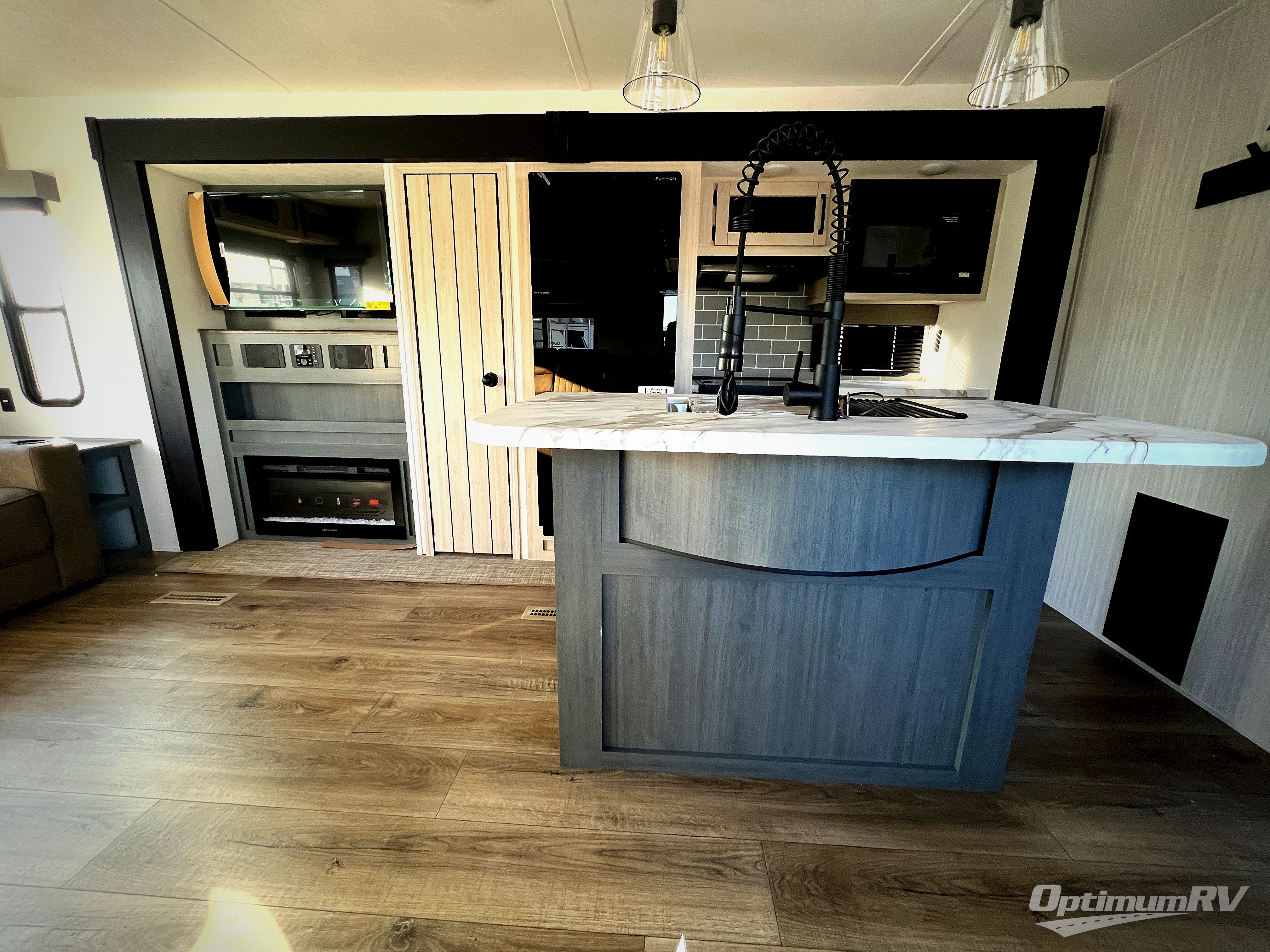 You're going to feel right at home in this travel trailer! The front private bedroom has a queen bed slide for a good night's rest, a dresser and front closet for your clothes, and another closet with washer and dryer prep. Freshen up each morning in the full bathroom with the 32" x 40" shower with a seat and then head to the kitchen to fry up some eggs on the stainless-steel oven and range. You will also appreciate having a kitchen island for easier meal prep and a walk-in pantry to easily see your canned goods and snacks. The booth dinette offers a comfortable place to dine, play, and even sleep once converted. What better way to wind down your nights than to relax on either the rear sofa or on the theater seating across from the entertainment center with a fireplace!