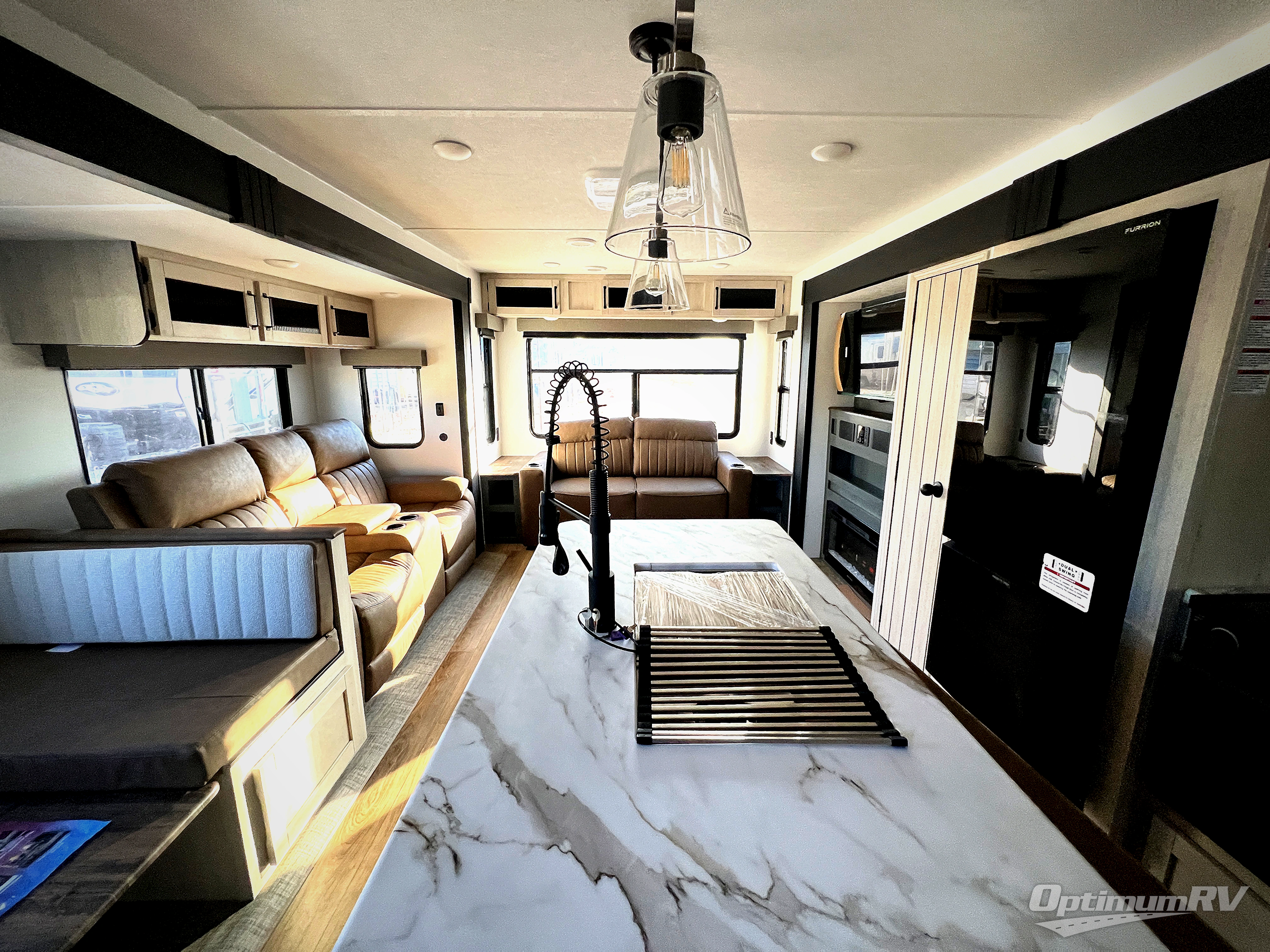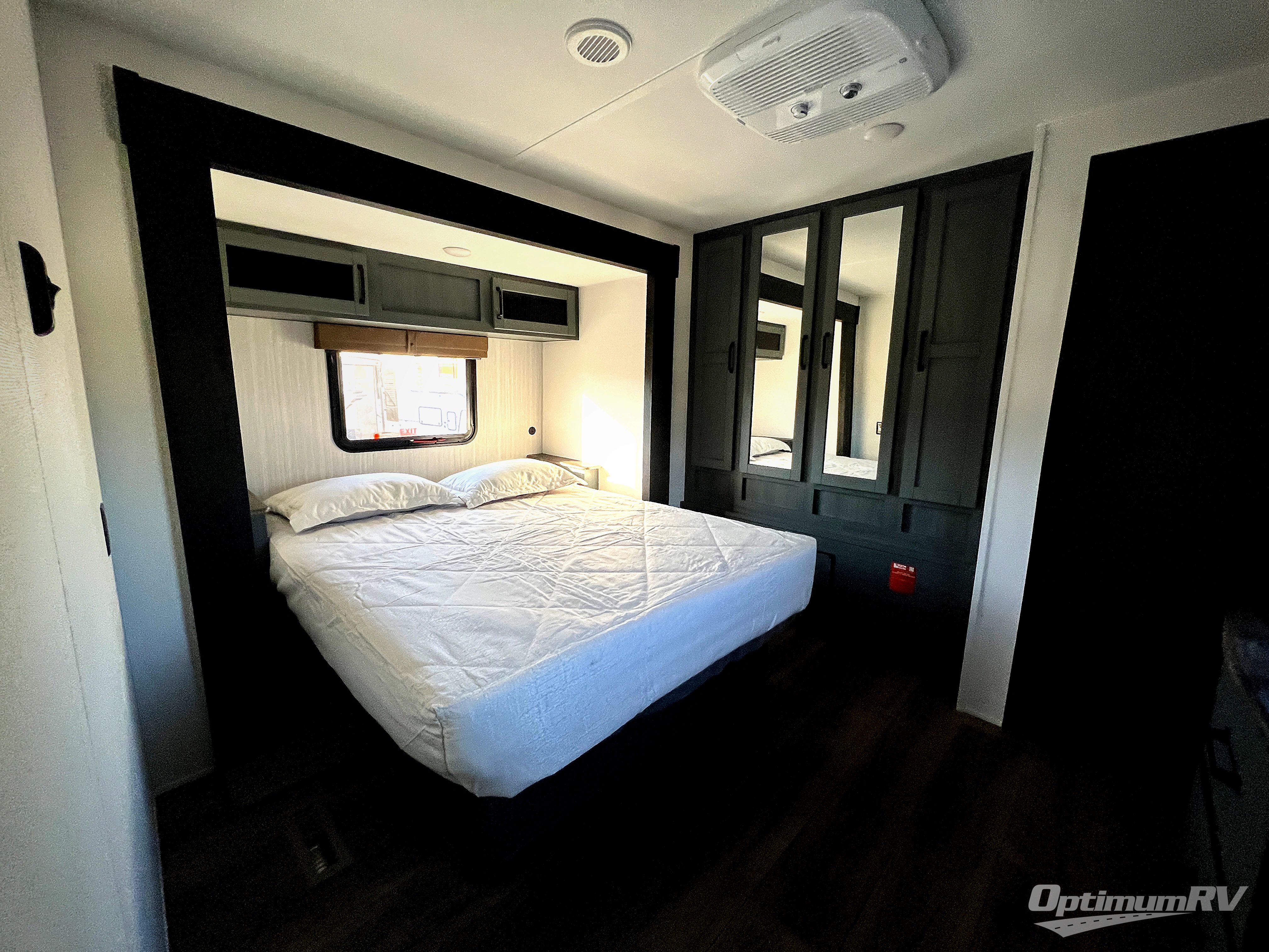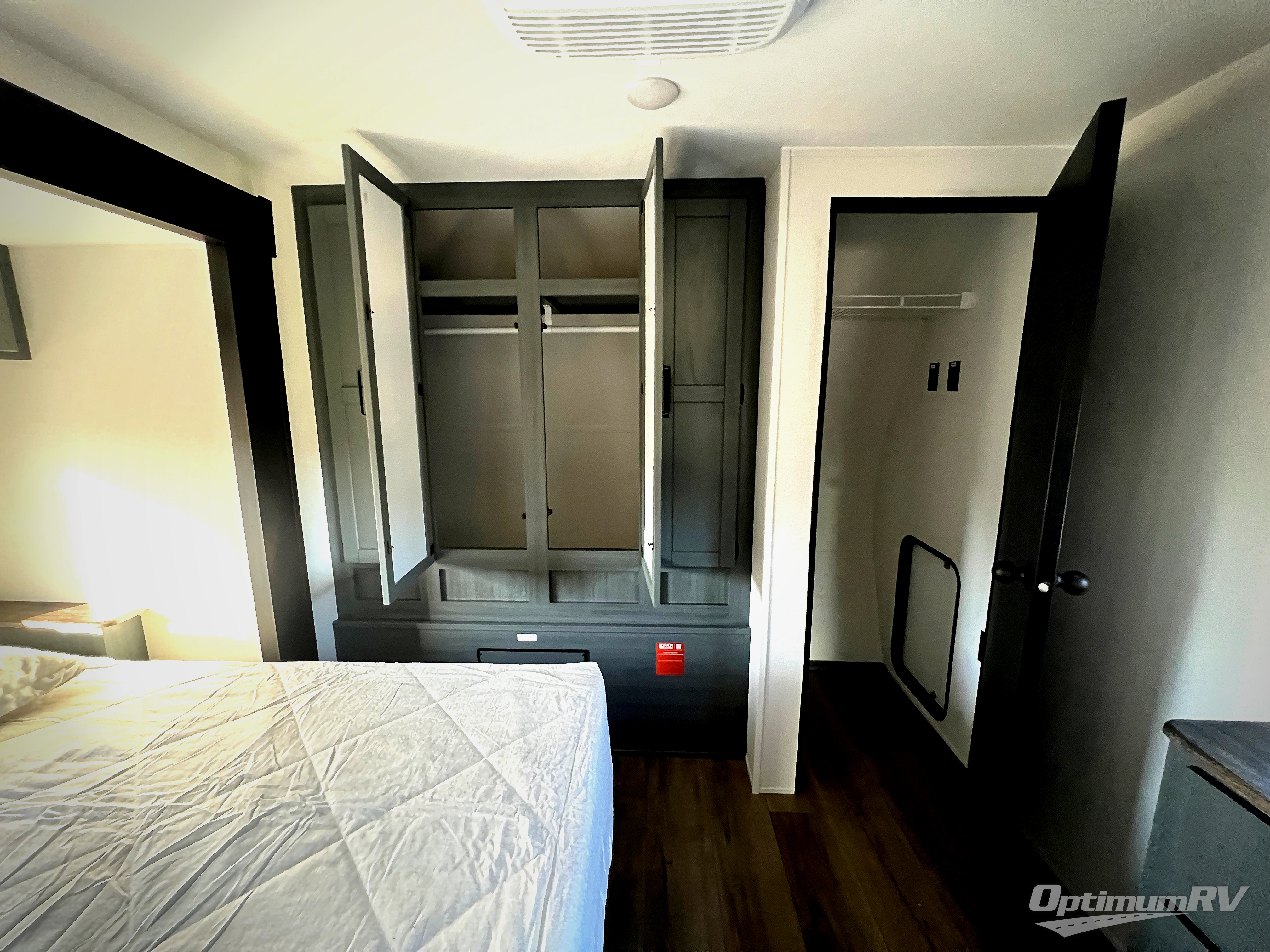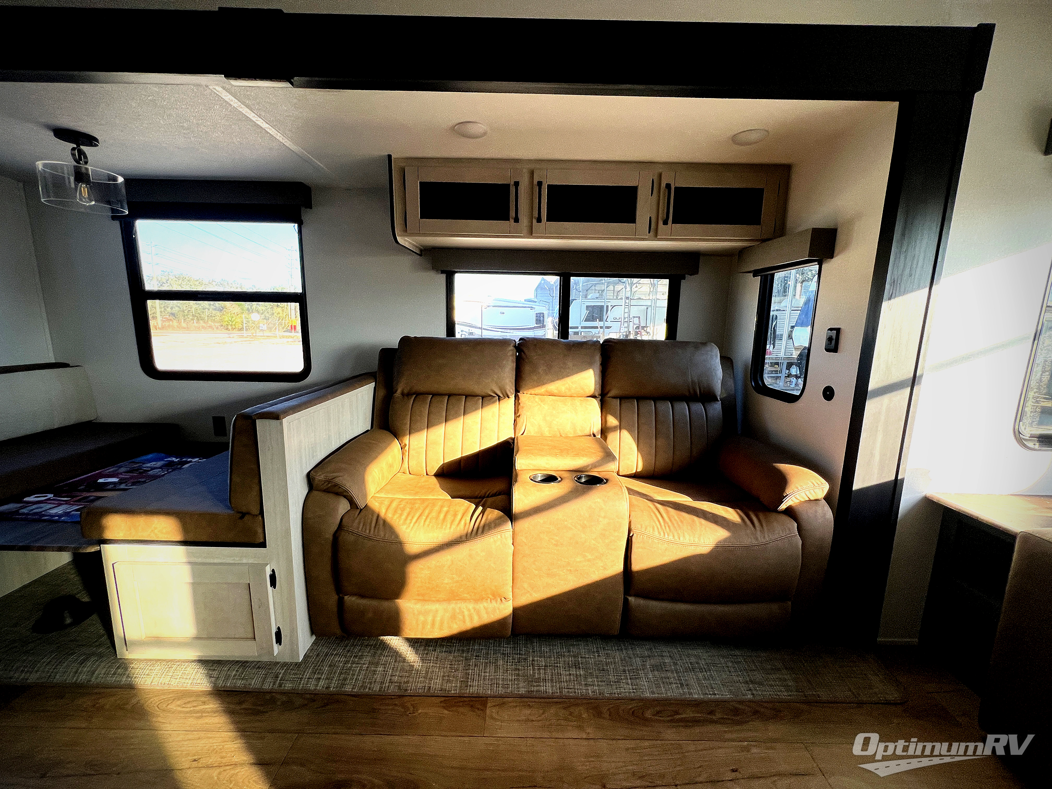 You're going to feel right at home in this travel trailer! The front private bedroom has a queen bed slide for a good night's rest, a dresser and front closet for your clothes, and another closet with washer and dryer prep. Freshen up each morning in the full bathroom with the 32" x 40" shower with a seat and then head to the kitchen to fry up some eggs on the stainless-steel oven and range. You will also appreciate having a kitchen island for easier meal prep and a walk-in pantry to easily see your canned goods and snacks. The booth dinette offers a comfortable place to dine, play, and even sleep once converted. What better way to wind down your nights than to relax on either the rear sofa or on the theater seating across from the entertainment center with a fireplace!