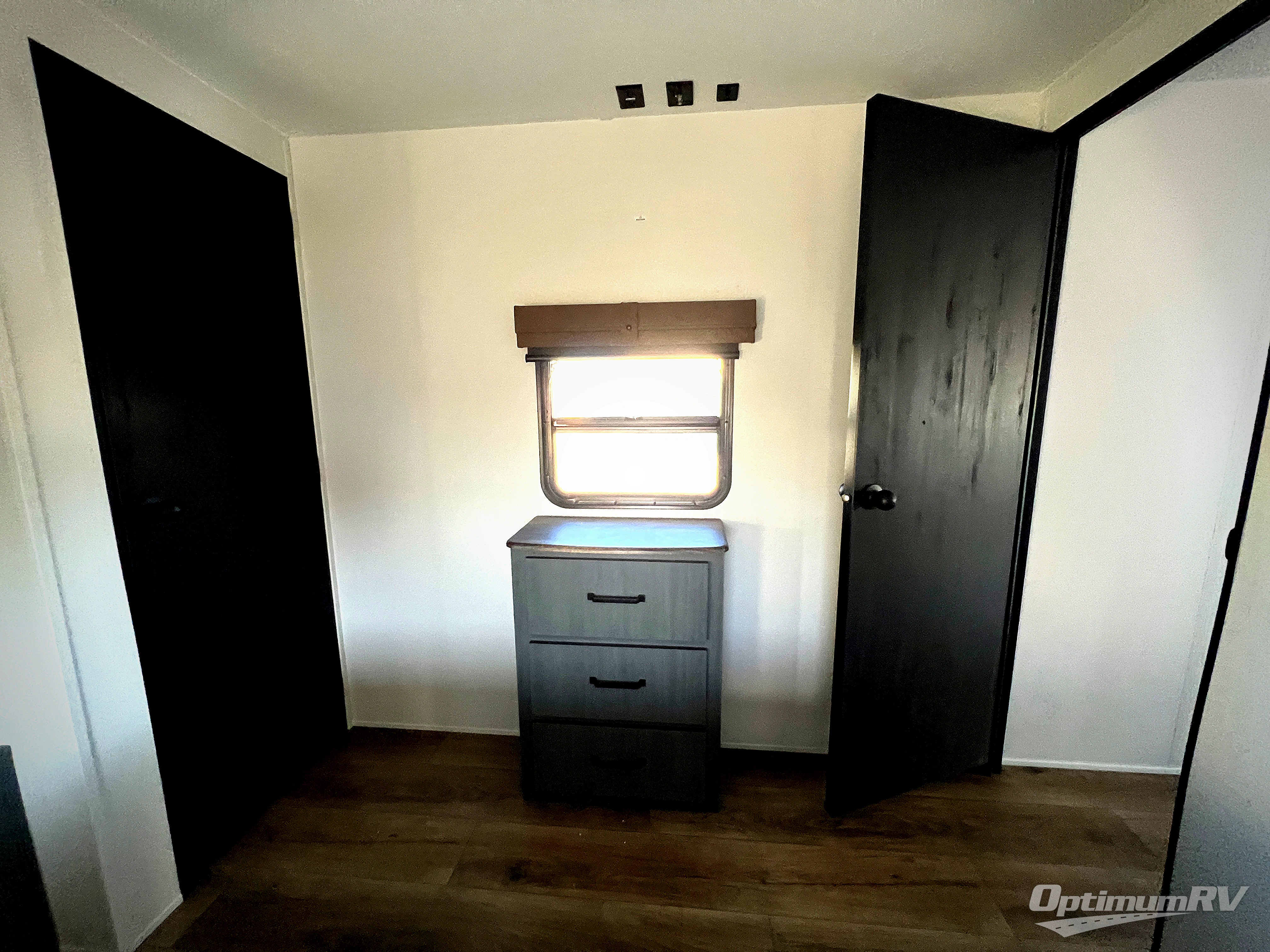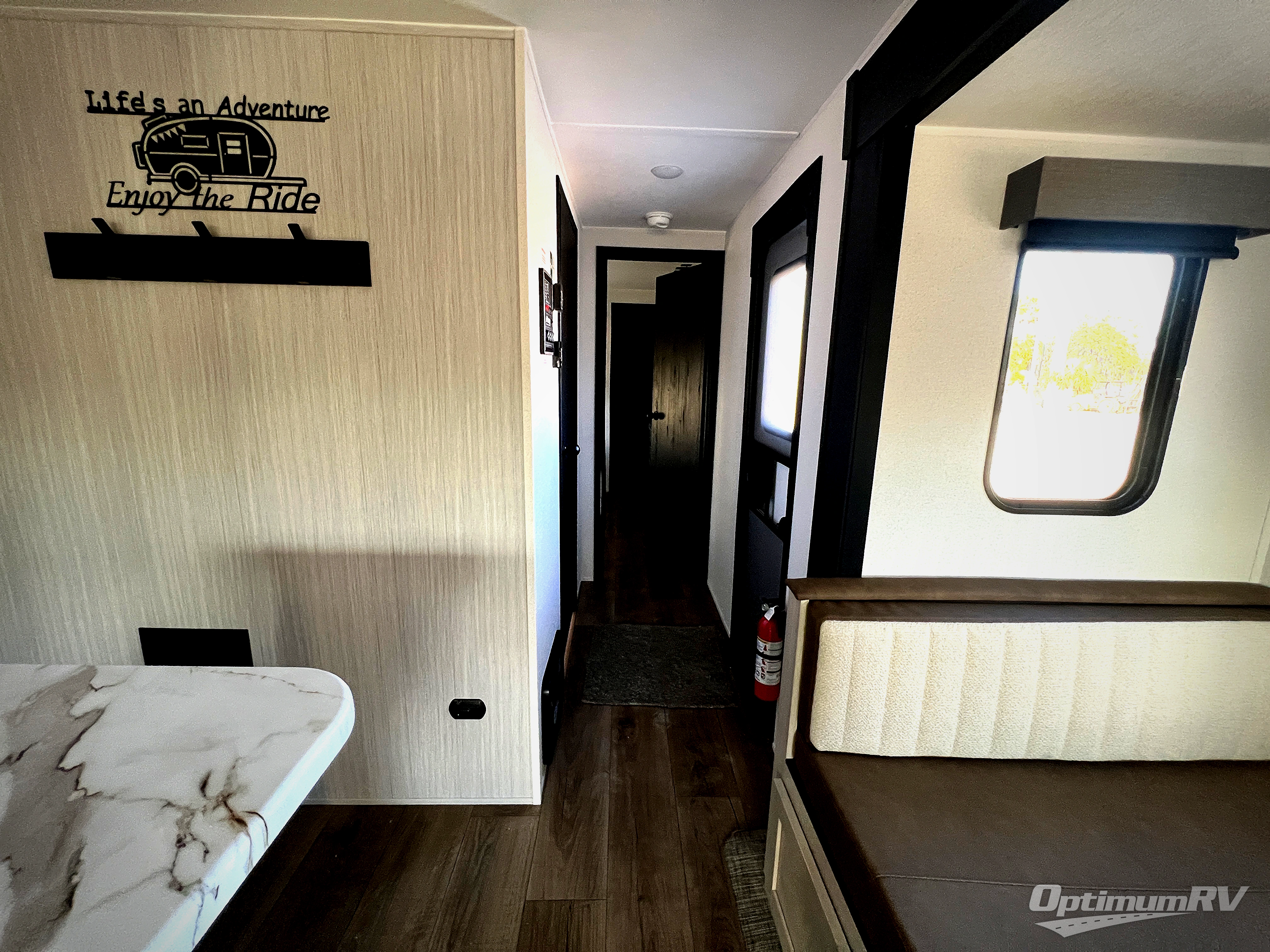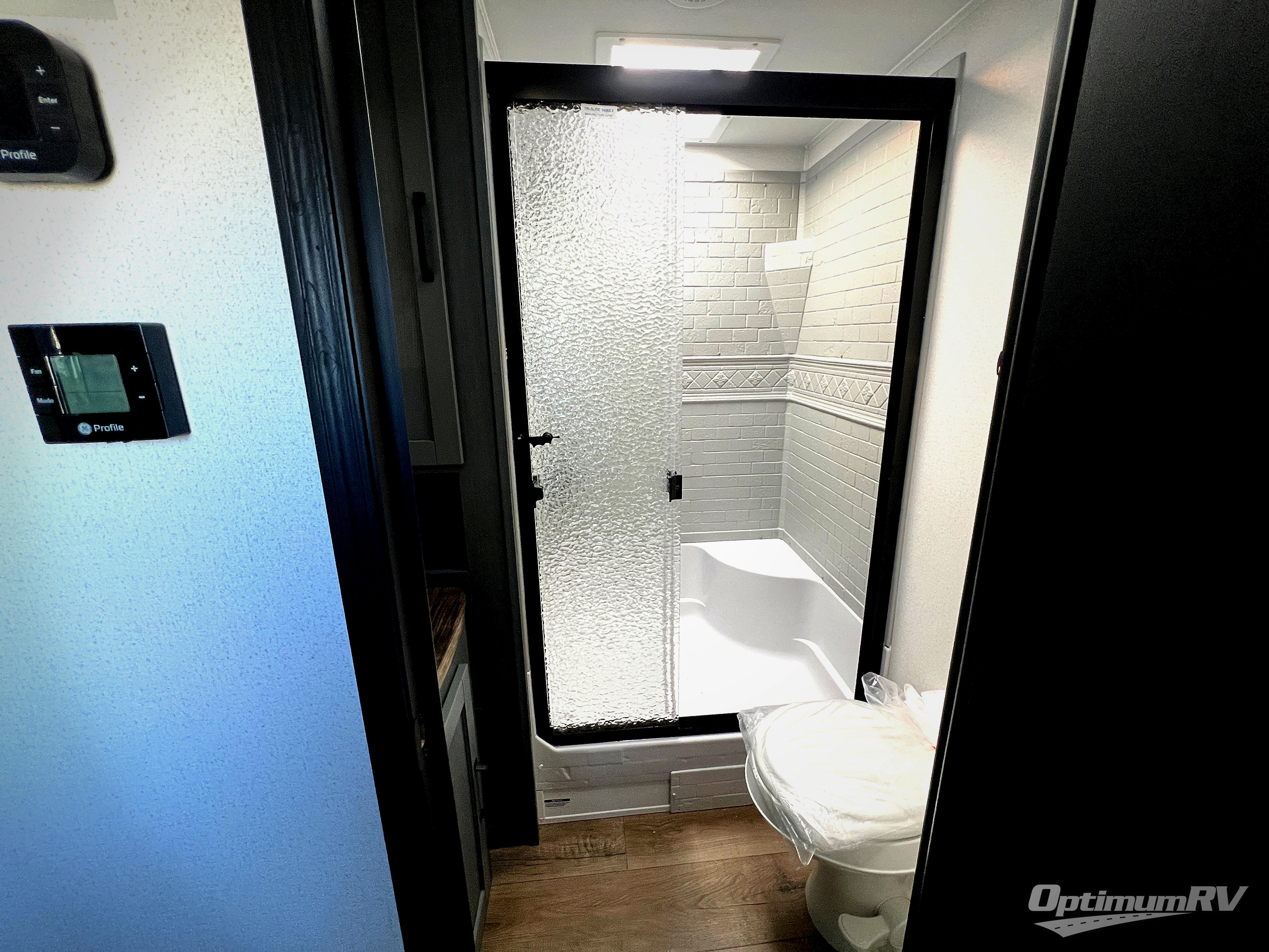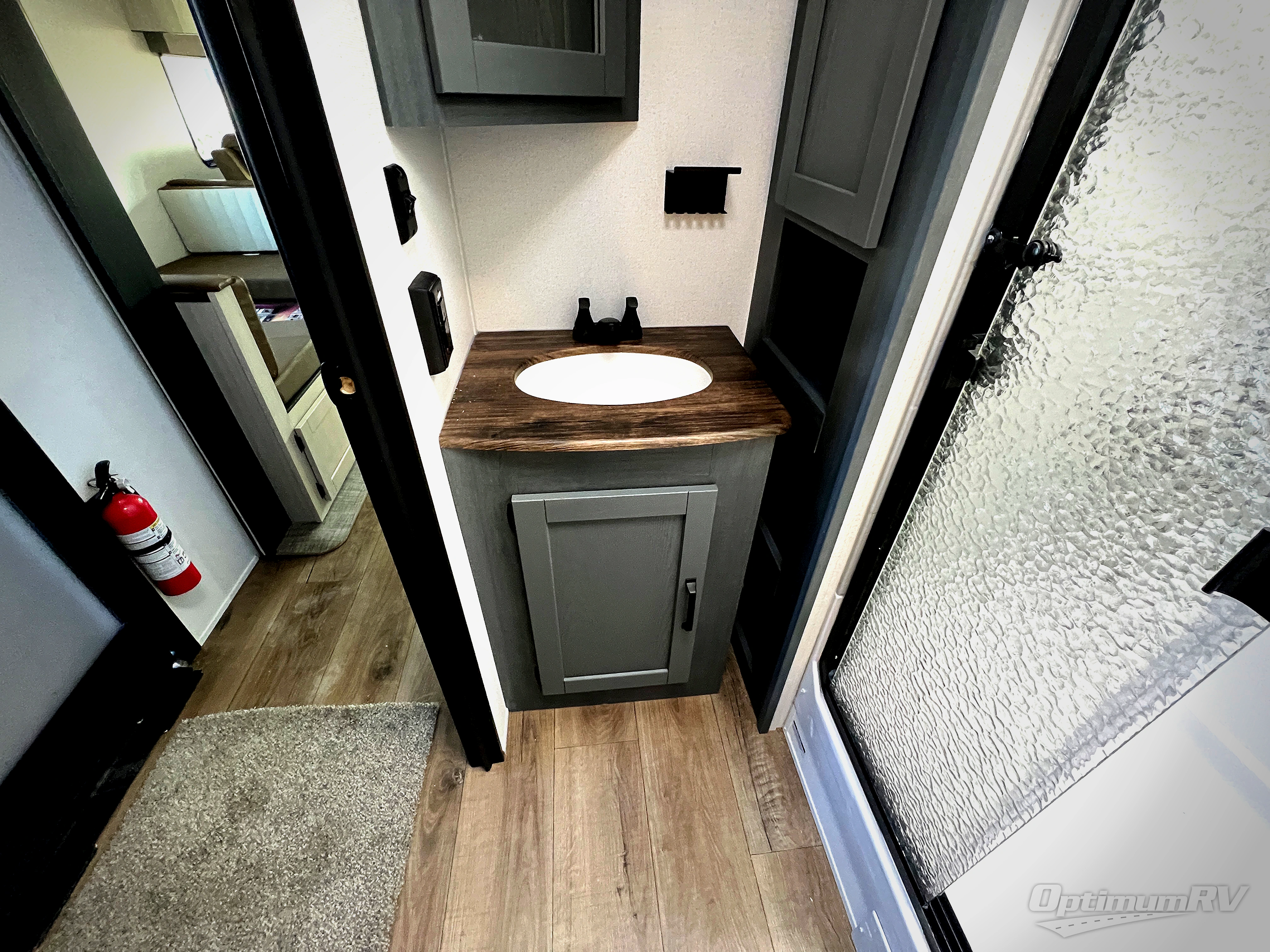 You're going to feel right at home in this travel trailer! The front private bedroom has a queen bed slide for a good night's rest, a dresser and front closet for your clothes, and another closet with washer and dryer prep. Freshen up each morning in the full bathroom with the 32" x 40" shower with a seat and then head to the kitchen to fry up some eggs on the stainless-steel oven and range. You will also appreciate having a kitchen island for easier meal prep and a walk-in pantry to easily see your canned goods and snacks. The booth dinette offers a comfortable place to dine, play, and even sleep once converted. What better way to wind down your nights than to relax on either the rear sofa or on the theater seating across from the entertainment center with a fireplace!