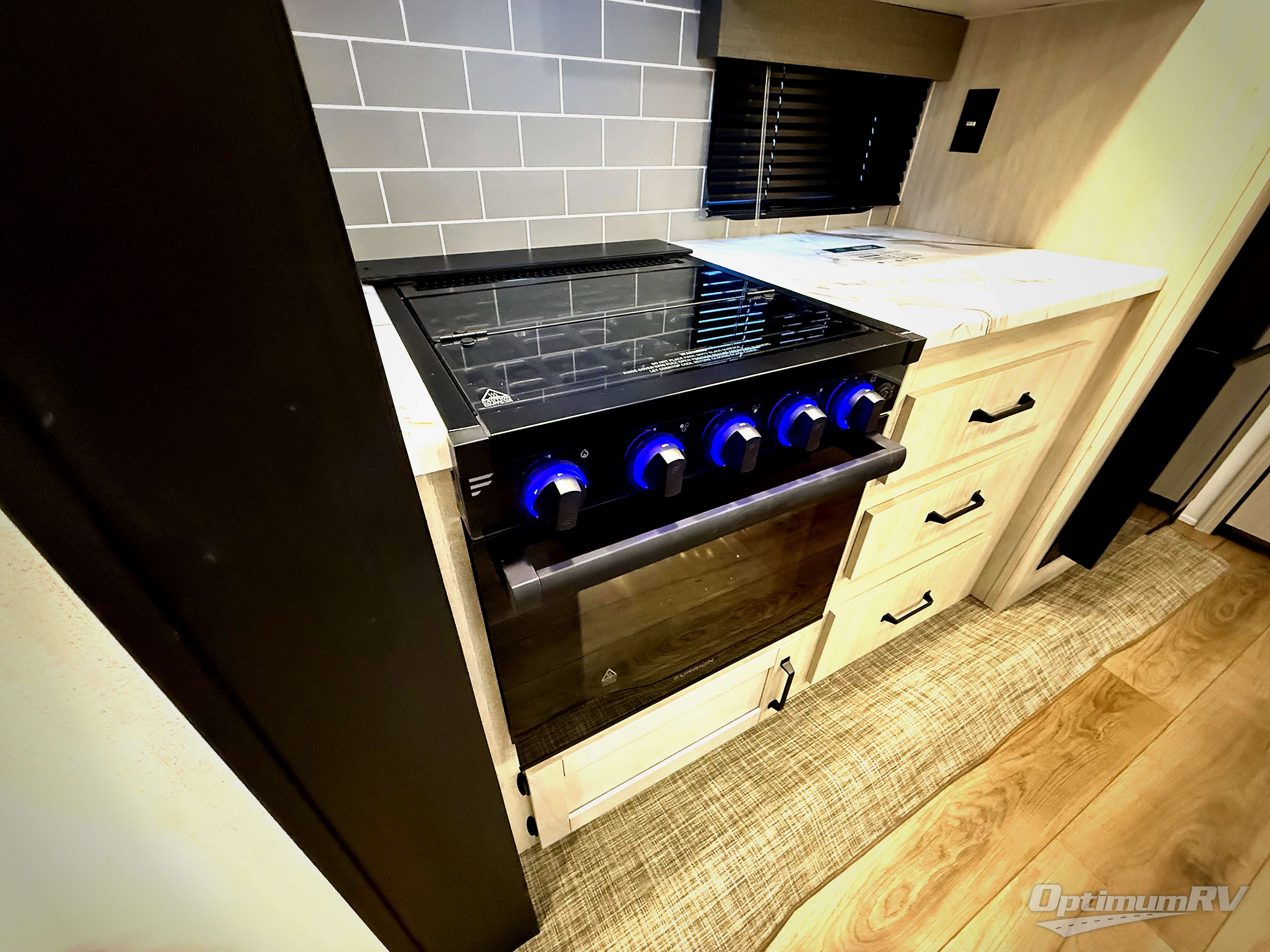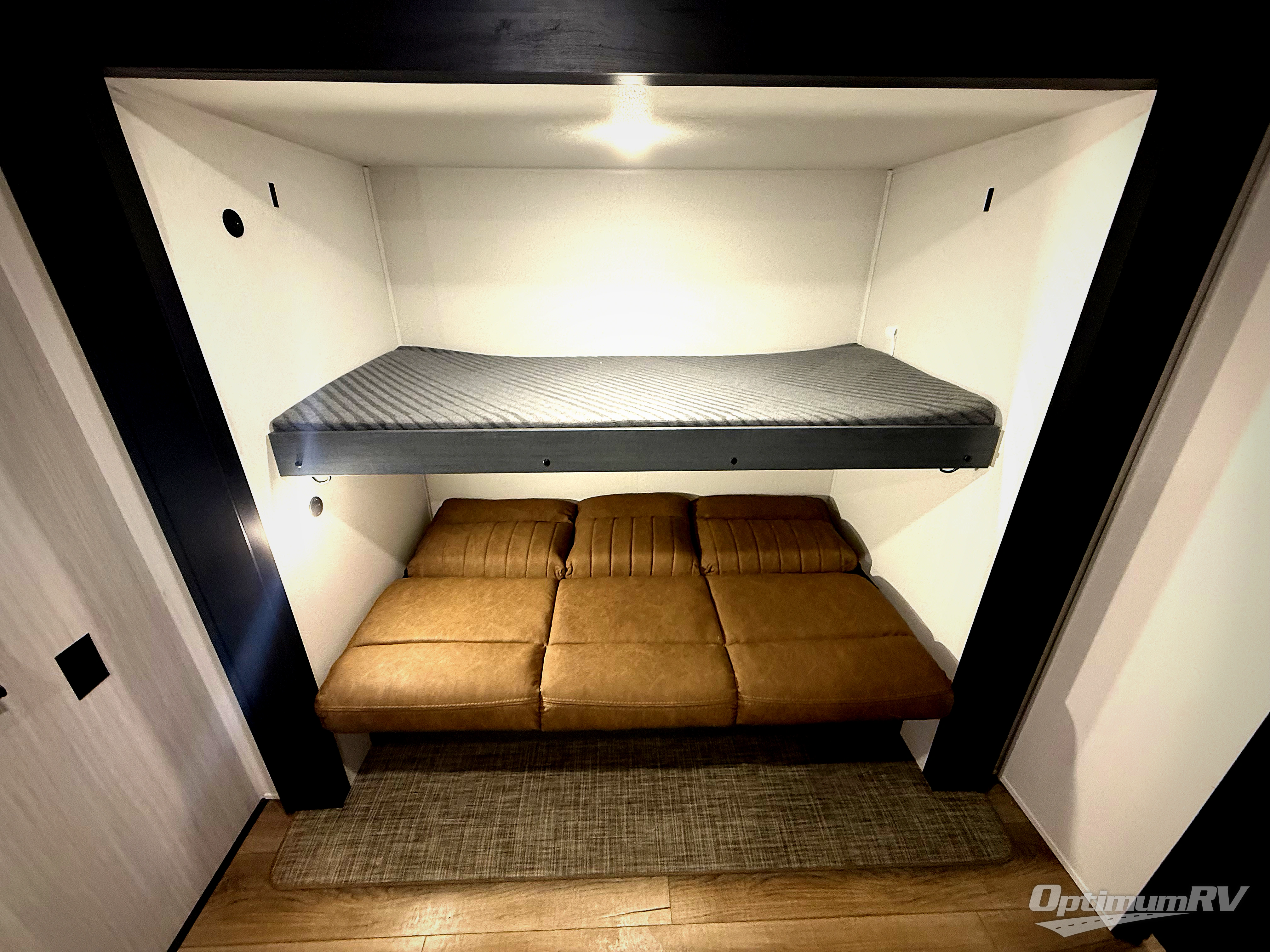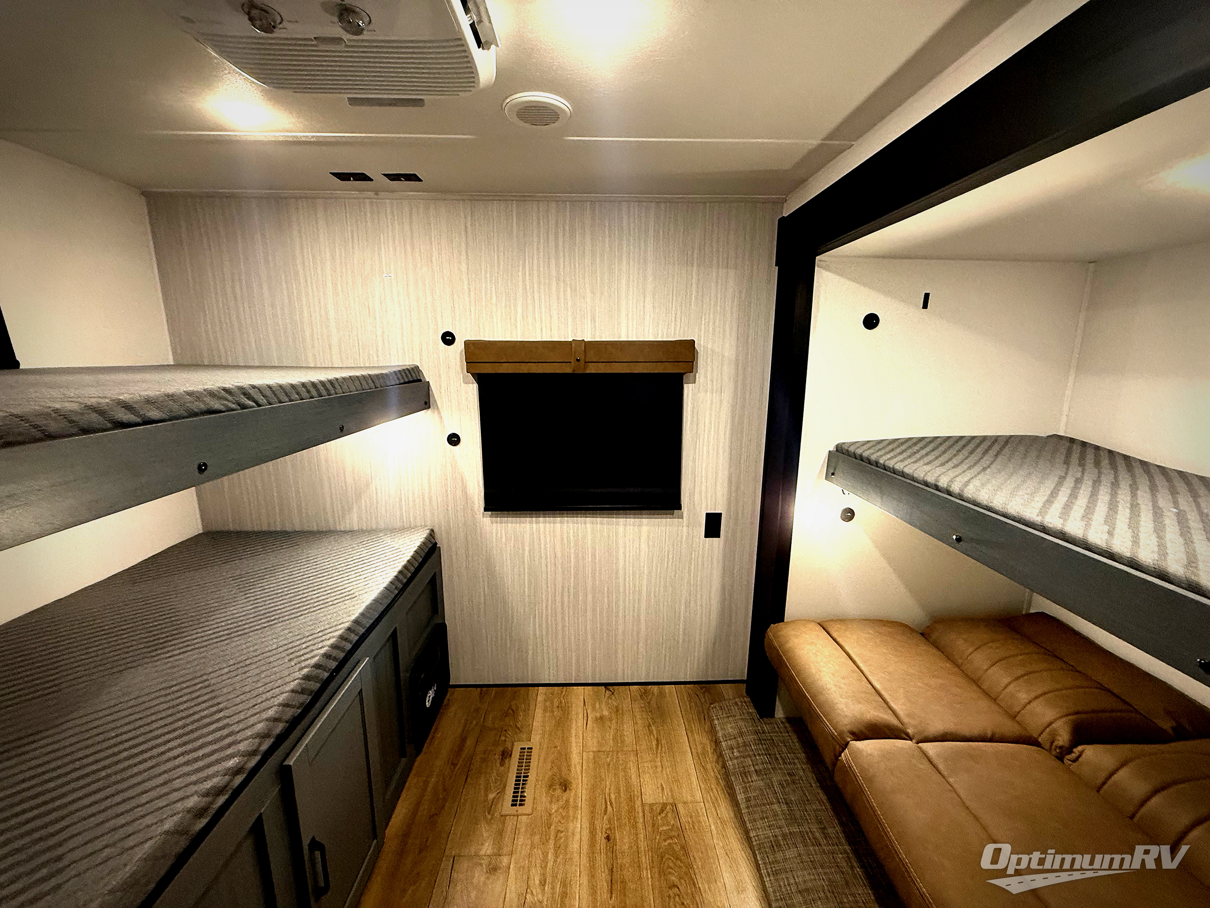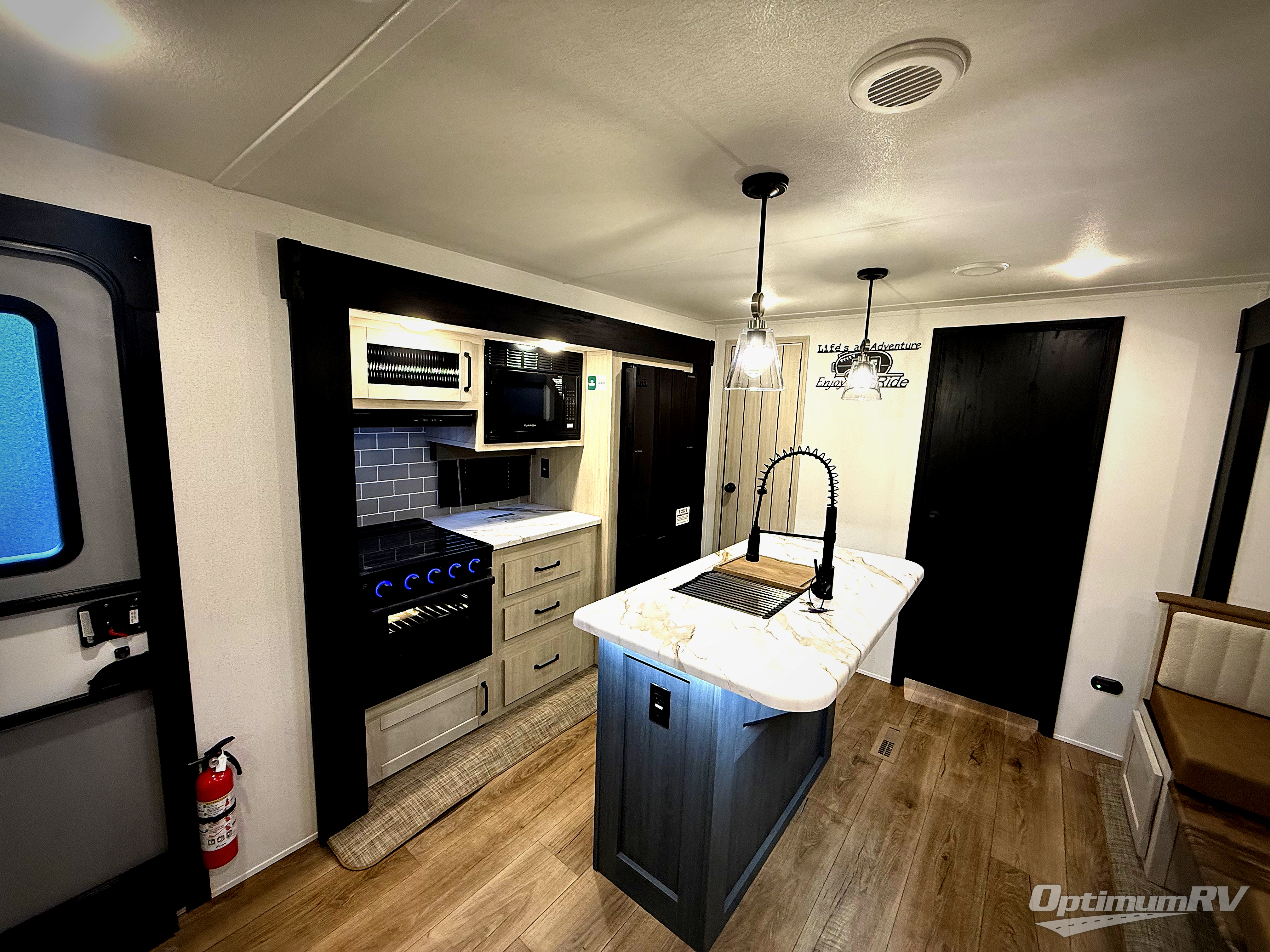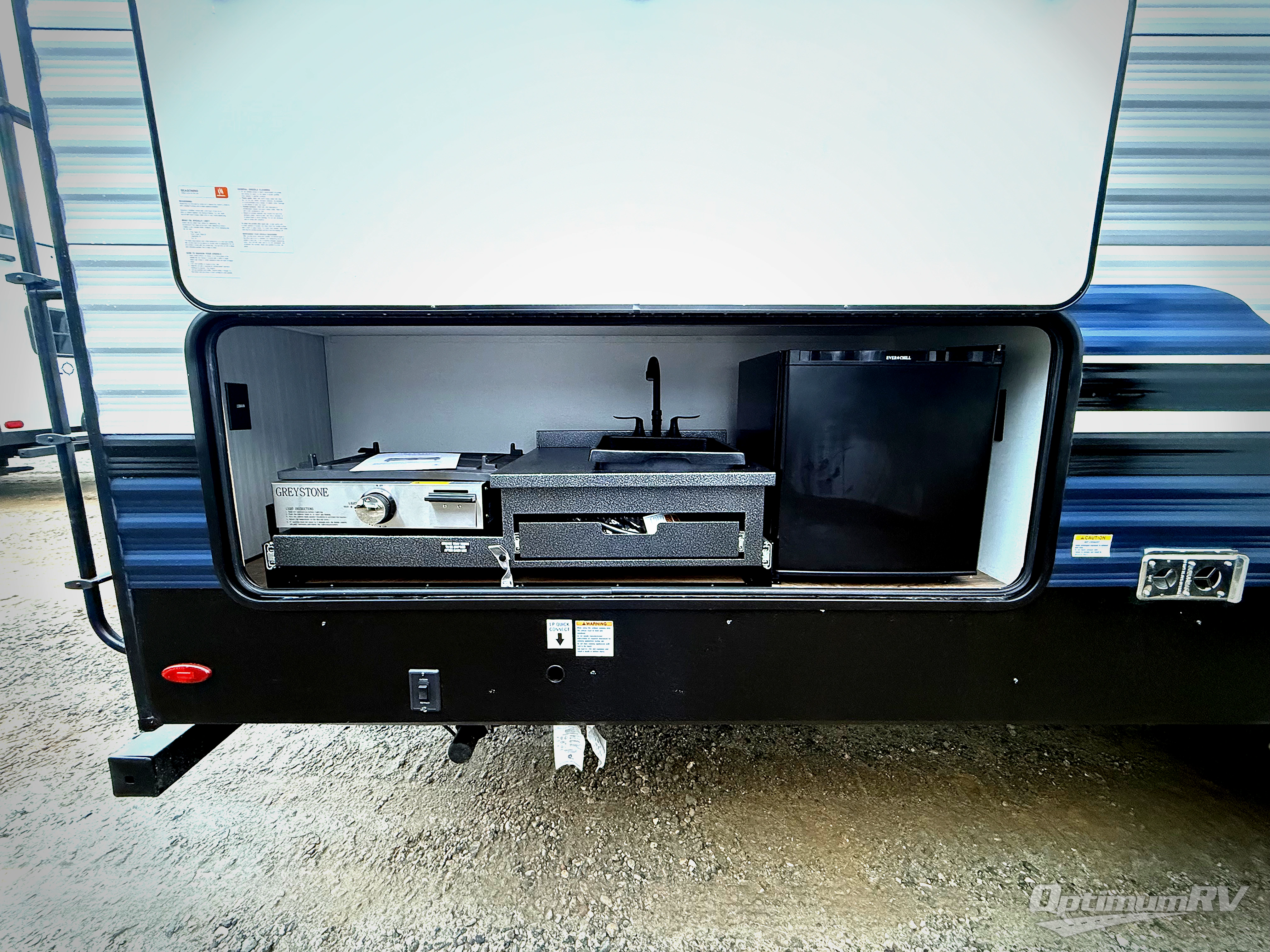 You will be the talk of the campground with this travel trailer! The front private bedroom has a queen bed slide across from a dresser and a front closet plus a second closet with washer and dryer prep. Freshen up each morning in the full bathroom with the 34" x 34" radius shower then head to the kitchen to fry up some eggs with the stainless-steel oven and range. You can enjoy your meals at the booth dinette, and the kitchen island will make your clean up easier with the sink that has a high-rise faucet and sprayer. The rear private bunkhouse has a 32" x 69" bunk above a jiffy sofa slide, a 36" x 69" bunk above a 36" x 71" bunk and a linen closet. Choose one of the outside kitchen options for even more convenience!