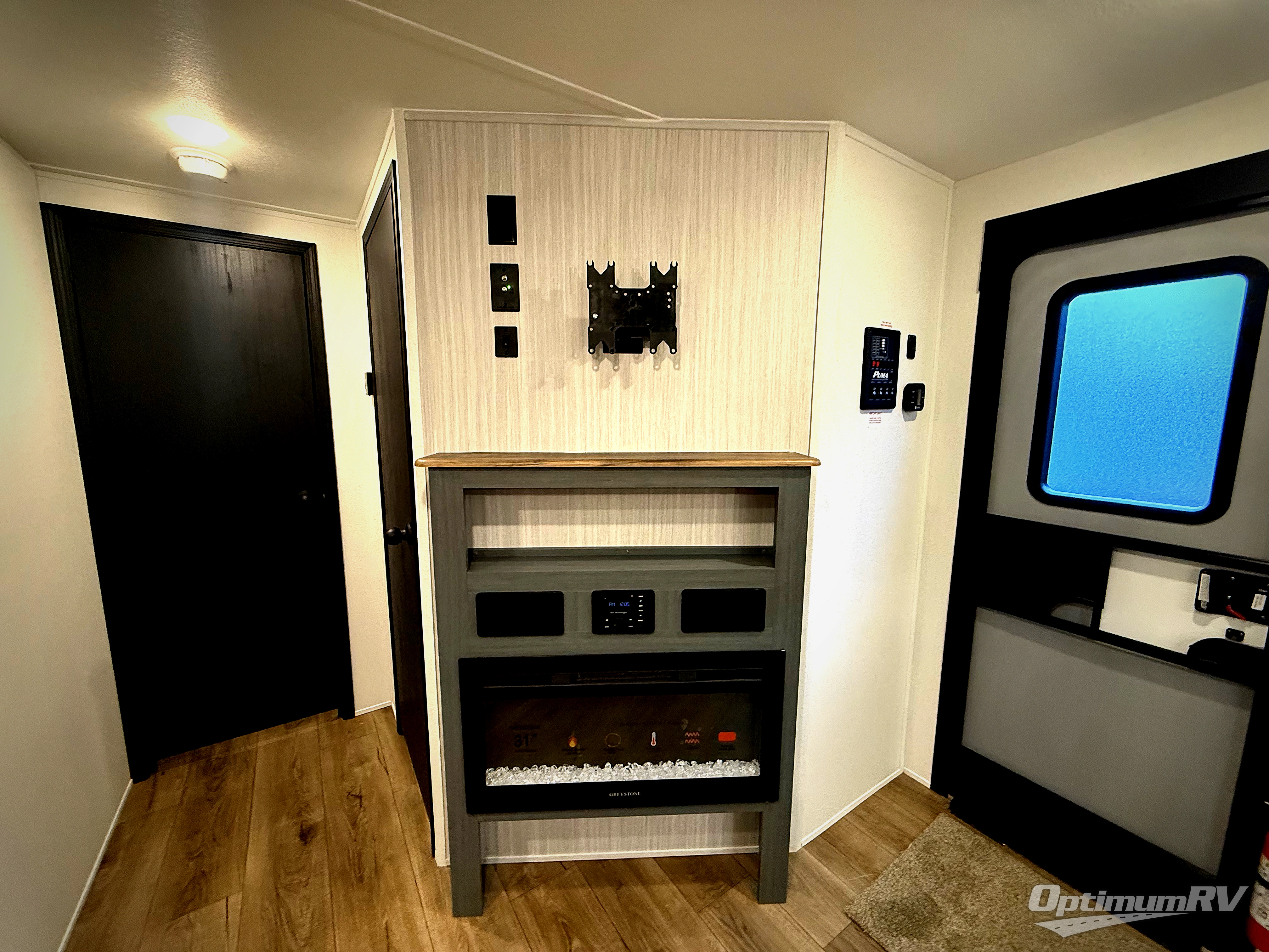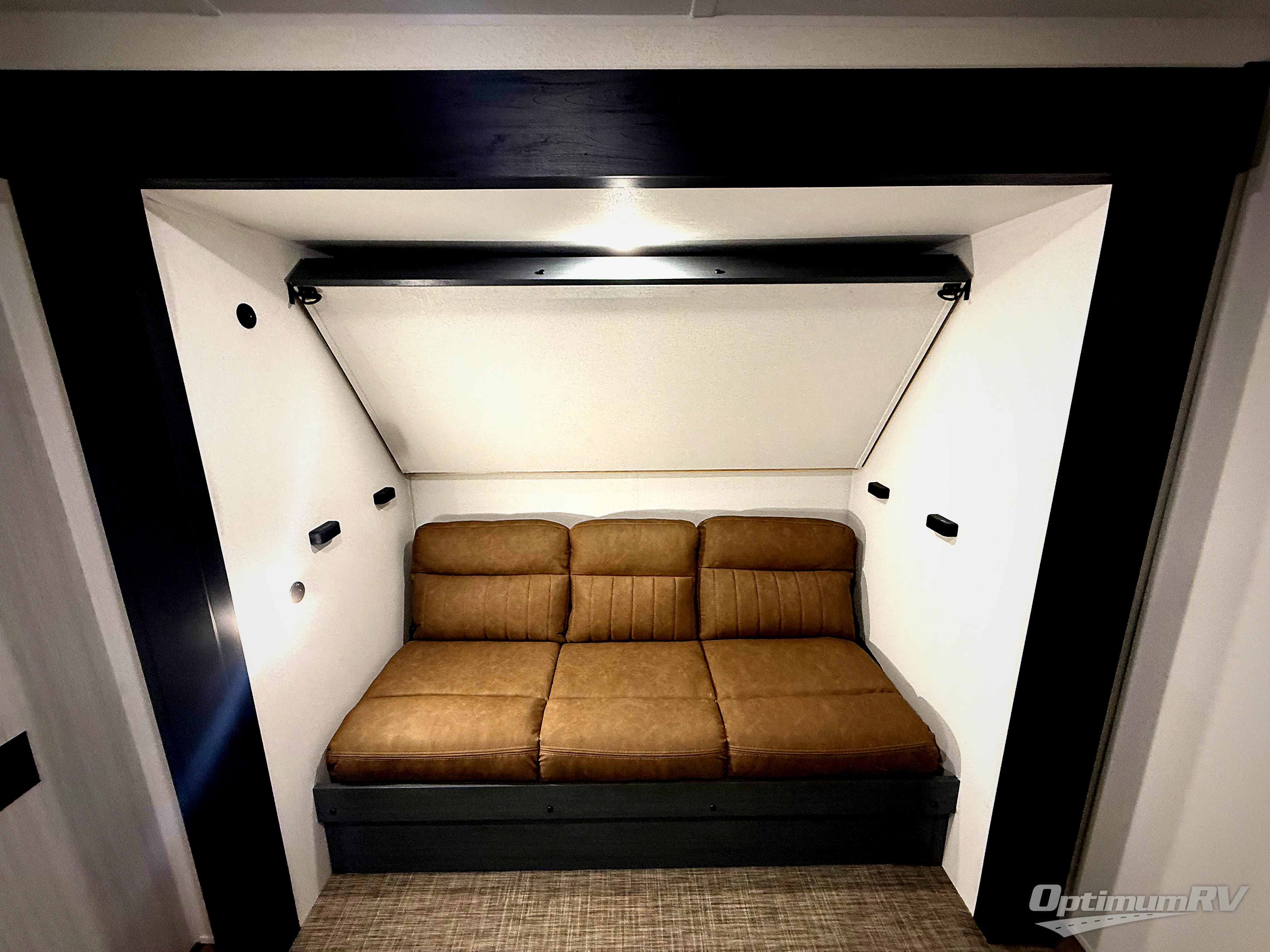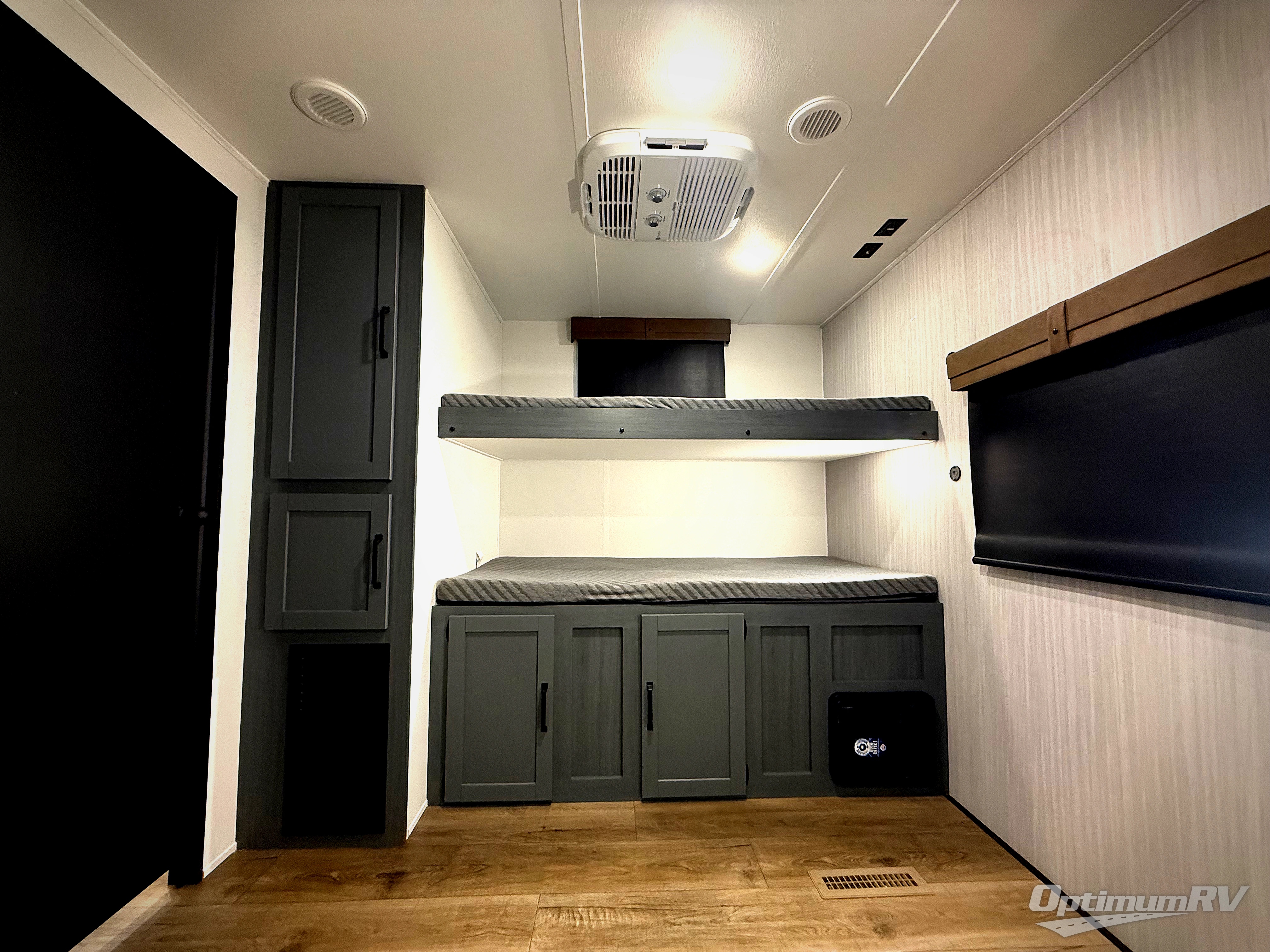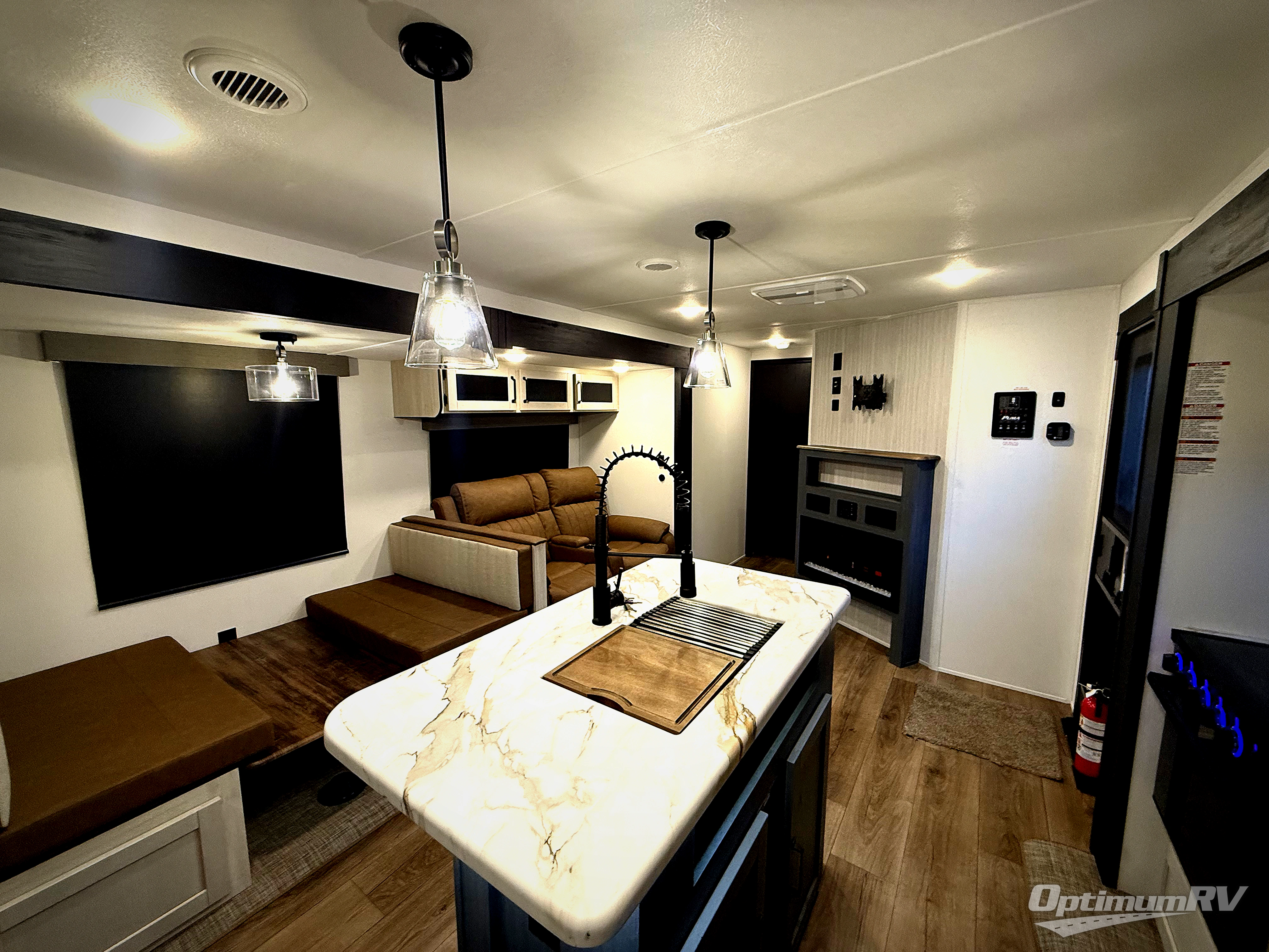You will be the talk of the campground with this travel trailer! The front private bedroom has a queen bed slide across from a dresser and a front closet plus a second closet with washer and dryer prep. Freshen up each morning in the full bathroom with the 34" x 34" radius shower then head to the kitchen to fry up some eggs with the stainless-steel oven and range. You can enjoy your meals at the booth dinette, and the kitchen island will make your clean up easier with the sink that has a high-rise faucet and sprayer. The rear private bunkhouse has a 32" x 69" bunk above a jiffy sofa slide, a 36" x 69" bunk above a 36" x 71" bunk and a linen closet. Choose one of the outside kitchen options for even more convenience!