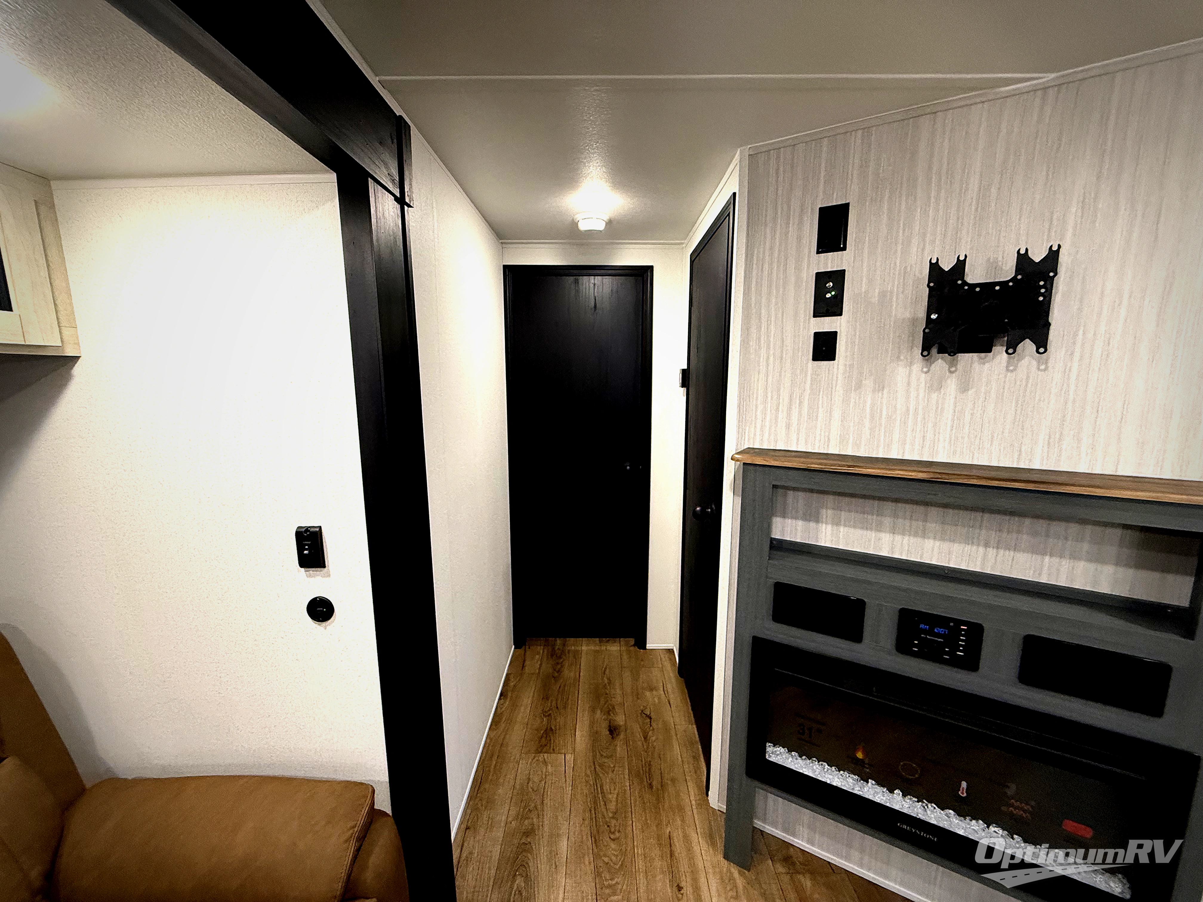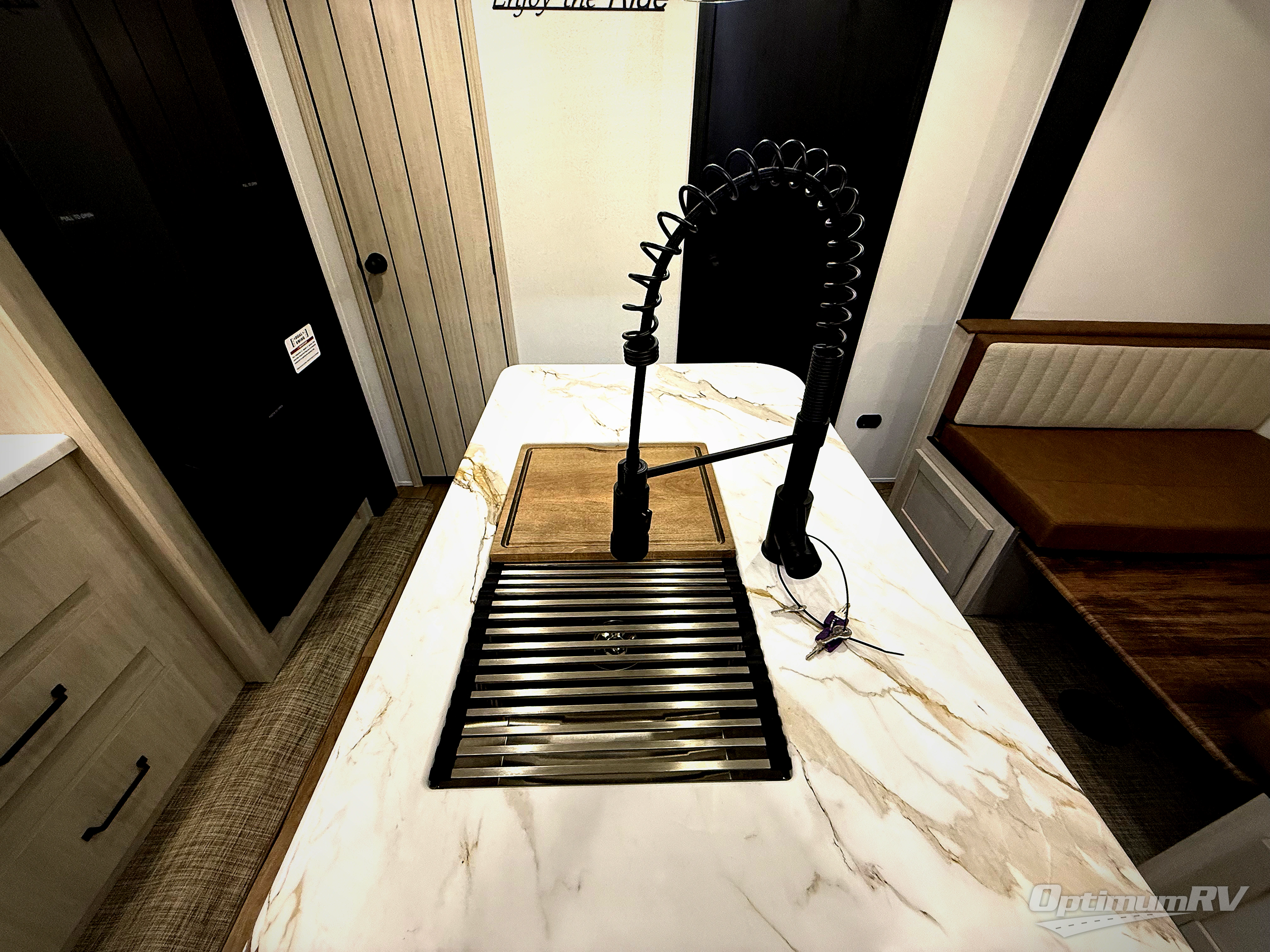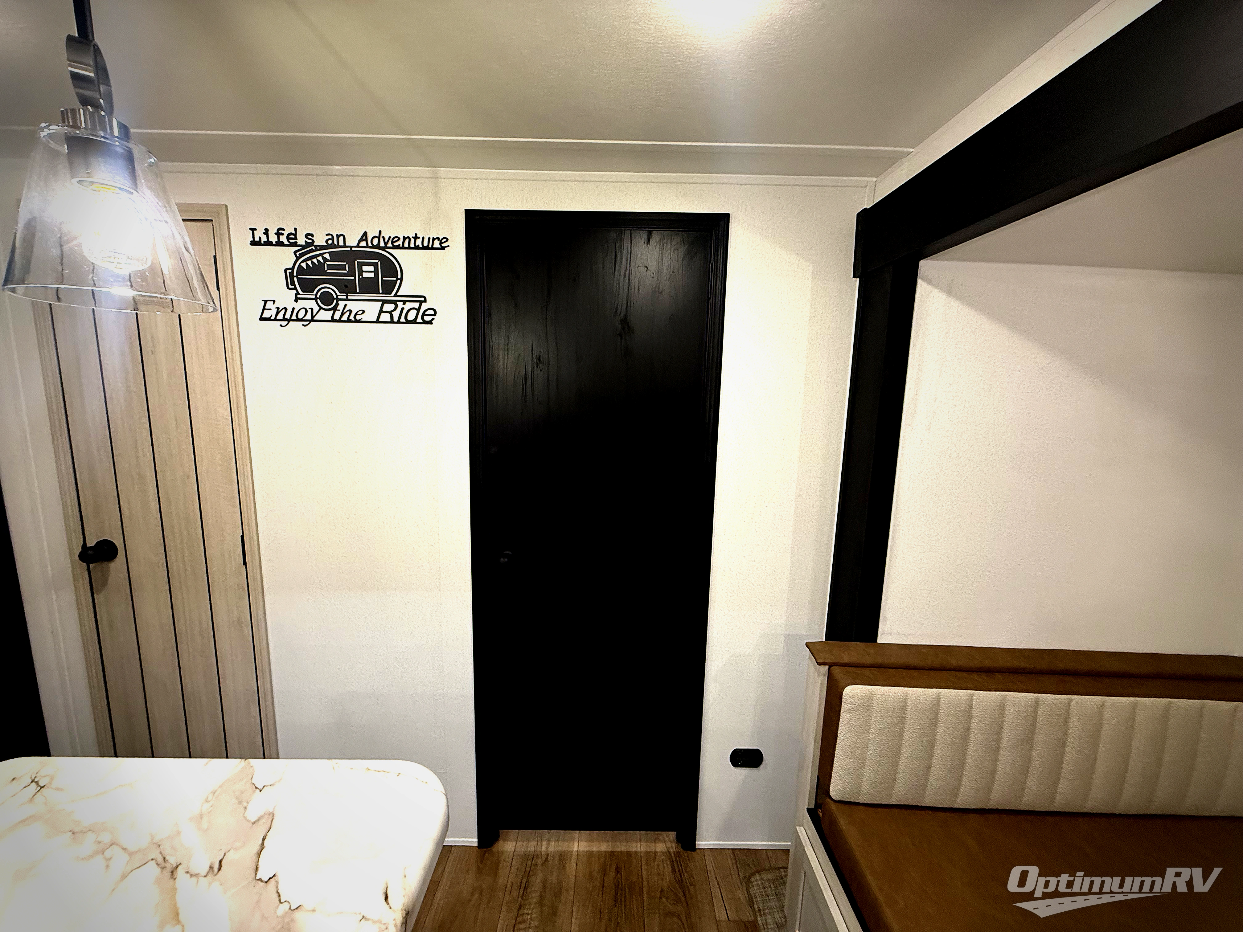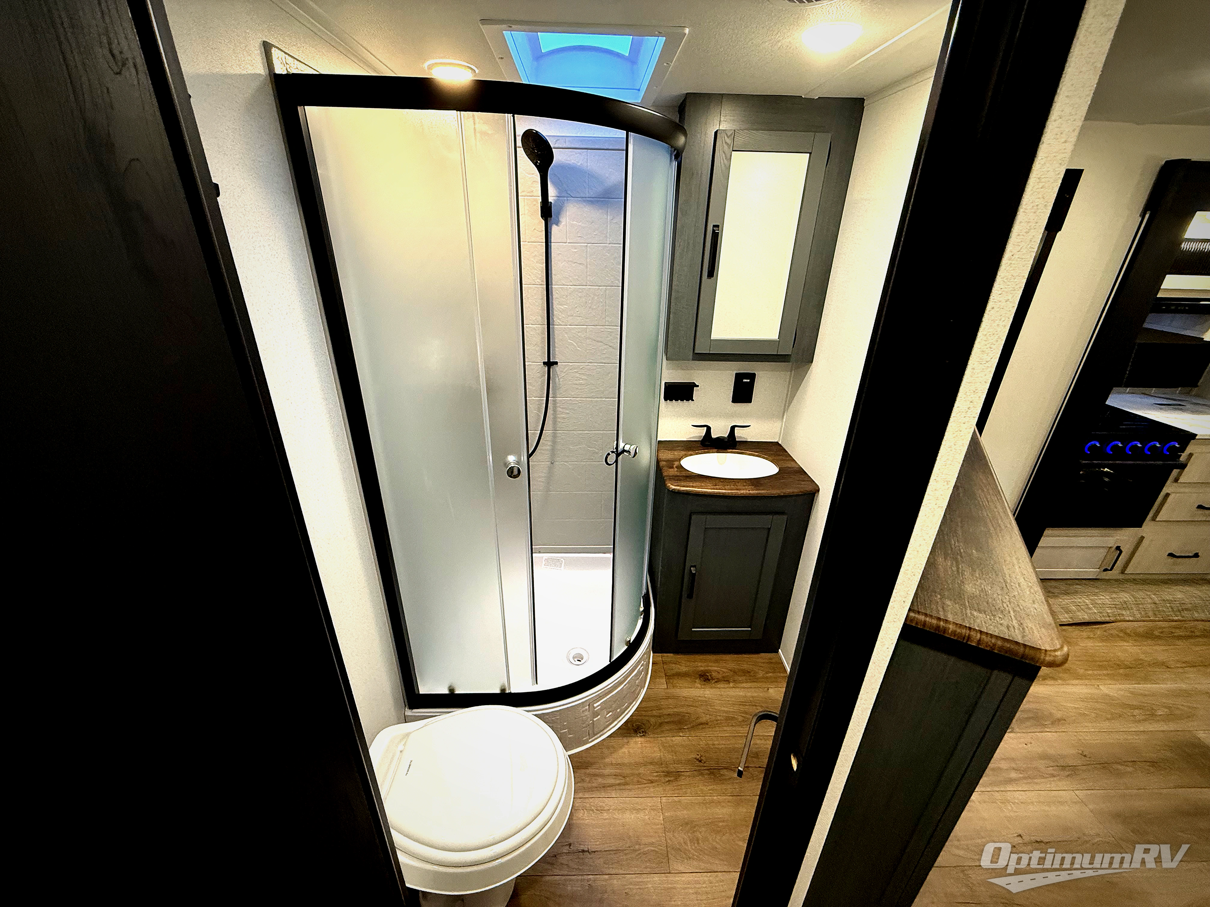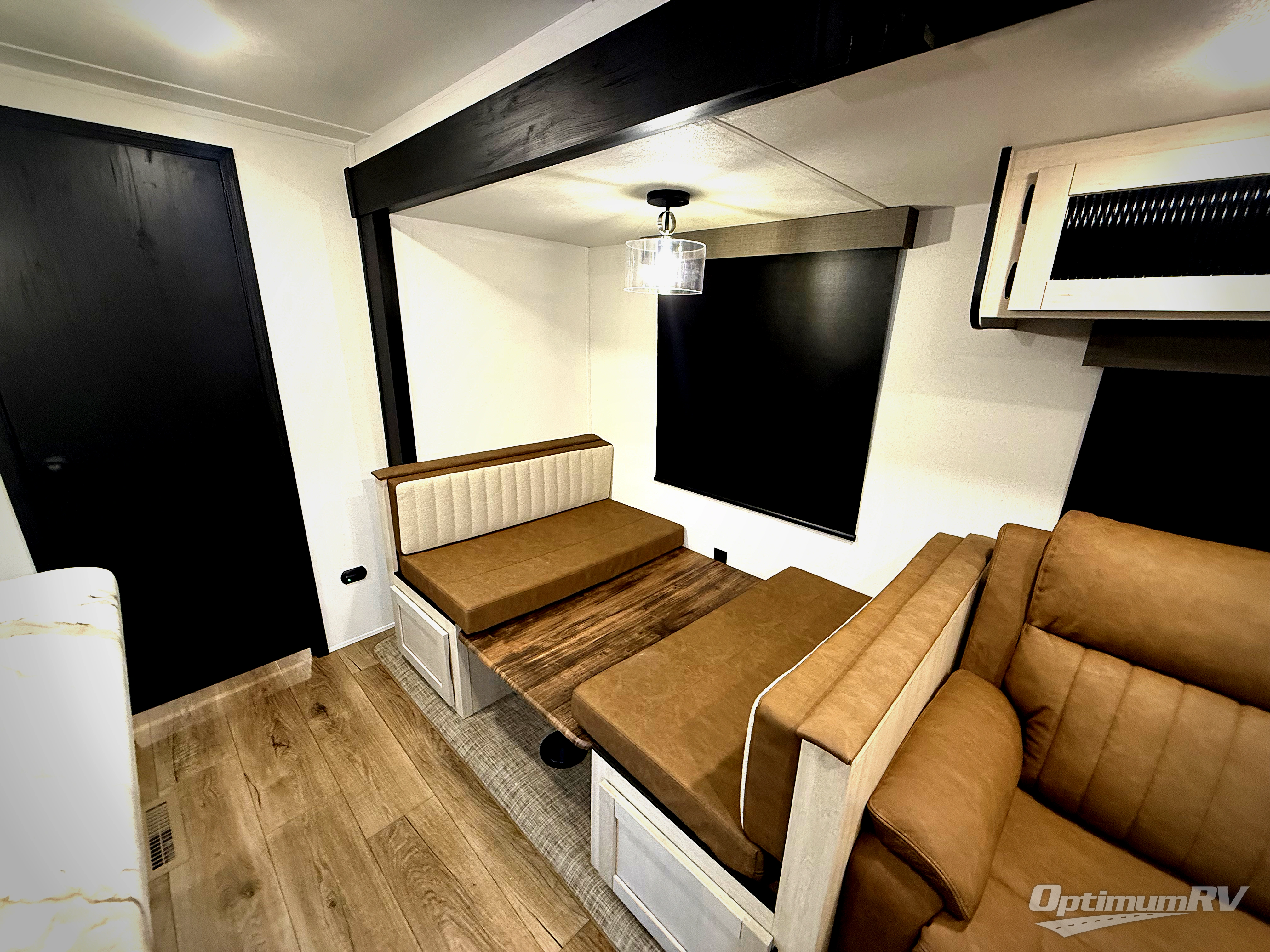 You will be the talk of the campground with this travel trailer! The front private bedroom has a queen bed slide across from a dresser and a front closet plus a second closet with washer and dryer prep. Freshen up each morning in the full bathroom with the 34" x 34" radius shower then head to the kitchen to fry up some eggs with the stainless-steel oven and range. You can enjoy your meals at the booth dinette, and the kitchen island will make your clean up easier with the sink that has a high-rise faucet and sprayer. The rear private bunkhouse has a 32" x 69" bunk above a jiffy sofa slide, a 36" x 69" bunk above a 36" x 71" bunk and a linen closet. Choose one of the outside kitchen options for even more convenience!