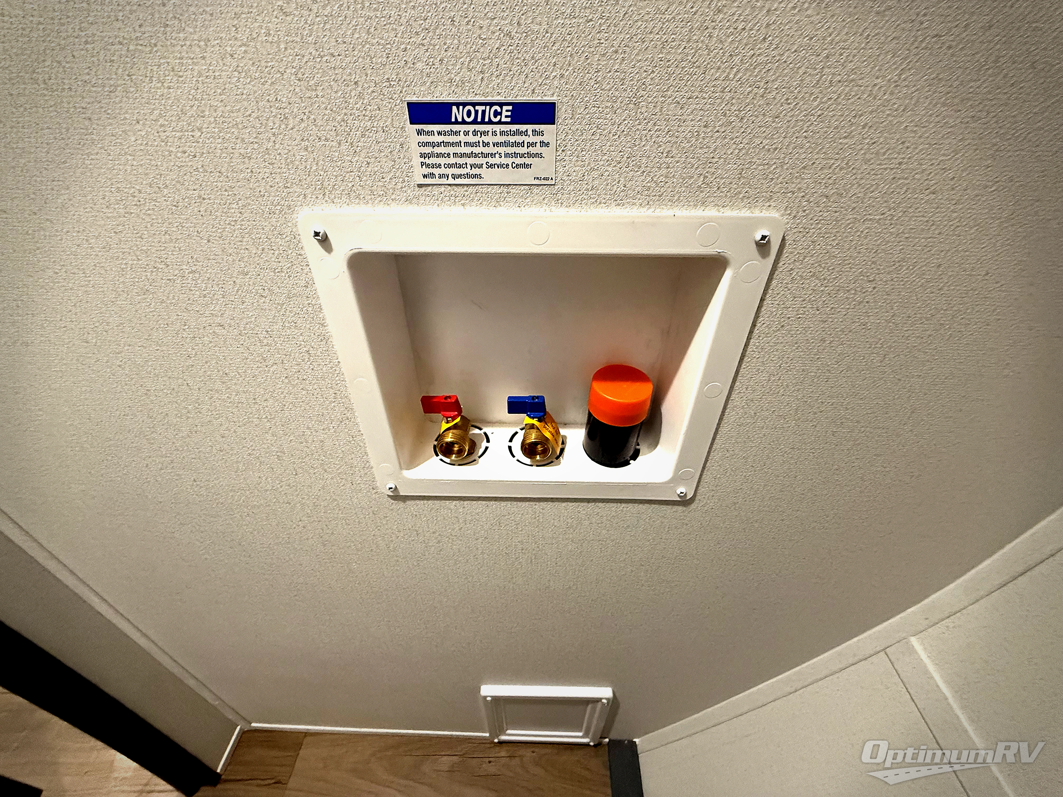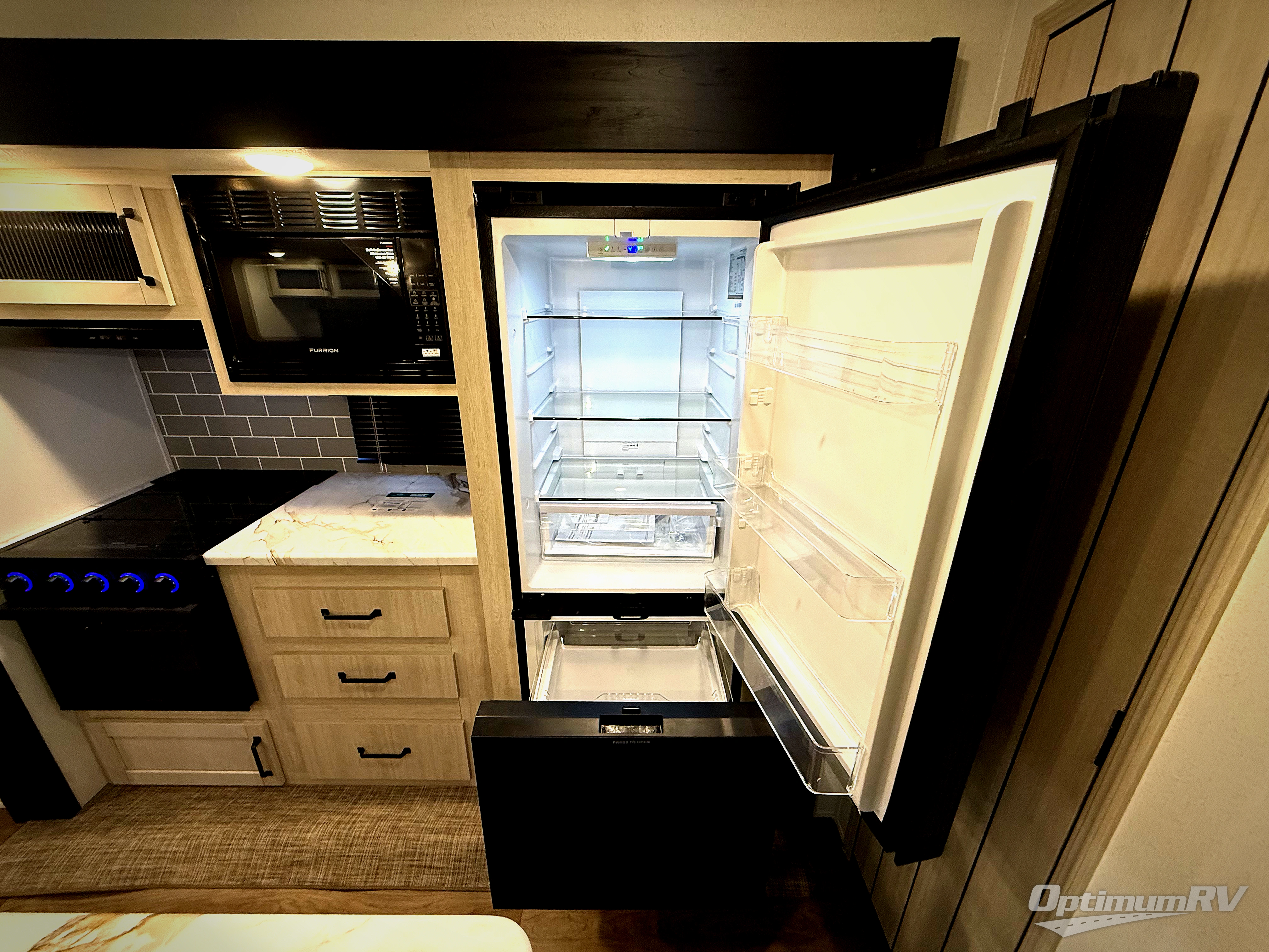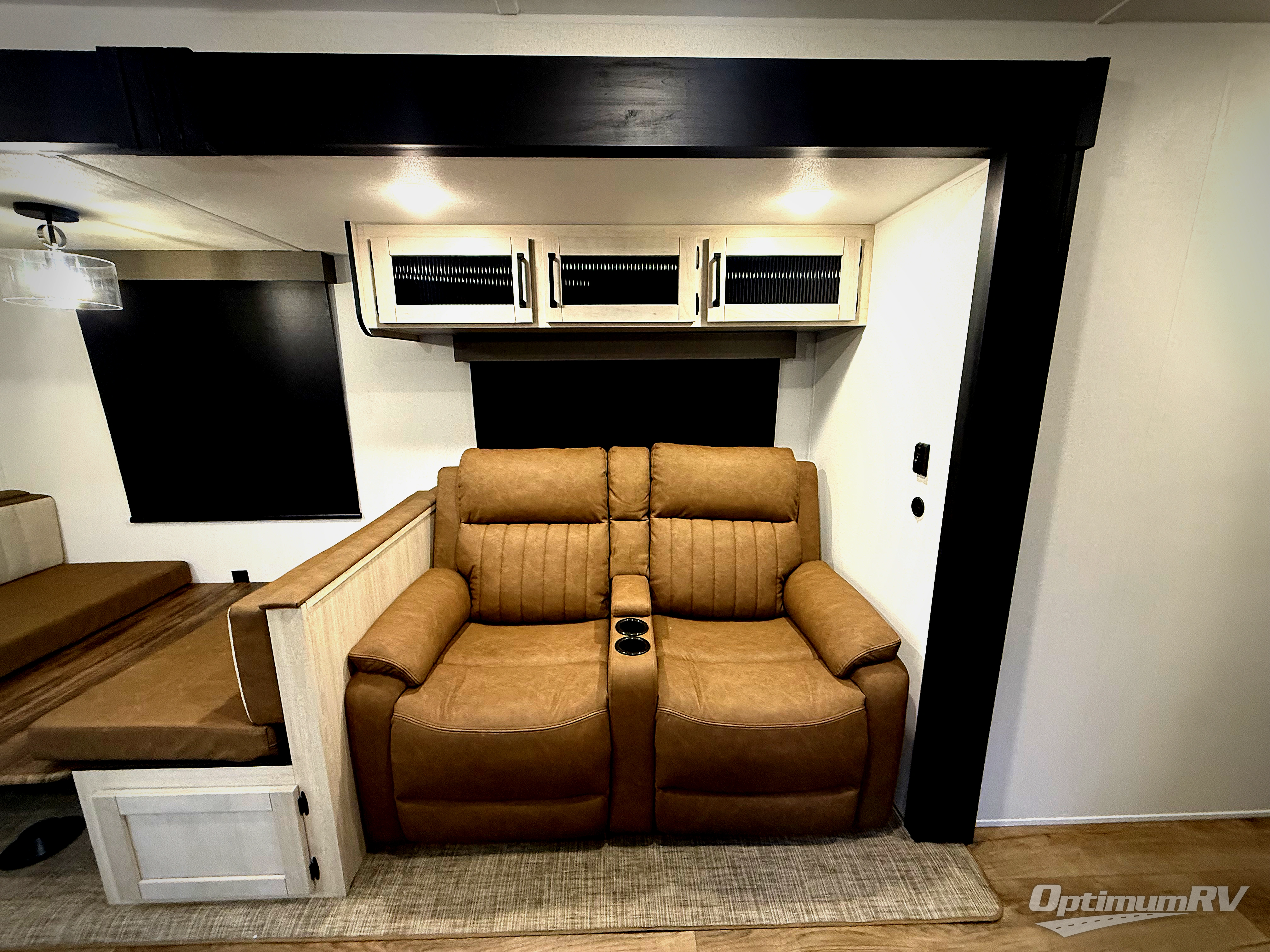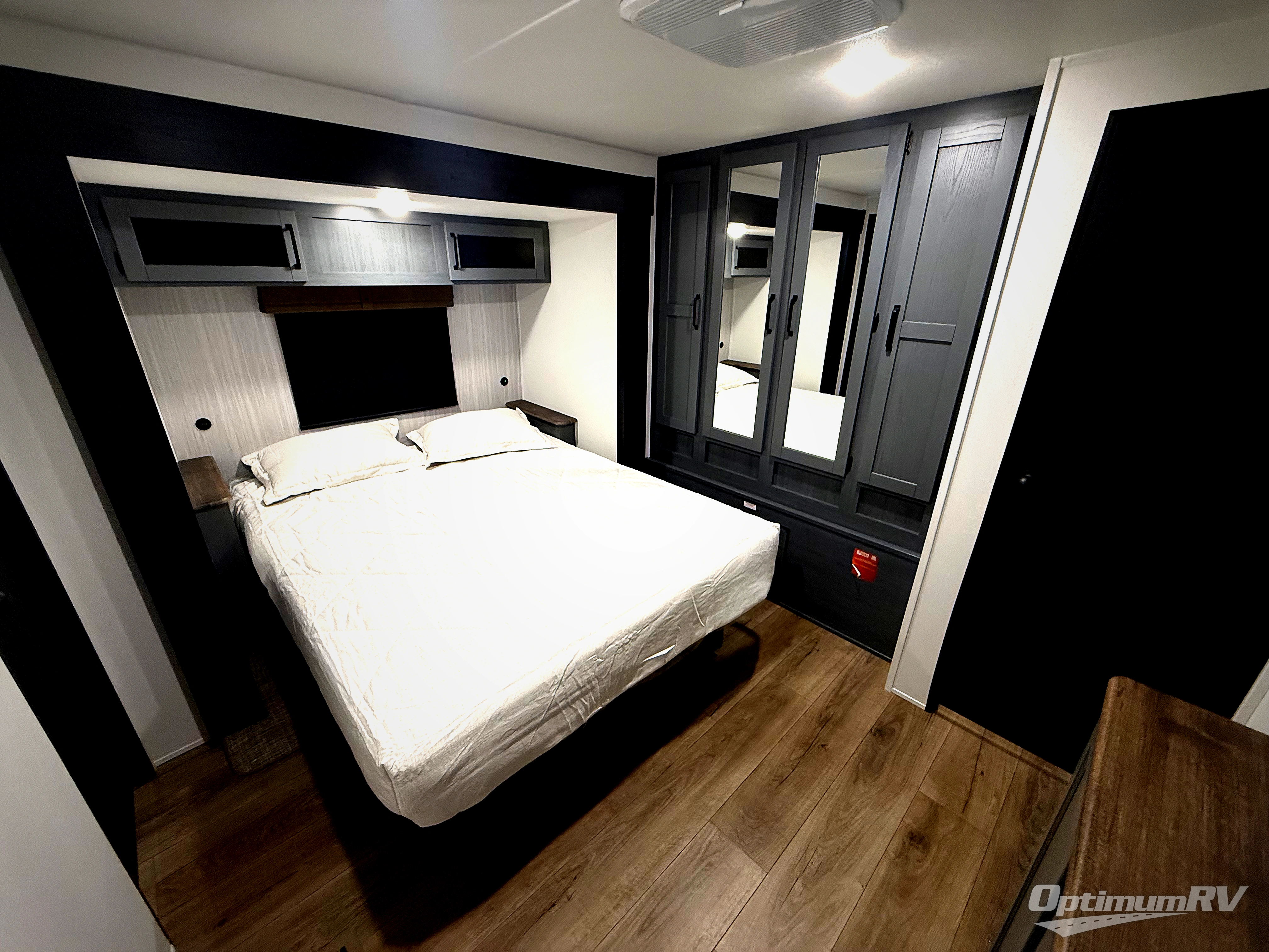 You will be the talk of the campground with this travel trailer! The front private bedroom has a queen bed slide across from a dresser and a front closet plus a second closet with washer and dryer prep. Freshen up each morning in the full bathroom with the 34" x 34" radius shower then head to the kitchen to fry up some eggs with the stainless-steel oven and range. You can enjoy your meals at the booth dinette, and the kitchen island will make your clean up easier with the sink that has a high-rise faucet and sprayer. The rear private bunkhouse has a 32" x 69" bunk above a jiffy sofa slide, a 36" x 69" bunk above a 36" x 71" bunk and a linen closet. Choose one of the outside kitchen options for even more convenience!