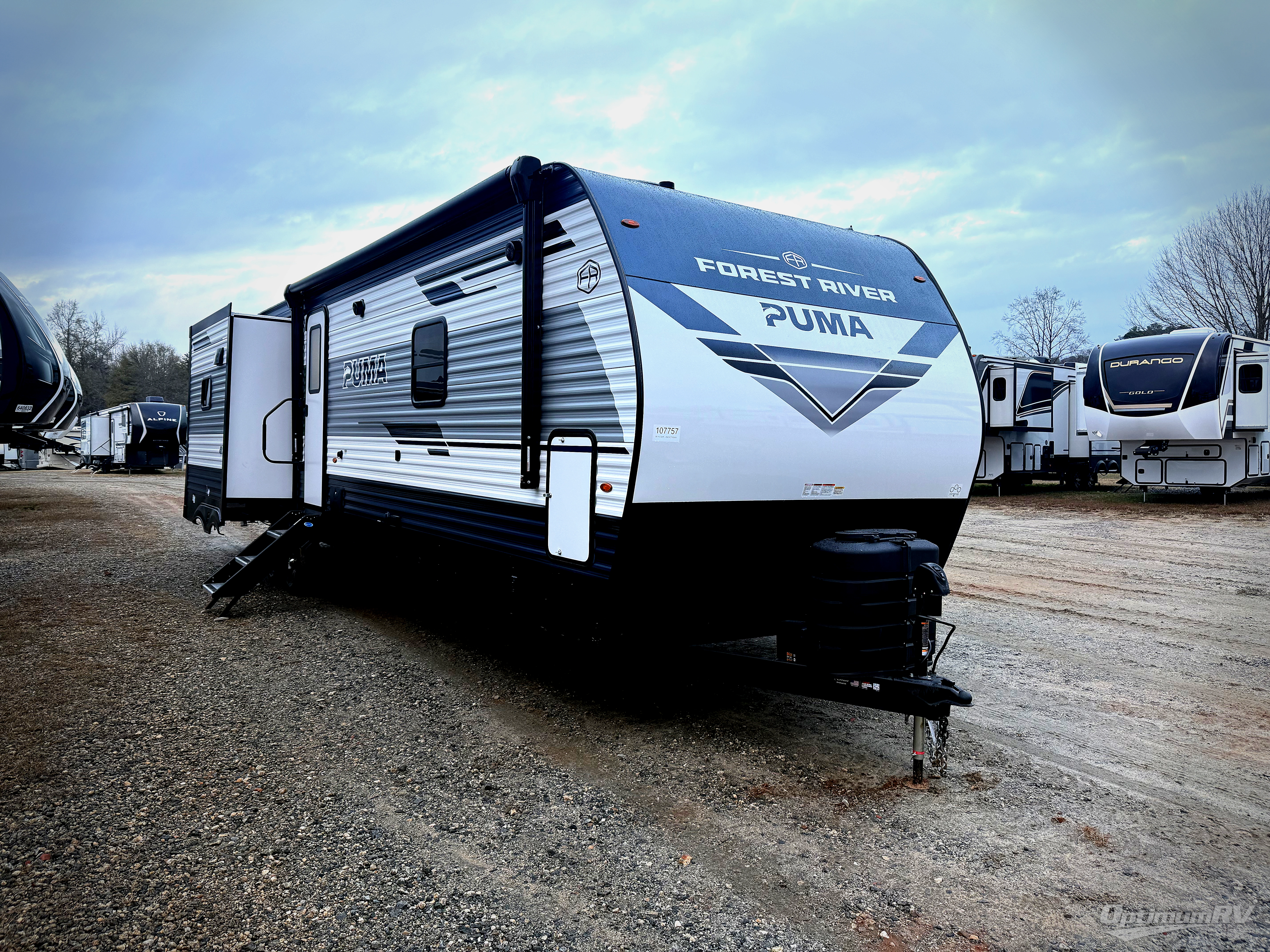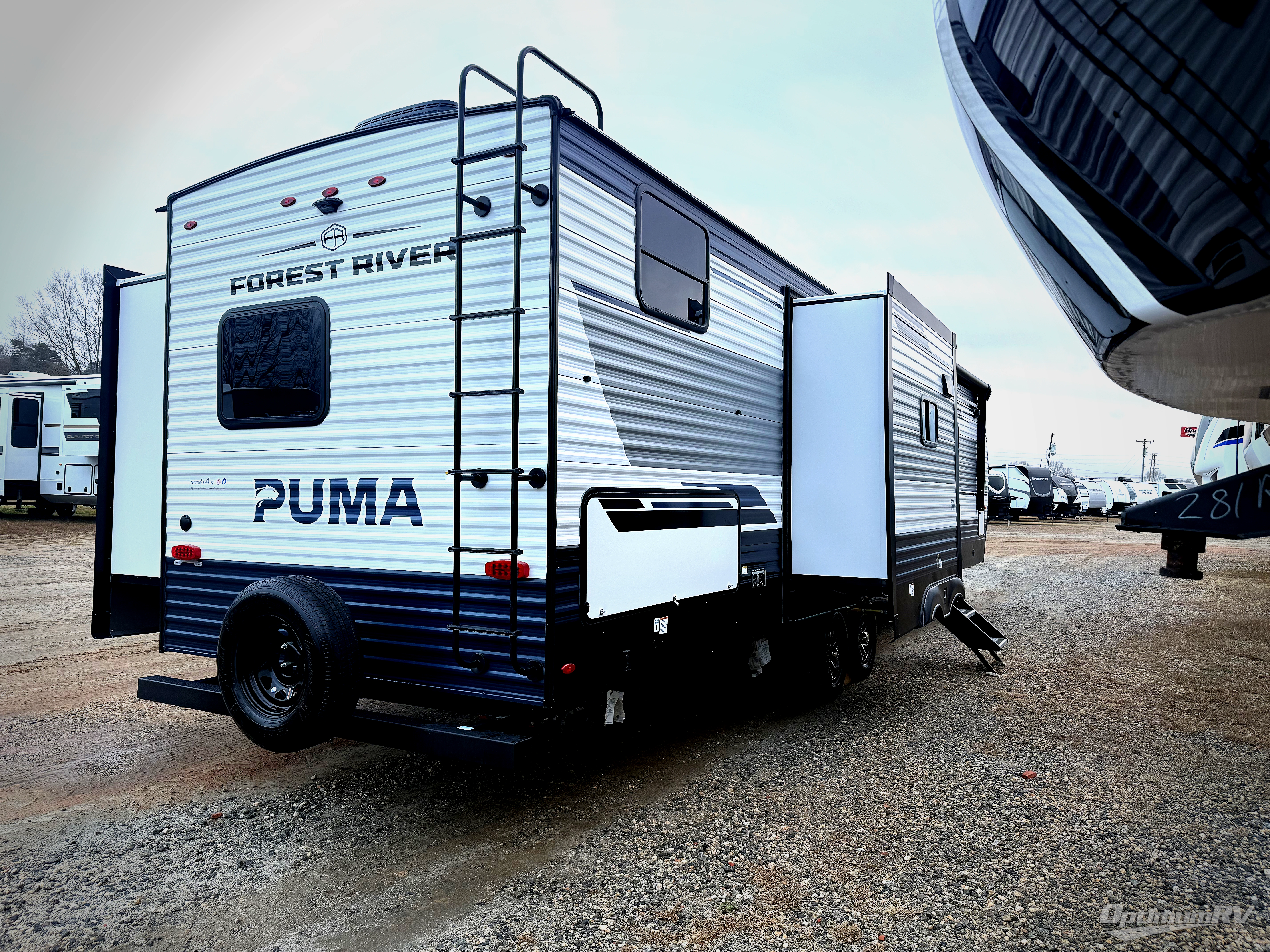 If you're looking for family-fun adventures, then you need one of these Forest River Puma travel trailers! They are built rugged, easy to tow, and jam packed with features. The Darco wrapped underbelly will help protect your unit, and the roof and side mount solar prep gives you the option to add off-grid power. Inside, the Congoleum linoleum will be easy to keep clean, and the night roller shades will provide privacy when it's time to turn in. You'll also enjoy an electric awning with an LED light strip plus an AM/FM/Bluetooth stereo and two outside speakers to keep the party going!