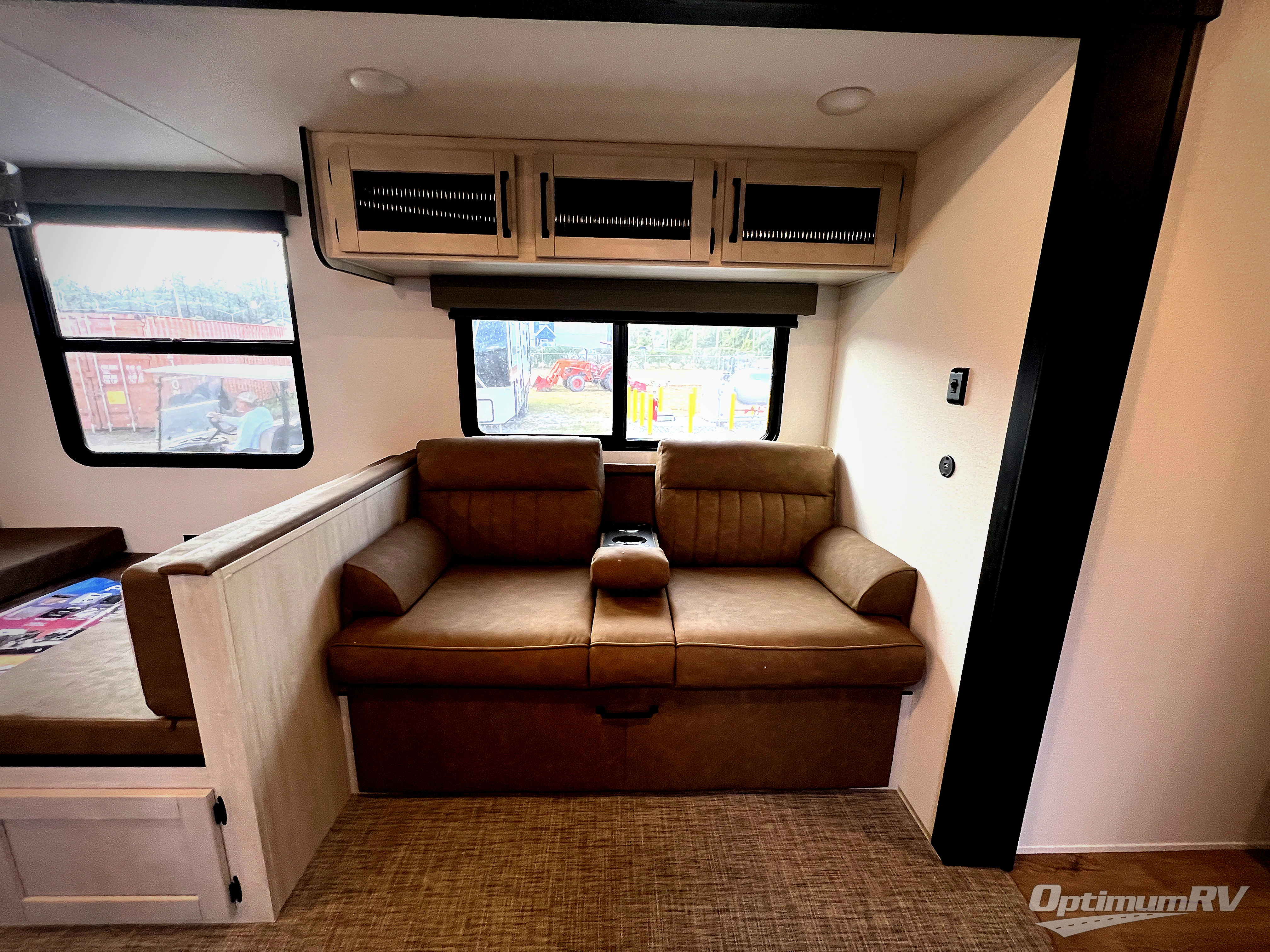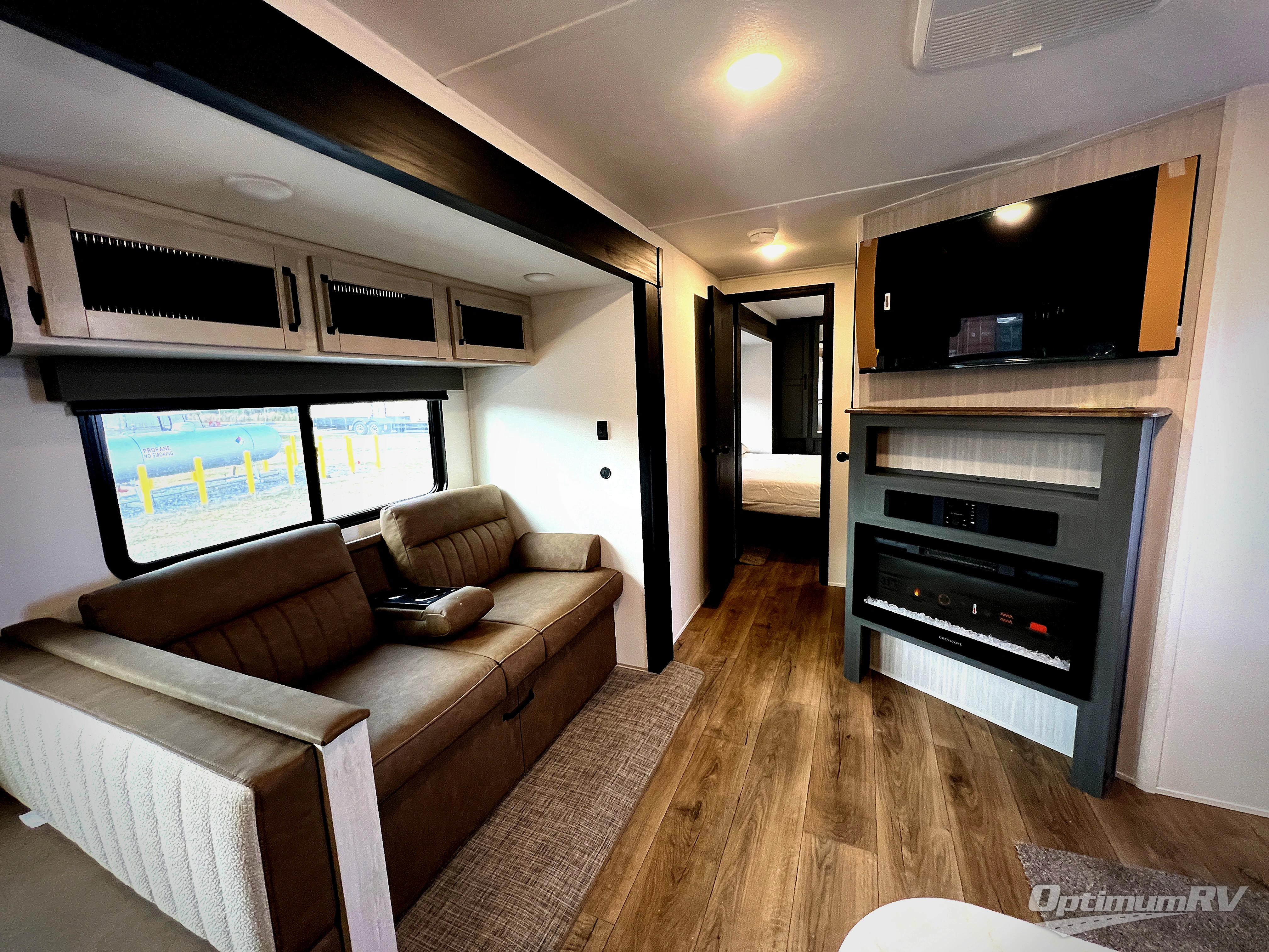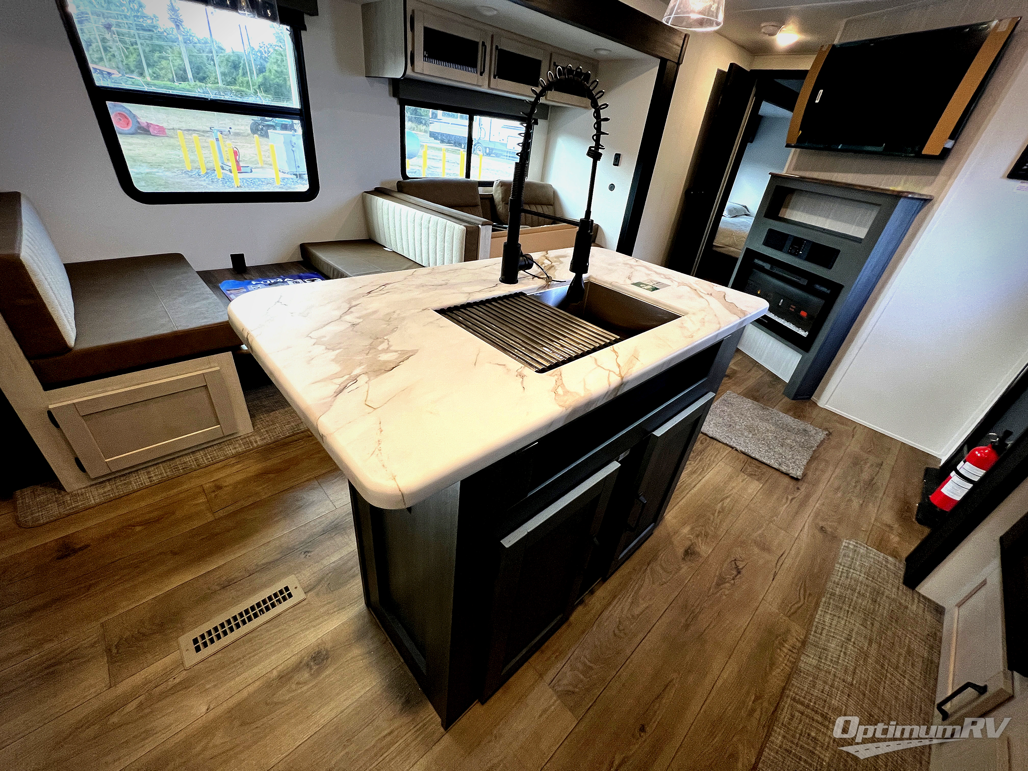 You will be the talk of the campground with this travel trailer! The front private bedroom has a queen bed slide across from a dresser and a front closet plus a second closet with washer and dryer prep. Freshen up each morning in the full bathroom with the 34" x 34" radius shower then head to the kitchen to fry up some eggs with the stainless-steel oven and range. You can enjoy your meals at the booth dinette, and the kitchen island will make your clean up easier with the sink that has a high-rise faucet and sprayer. The rear private bunkhouse has a 32" x 69" bunk above a jiffy sofa slide, a 36" x 69" bunk above a 36" x 71" bunk and a linen closet. Choose one of the outside kitchen options for even more convenience!