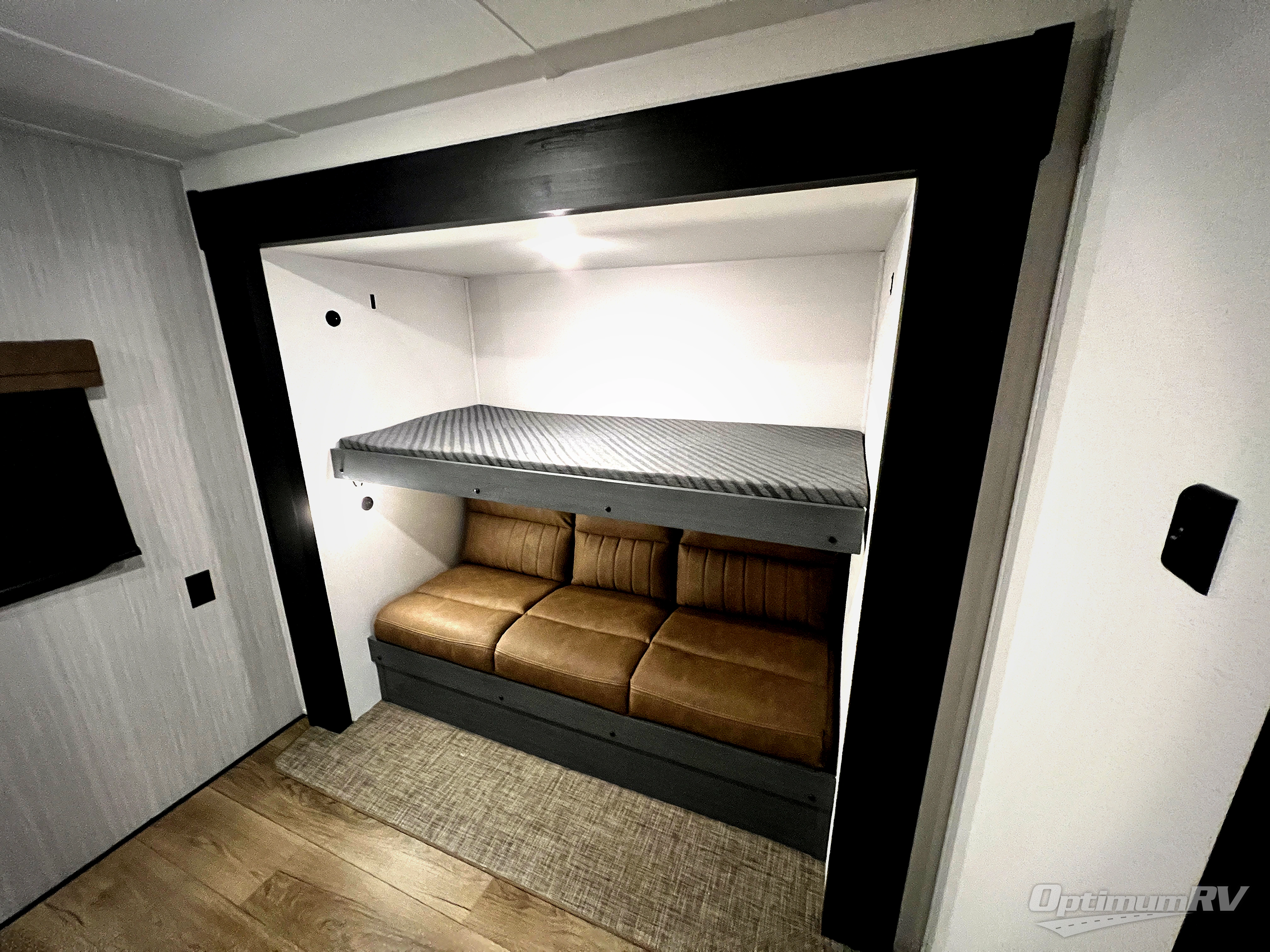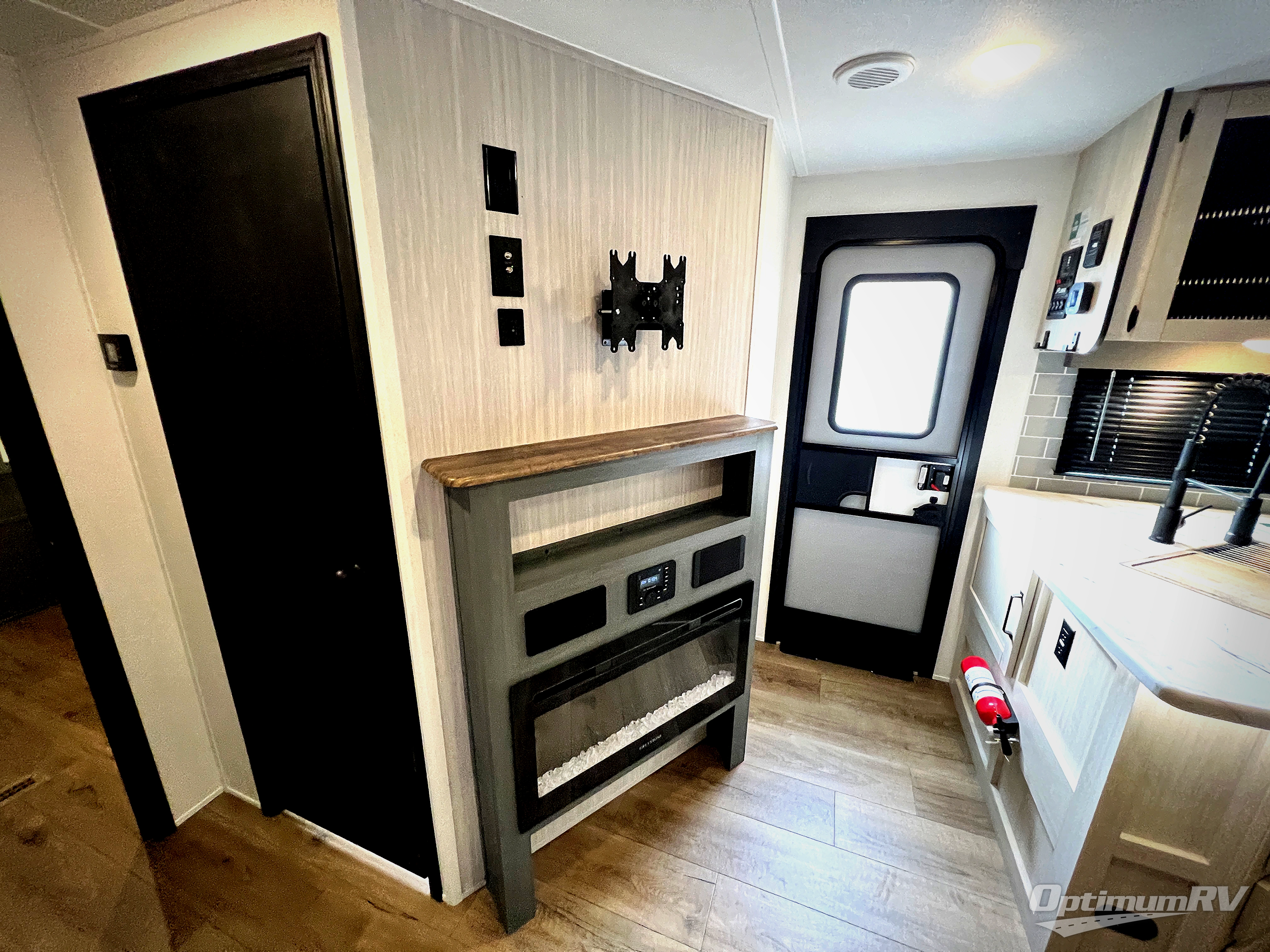 With dual entry doors and a bath and a half, you will have the ultimate in convenience with this travel trailer! The bedroom also has a front closet to keep your clothes looking their best and a queen bed slide for you to sleep your best. Everyone can freshen up in the full bathroom with the 34" x 34" radius shower and fill their bellies with scrambled eggs cooked with the stainless steel oven and range. Enjoy your meals, play games, and even sleep at the booth dinette or relax on the sofa while watching a movie with the entertainment center and fireplace. And your guests will love the rear private bunkhouse with three bunks, a jiffy sofa, and a slide out for more space! This model also includes an optional outside mini kitchen with a griddle!