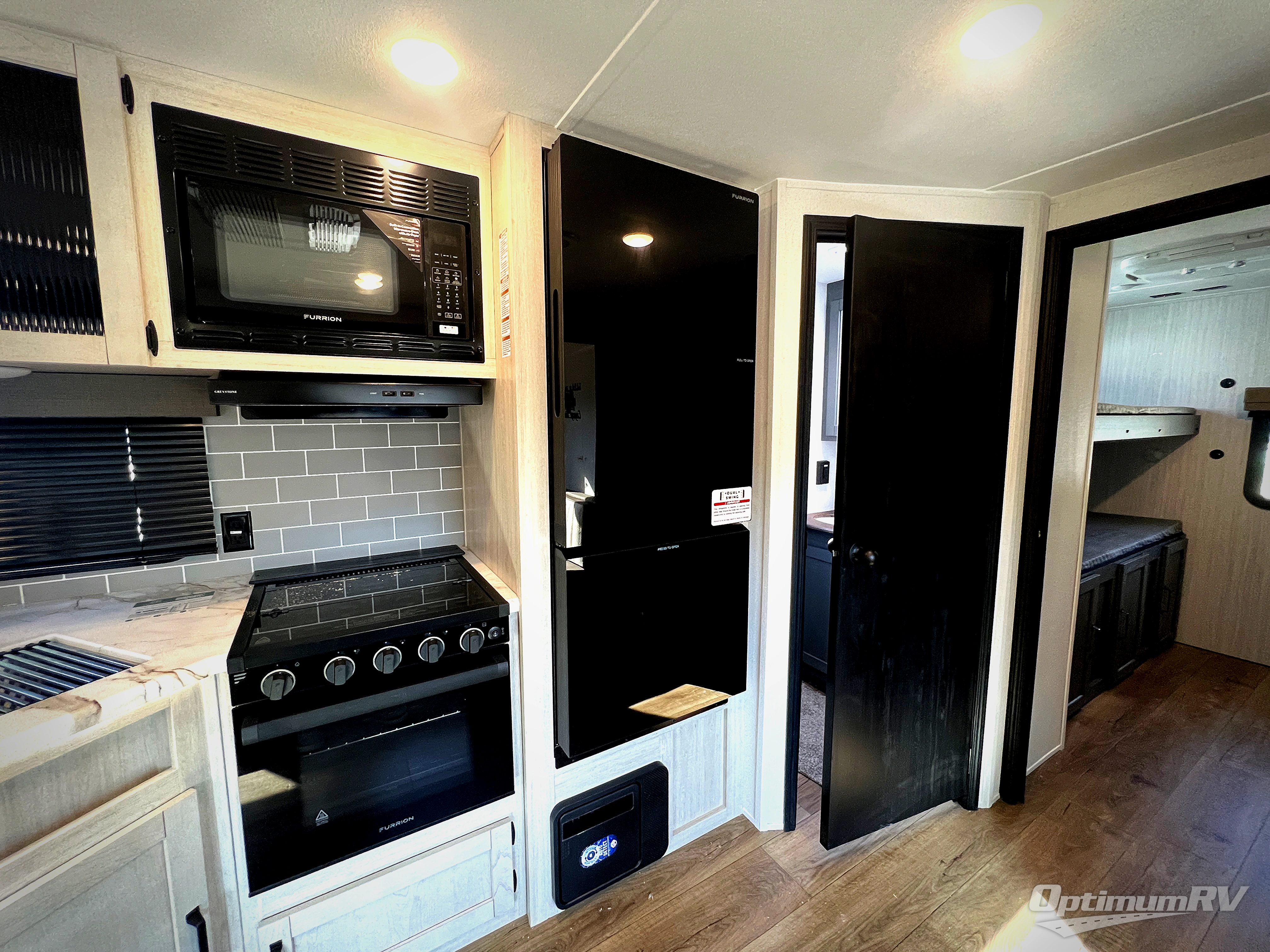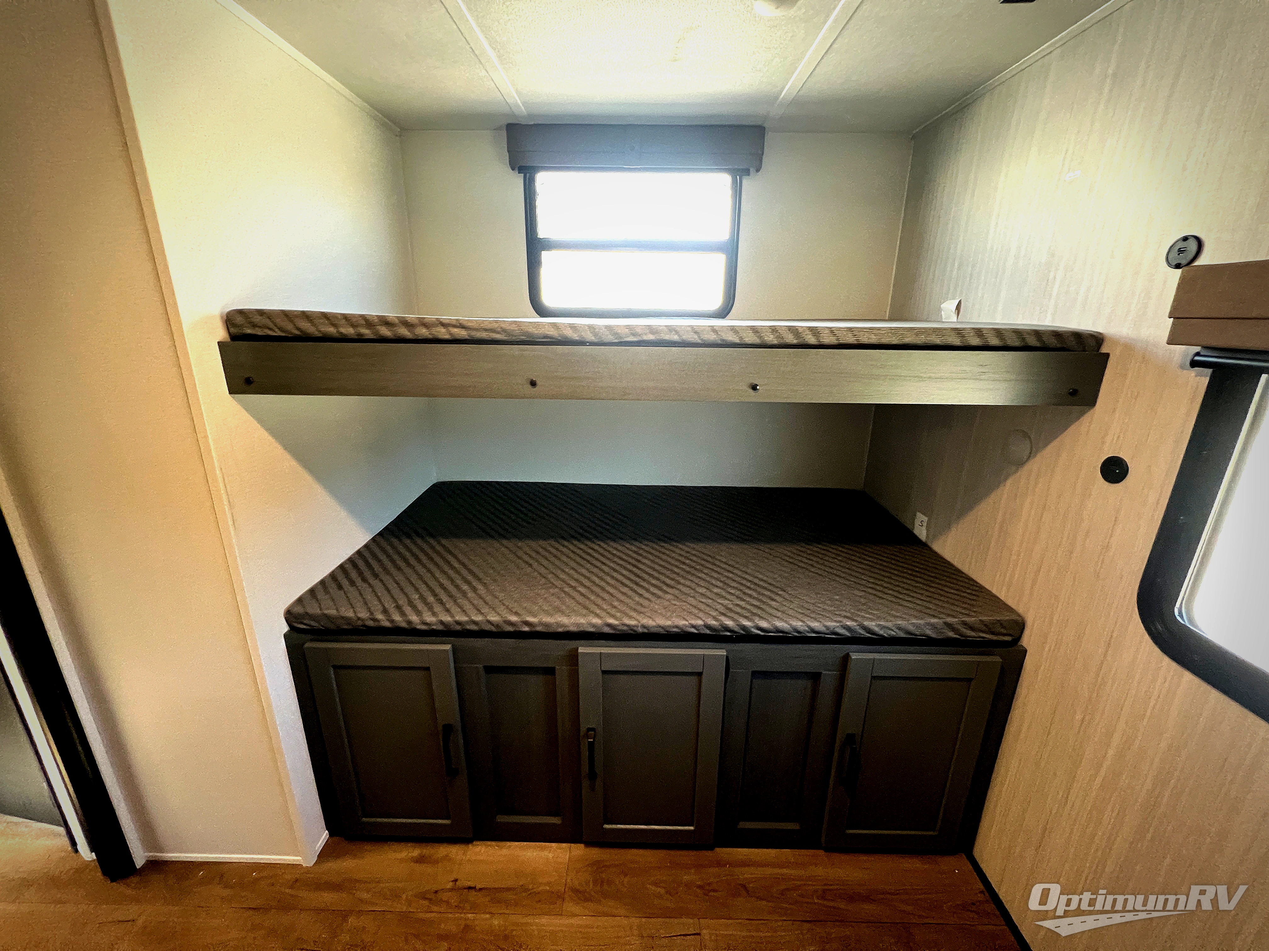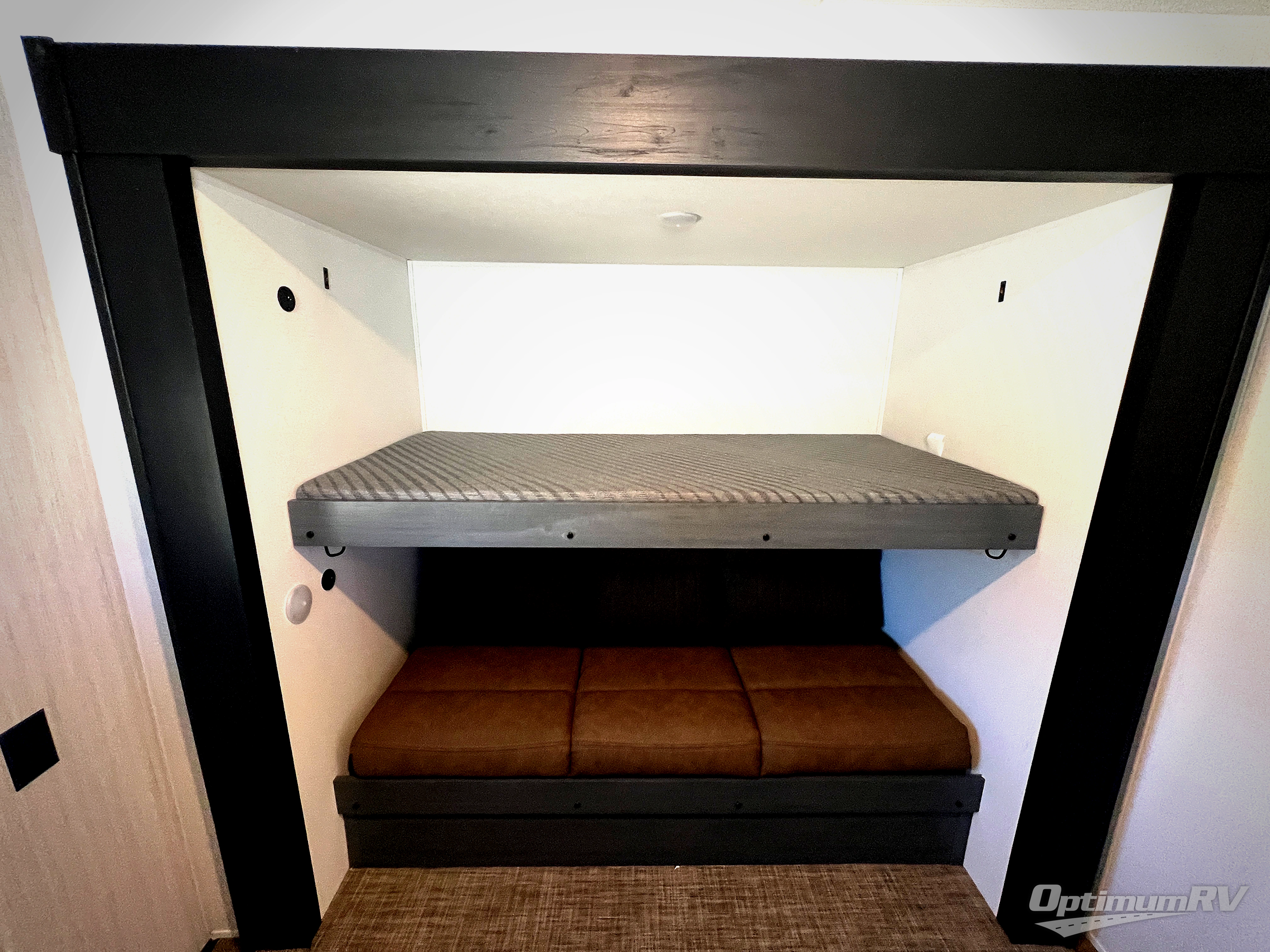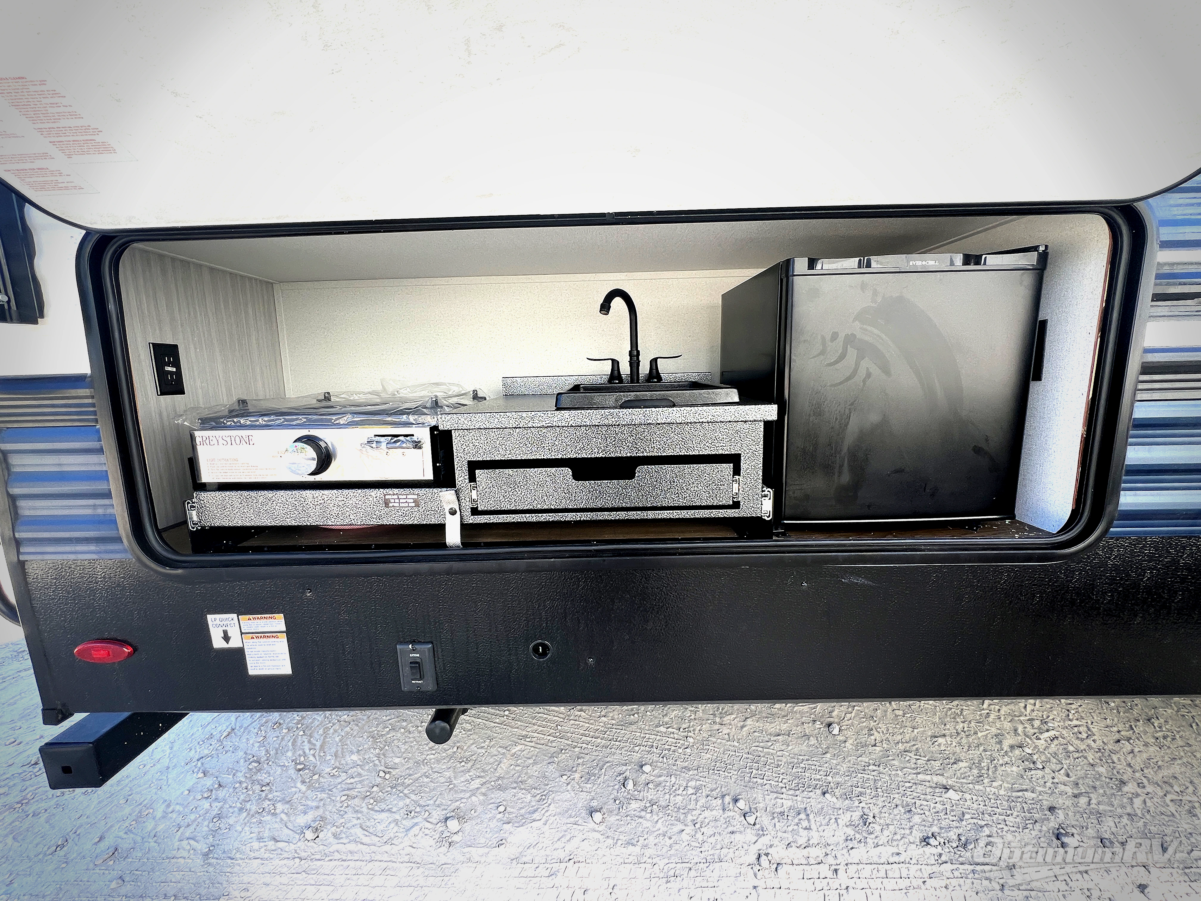 With dual entry doors and a bath and a half, you will have the ultimate in convenience with this travel trailer! The bedroom also has a front closet to keep your clothes looking their best and a queen bed slide for you to sleep your best. Everyone can freshen up in the full bathroom with the 34" x 34" radius shower and fill their bellies with scrambled eggs cooked with the stainless steel oven and range. Enjoy your meals, play games, and even sleep at the booth dinette or relax on the sofa while watching a movie with the entertainment center and fireplace. And your guests will love the rear private bunkhouse with three bunks, a jiffy sofa, and a slide out for more space! This model also includes an optional outside mini kitchen with a griddle!